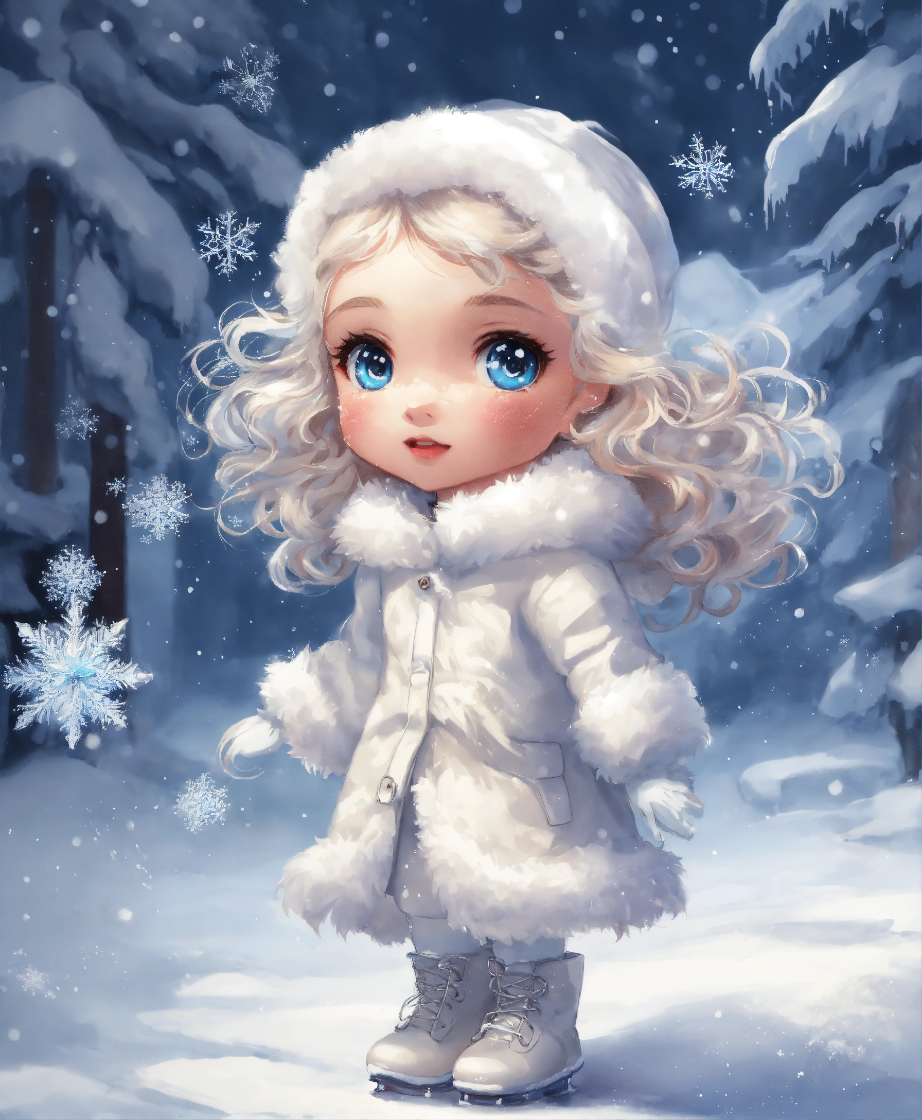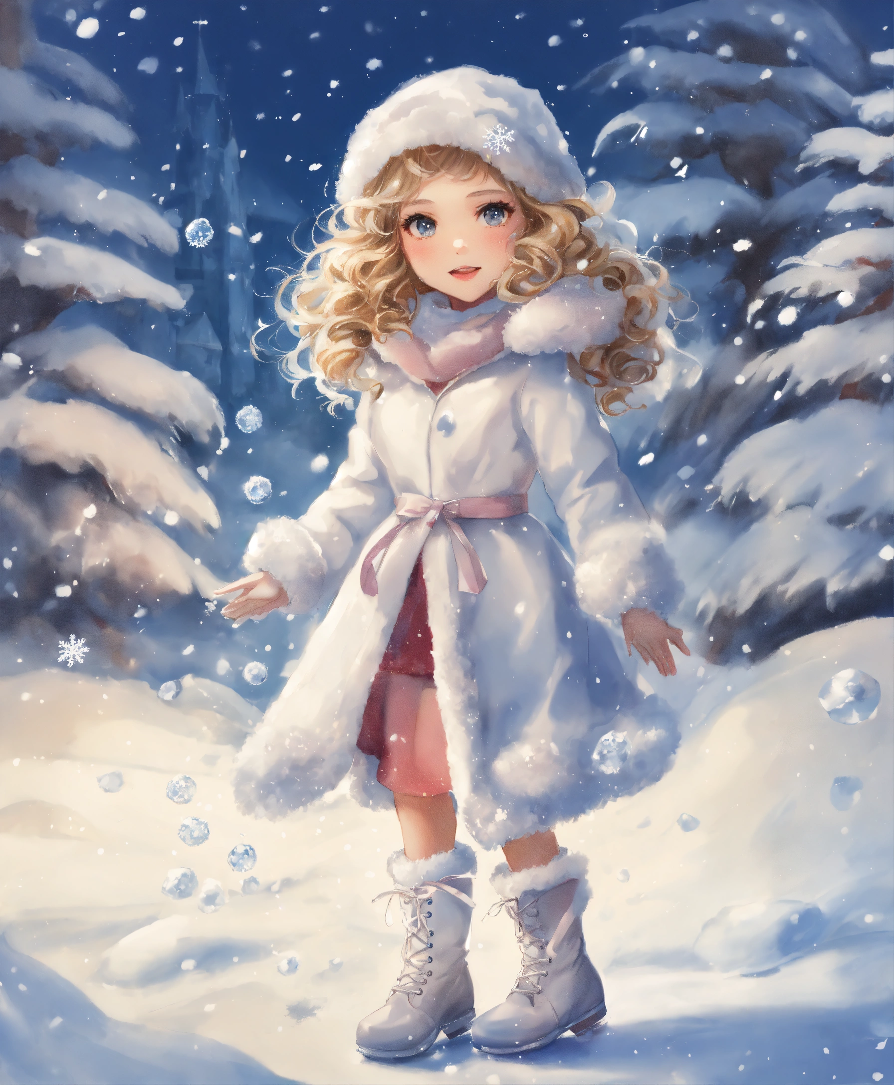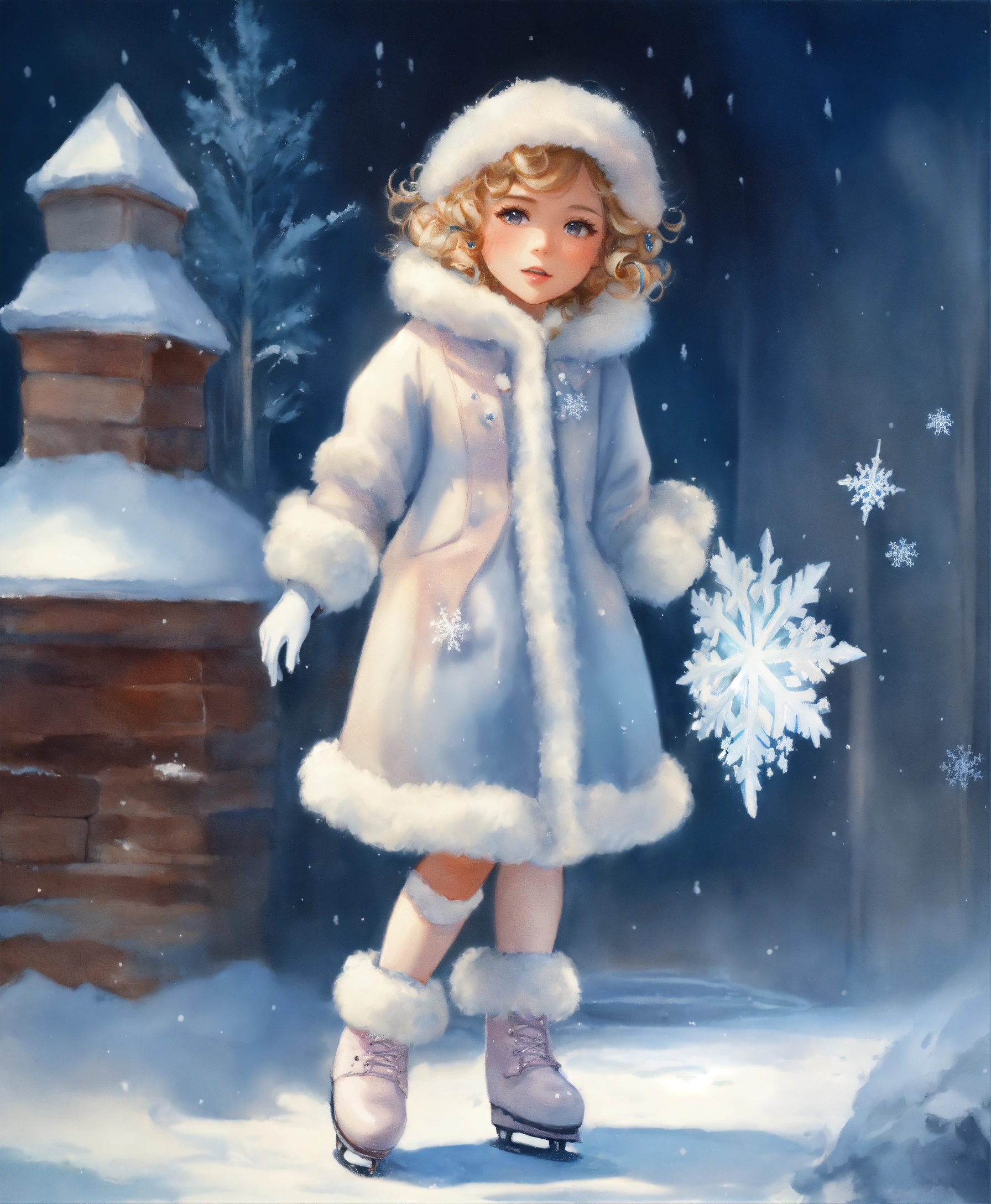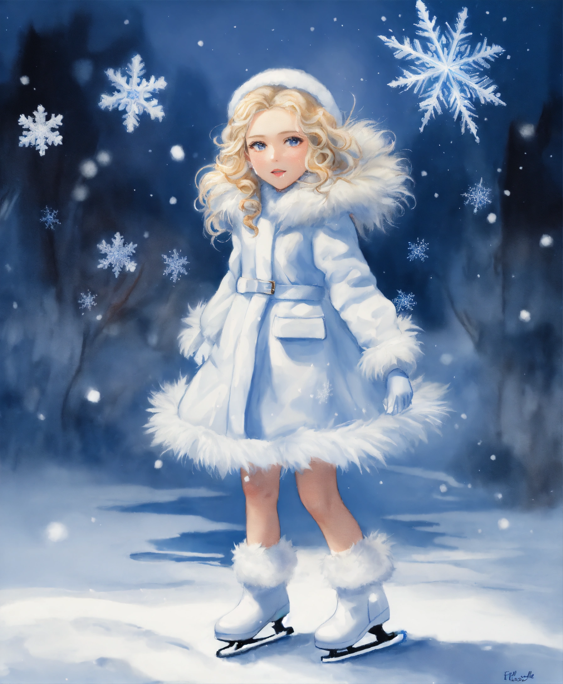 Water painting, full body, beautiful white little girl, wearing white snow boots, frizzy and bouncy curls, ice princess, fur coat, wearing winter white gloves, white frozen snowflake blizzard ice, ice skating, fairy tale, gentle snowflakes descending