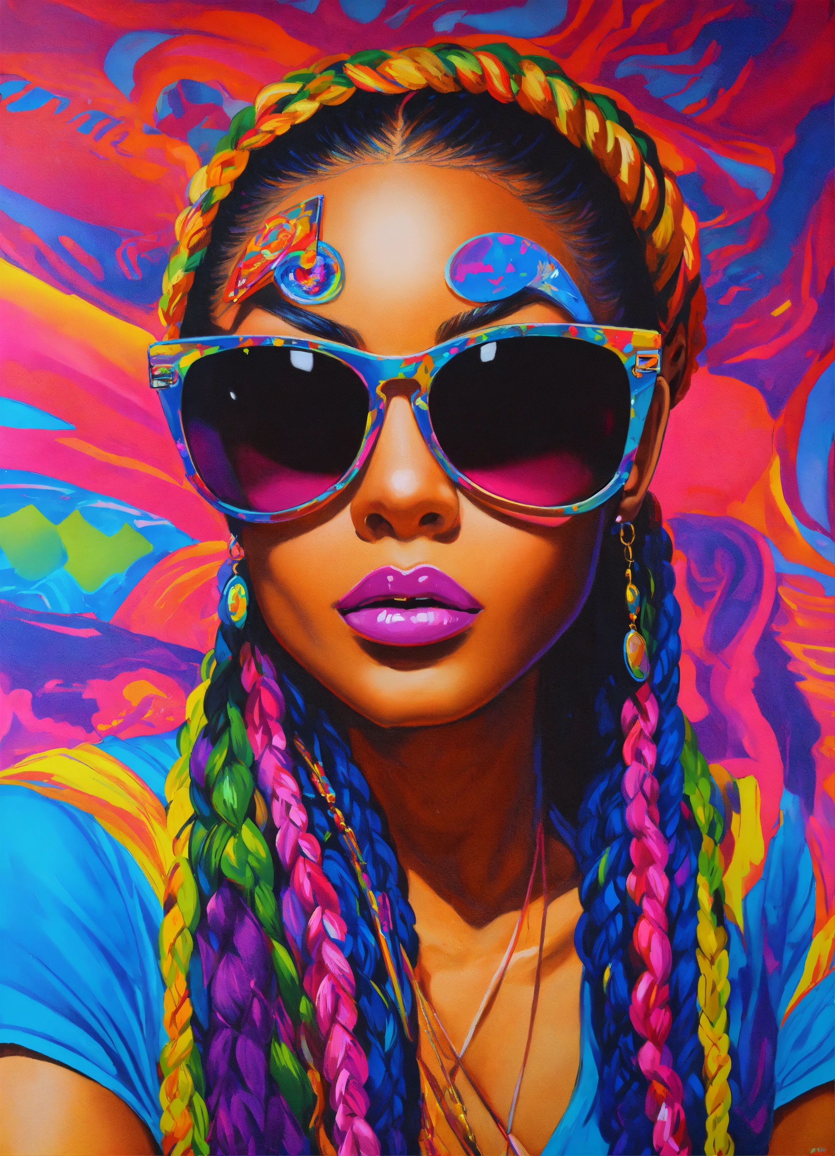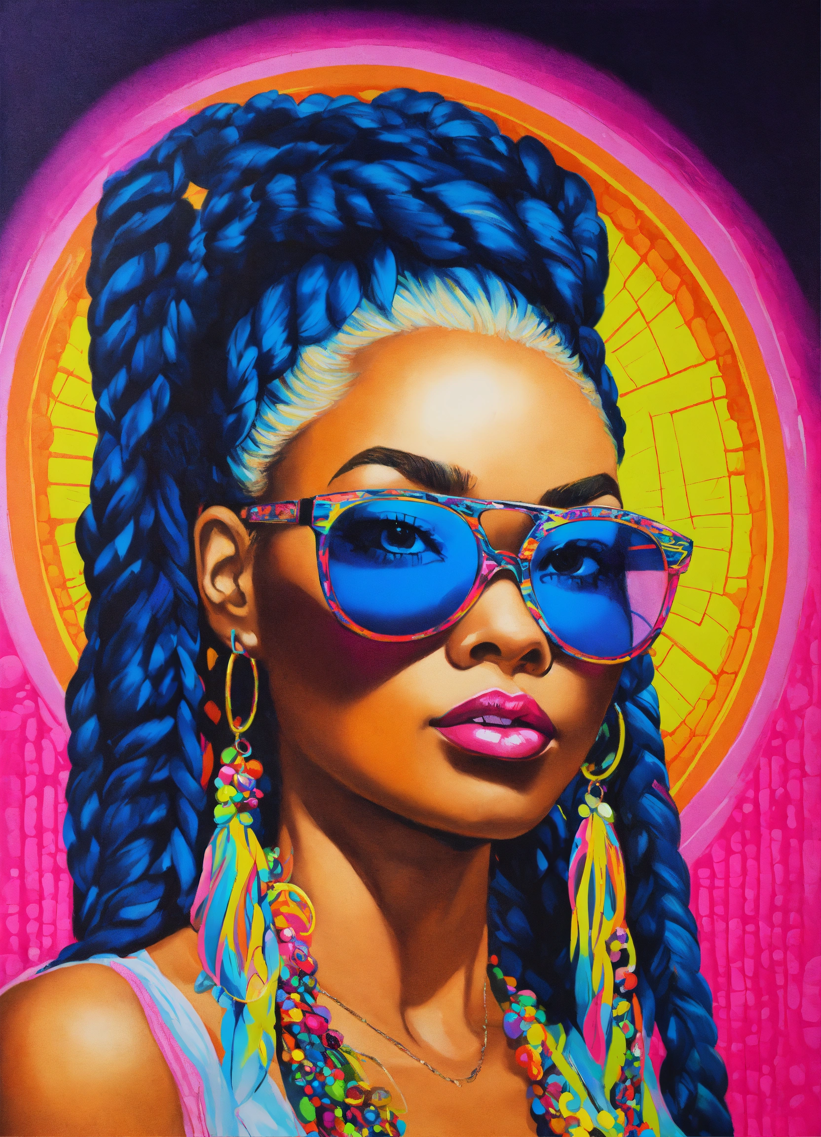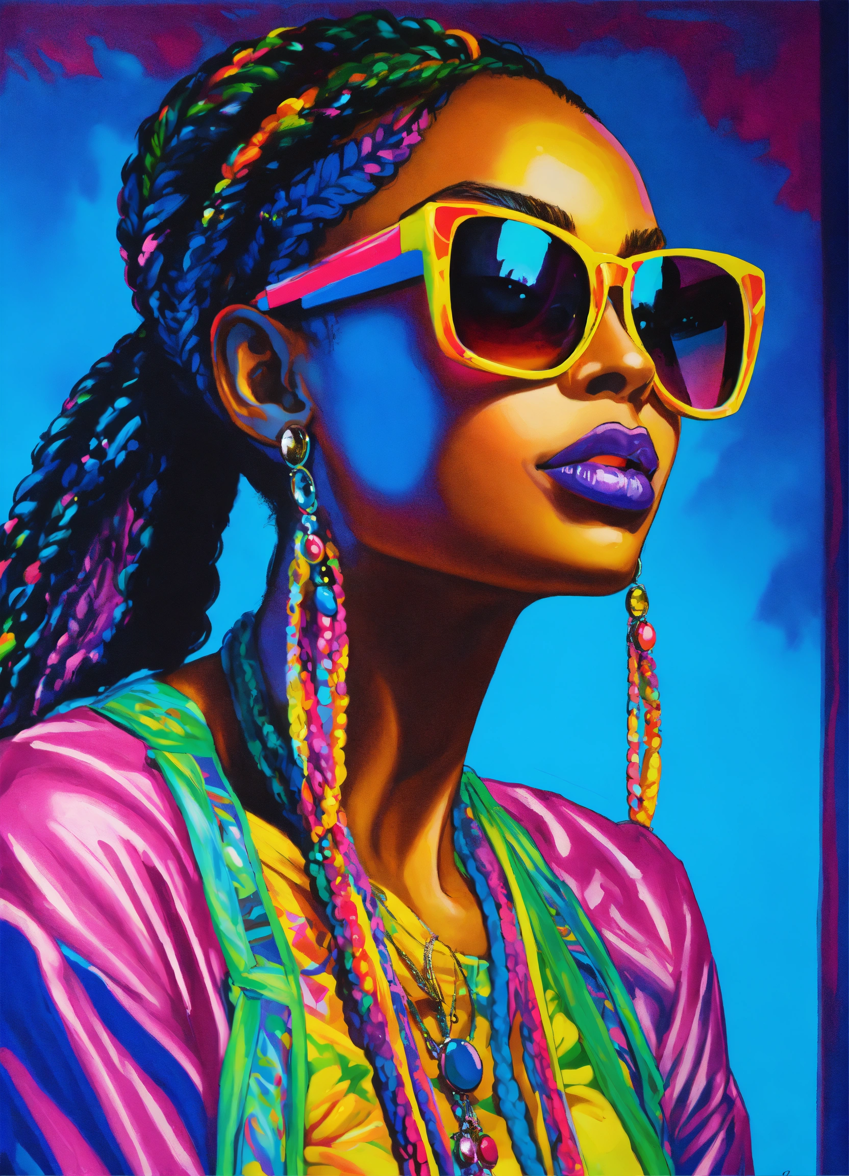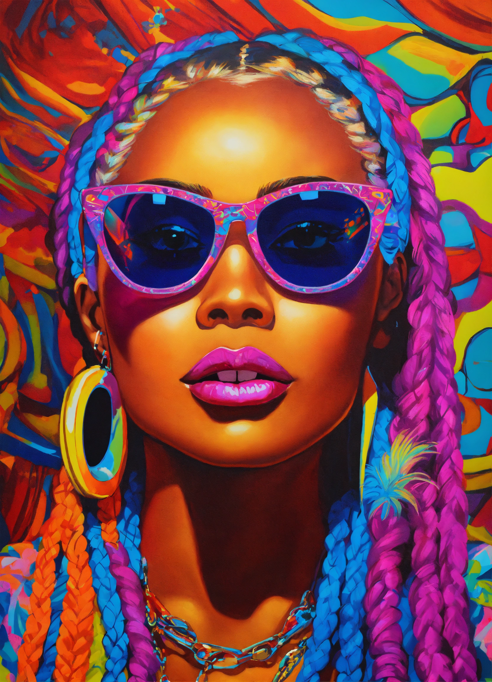 A woman in braids and sungl, a pop art painting lisa frank, funk art, portrait of ororo munroe, neon version of style jim burns, portrait of a lisa frank