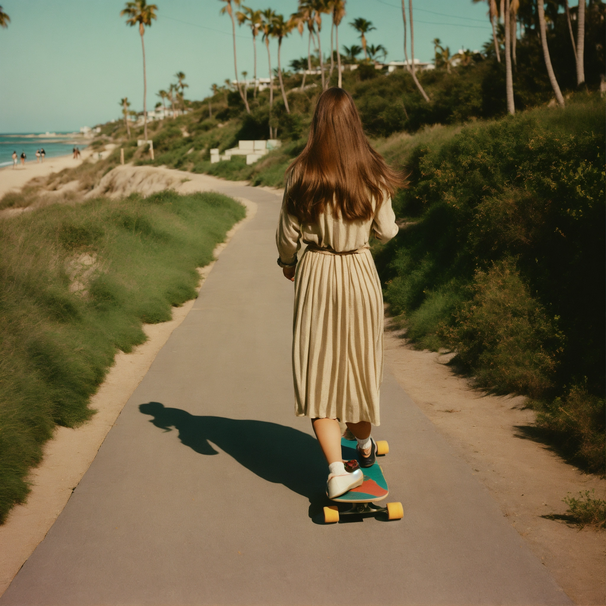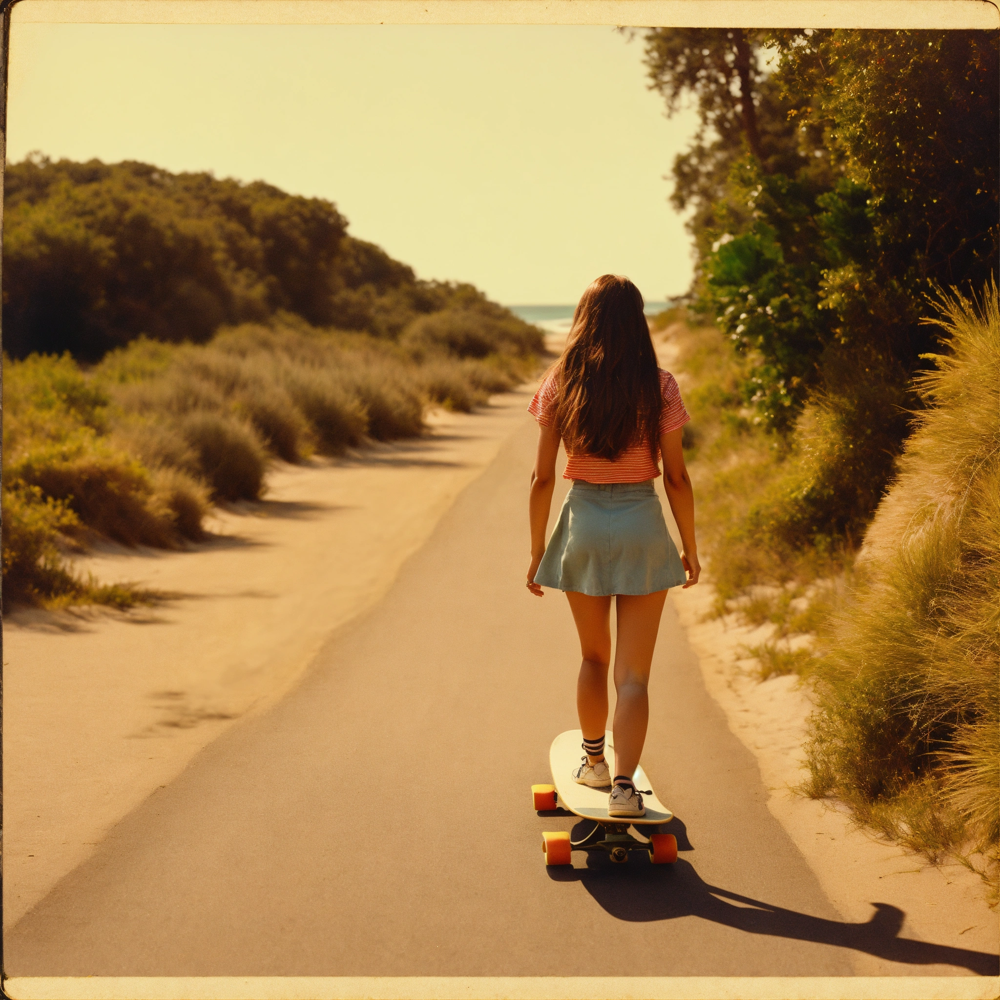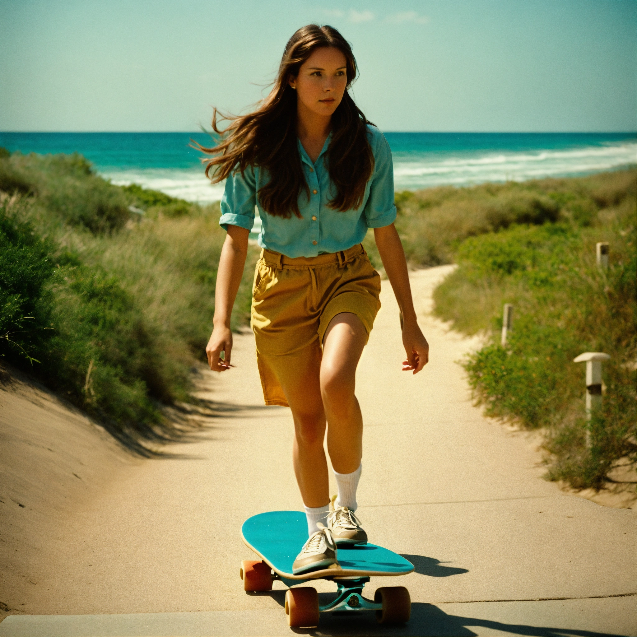 A vintage photograph of a woman with long brown hair riding away on a skateboard, on a path near the beach, wes anderson colour grading