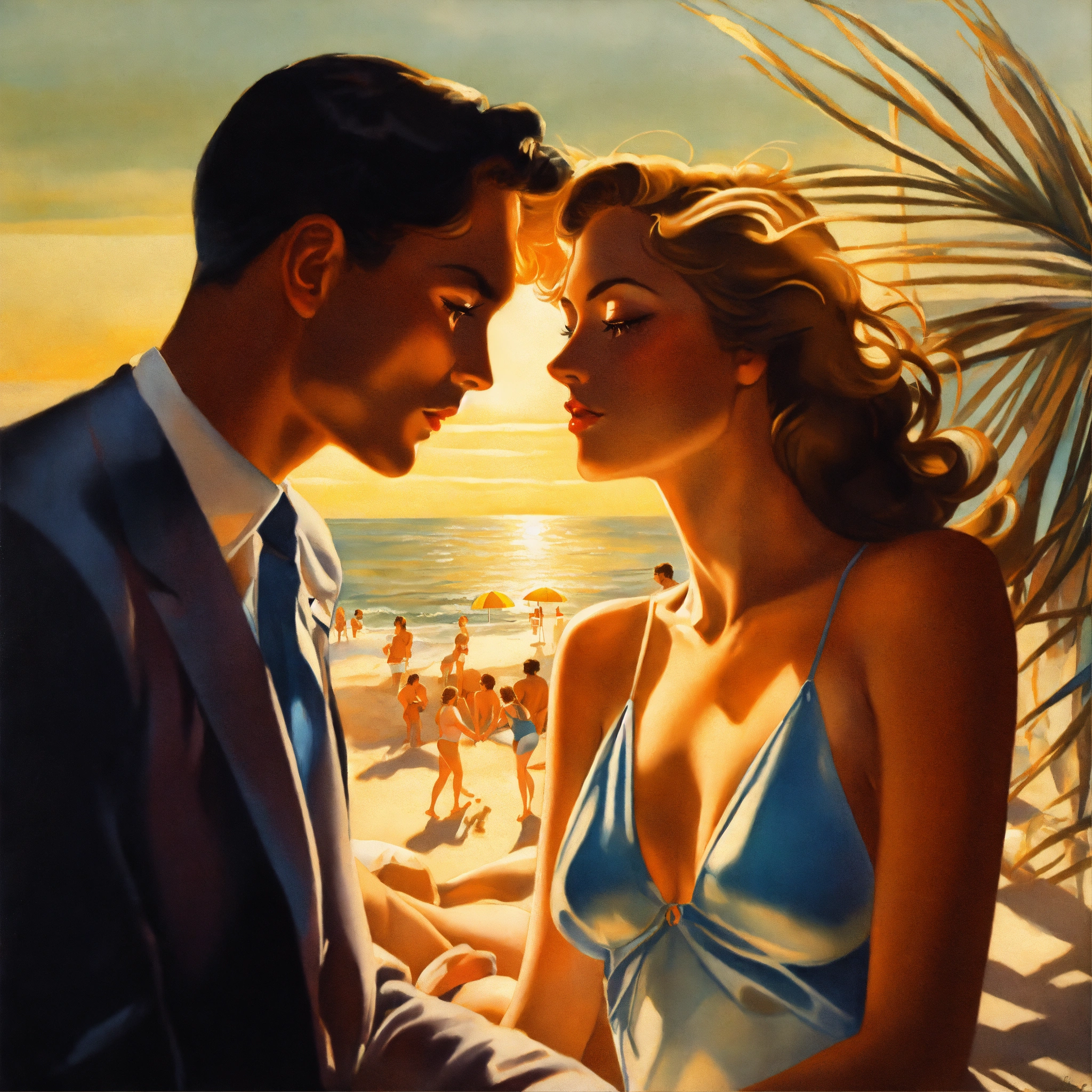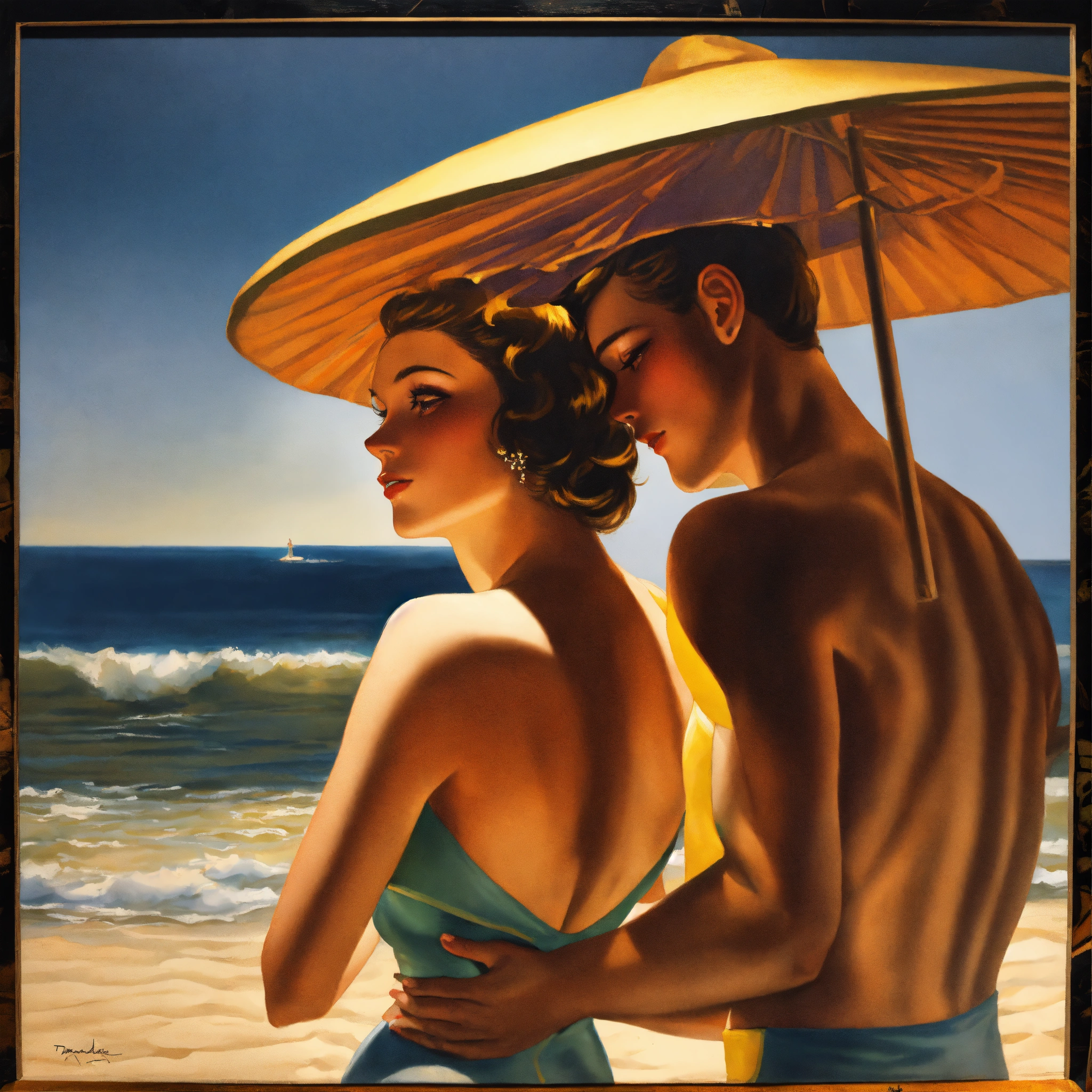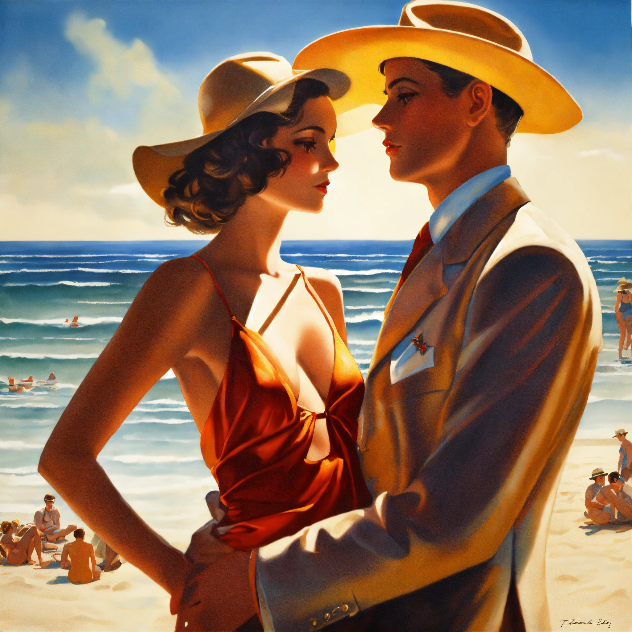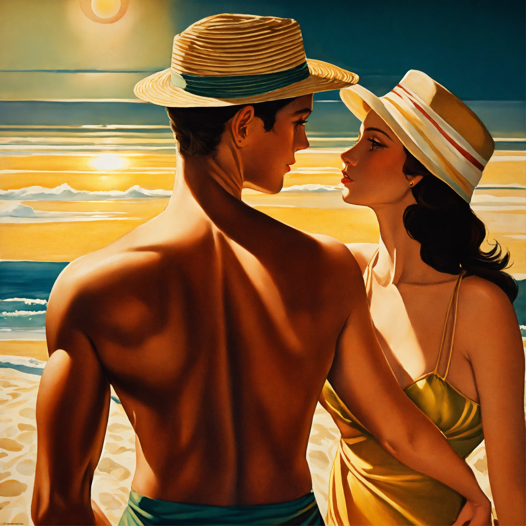 Perfect illustrated by tamara de limpicka, a close up of loving couple in swim suits alone forever with blazzing sun. stunning color scheme, masterpiece.beach scene with loads of sun shadows and shades. tricks of the light