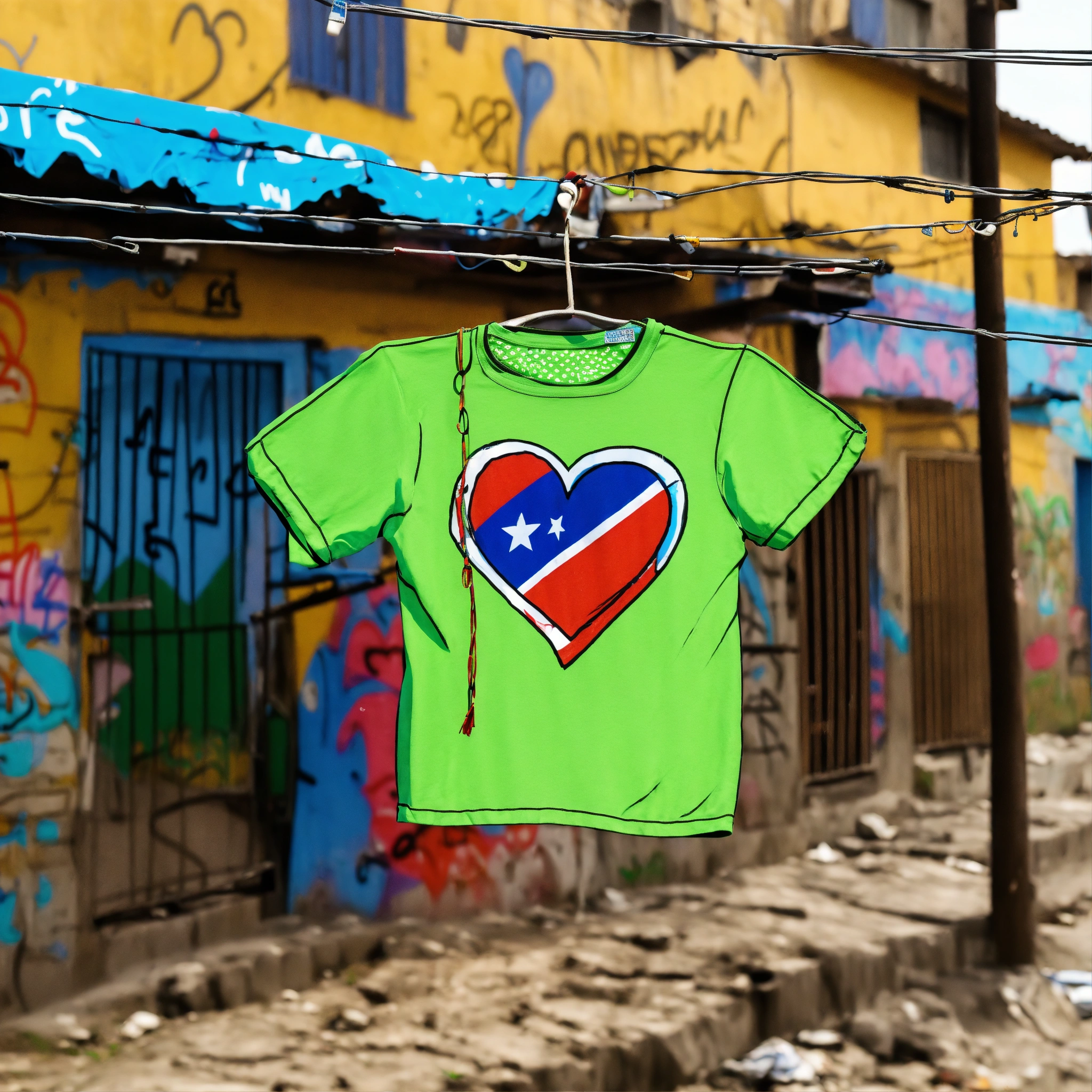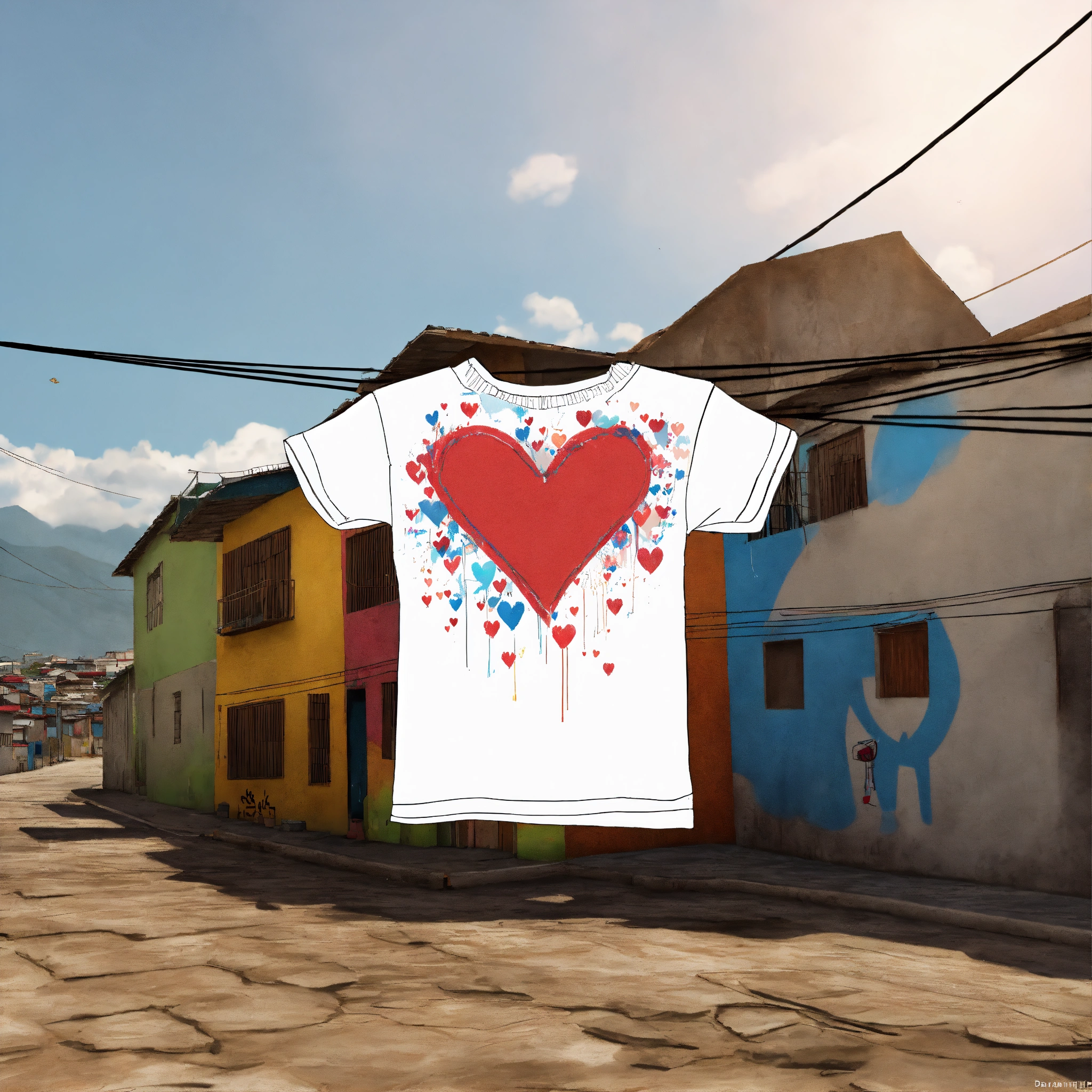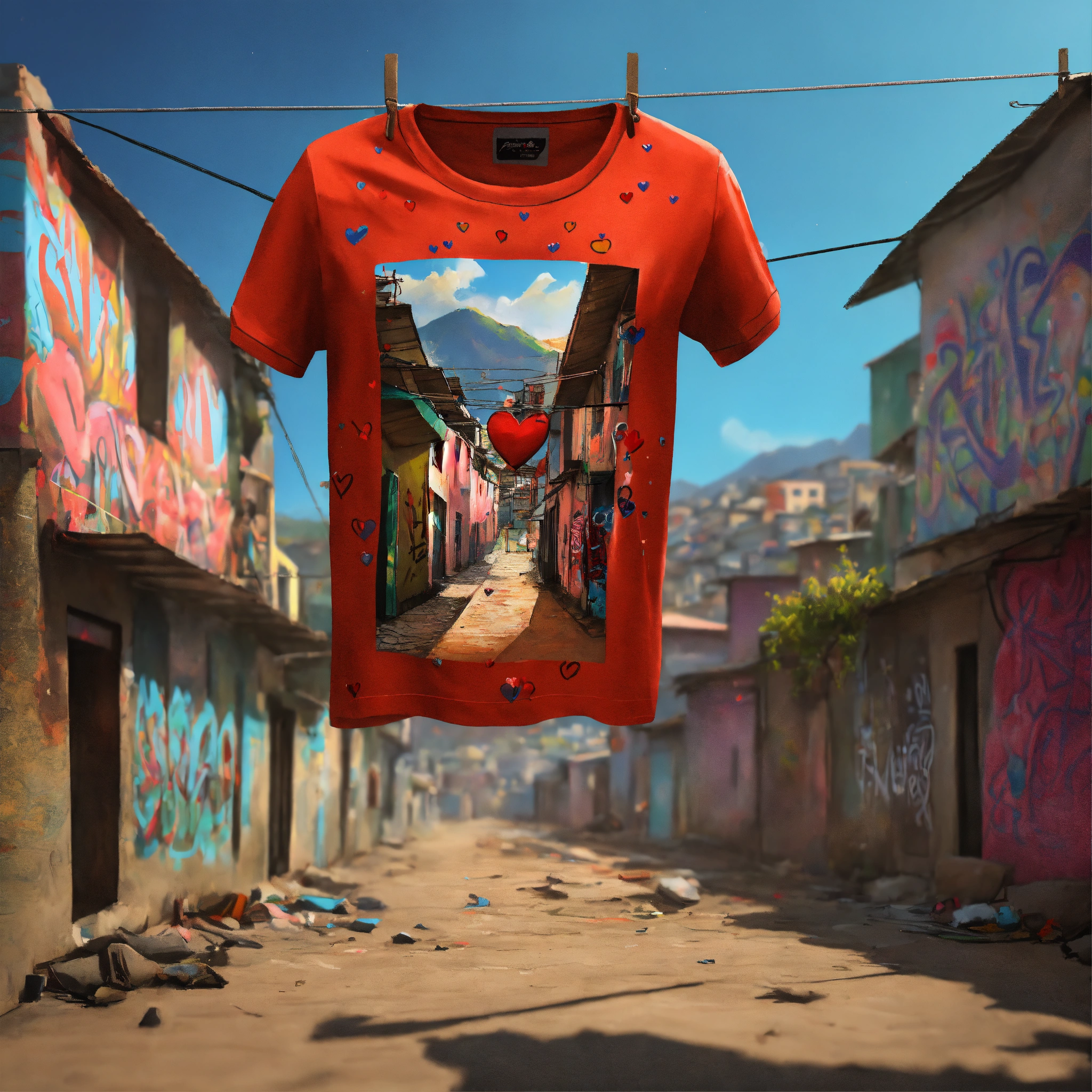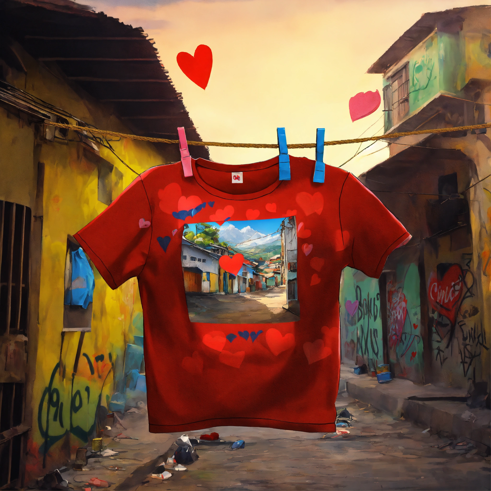 Virtual drawing of a chilean t-shirt hanging on a clothesline in a favela with graffiti of hearts
