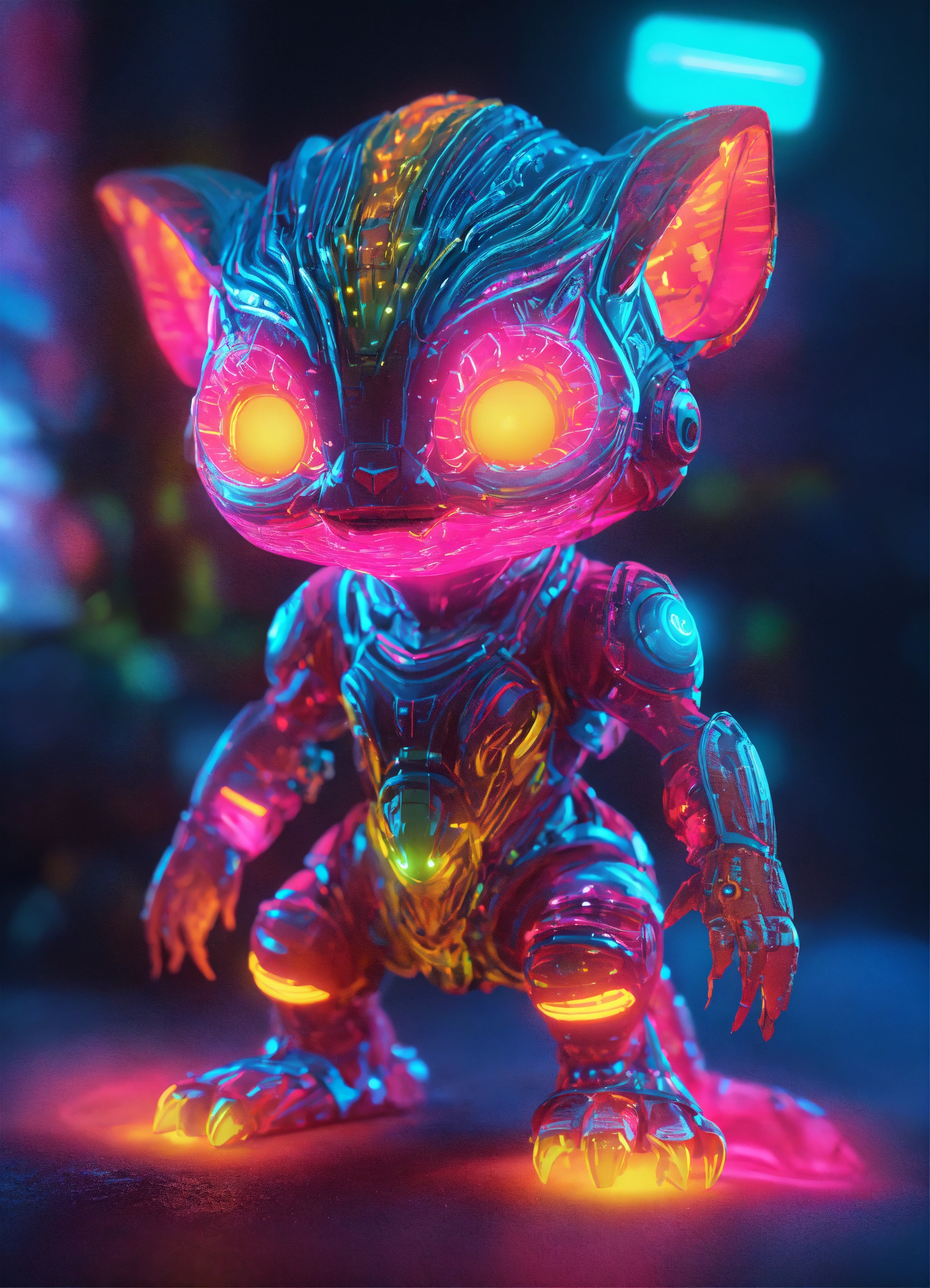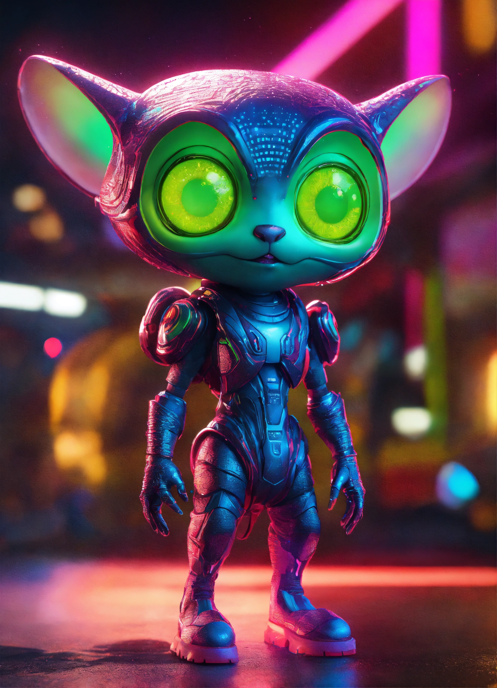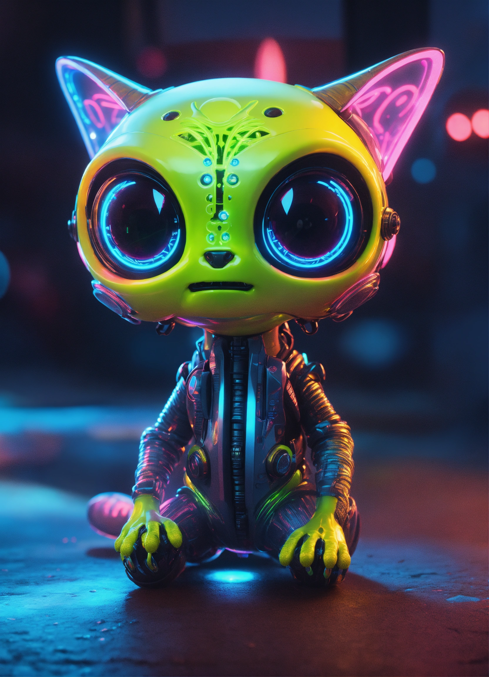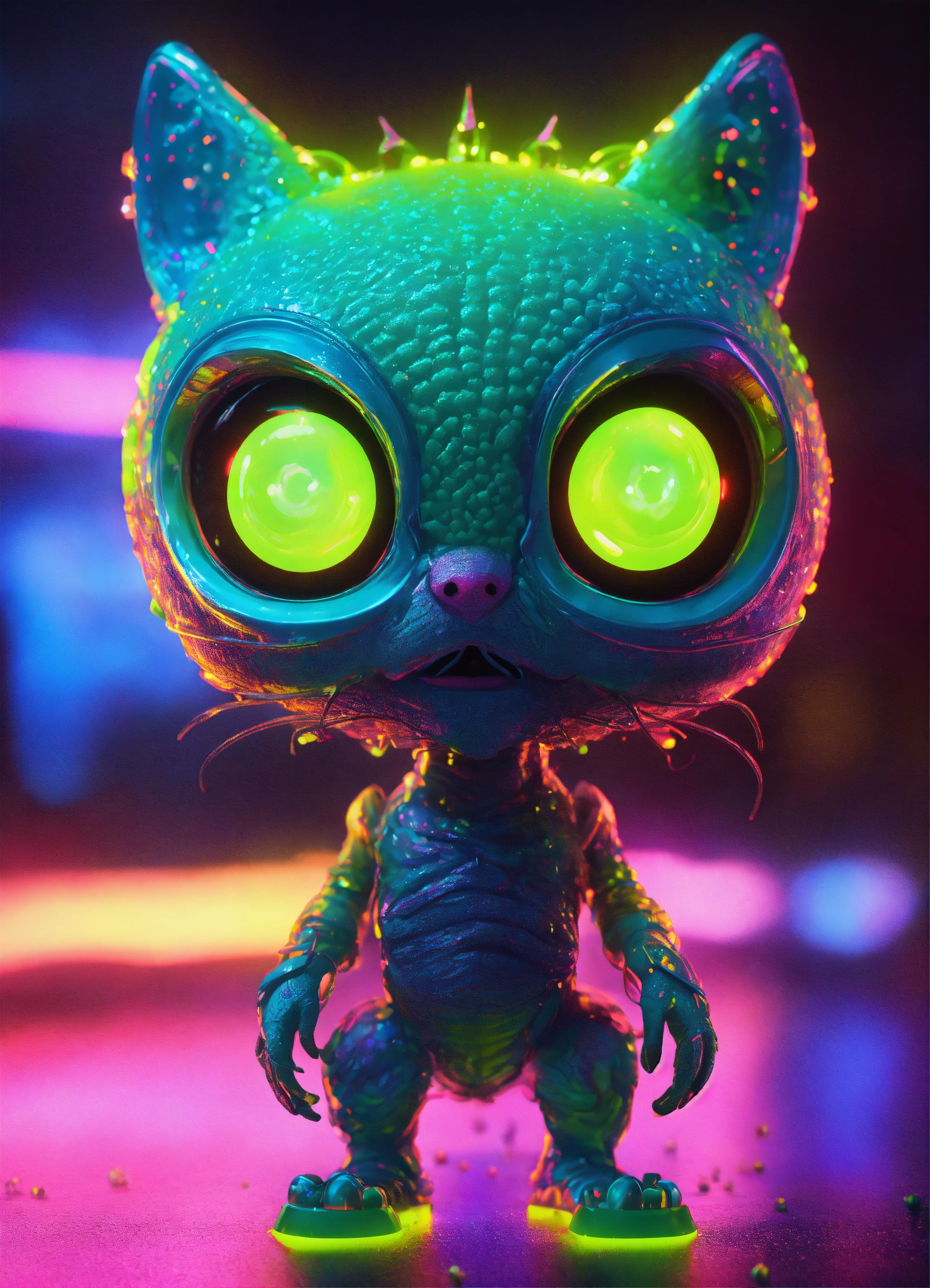 Gelly cute alien monster, full-body, neon glow colors, highly intricate details, 3d, cgi, realistic light, trending on cgsociety, glowing eyes, facing camera, neon details, ultra realistic details, portrait, sci fi atmosphere, global illumination, shadows, octane render, 8 k, ultra sharp, cat attributes