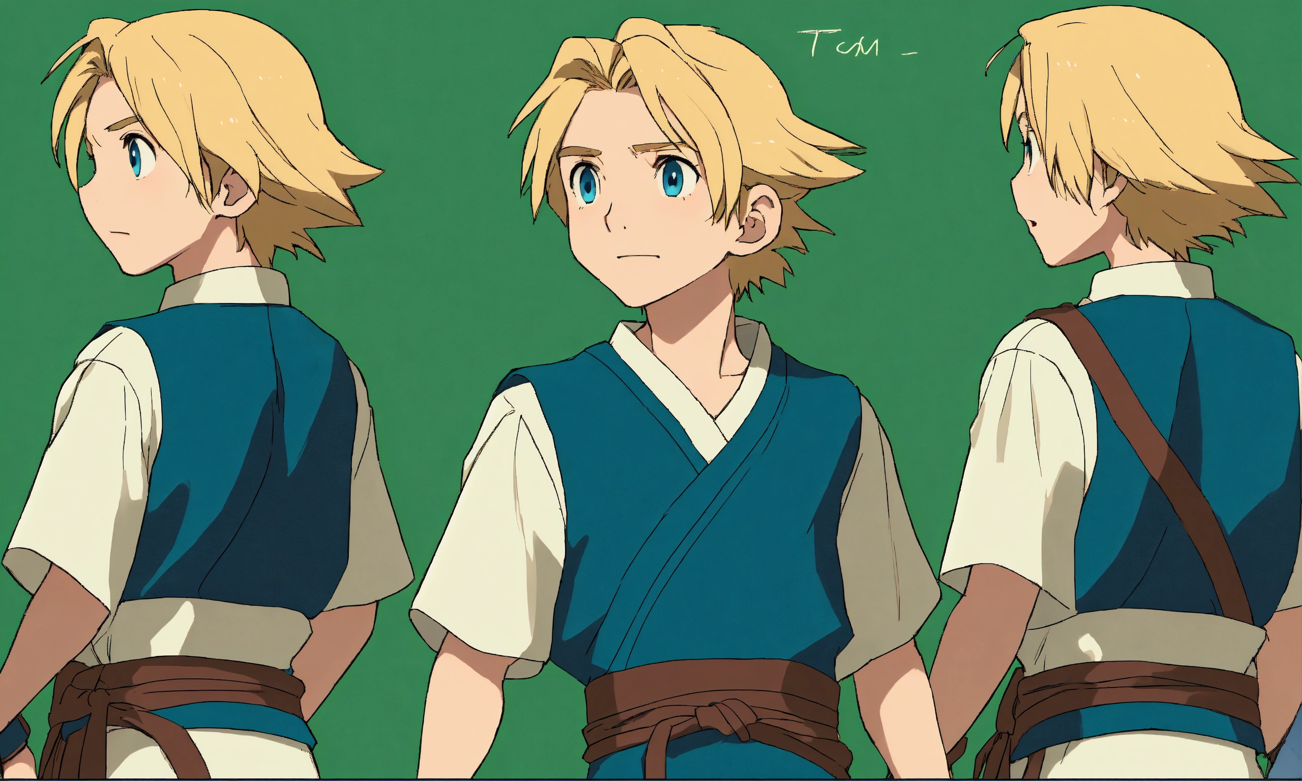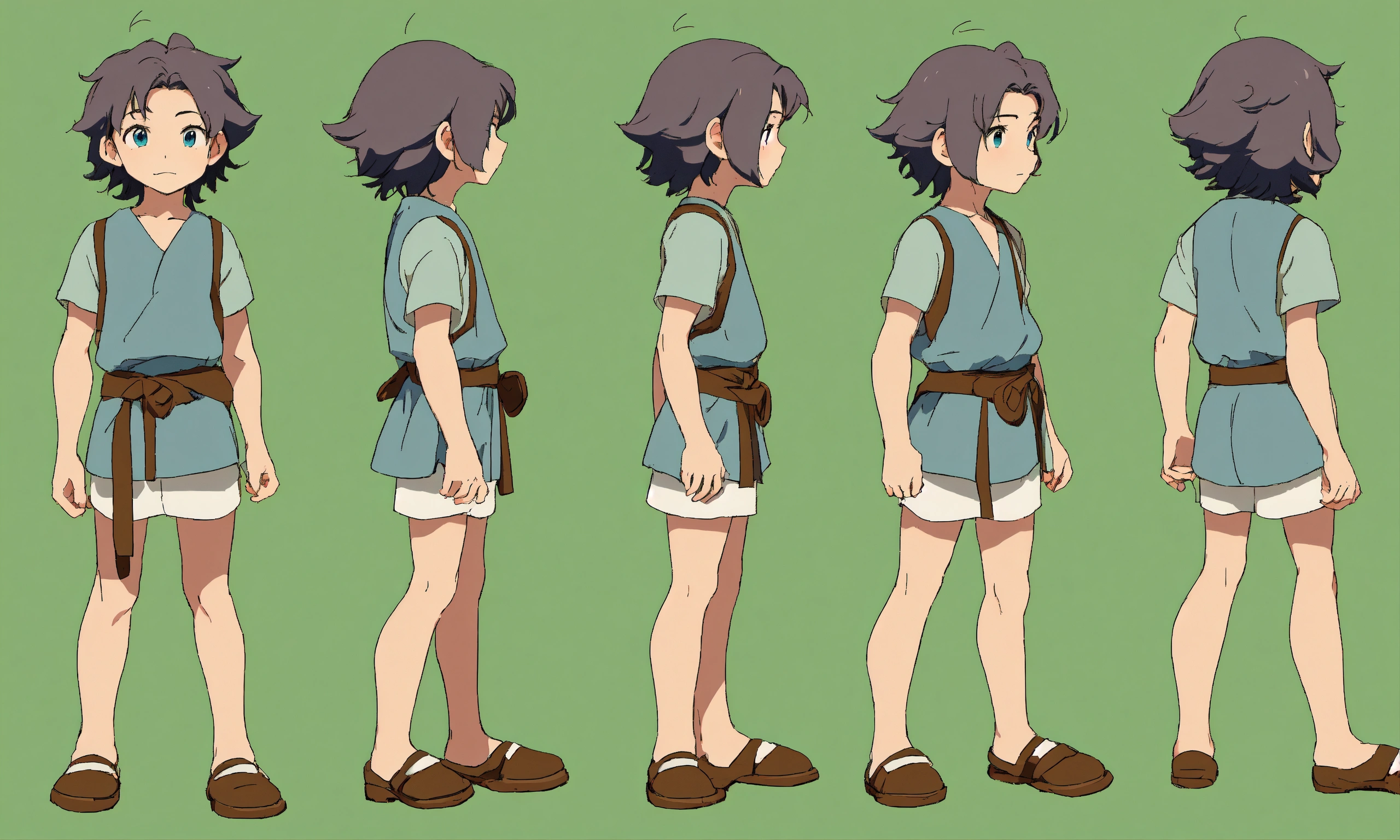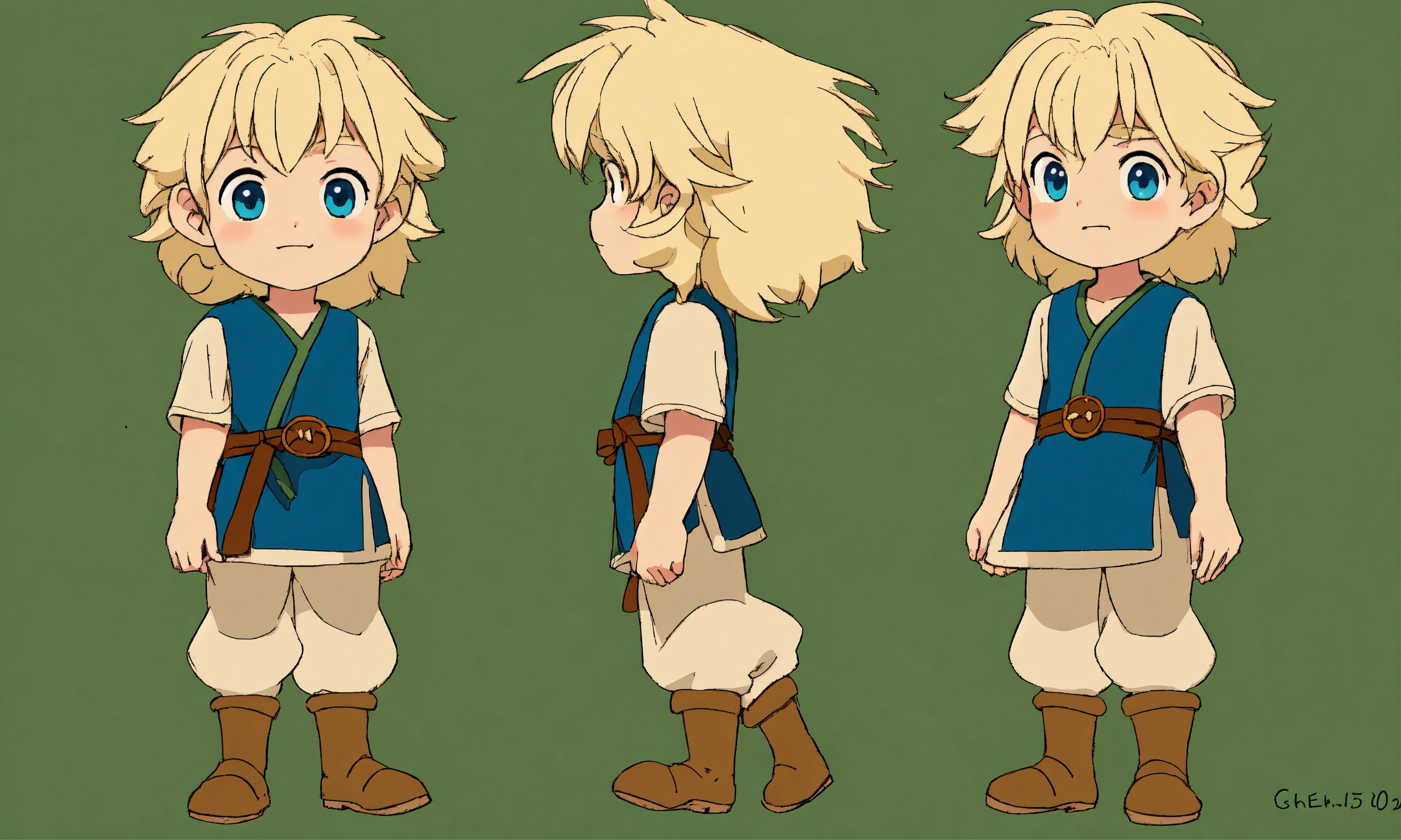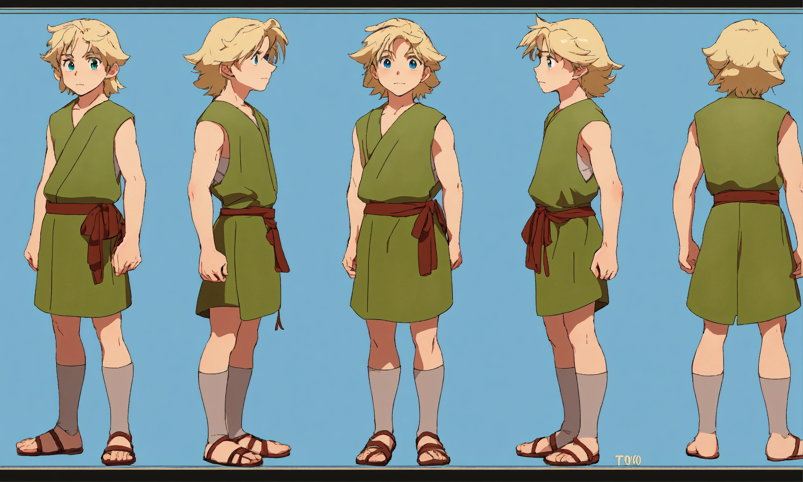 Character sheet, multiple angles, studio ghibli animationcute boy cartoon, shepherd boy, 15 years old, blue eyes, drak blue dress, cute boy long hair cute and adorable cartoon tom holland baby white skin, full body pose, !!! legs!!! blonde hair, handsome, 500 bc years, shepherd boy cartoon, old israeli dress, attack position, green background