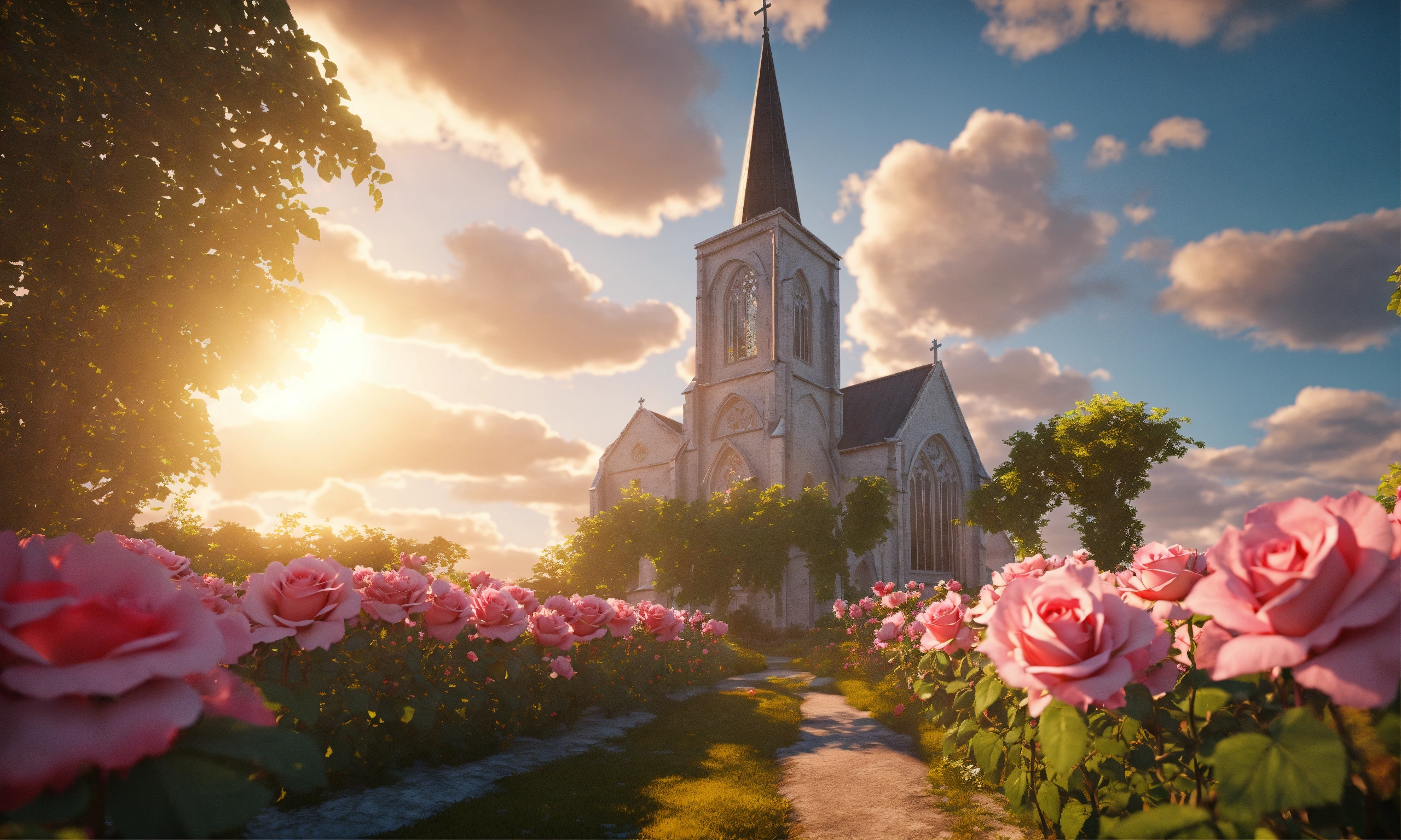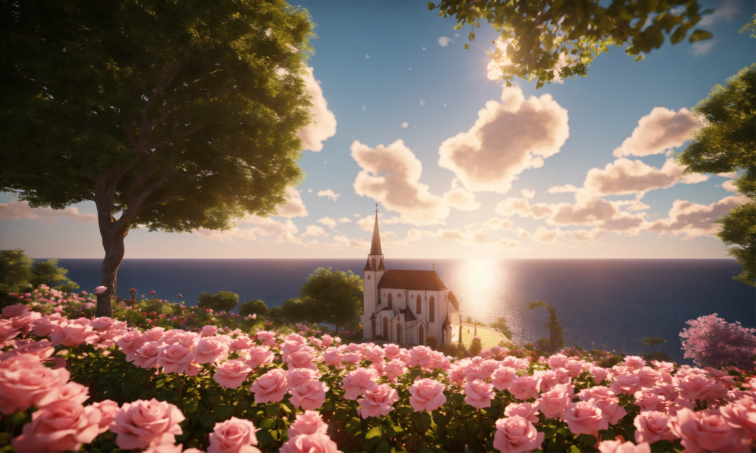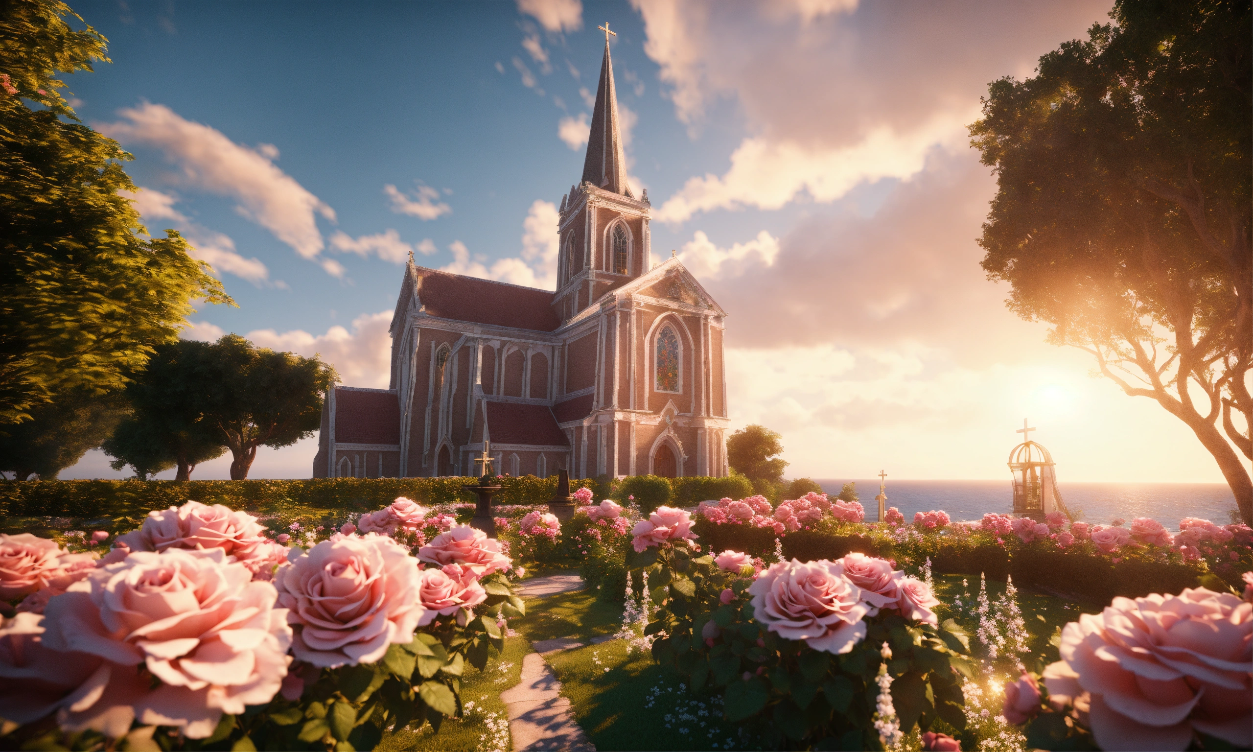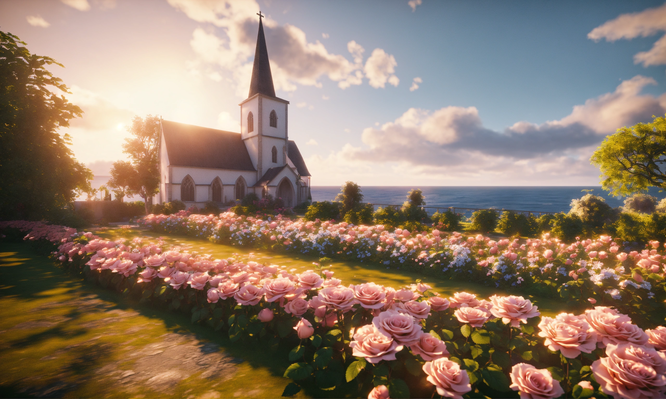 Unreal engine 8k rose garden with heavenly clouds and sun shining with beautiful church in the distance overlooking the ocean