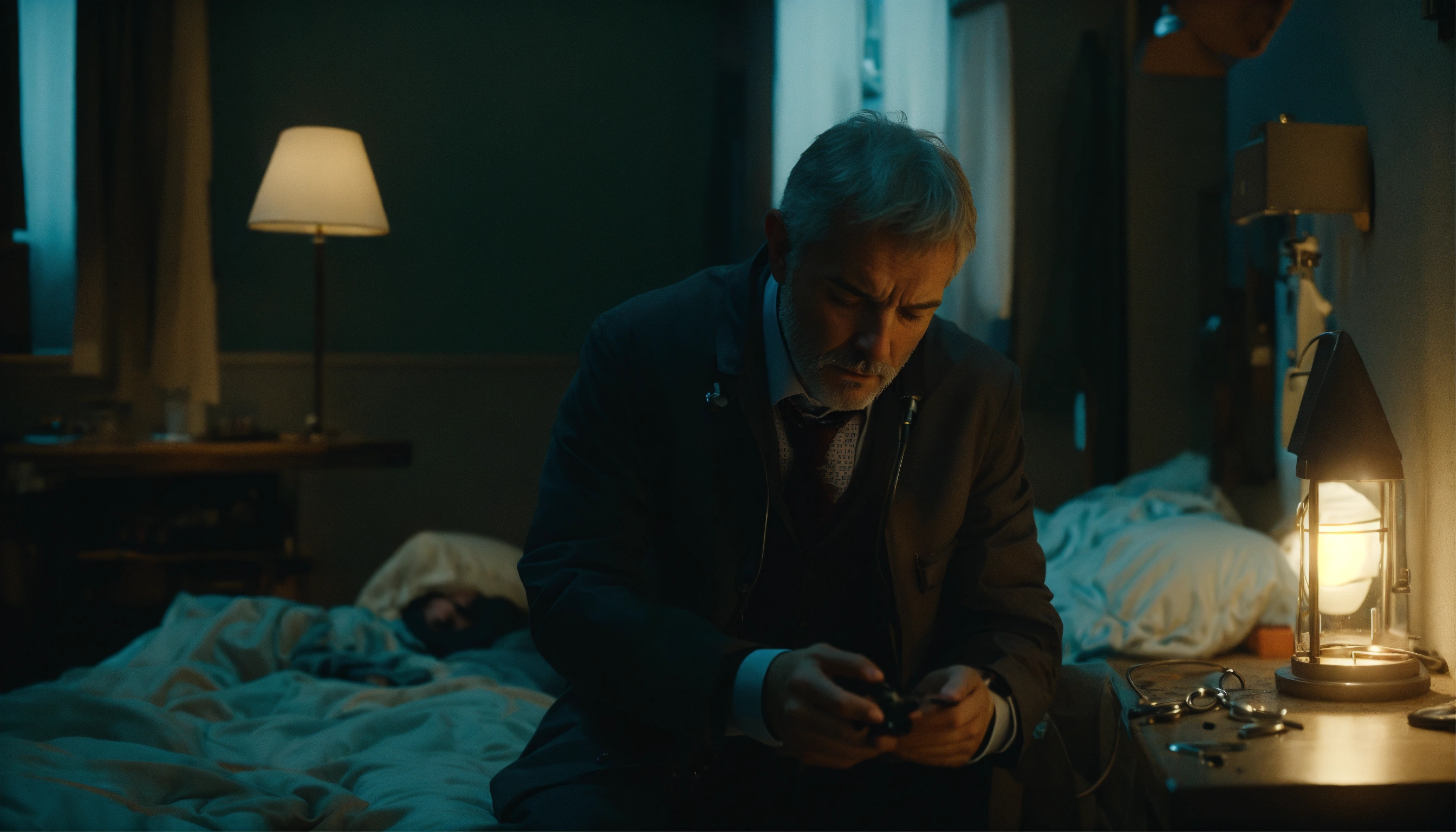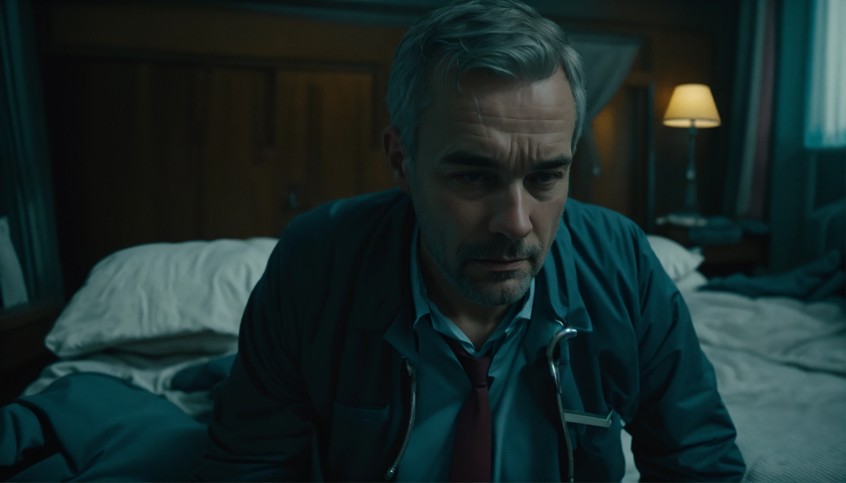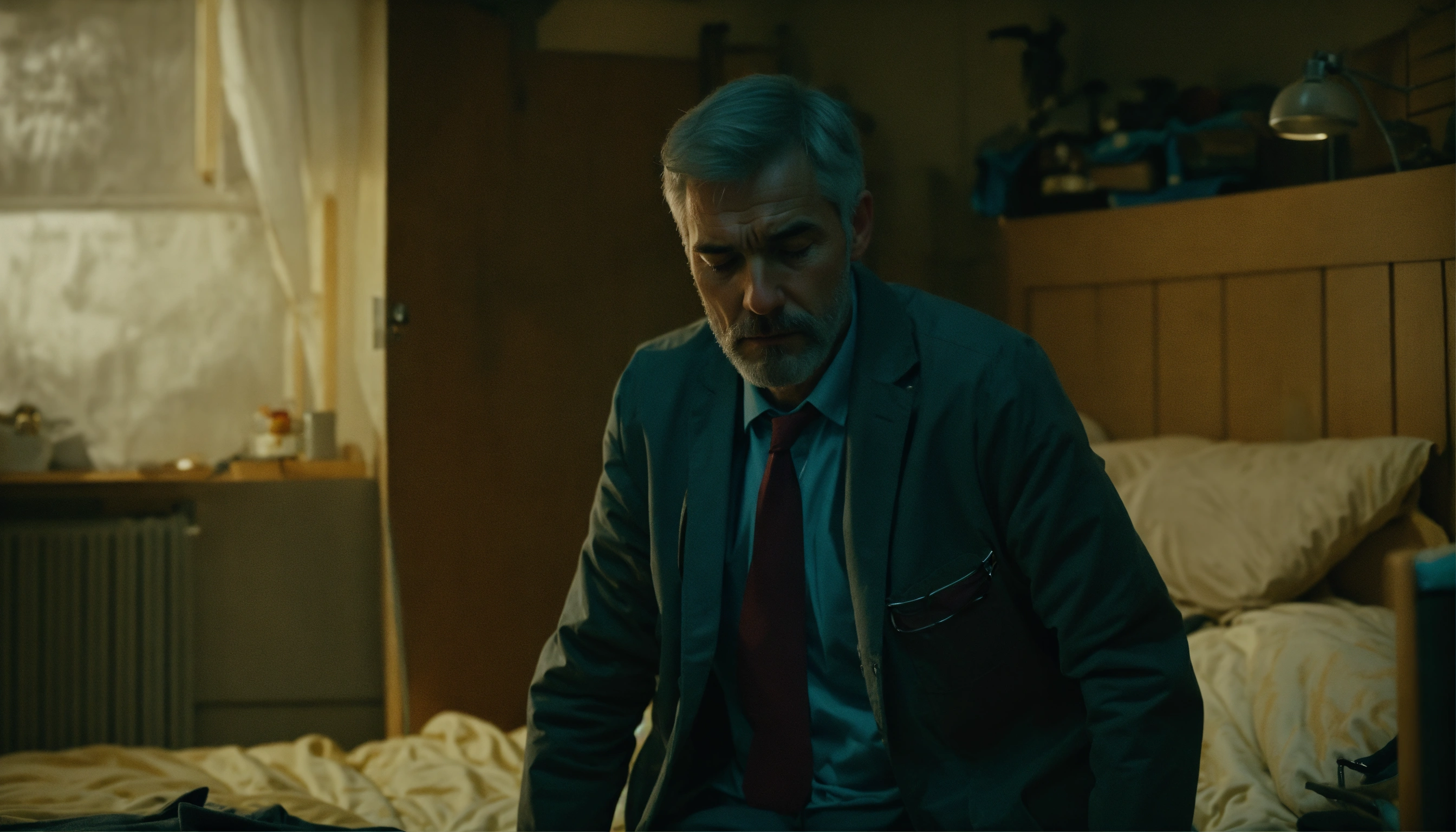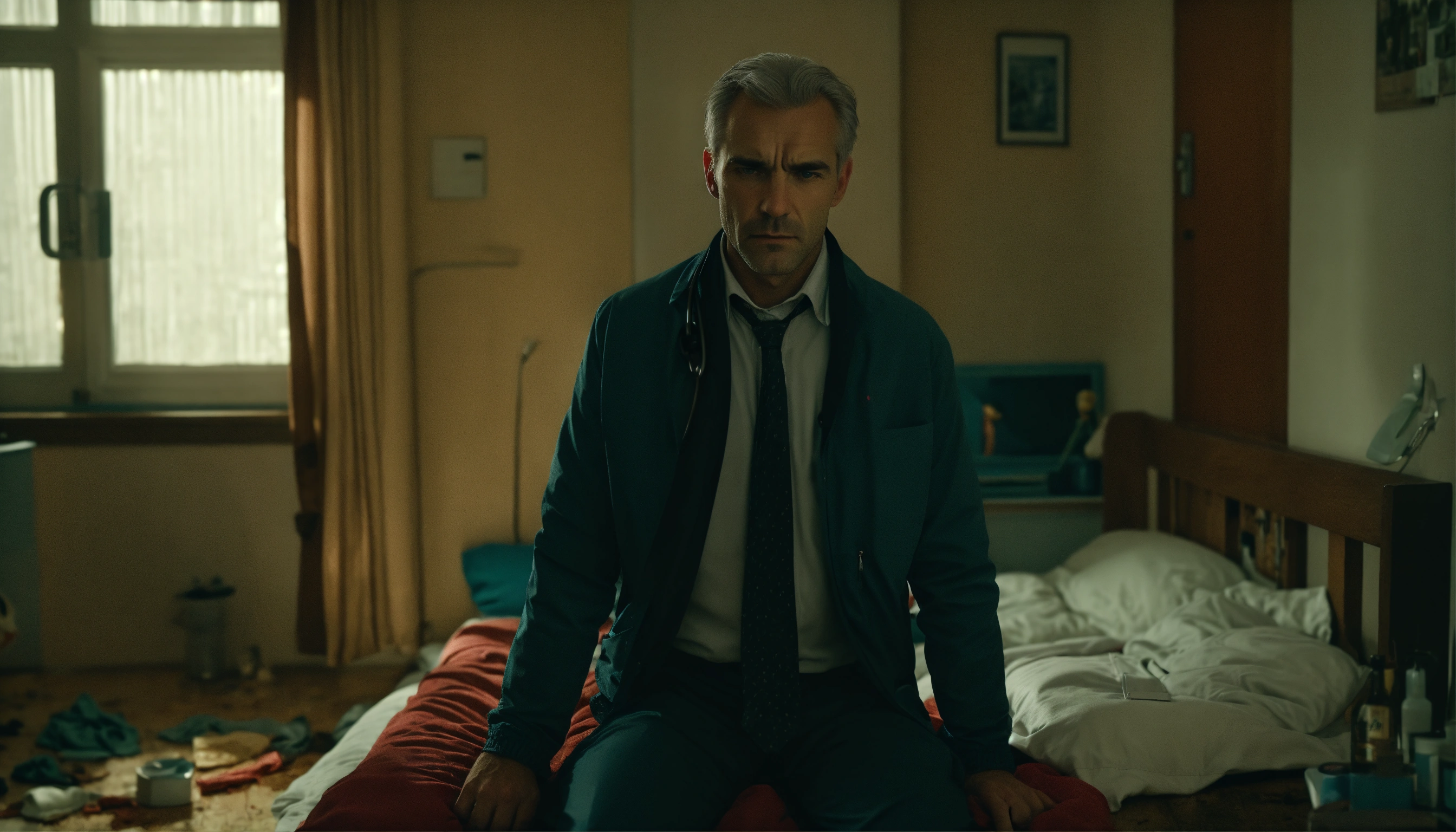 Stefan is a swiss doctor, gray hair, dressed in a jacket and tie, he is very ill. he is depressed, locked in his room in his house, lying on the floor, dirty, sick, pale, dirty bed, untidy. high quality, 8k, cinematic.
