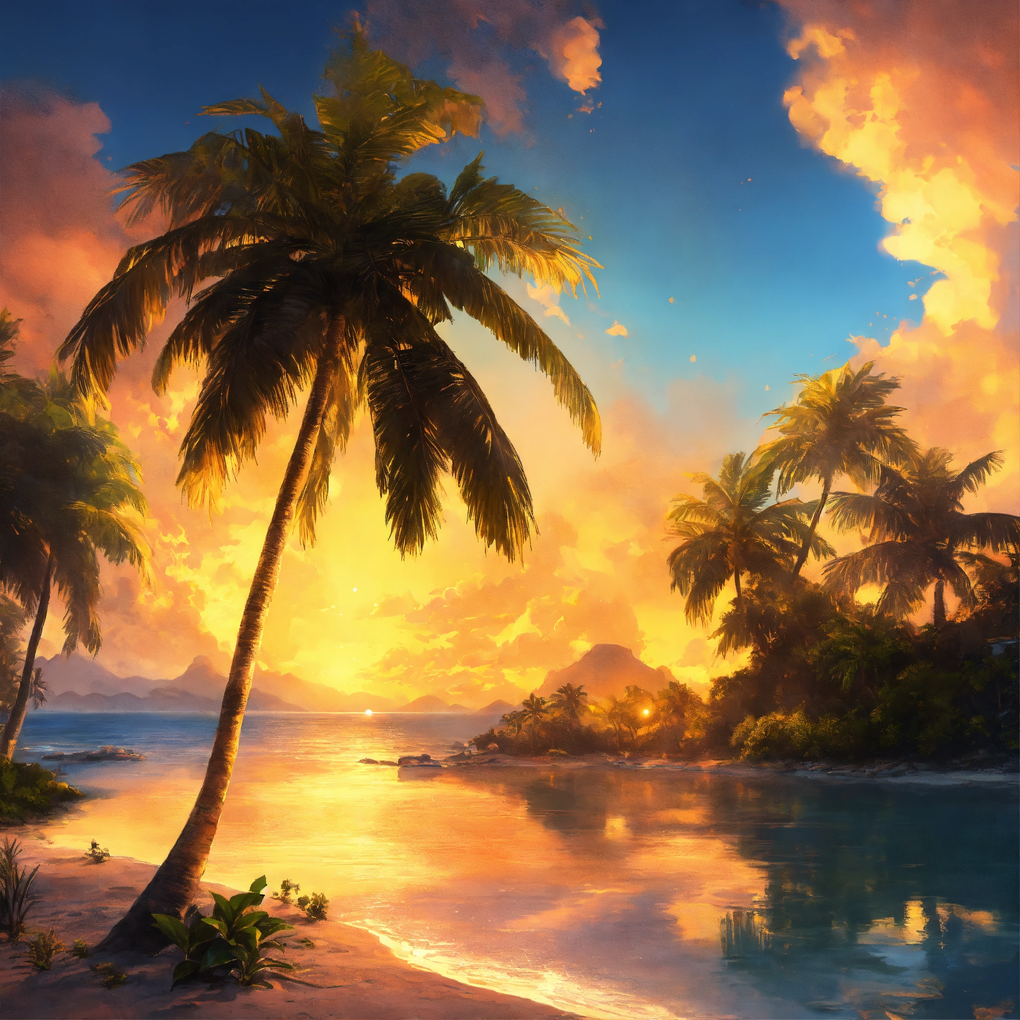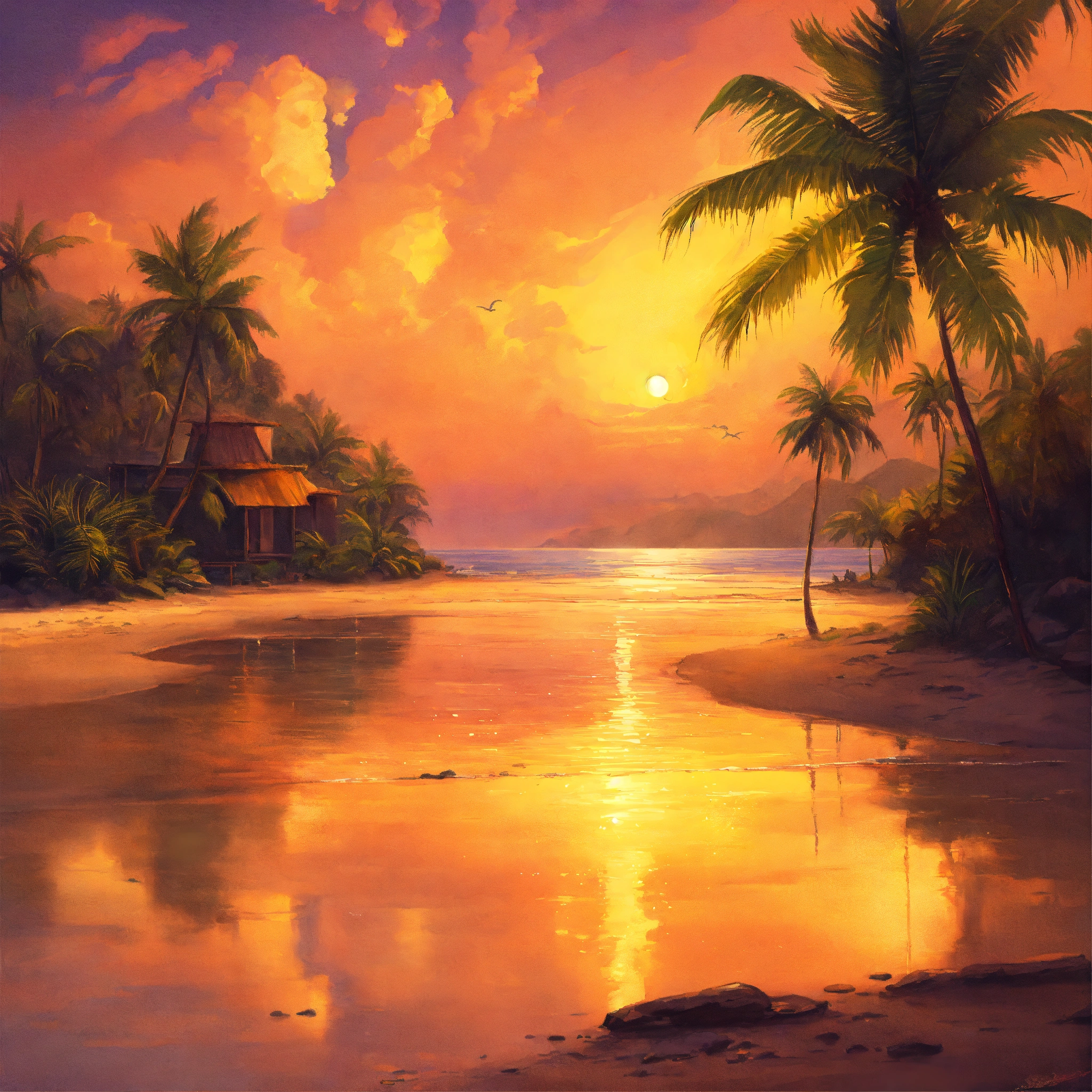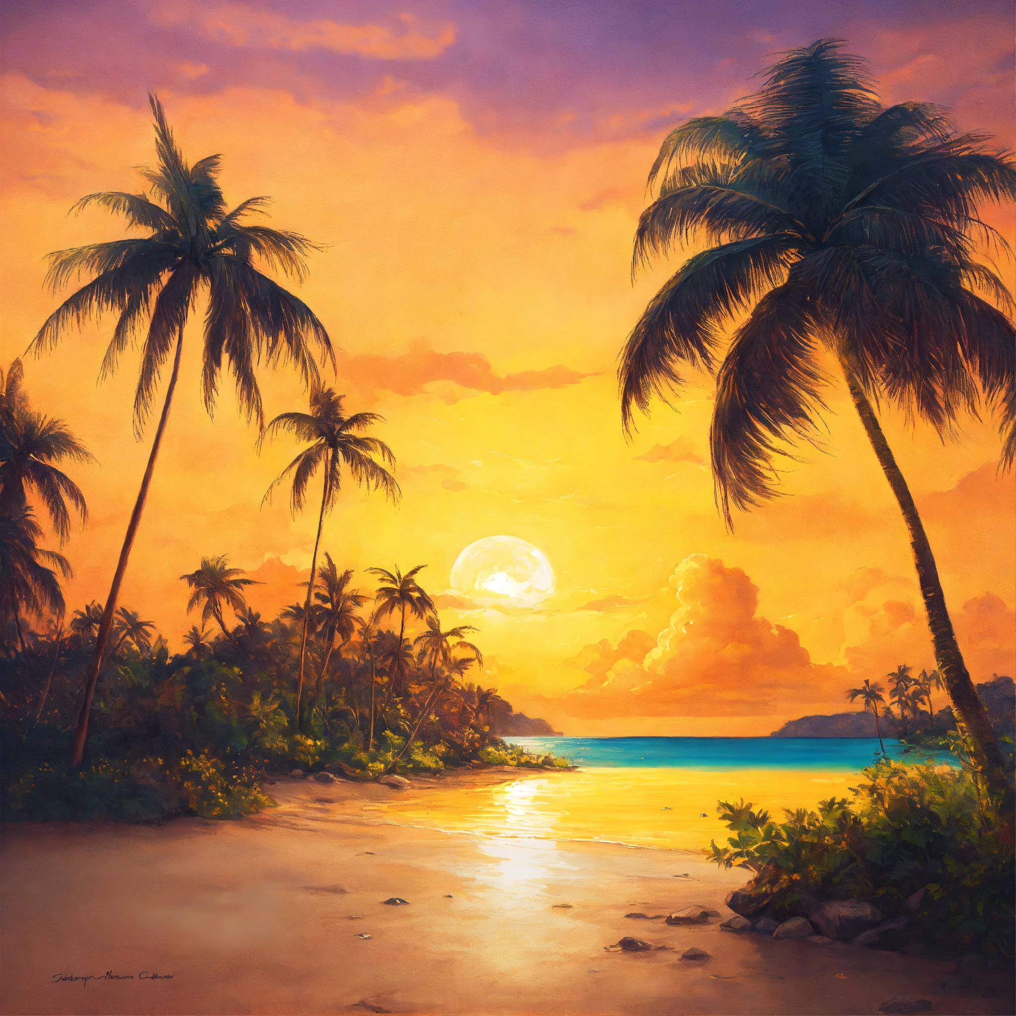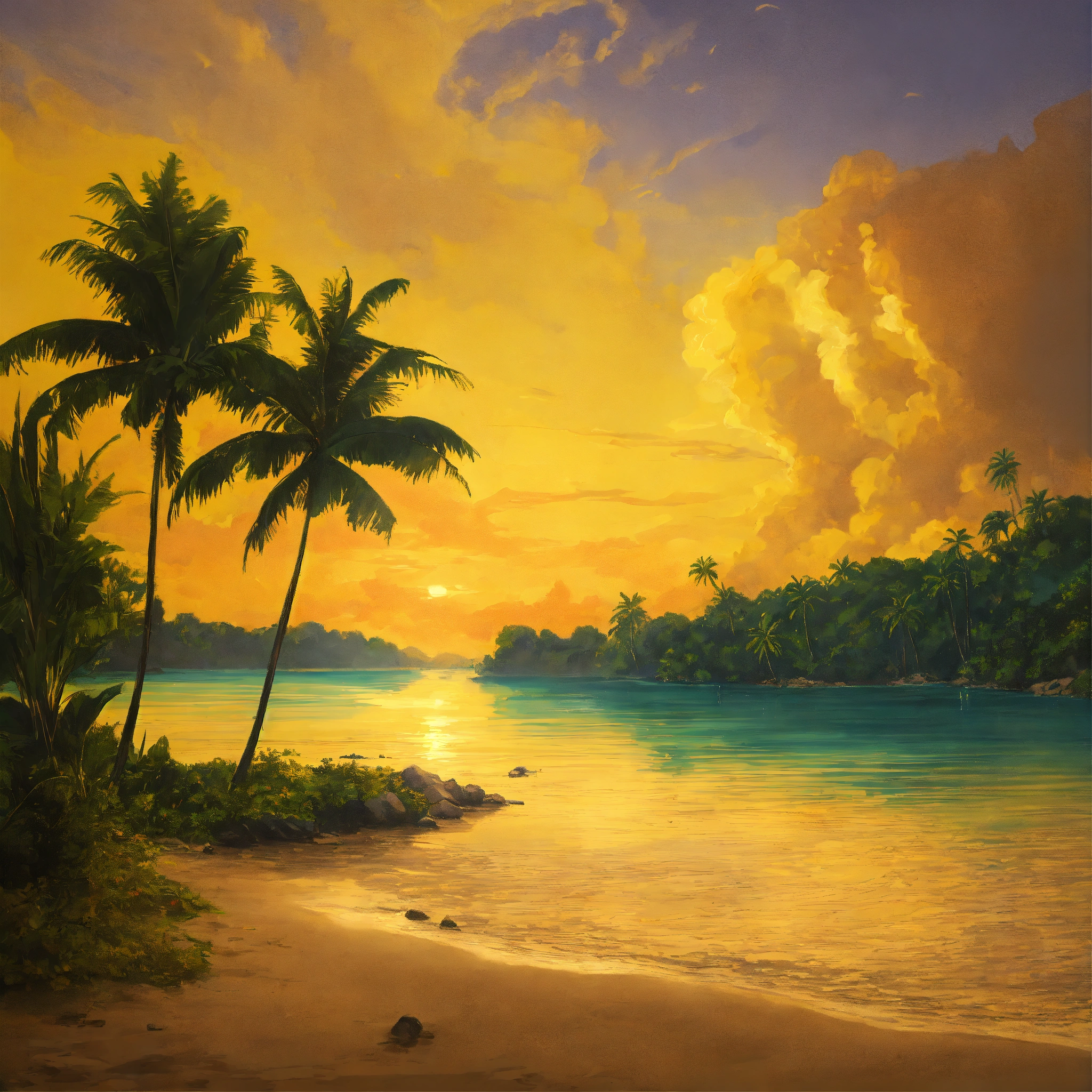A wallpaper painting of a tropical beach with an oasis lake and mellow yellow sky with comet