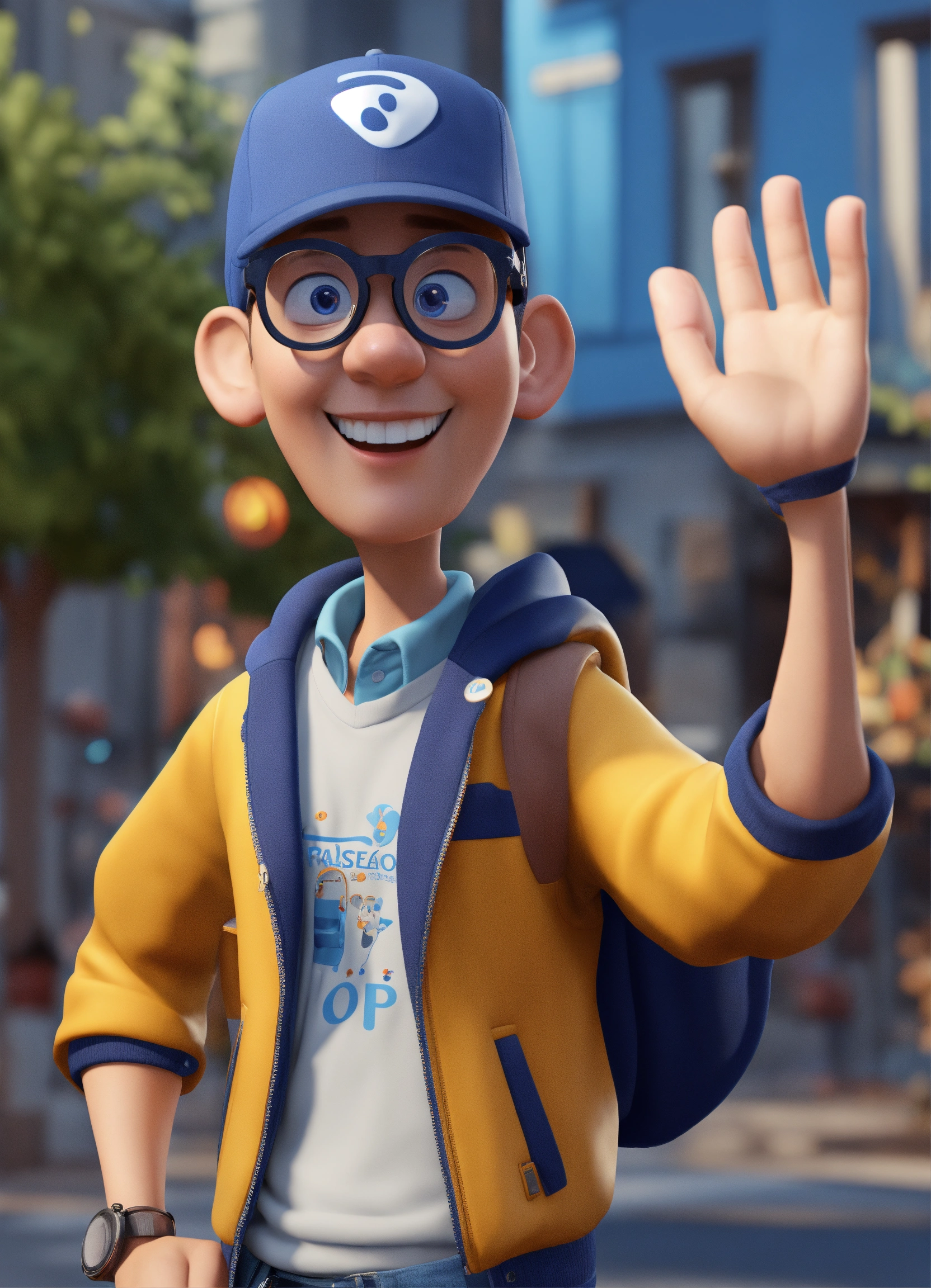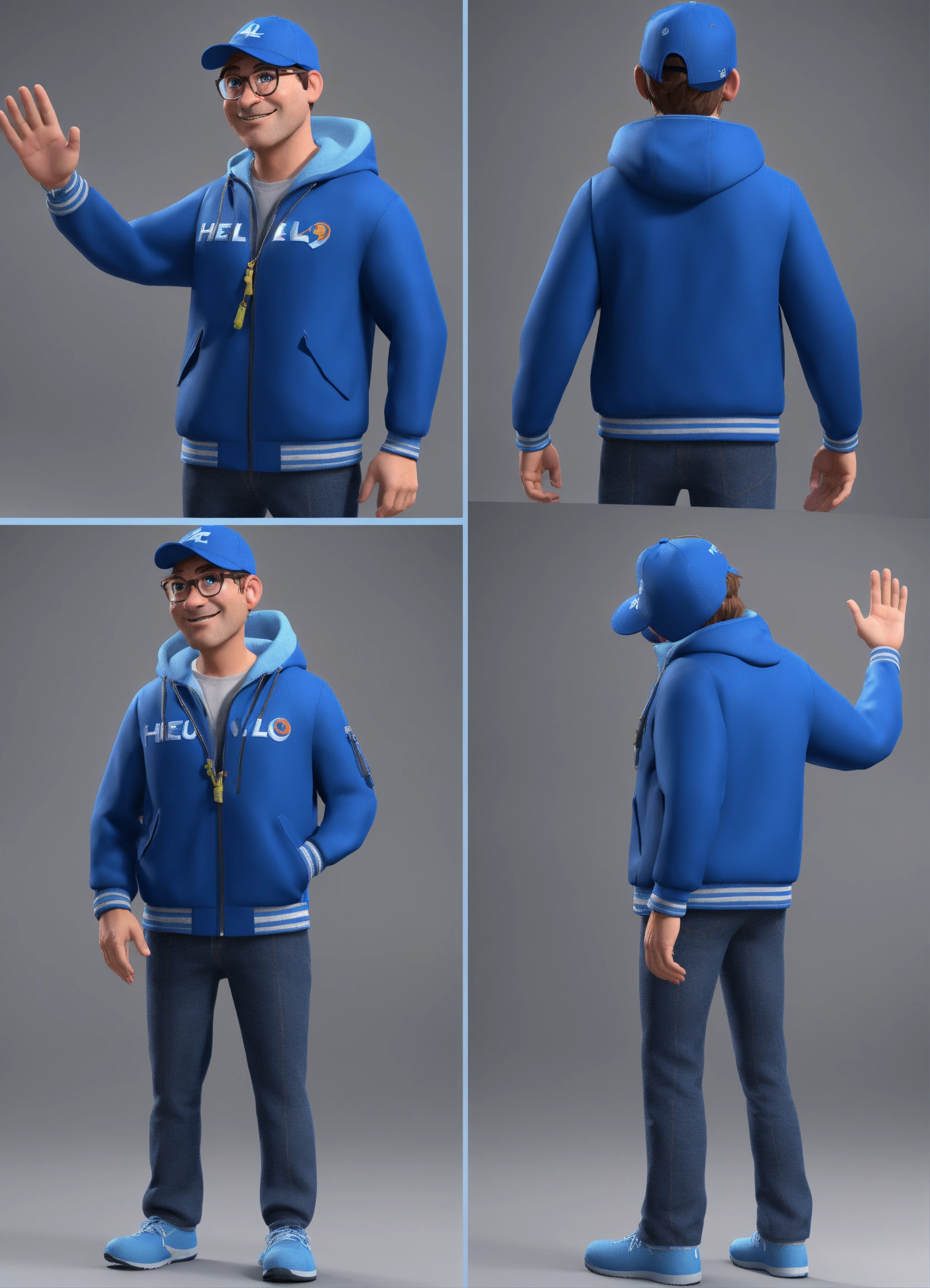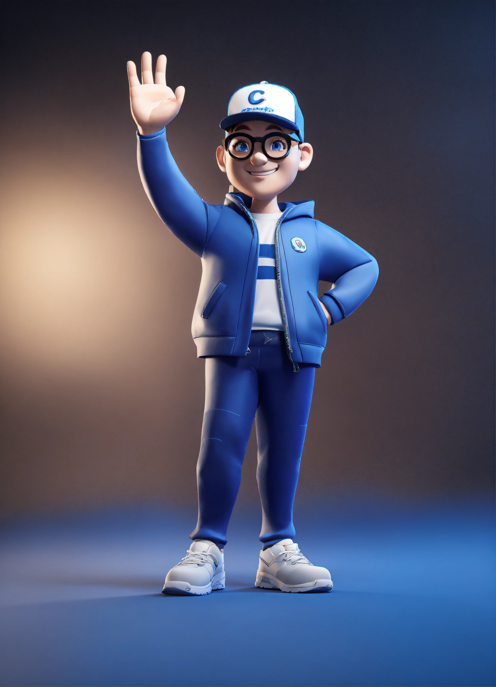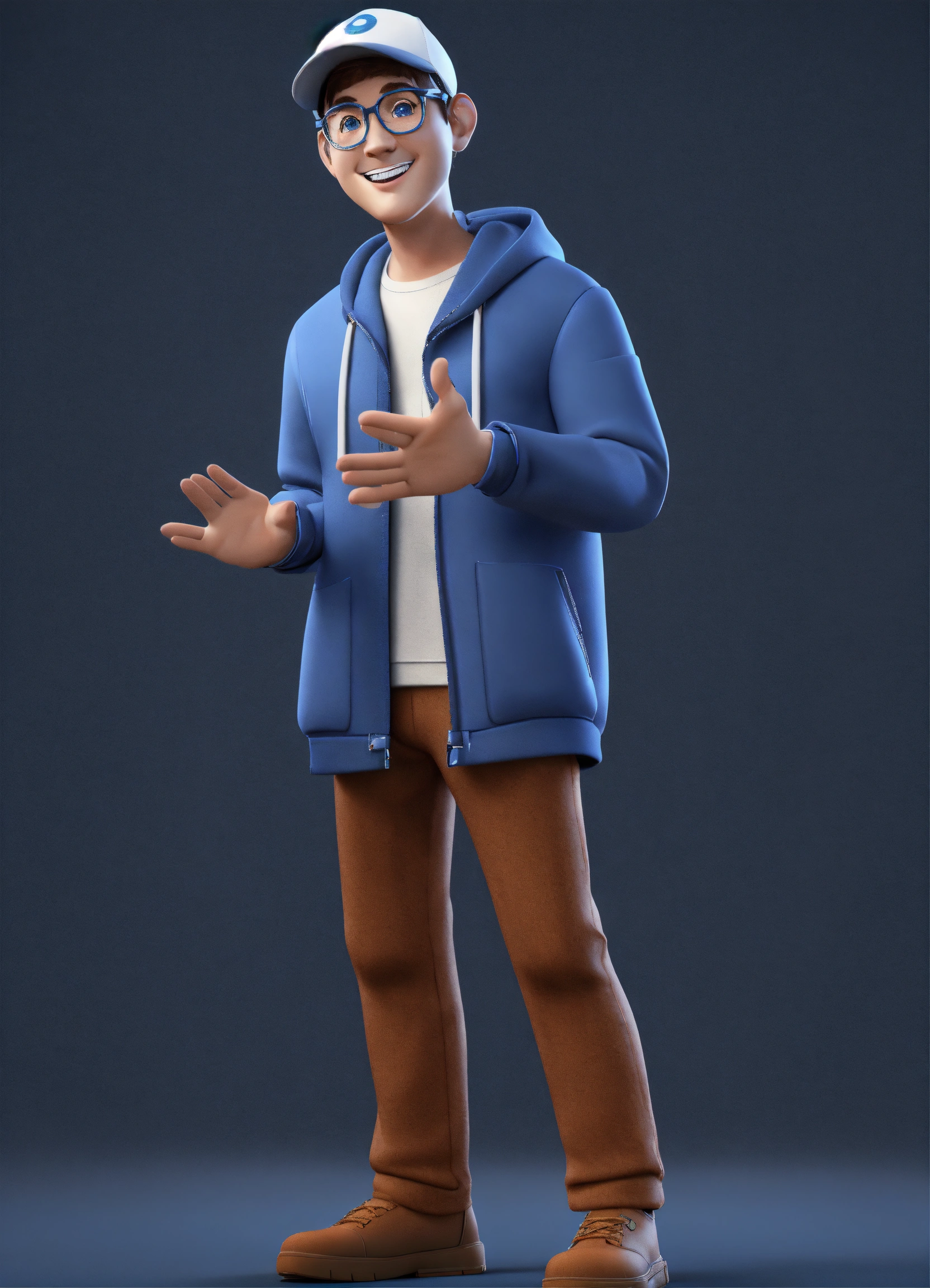 Standing white man in glasses and blue cap, dark blue jacket, white t-shirt, ((waving)), (saying hello), developer, faces to us, 3d render, pixar style, detailed digital art, stylized 3d render, c4d, (full height), high quality, composition, masterpiece, artstation, solid background