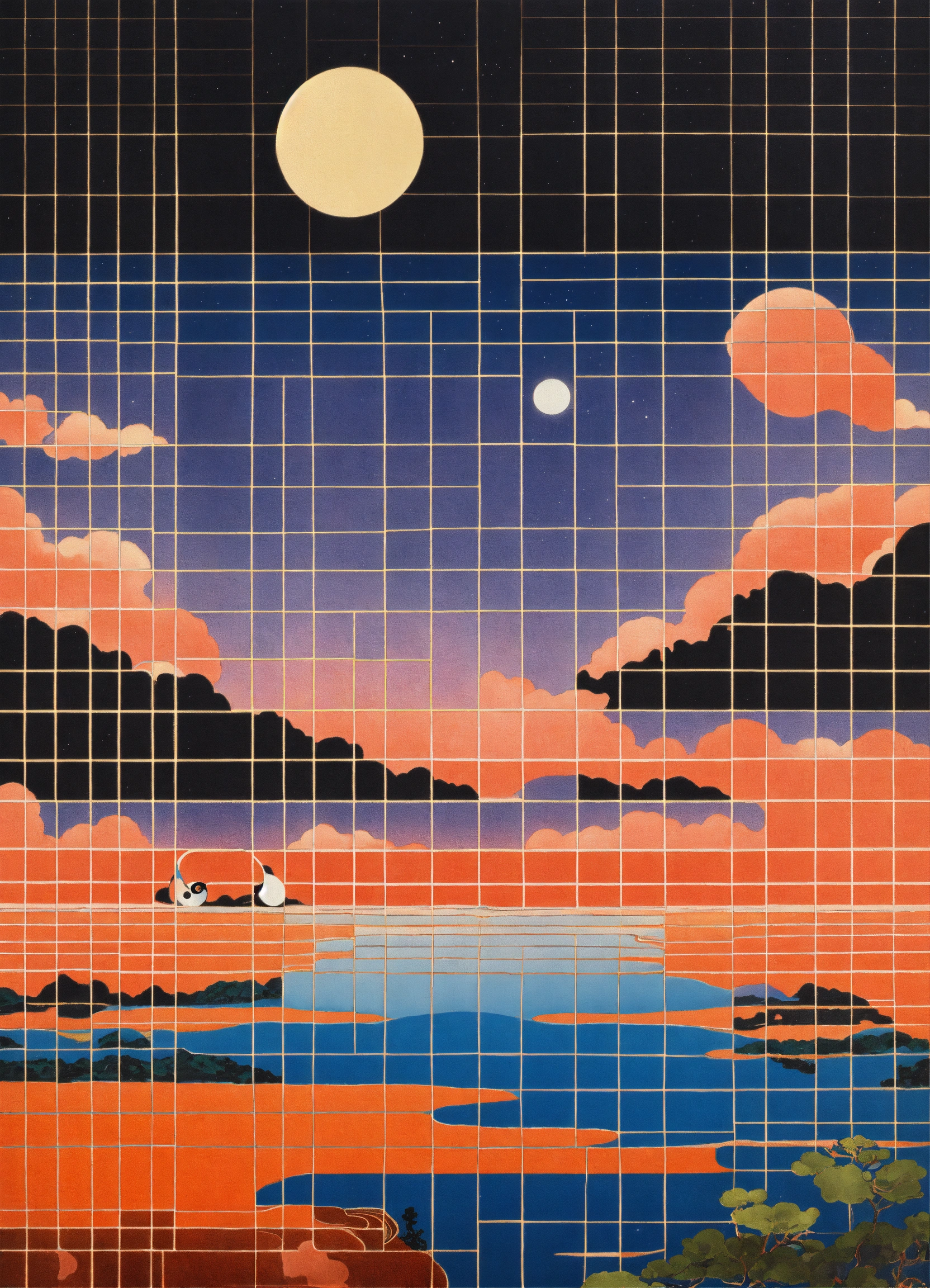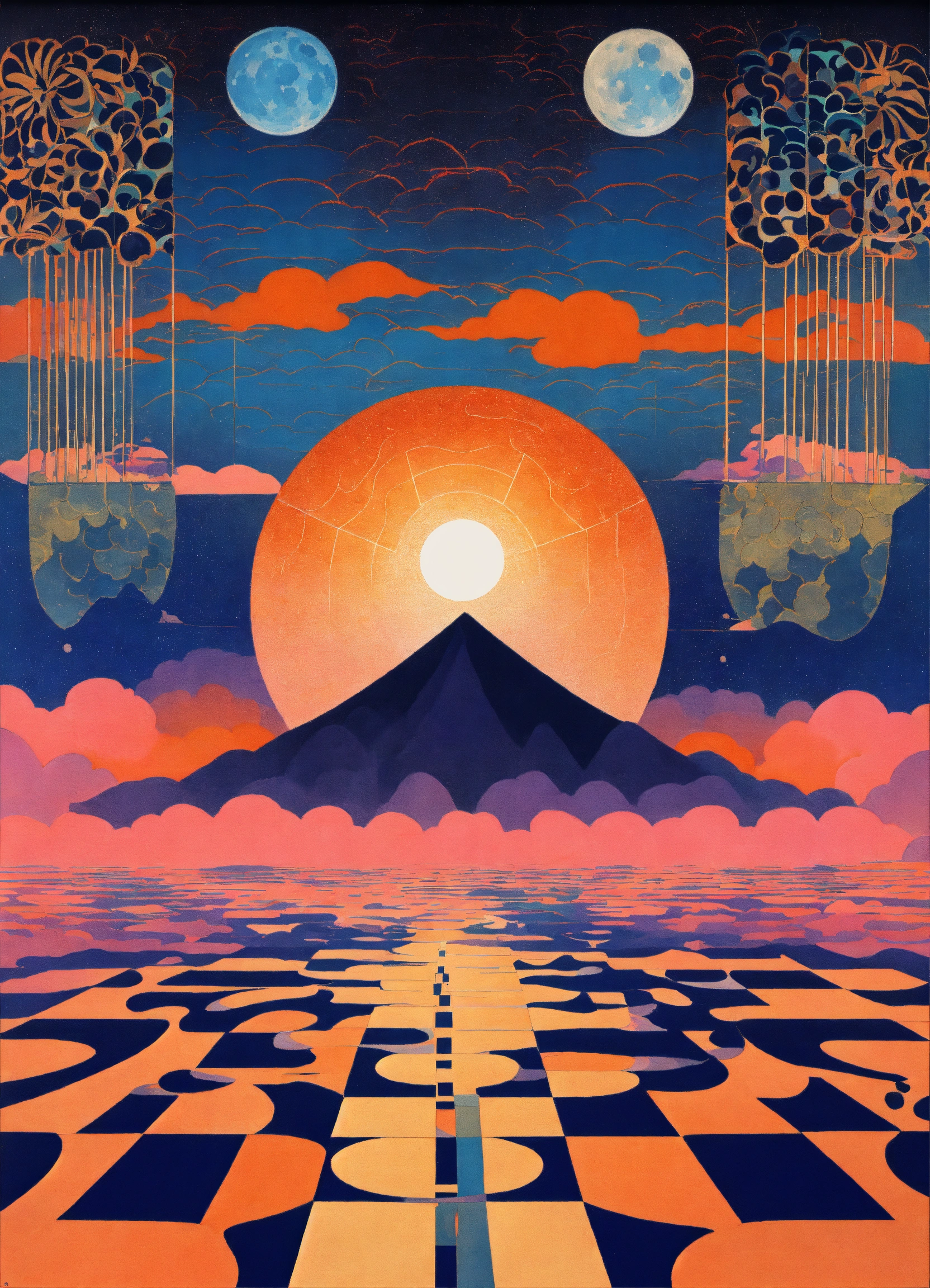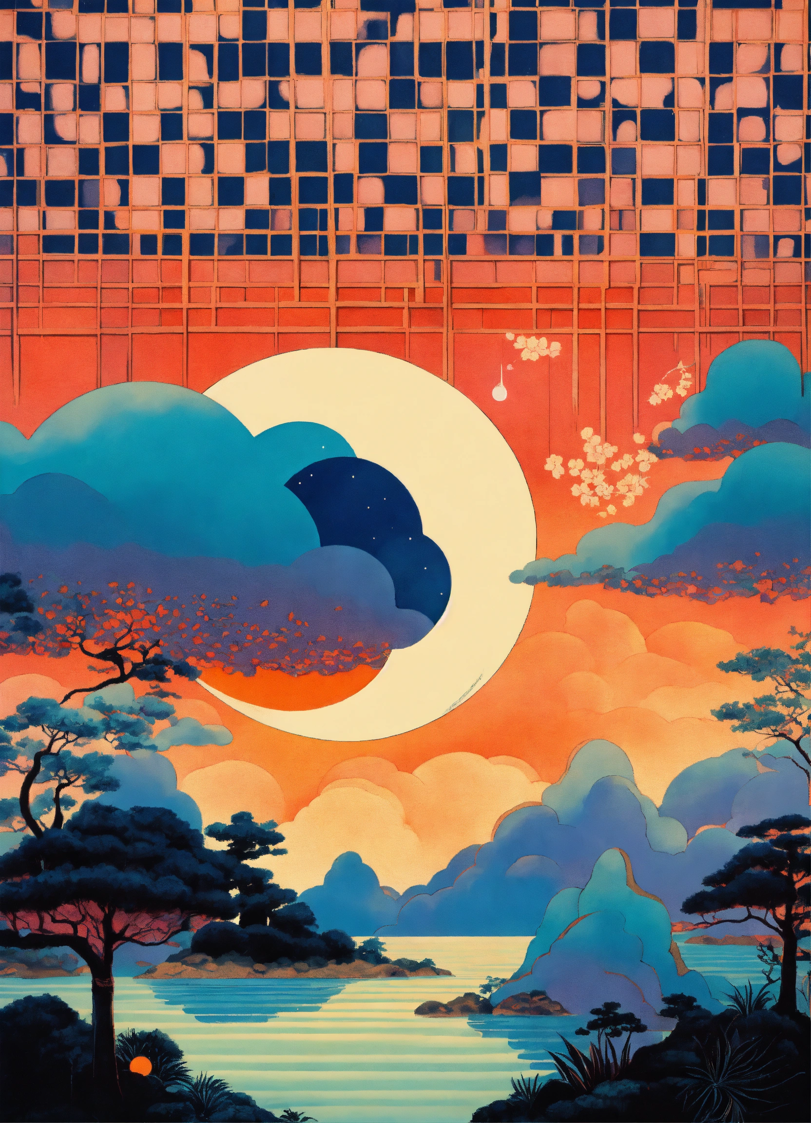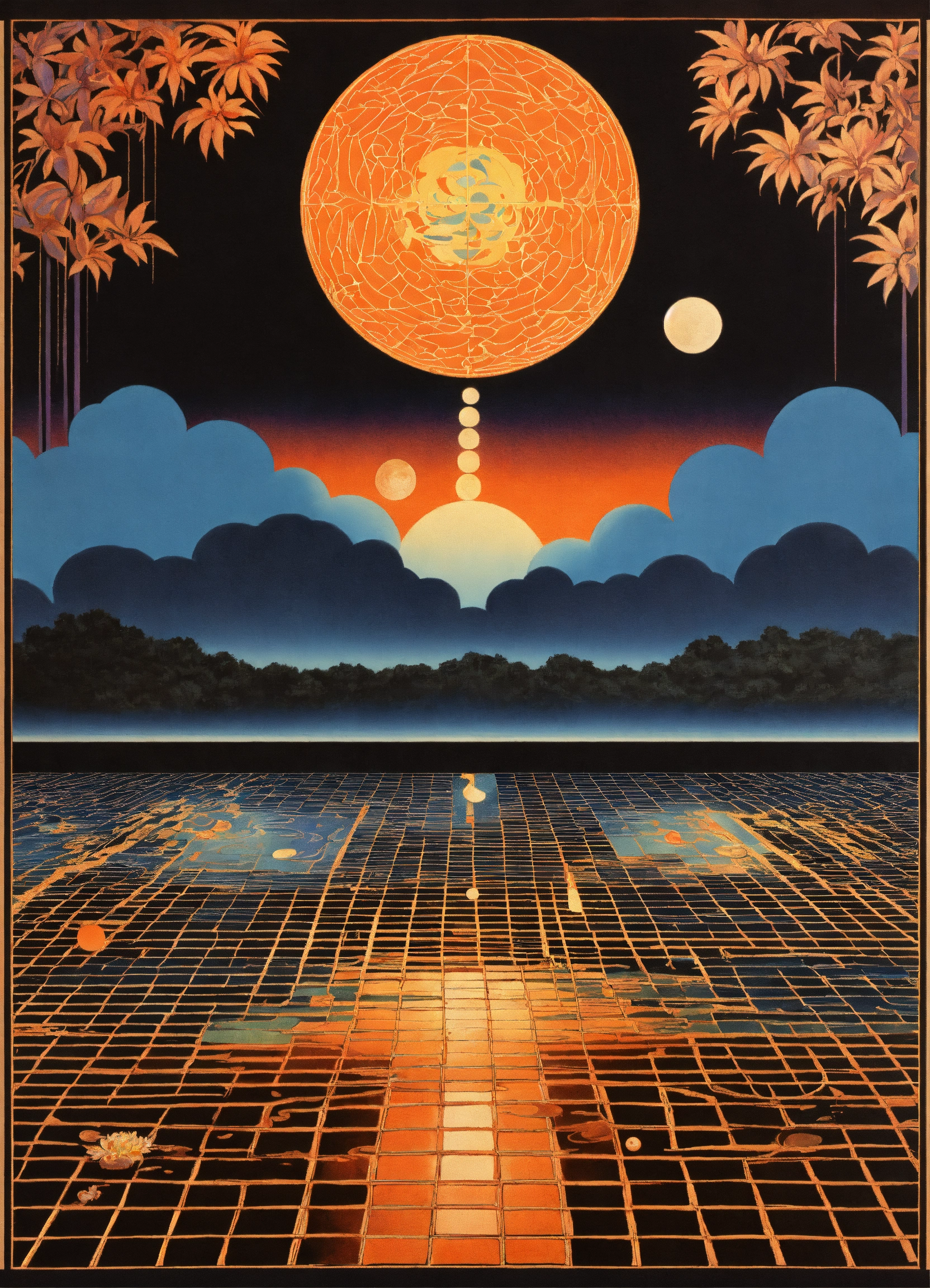 Japanese vintage poster, symmetrical grid patterns, psychedelic shapes in the night sky, warm organge geometrical clouds dripping tropical paradise, ying yang moon, checkerboard tiles, abstract cosmos merging into zen garden meets fantasy realm by rene margritte