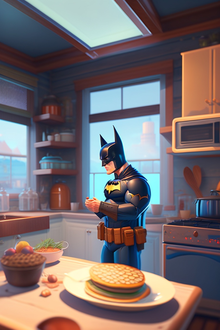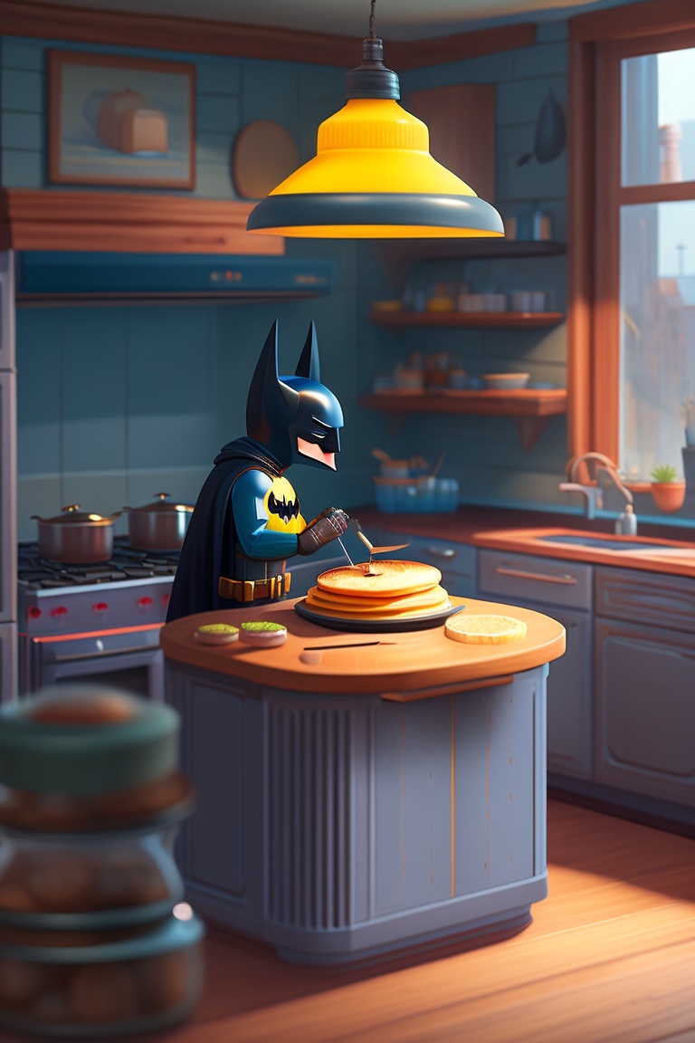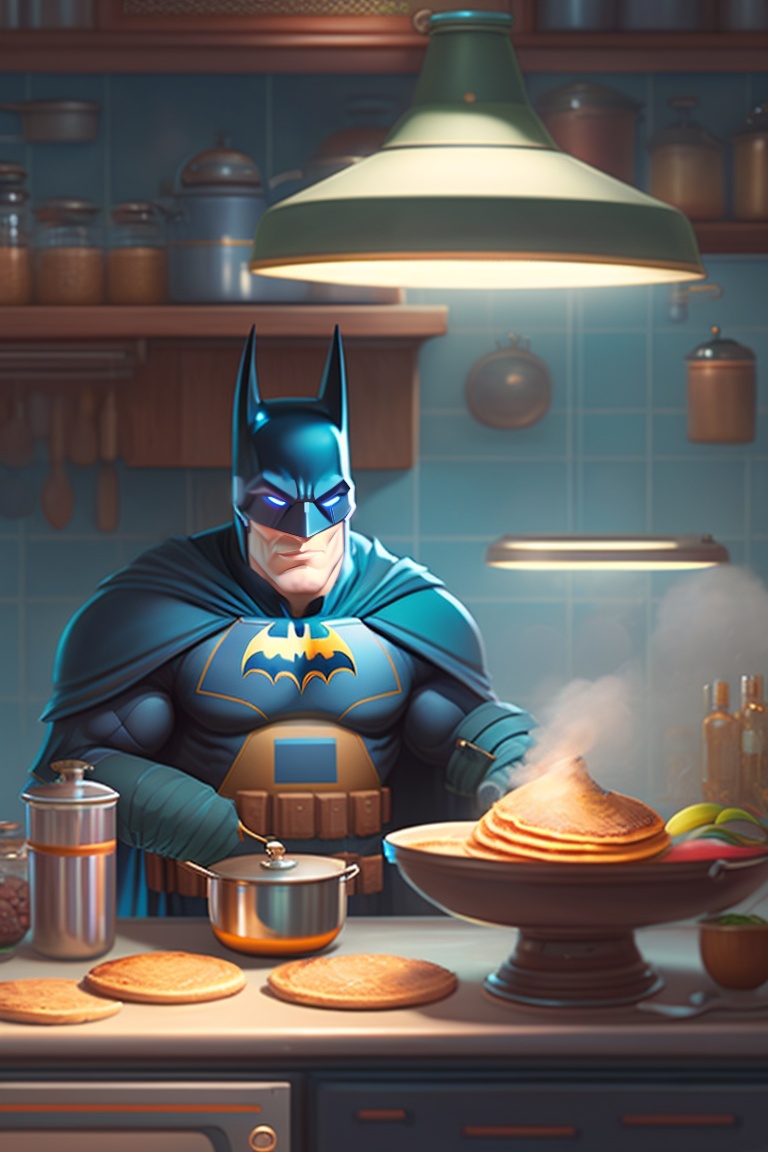 Batman making a pancake in the kitchen
