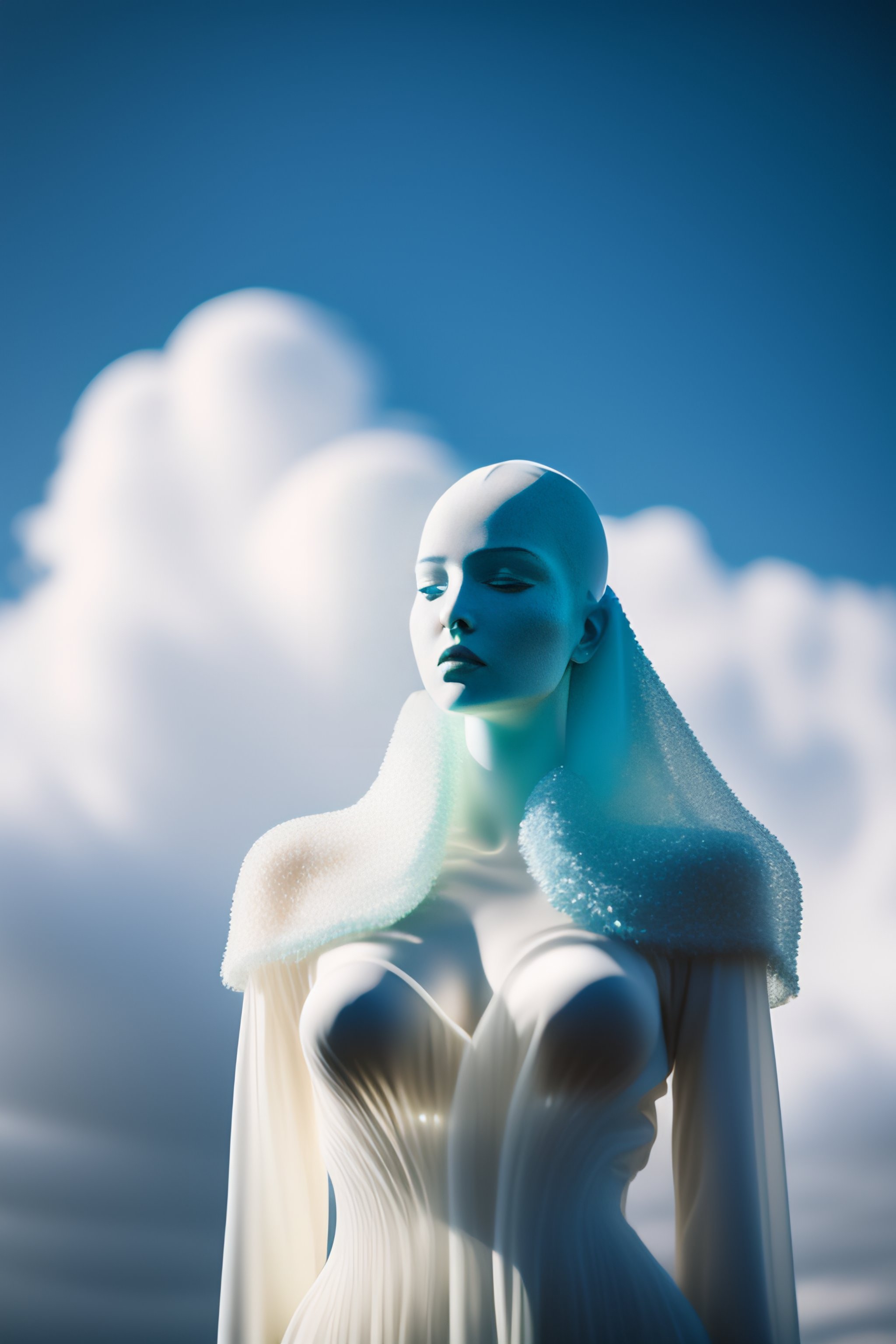 Full body view of an alien surreal clouds, alien, delicate, silk, annual fashion, clouds, transparency, silk, pastel colours, captured with a hasselblad camera
