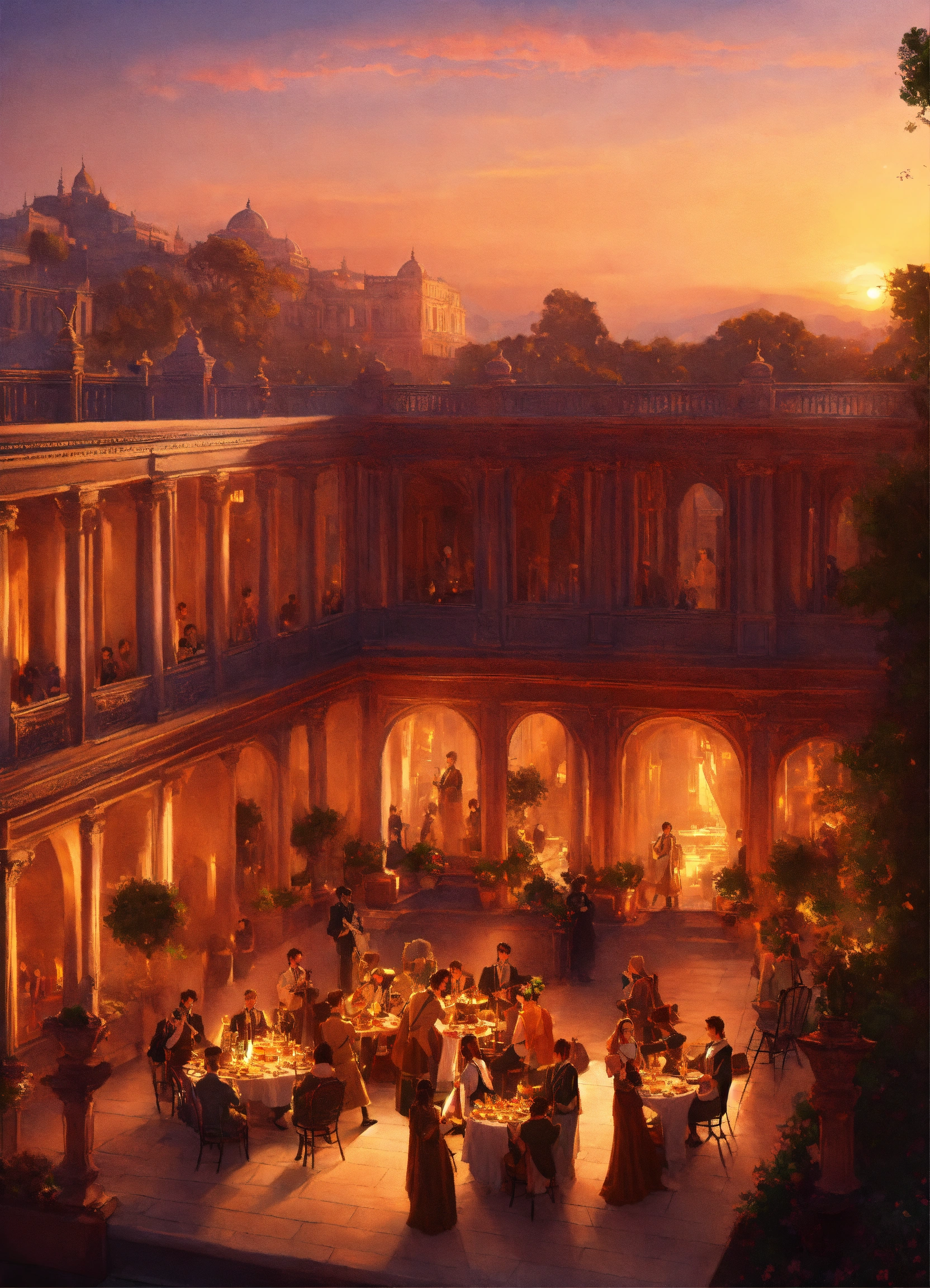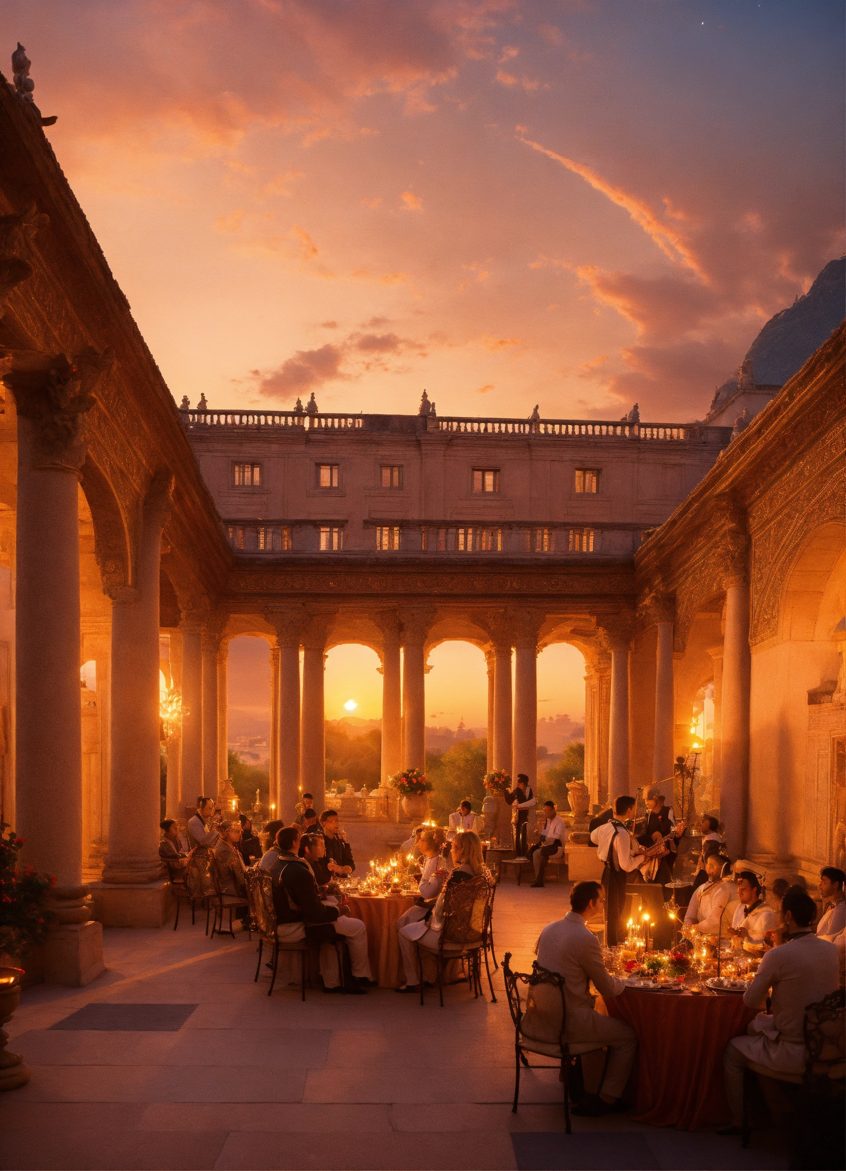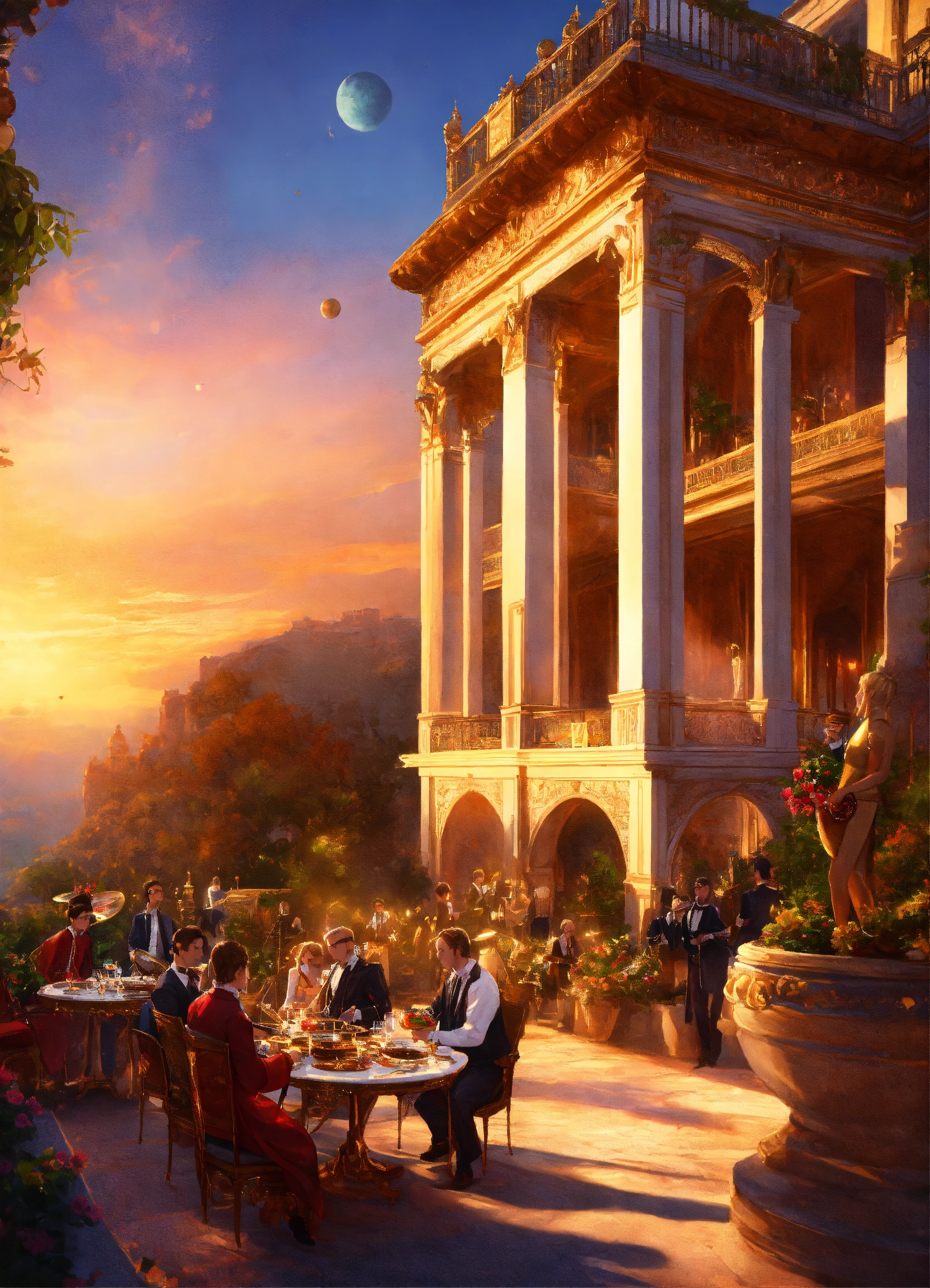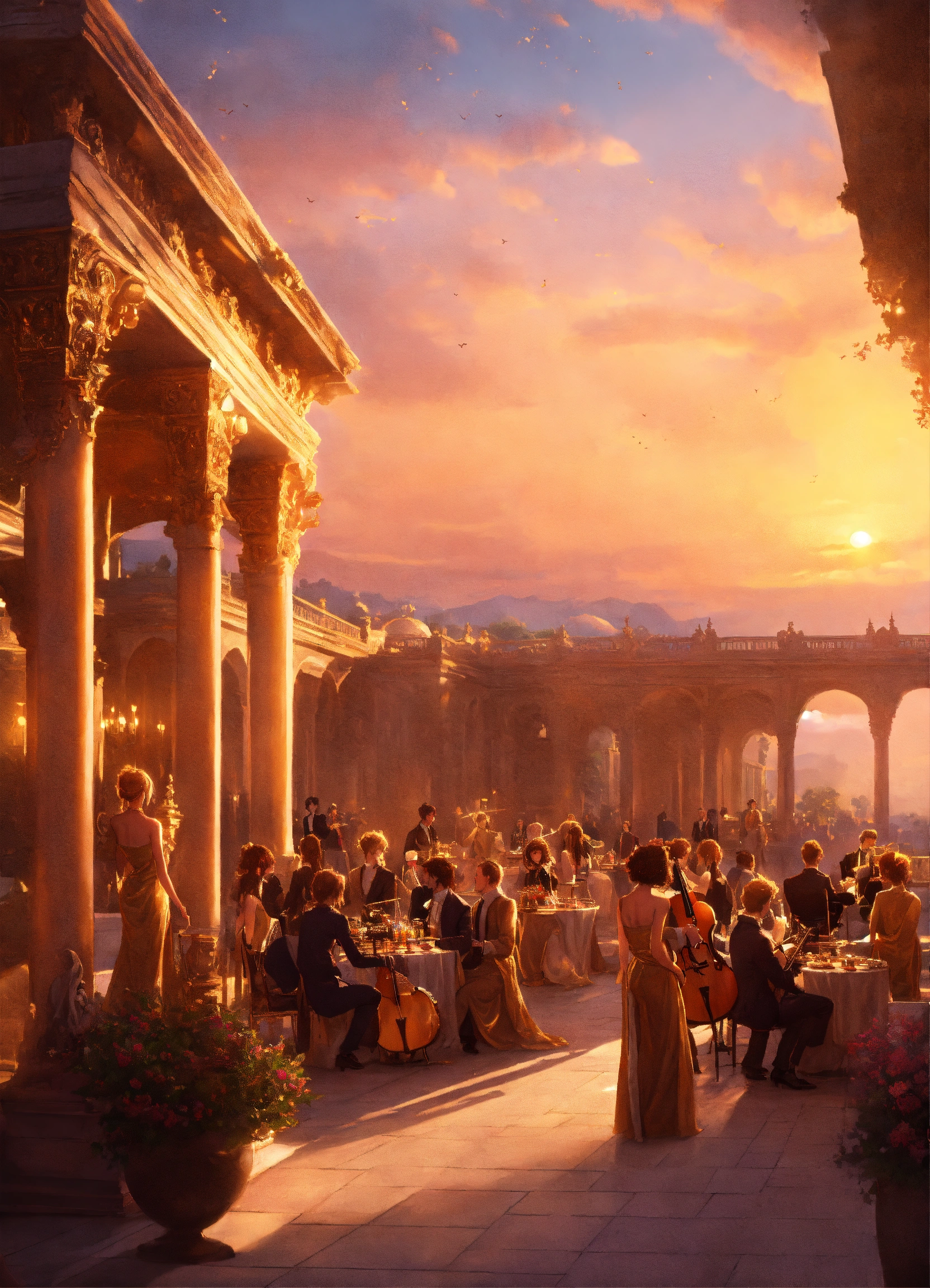 A sumptuous palace terrace at sunset. alien orchestra playing instruments