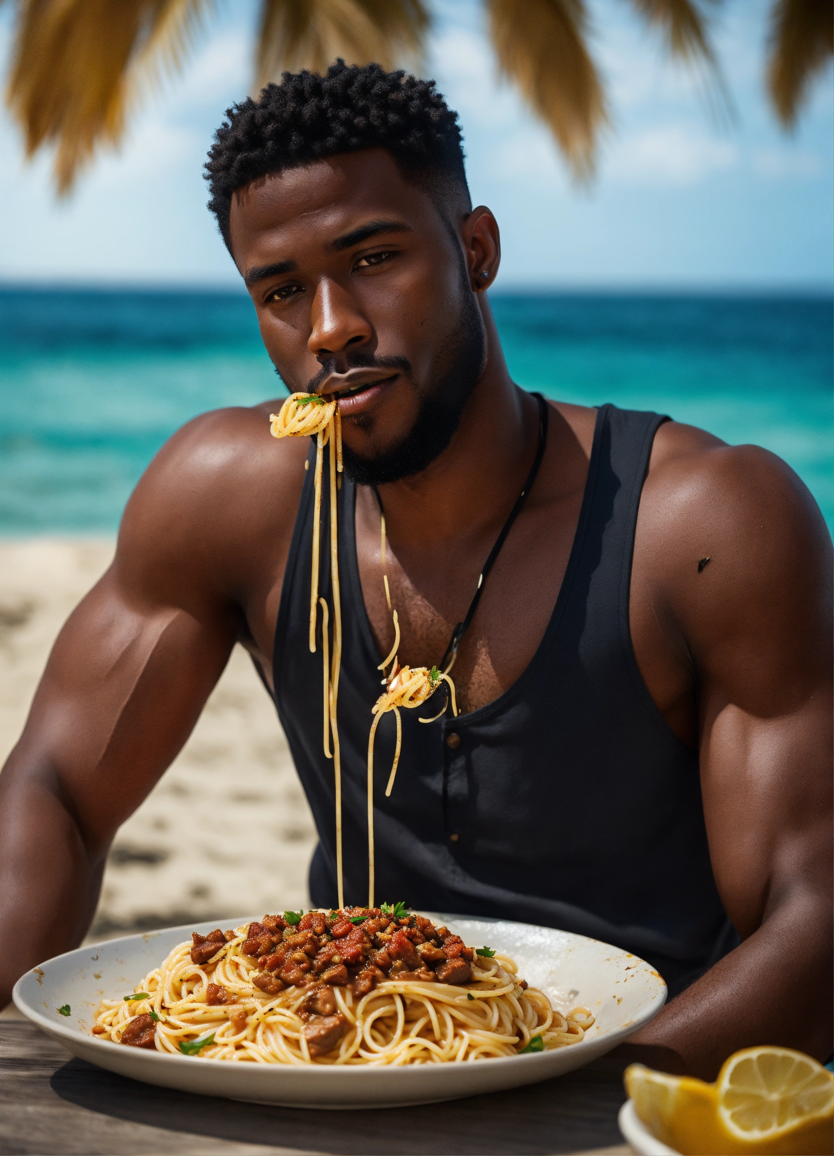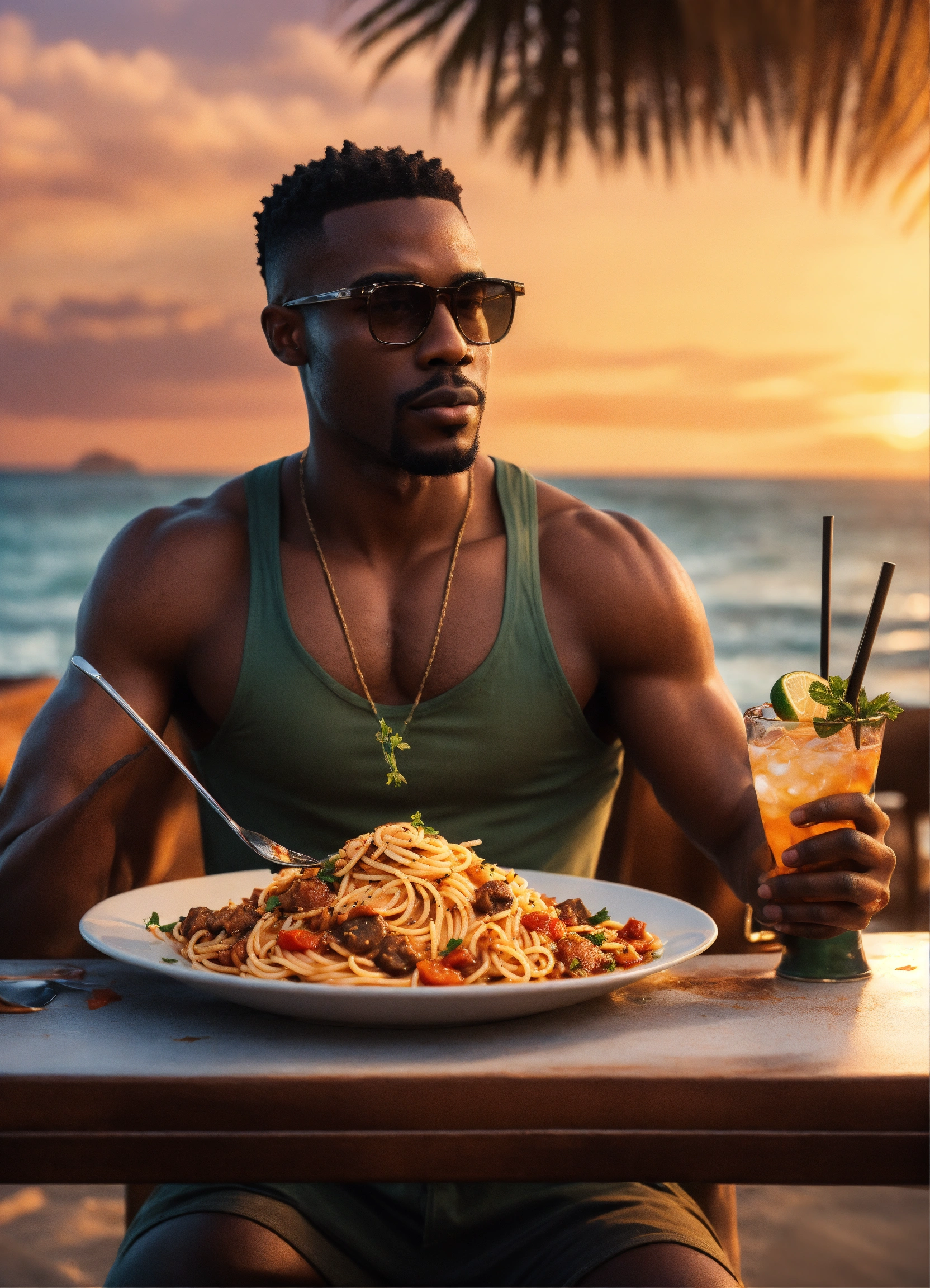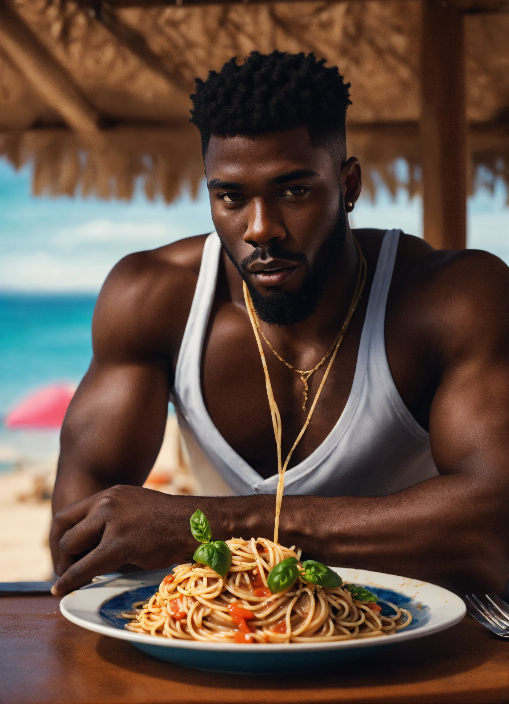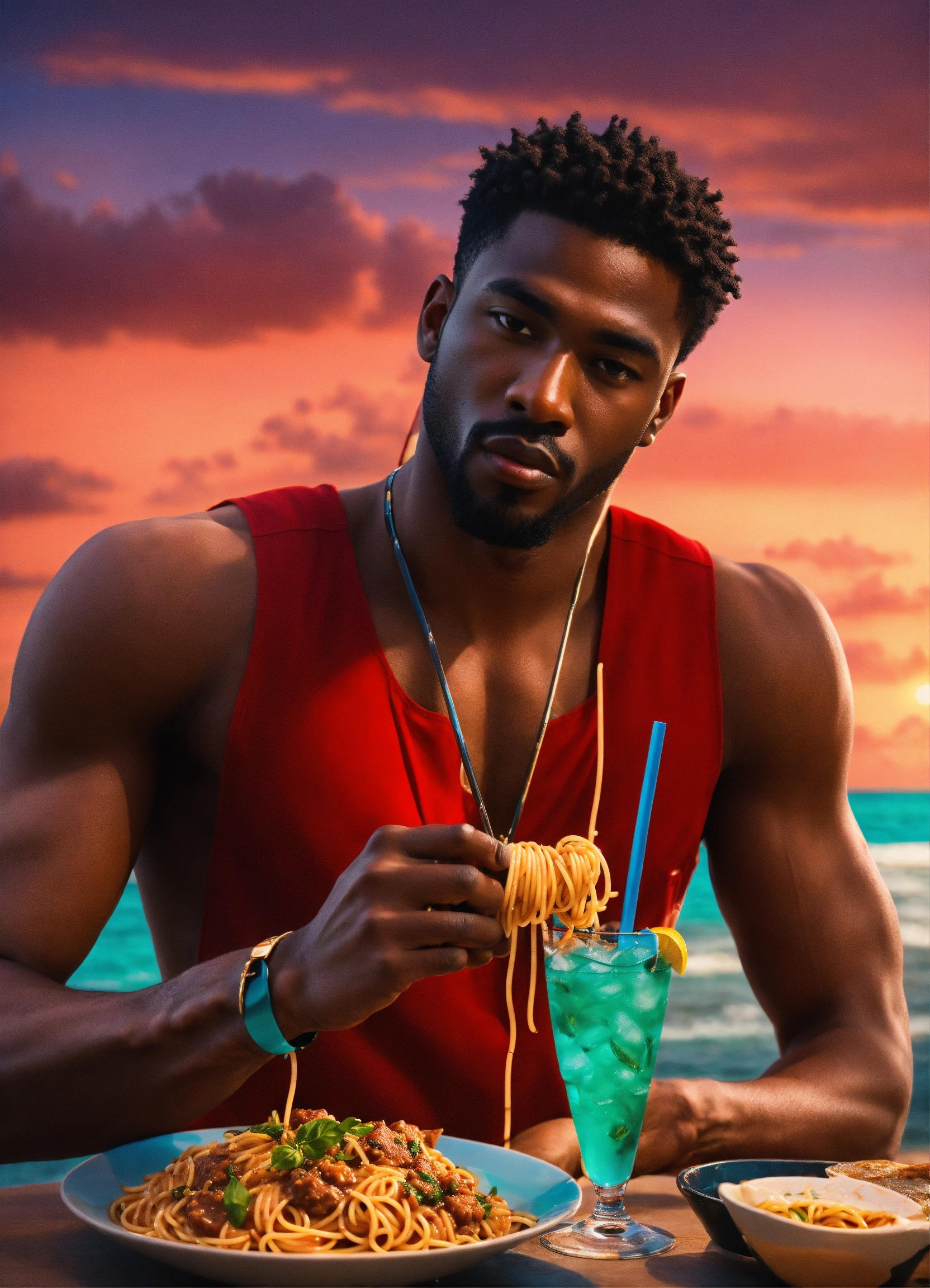 Handsome black african man dark skin having spaghetti and cocktail at a beach restaurant, cap, muscles, big lips, art painting, very detailed, short, 8k resolution, highly detailed, cinematic productions, cocktail