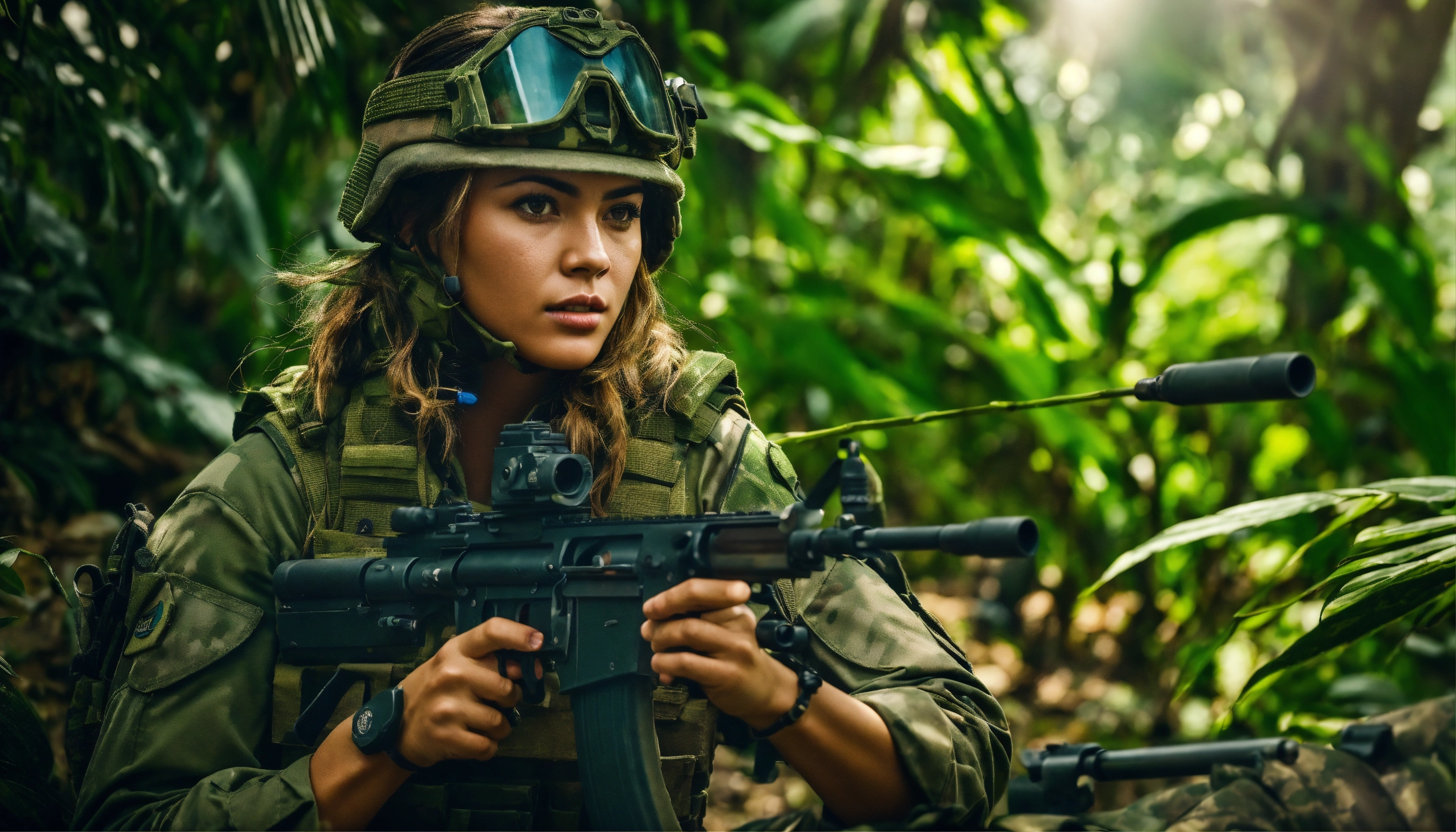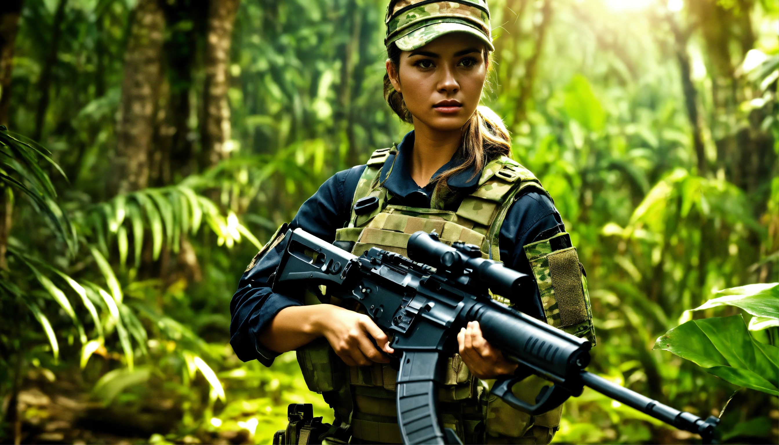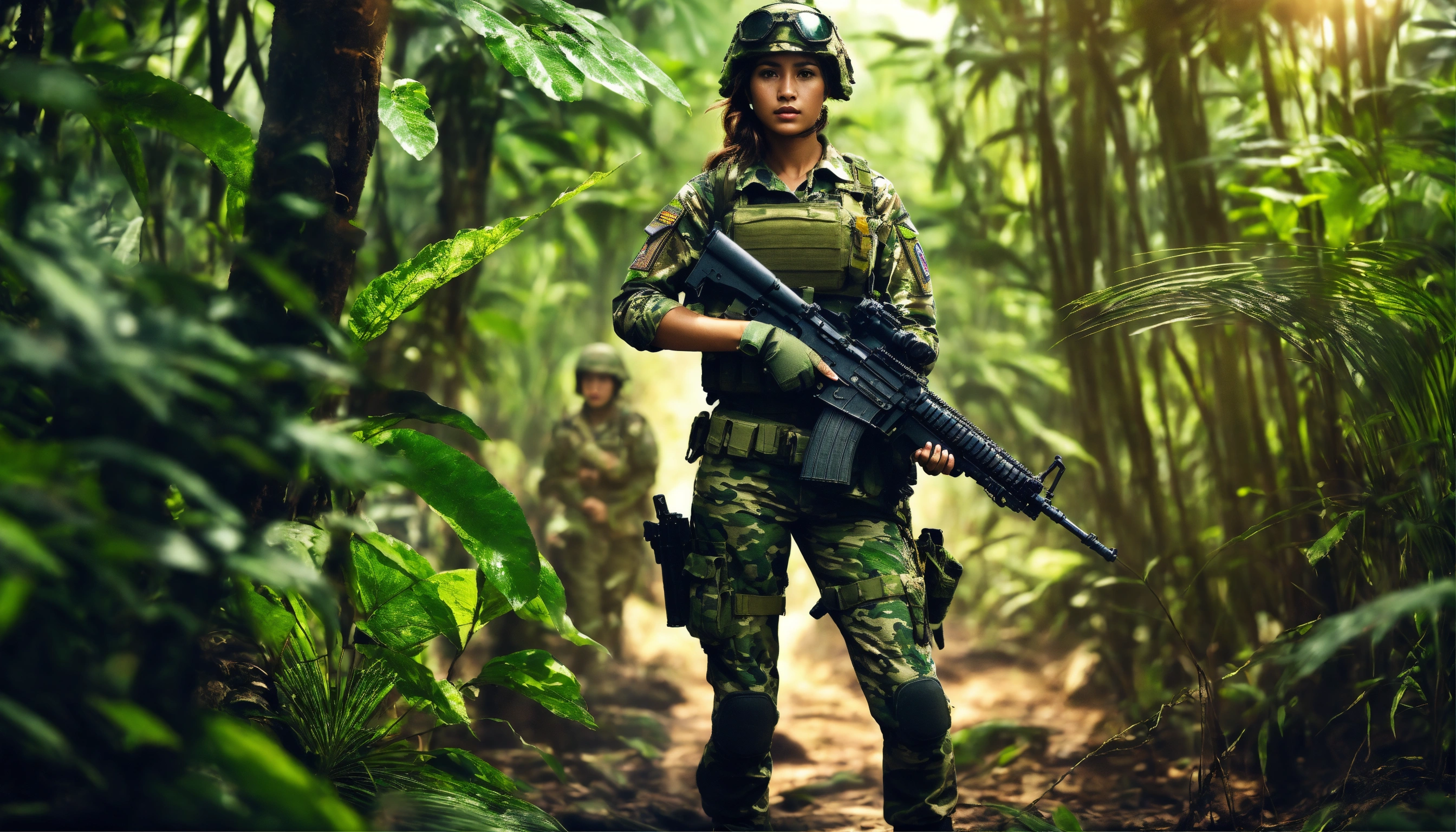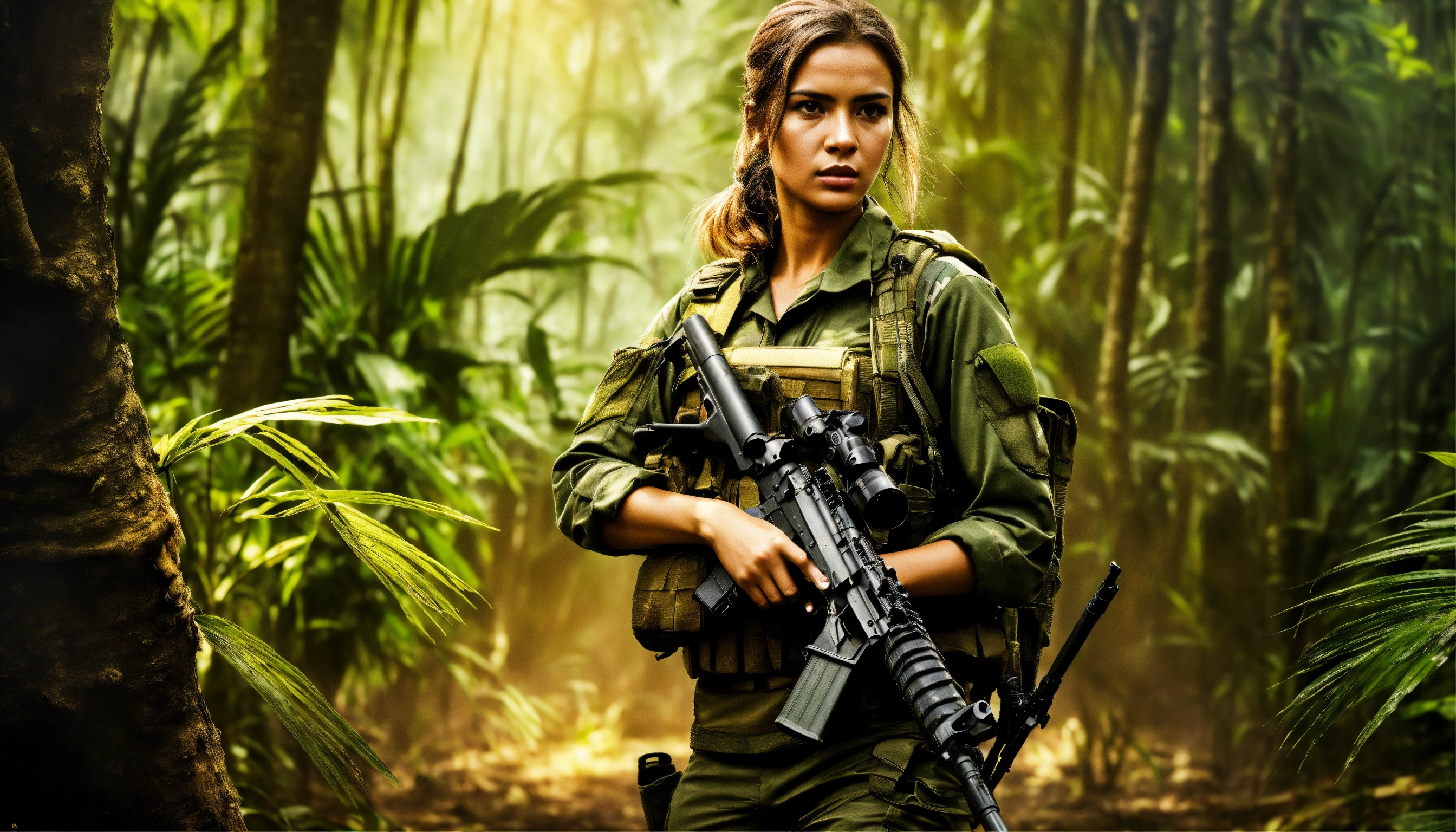 Female commandos in jungle, perfect face, full camouflage, hdr, cinematic view, full body view, gun in hands