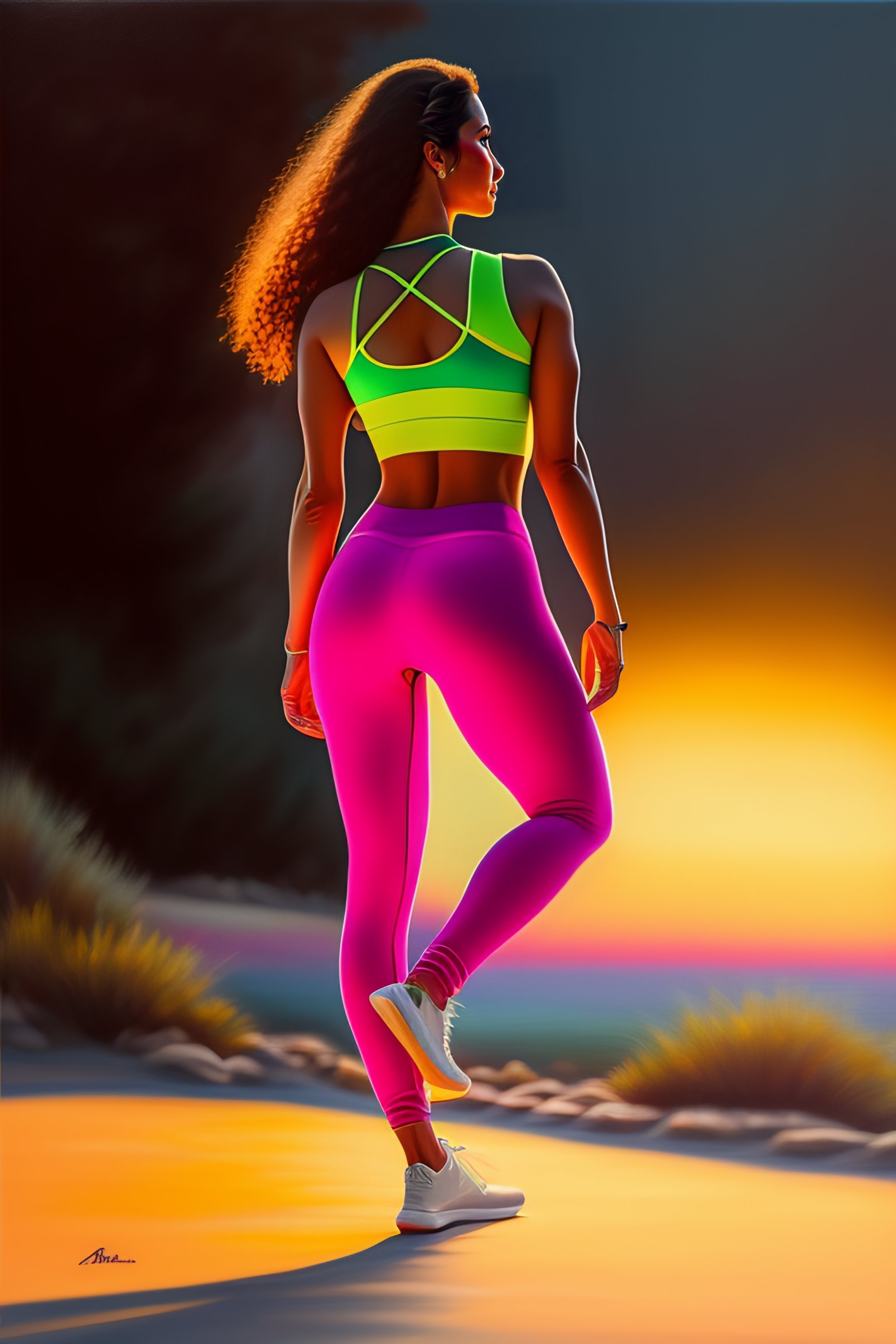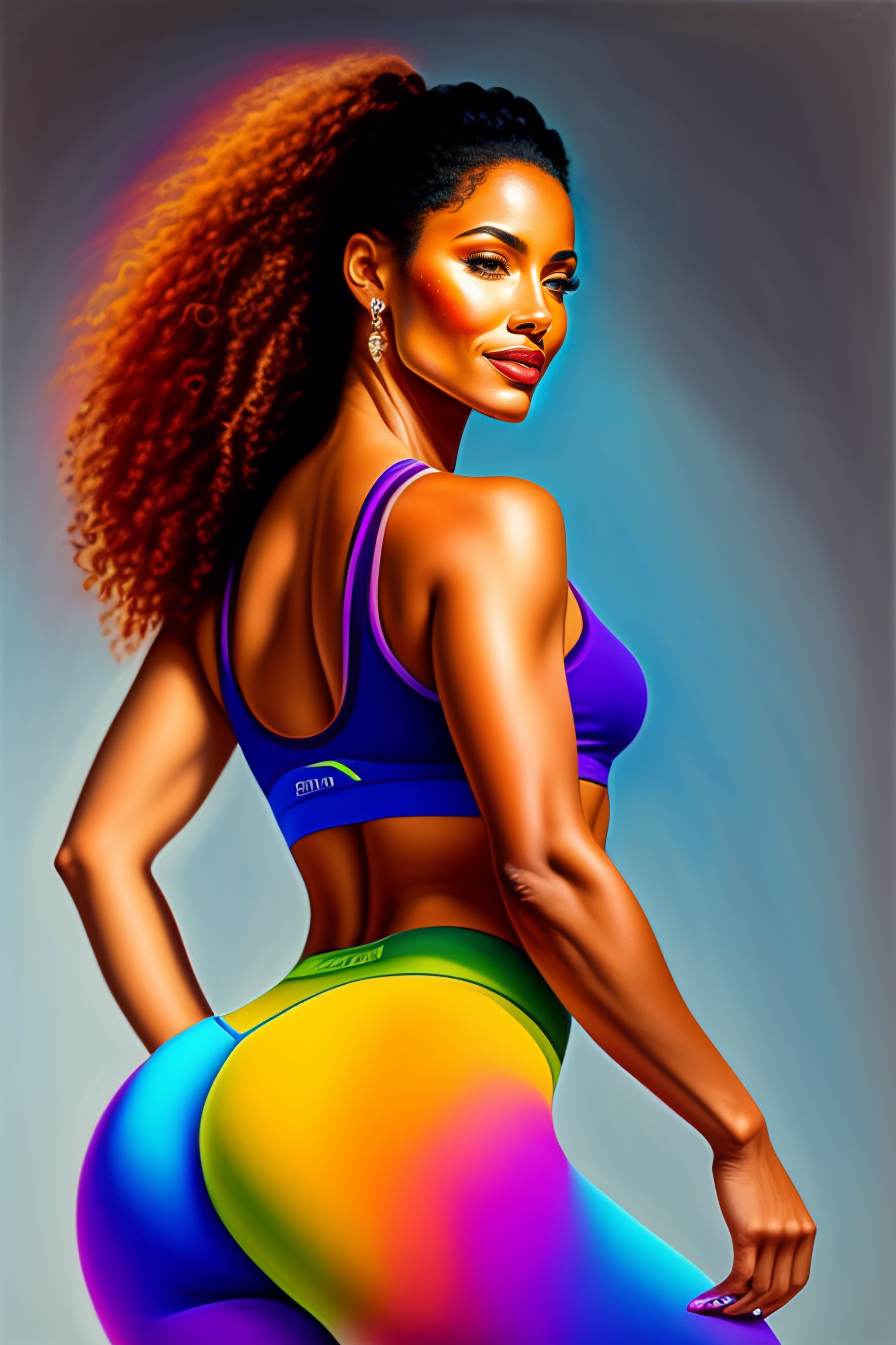 Beautiful detailed photorealistic painting of a woman with a wide stance in yoga pants. vibrant, high quality