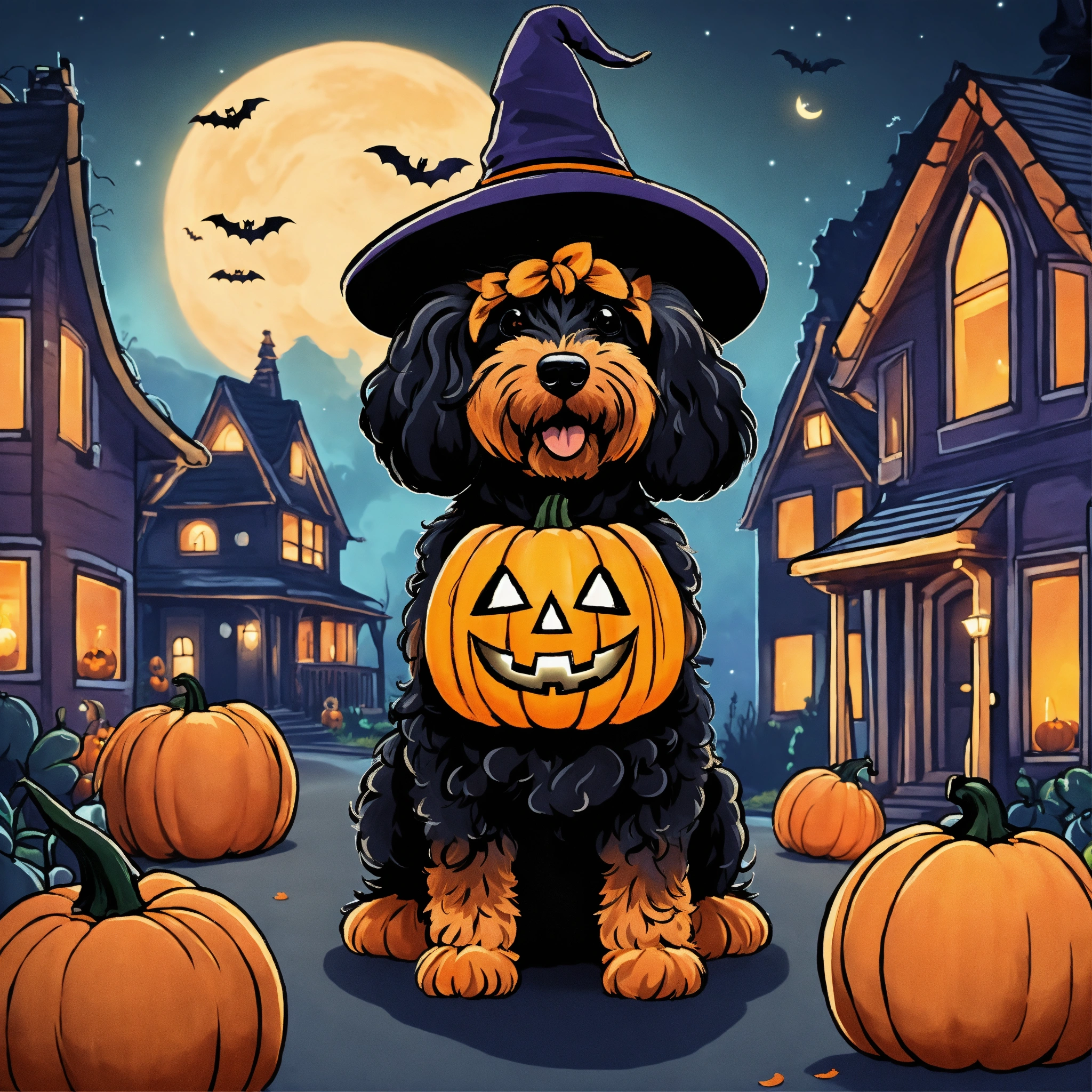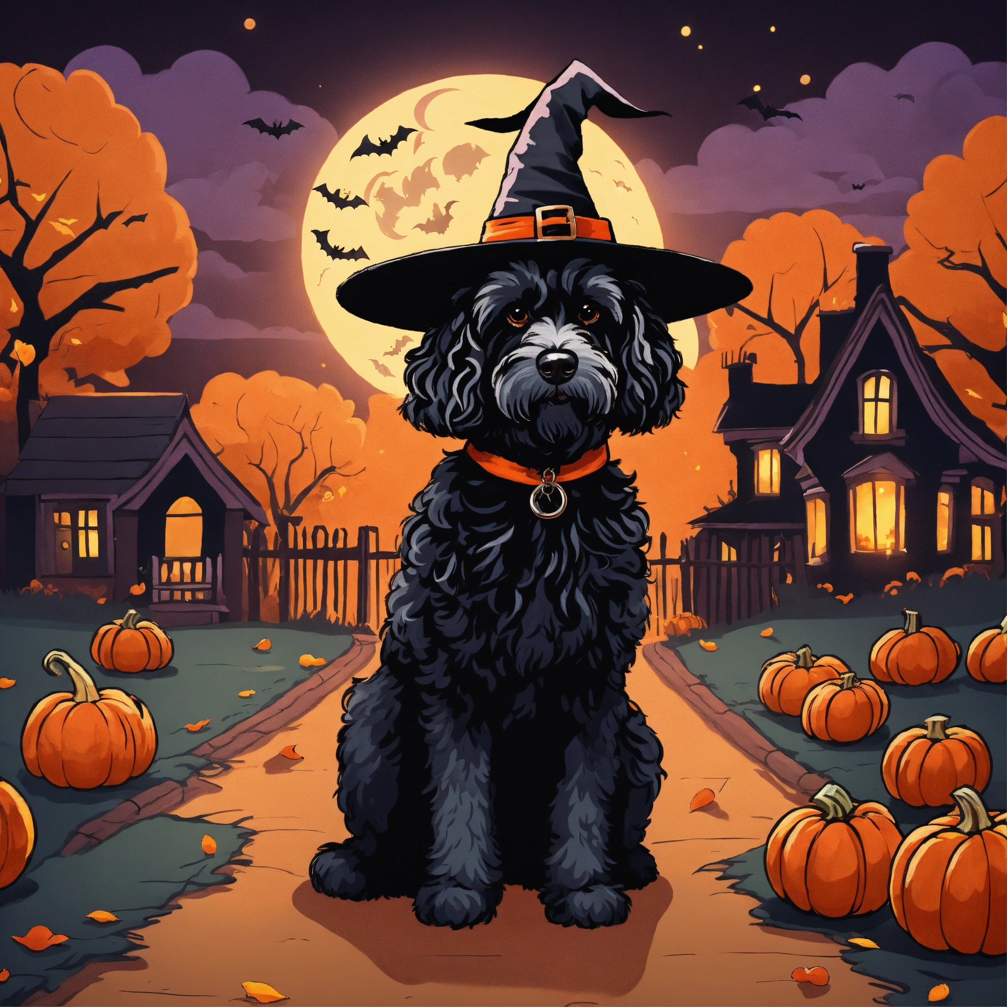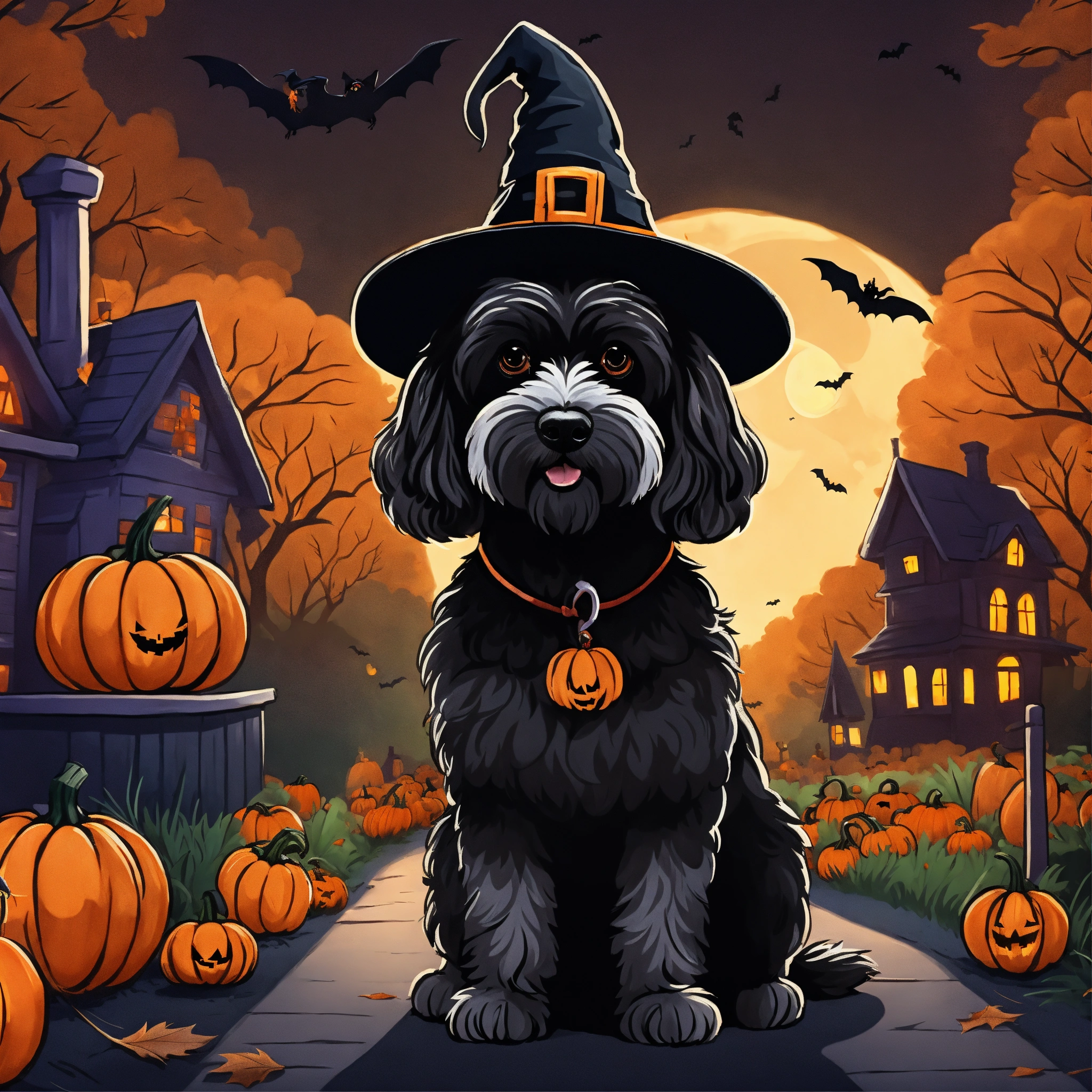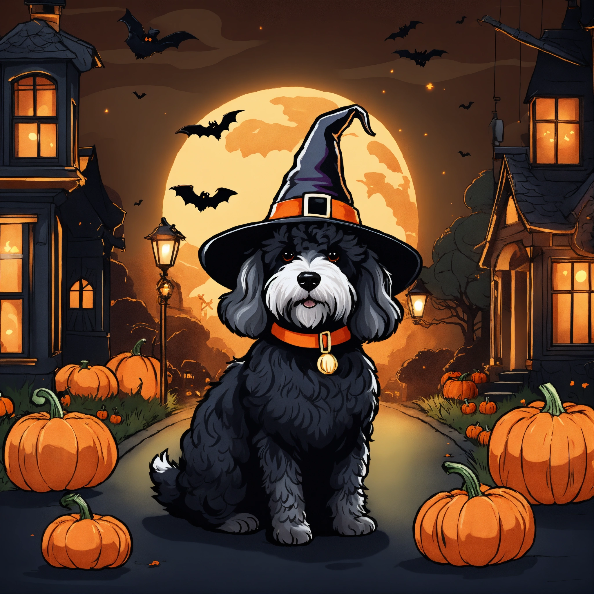 Black cockapoo with white belly and chin fur, wearing a witch hat, standing out in the middle of a dark road, sorrounded by pumpkins, houses, and halloween decorations, 4k, cartoon style