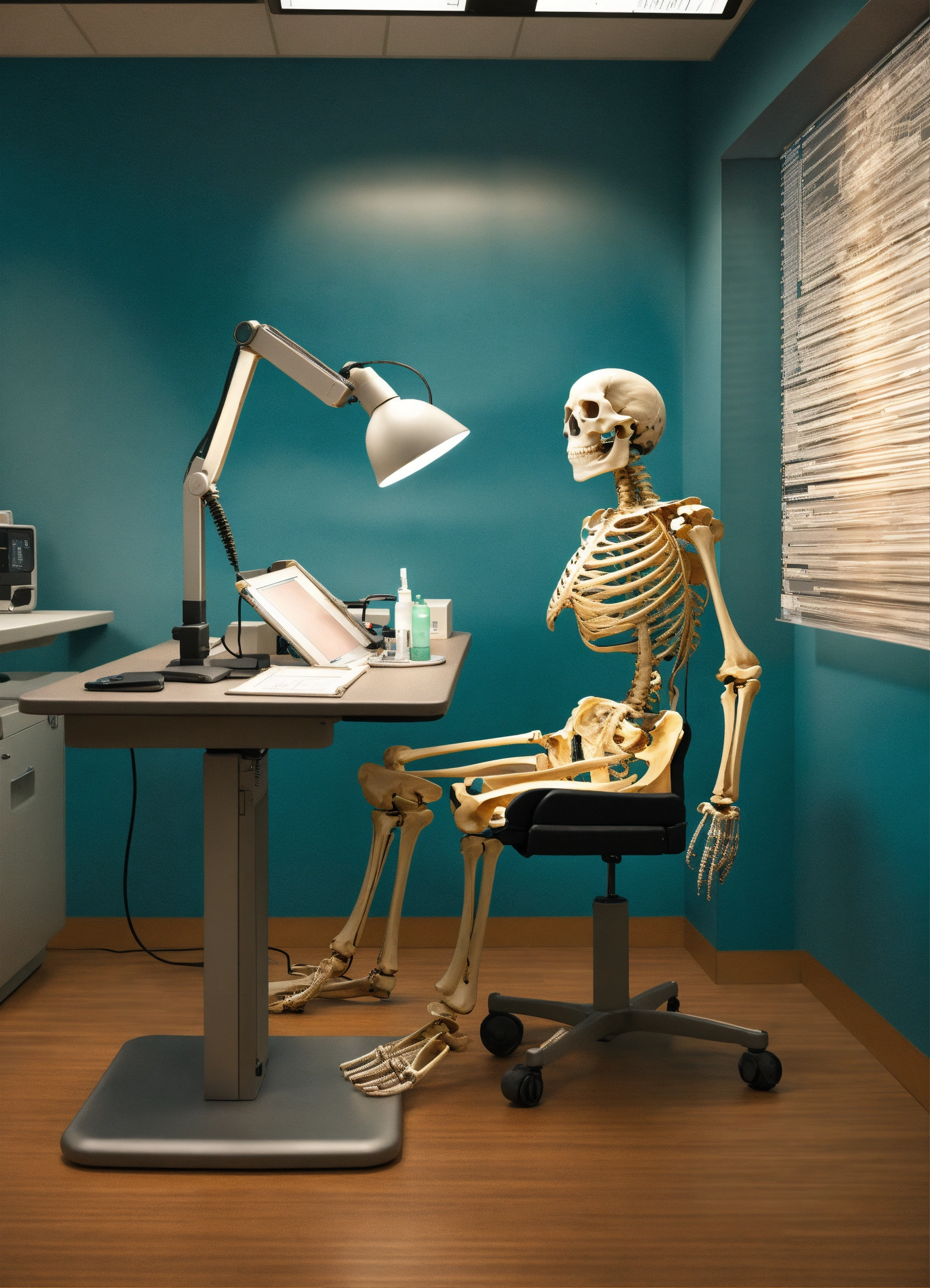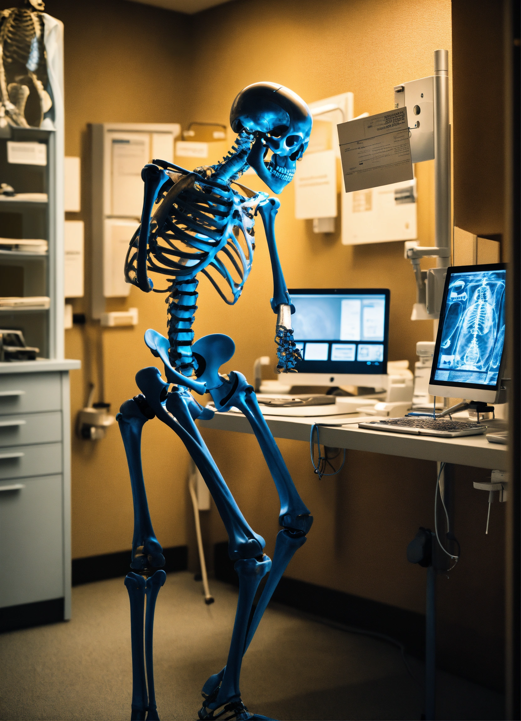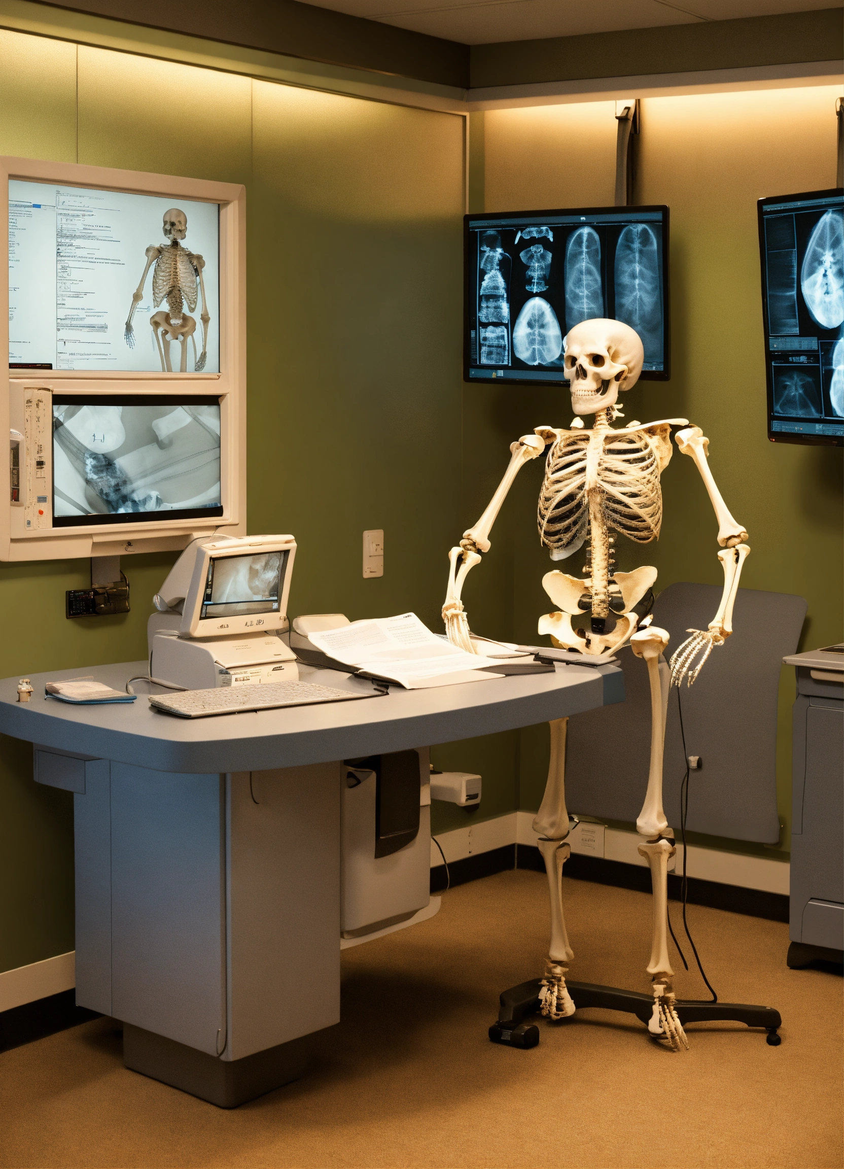 A photo realistic skeleton reading a photograph (instead of an xray) at a radiology work station dressed as a radiologist