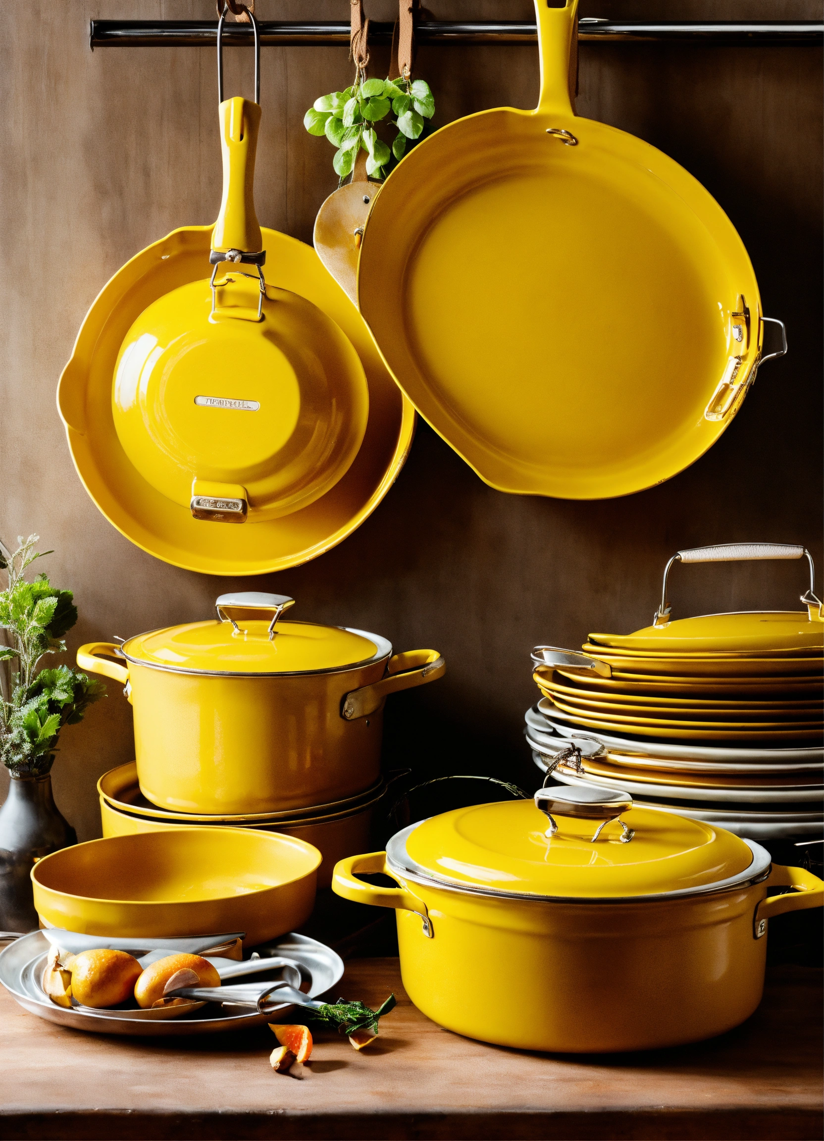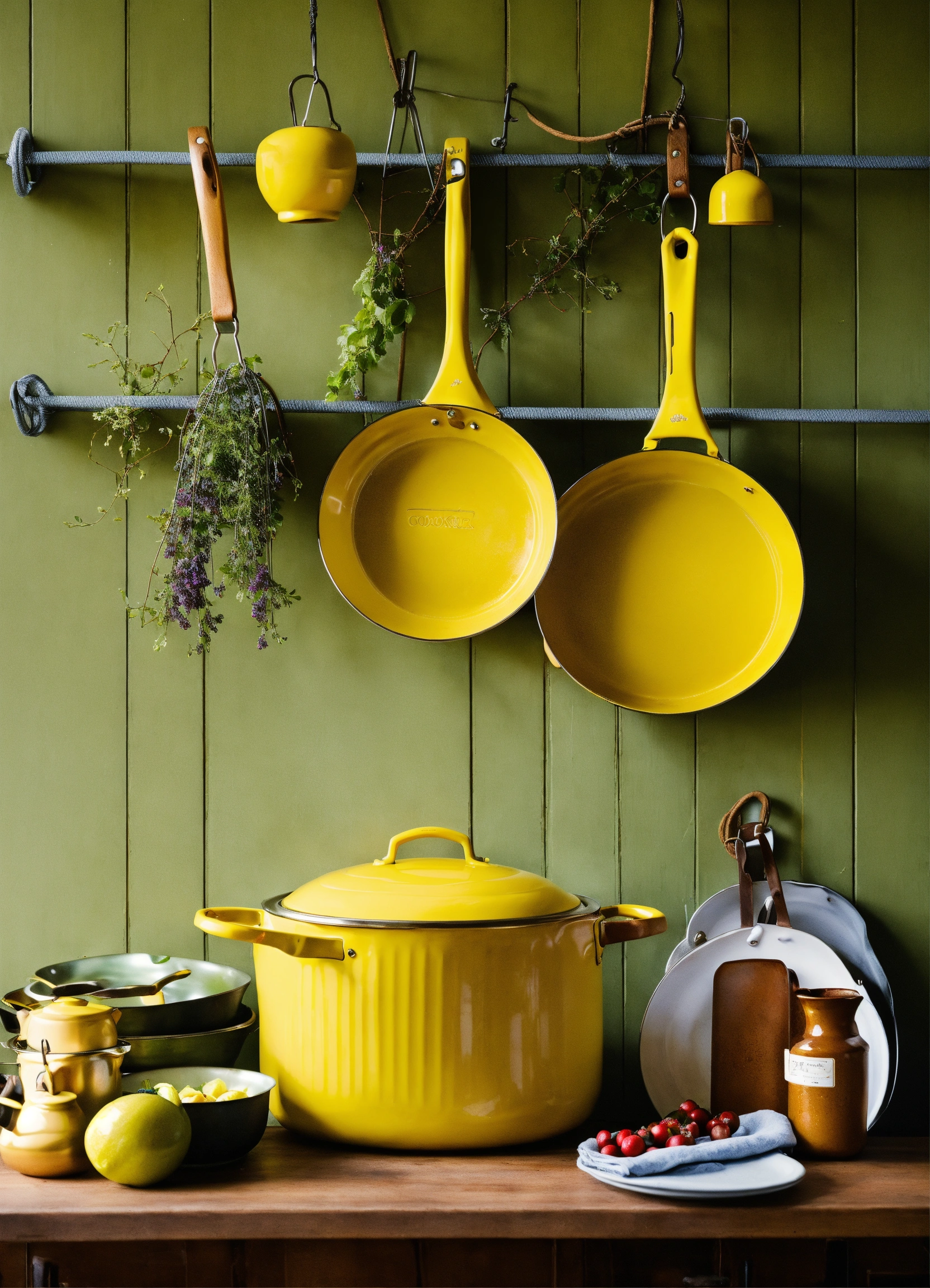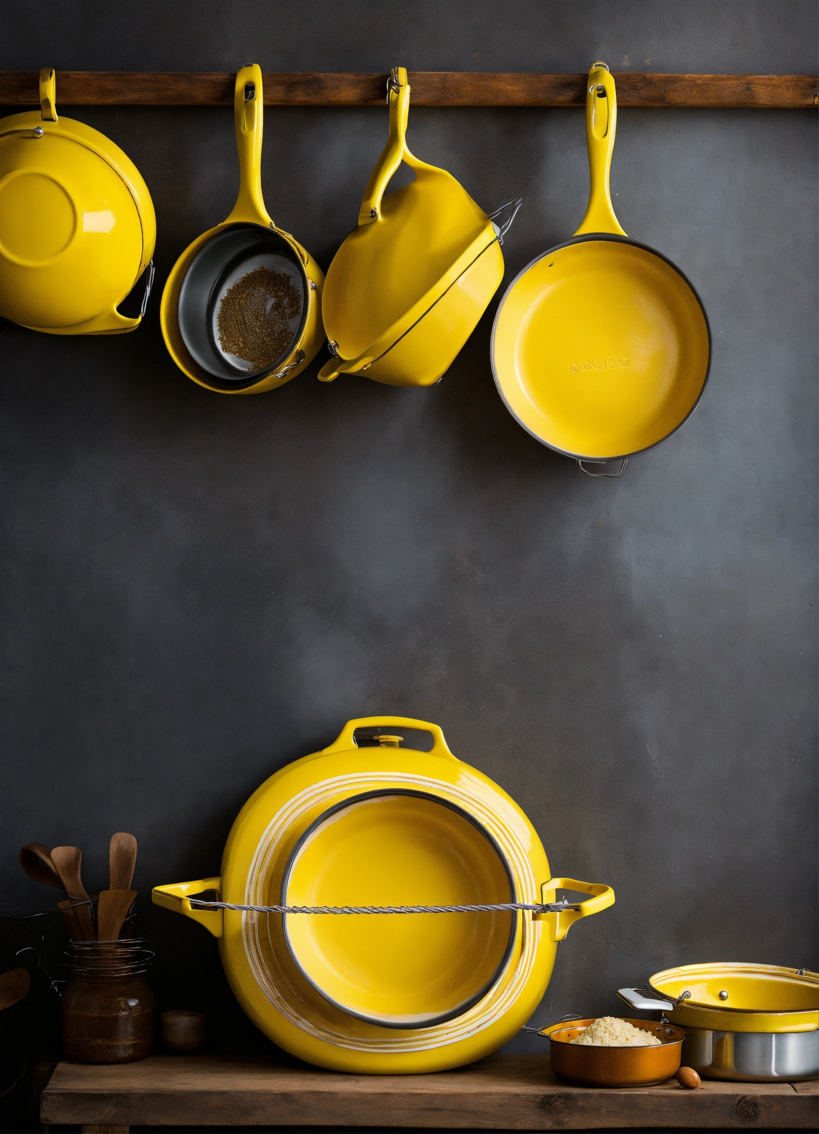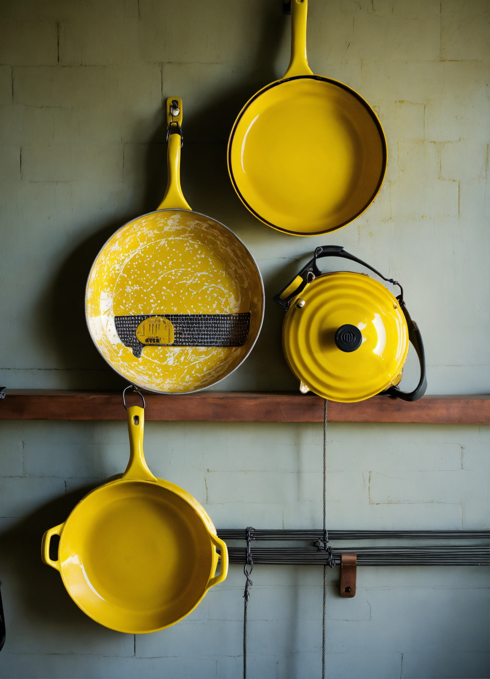 Different elements of yellow cookware and a hand bag hanging in line from a wire