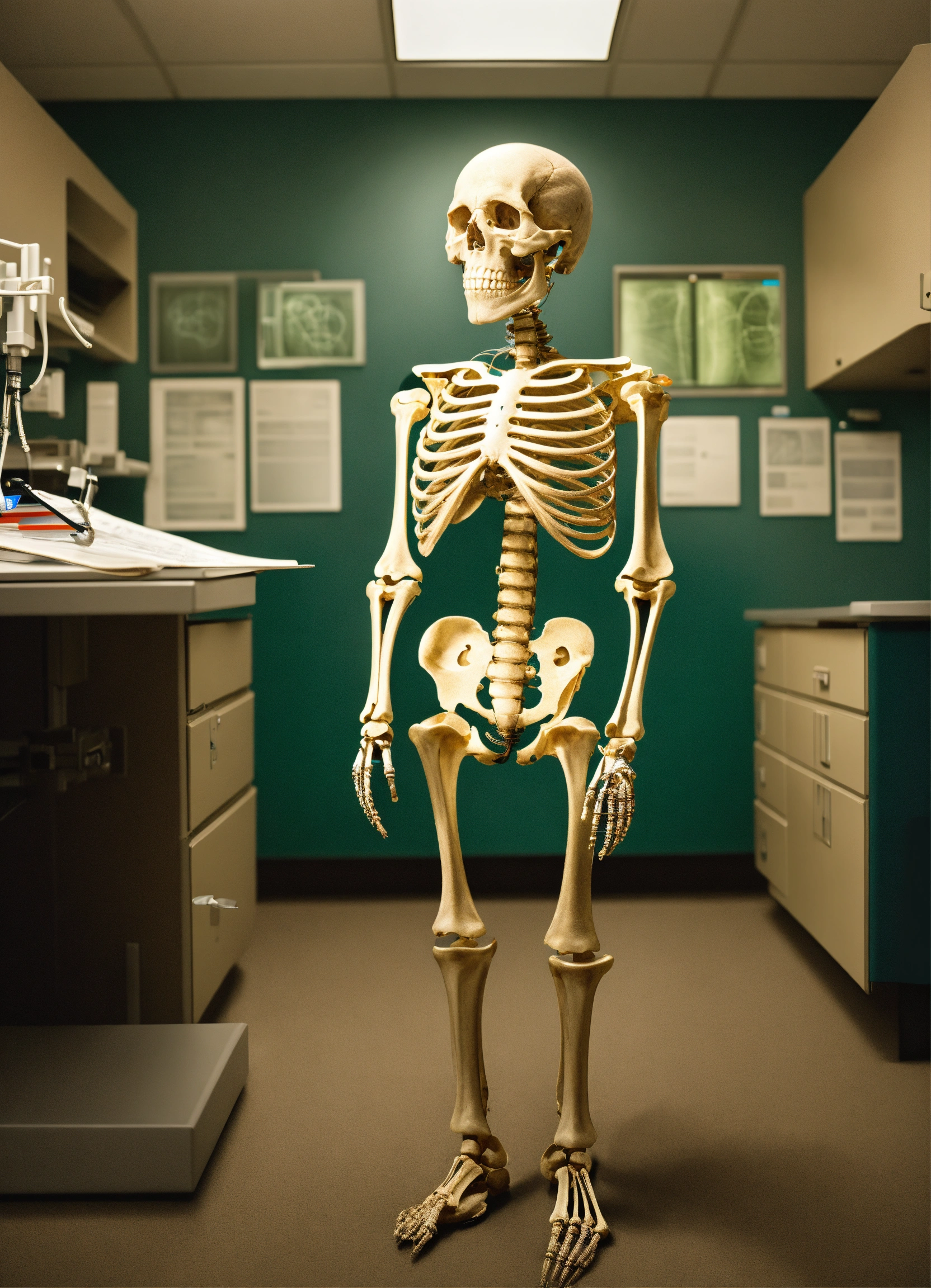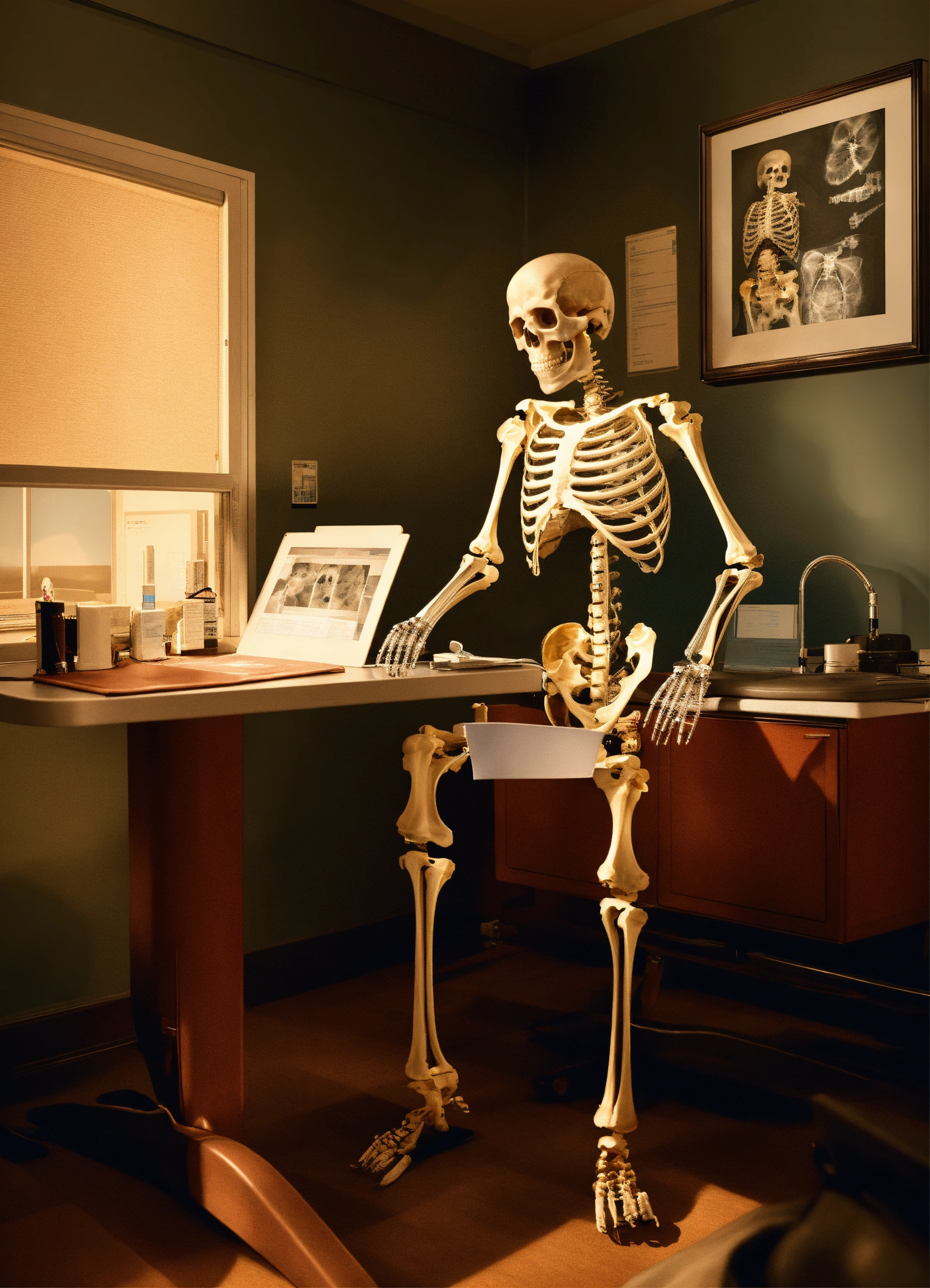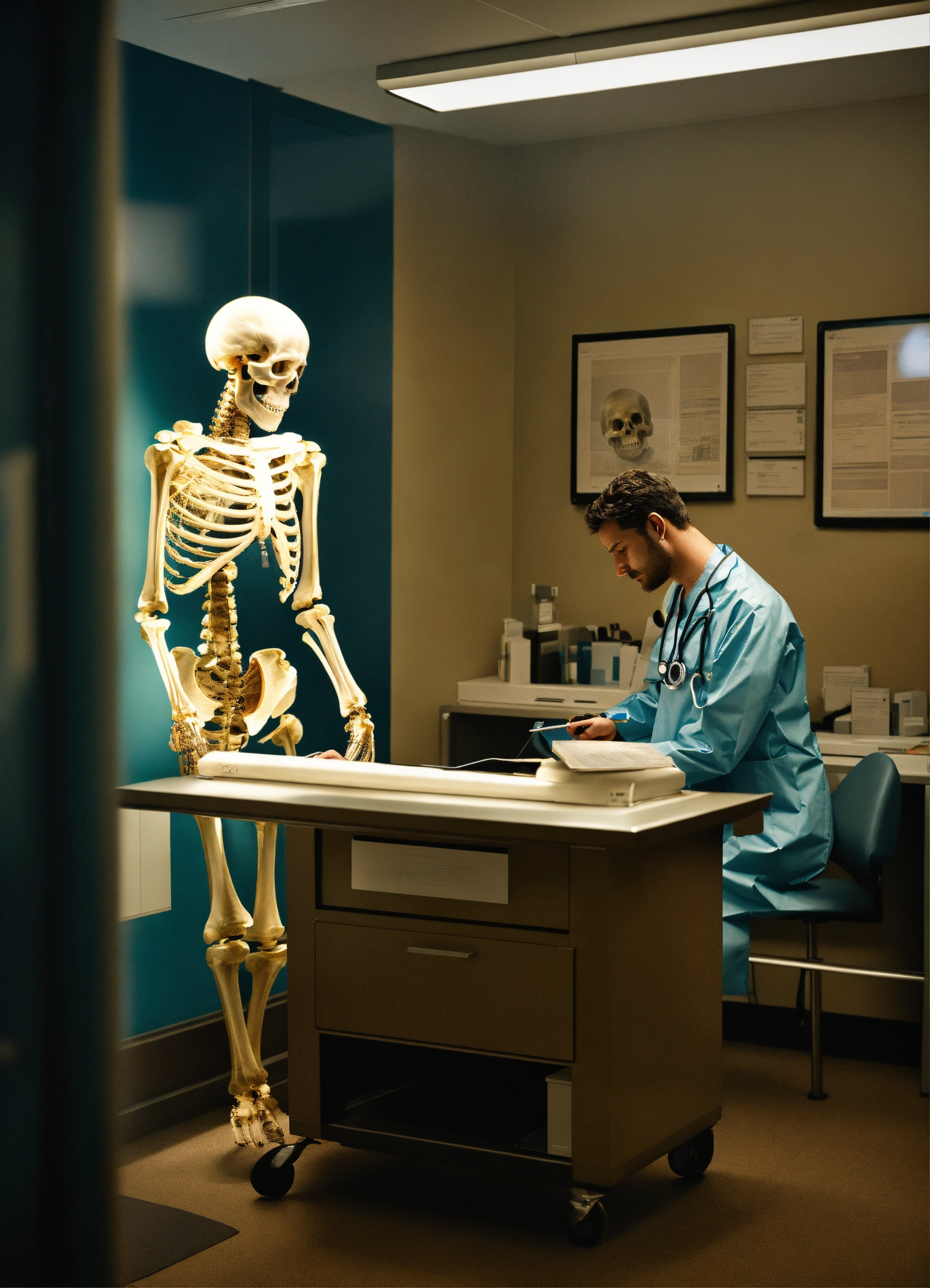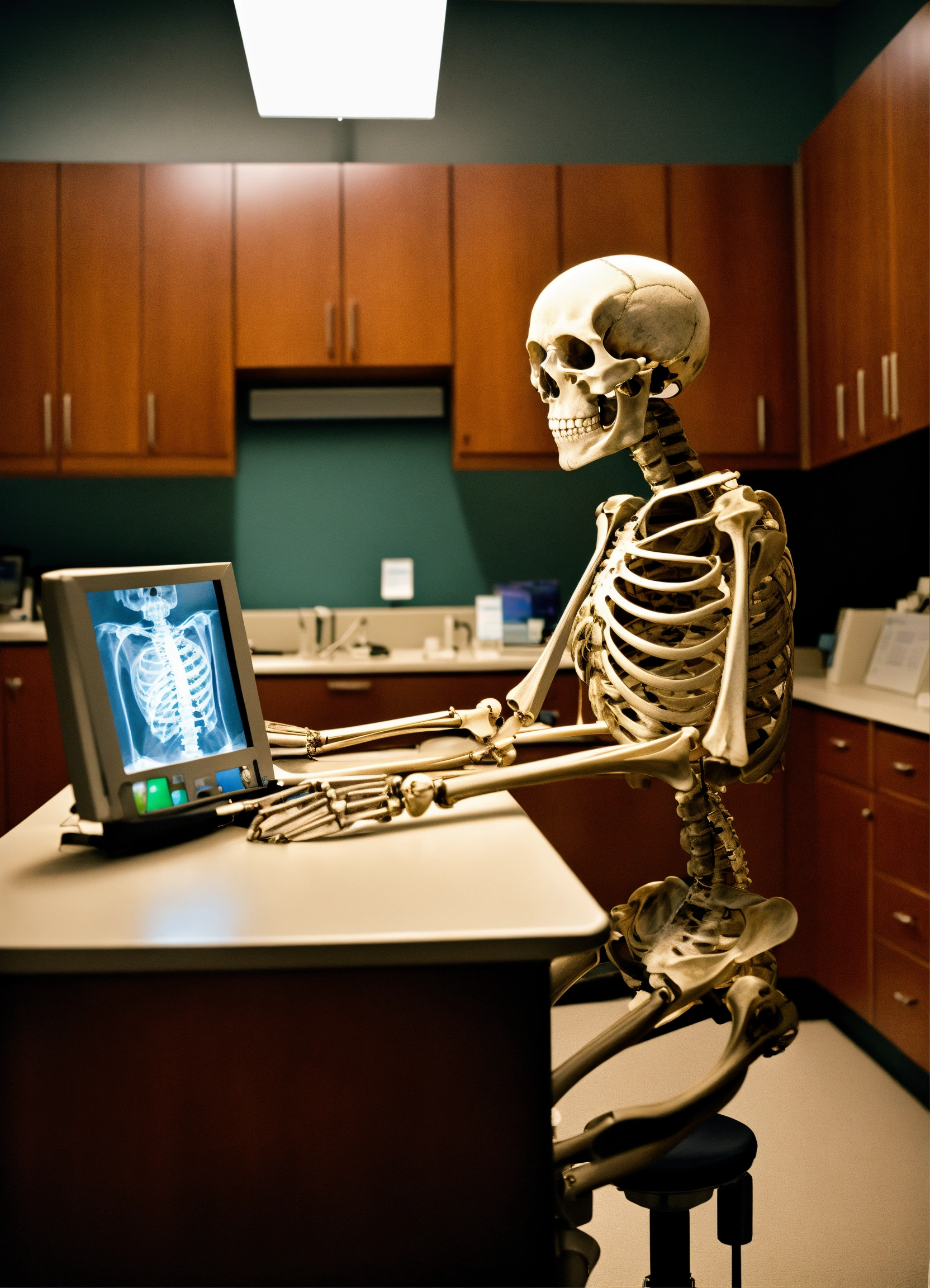 A photo realistic skeleton dresses as a doctor reading a photograph if a man (instead of an xray) at a radiology work station