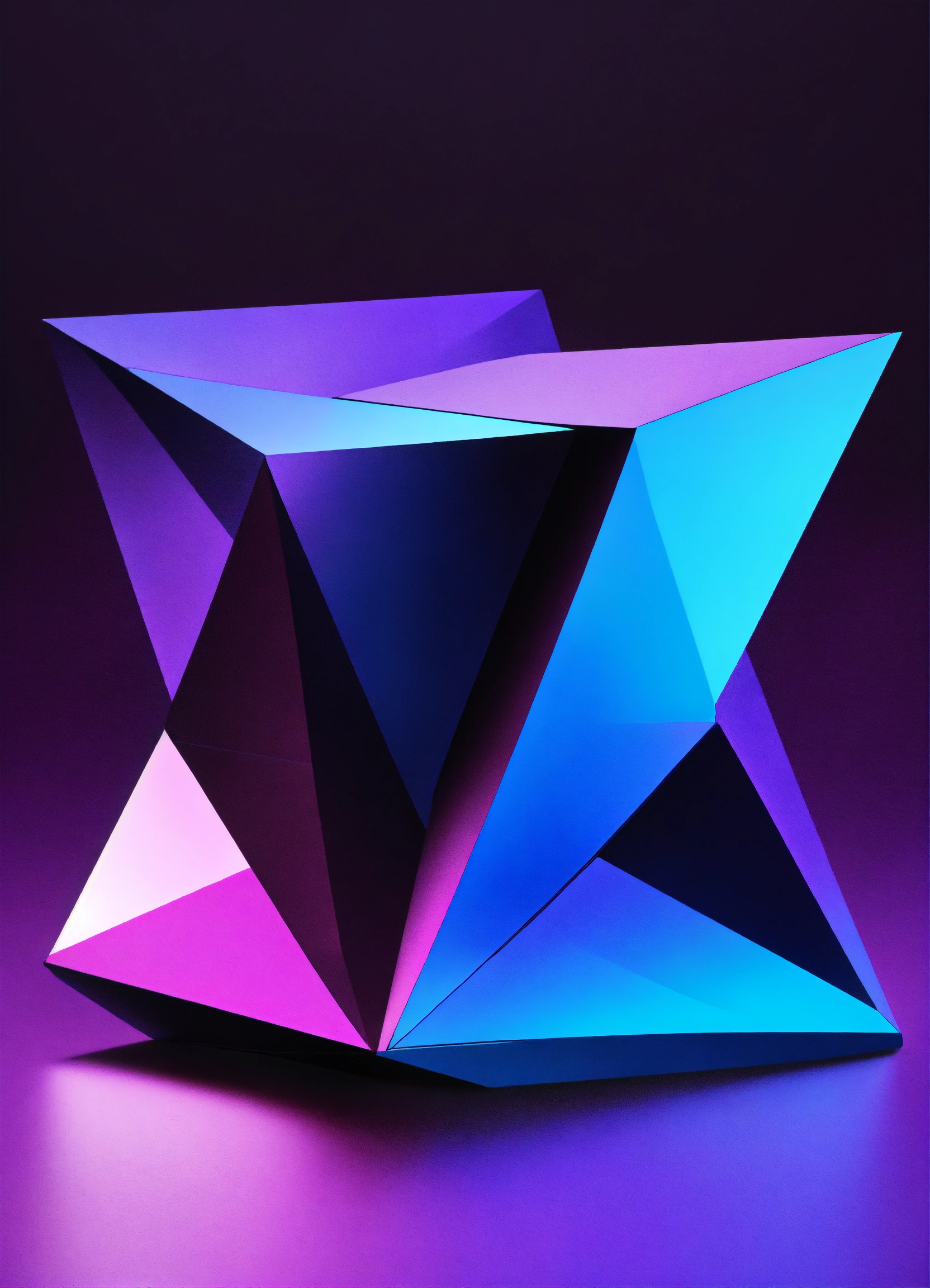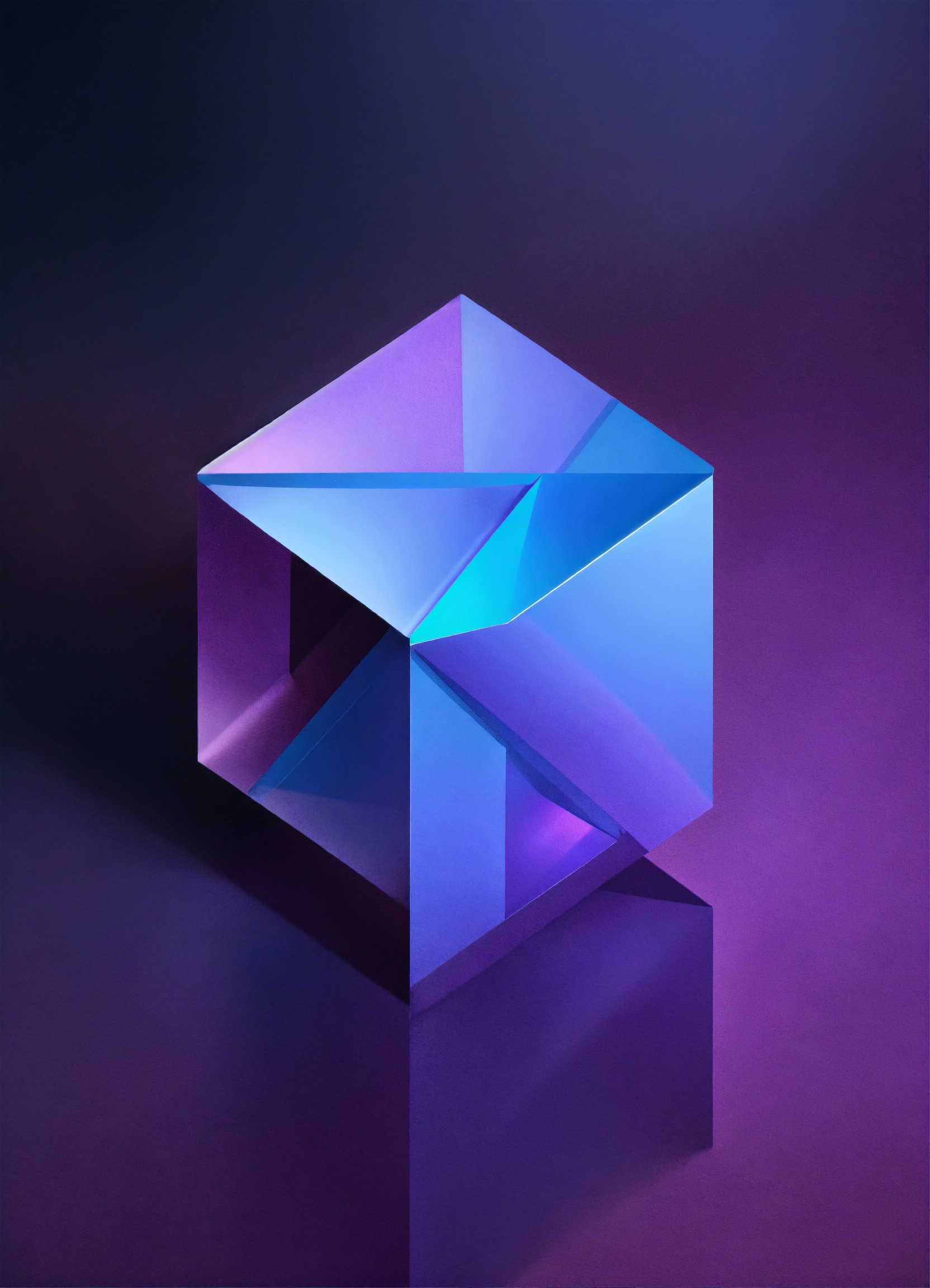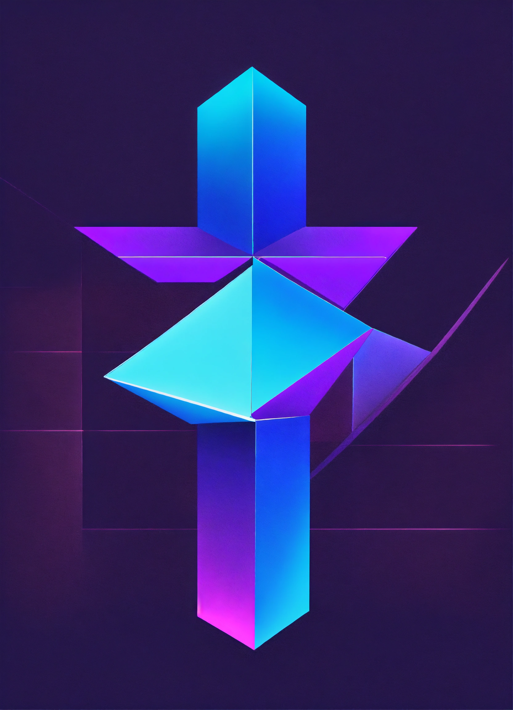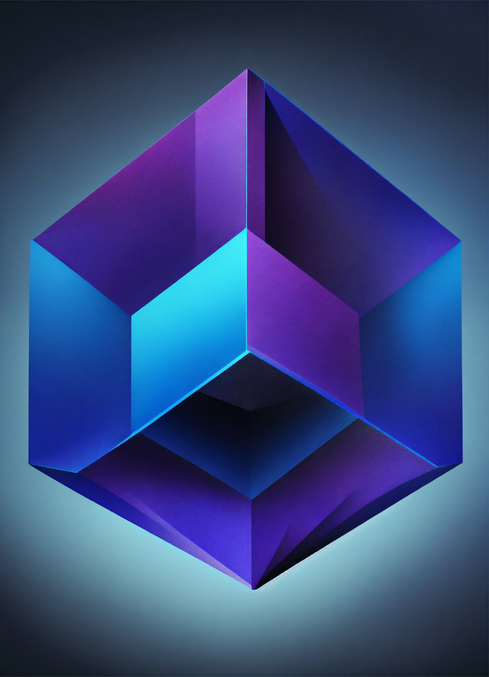 Oblique shape, 3d, intersecting prism in cross, blue color, purple shades, black background, logo design, modern, blue gradient, equal faces, fourth quadrants, minimalist, high constrast