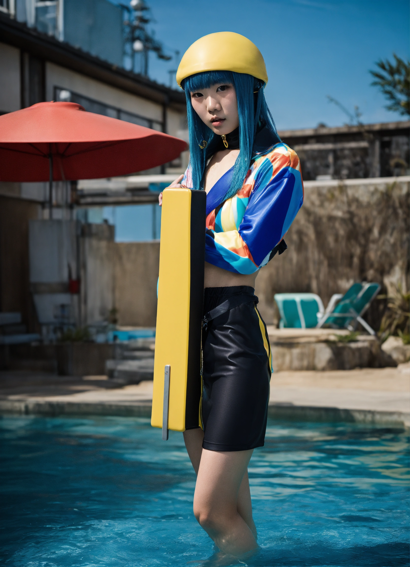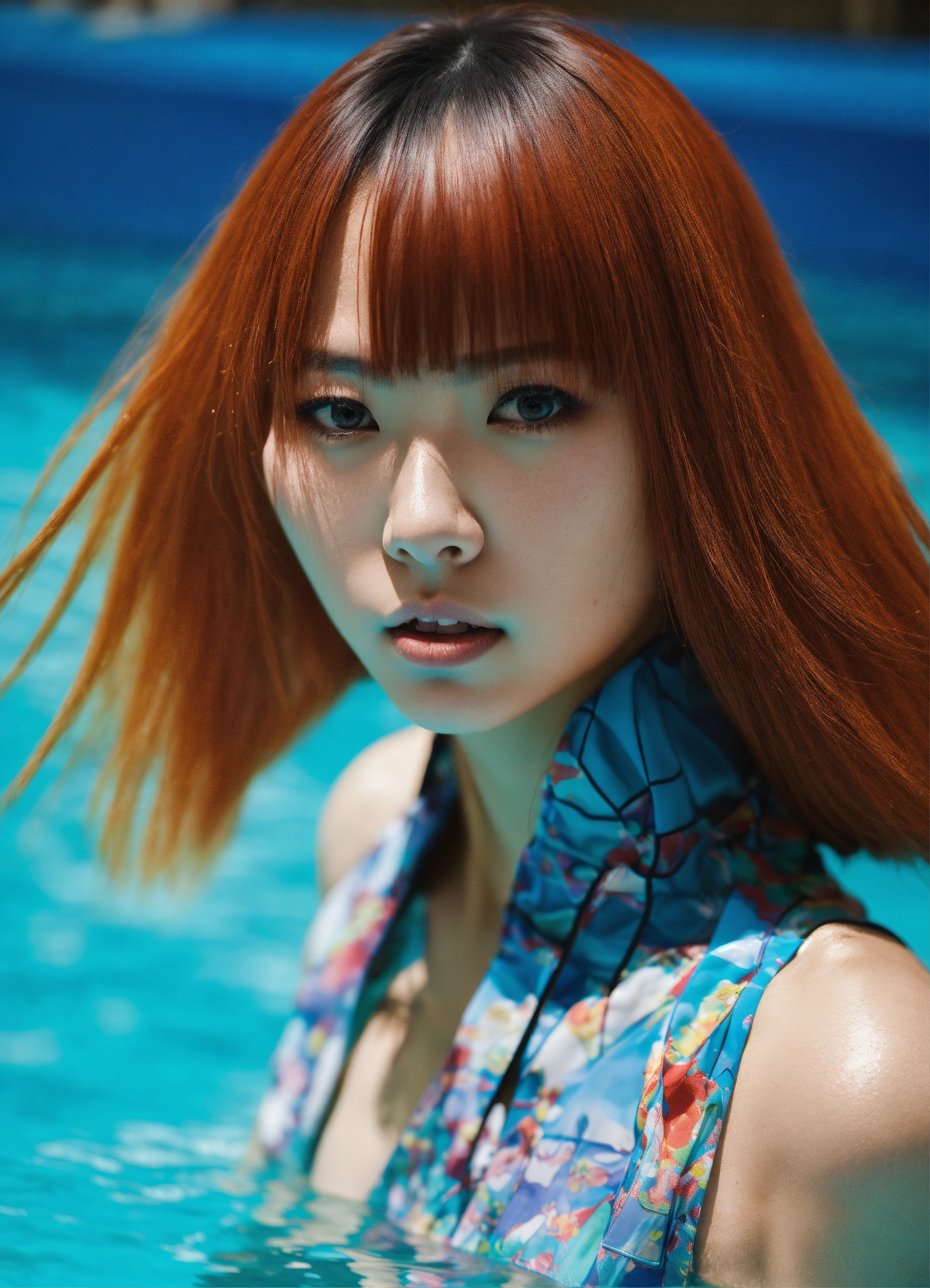 Japanese fashion model with straight hair wearing an avant-garde street style in a swimming-themed photo shoot, photograph by lara jade, extreme pose, contorted pose, highly detailed --ar 10001618