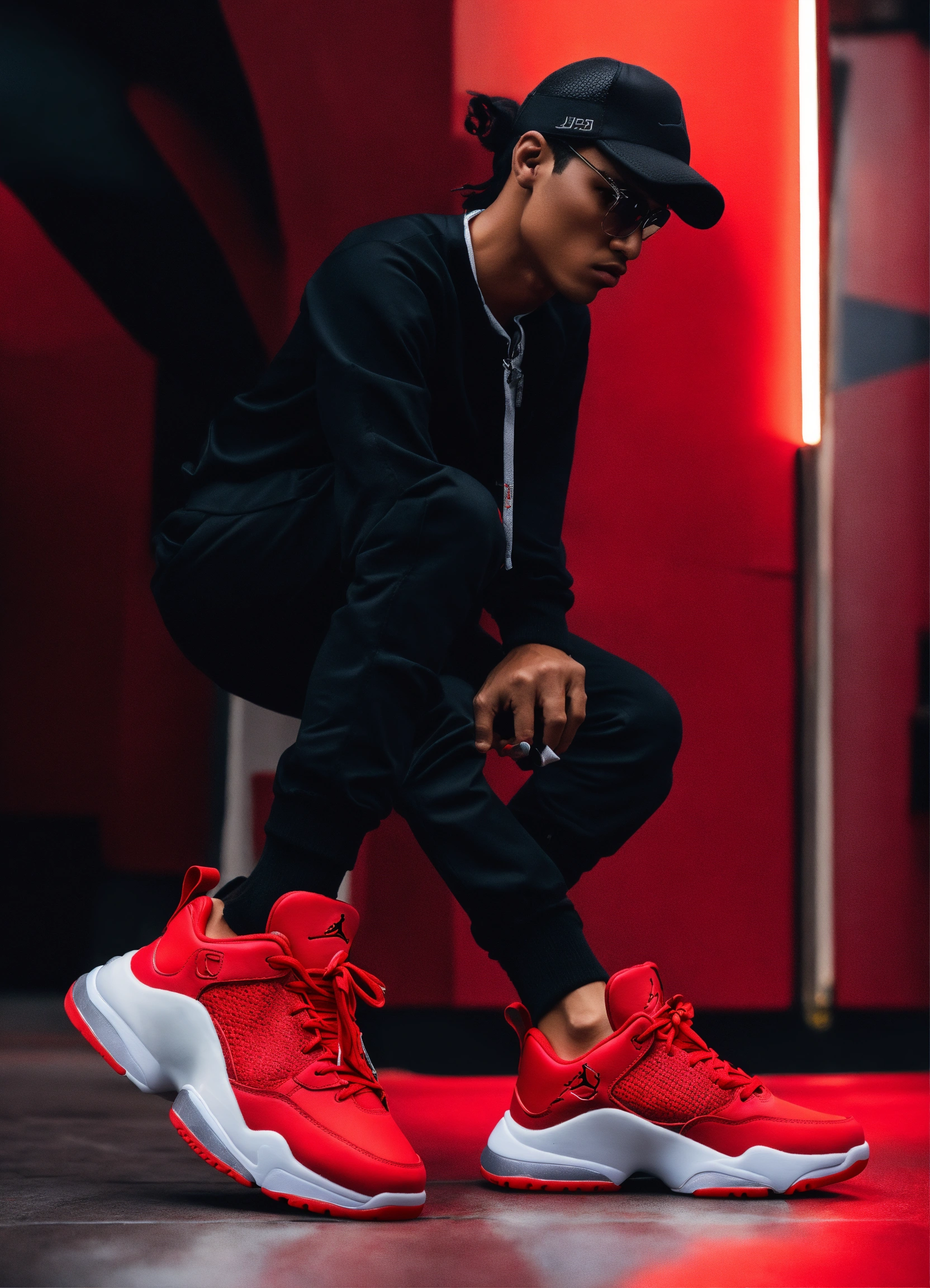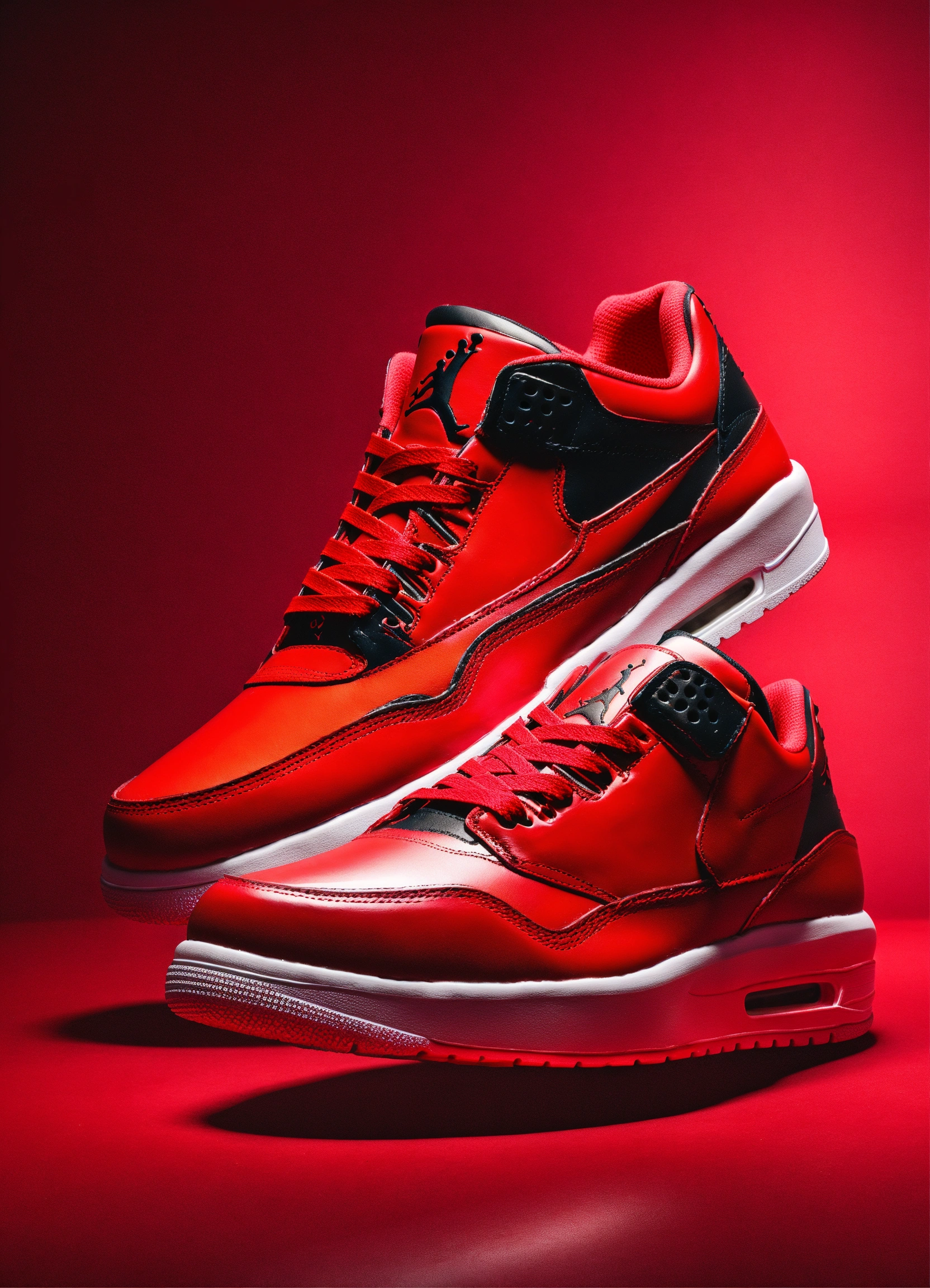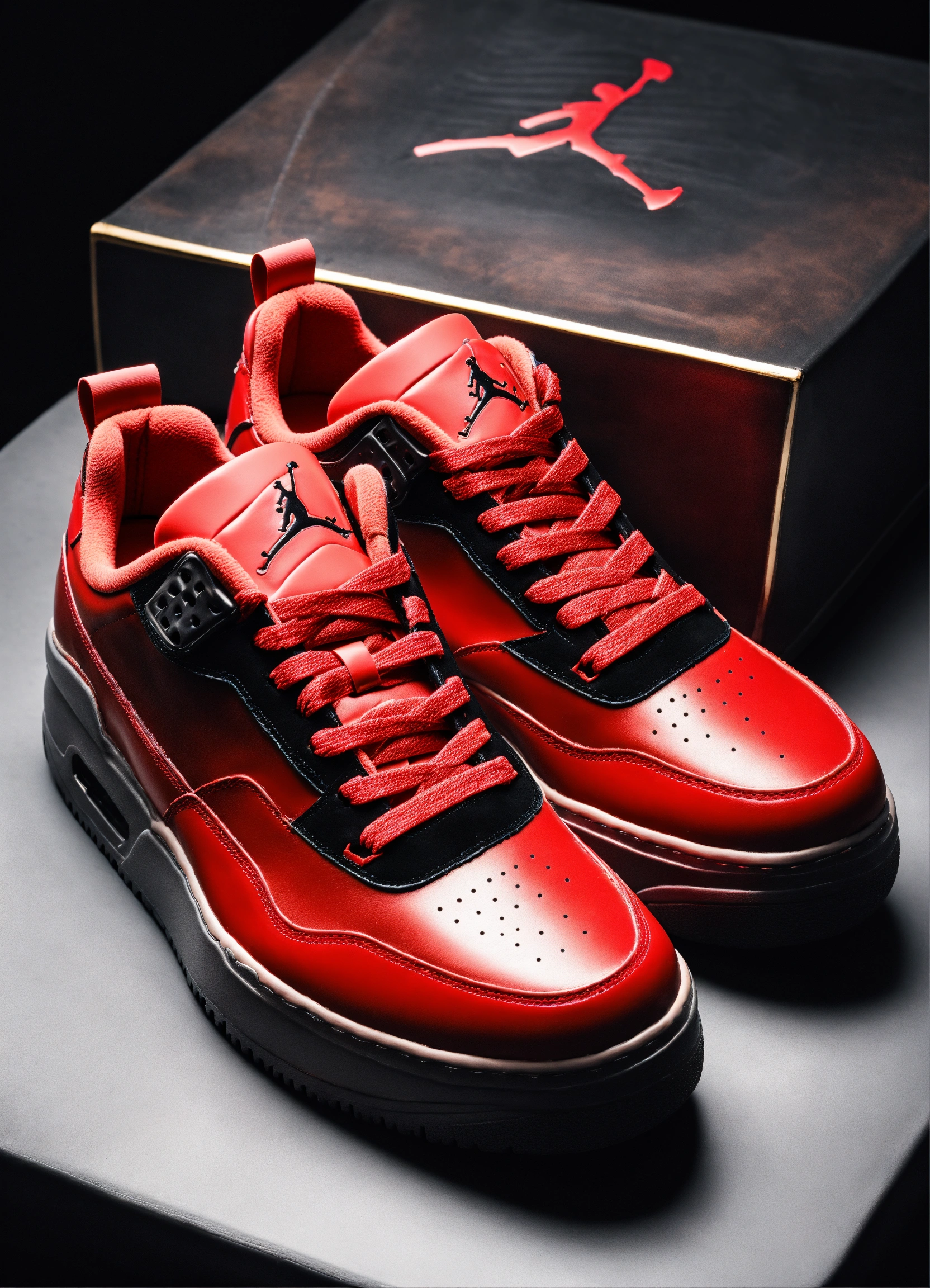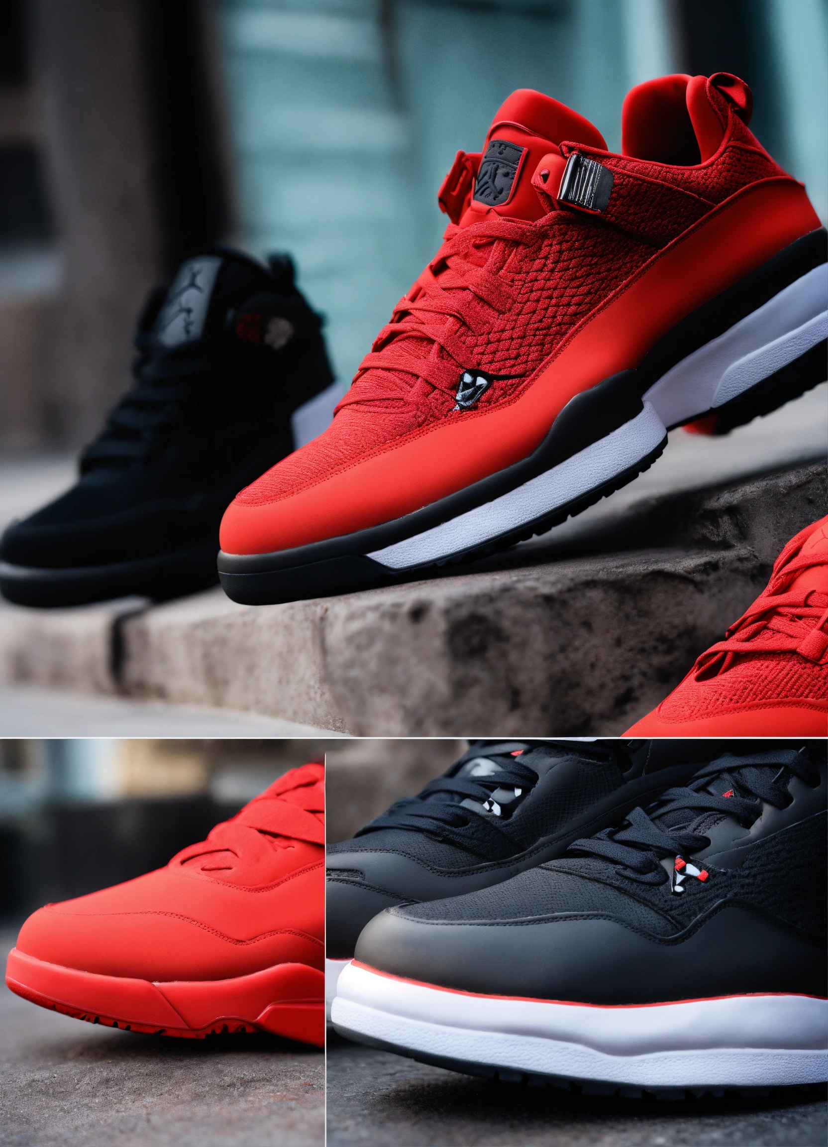 A modern and fancy sneaker with a new and comfort, chunk style, use jordan’s as reference, do gentleman concept, use coral, red, black and red colors in the combination, only use 1 or 2 of these colors maximum