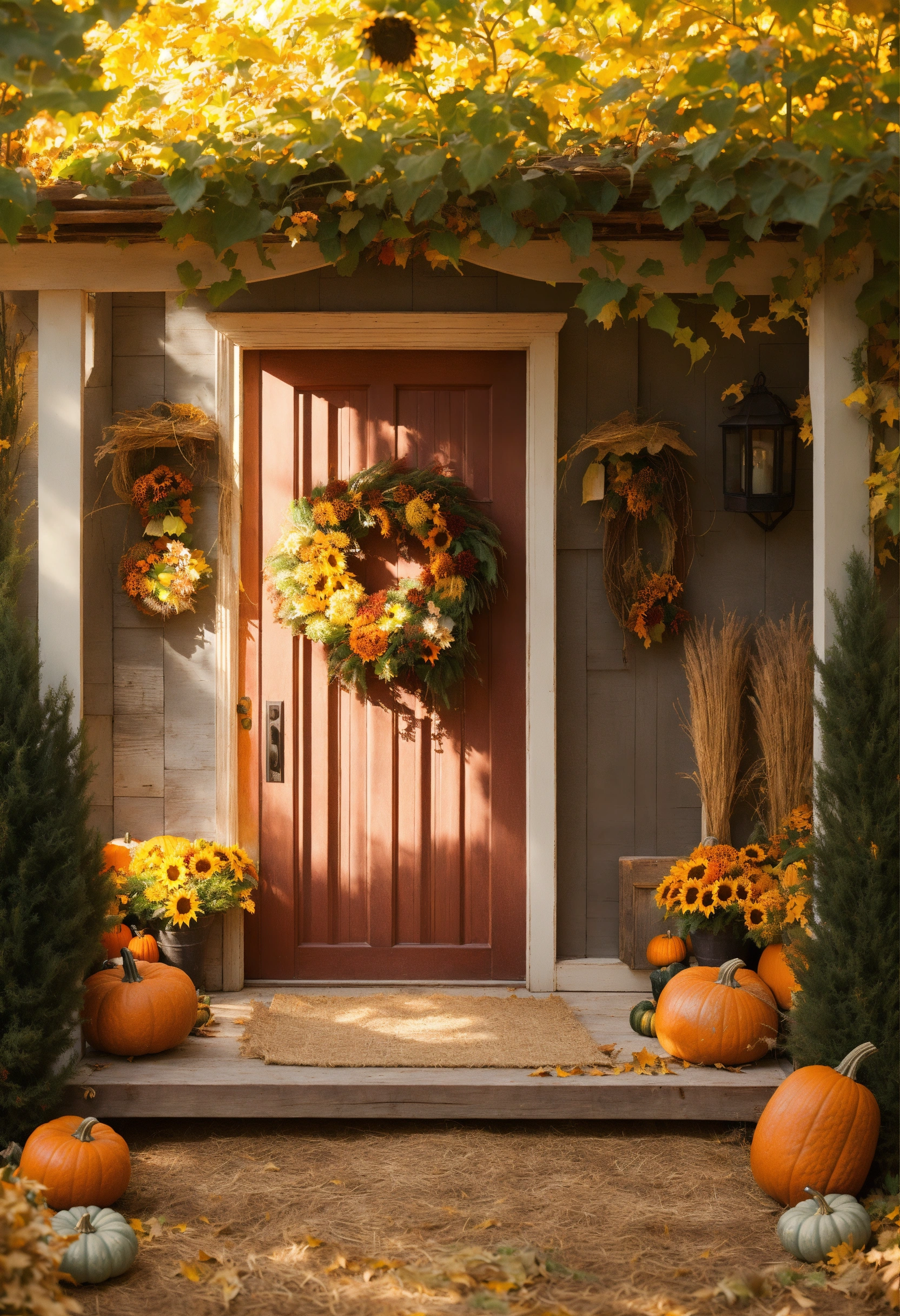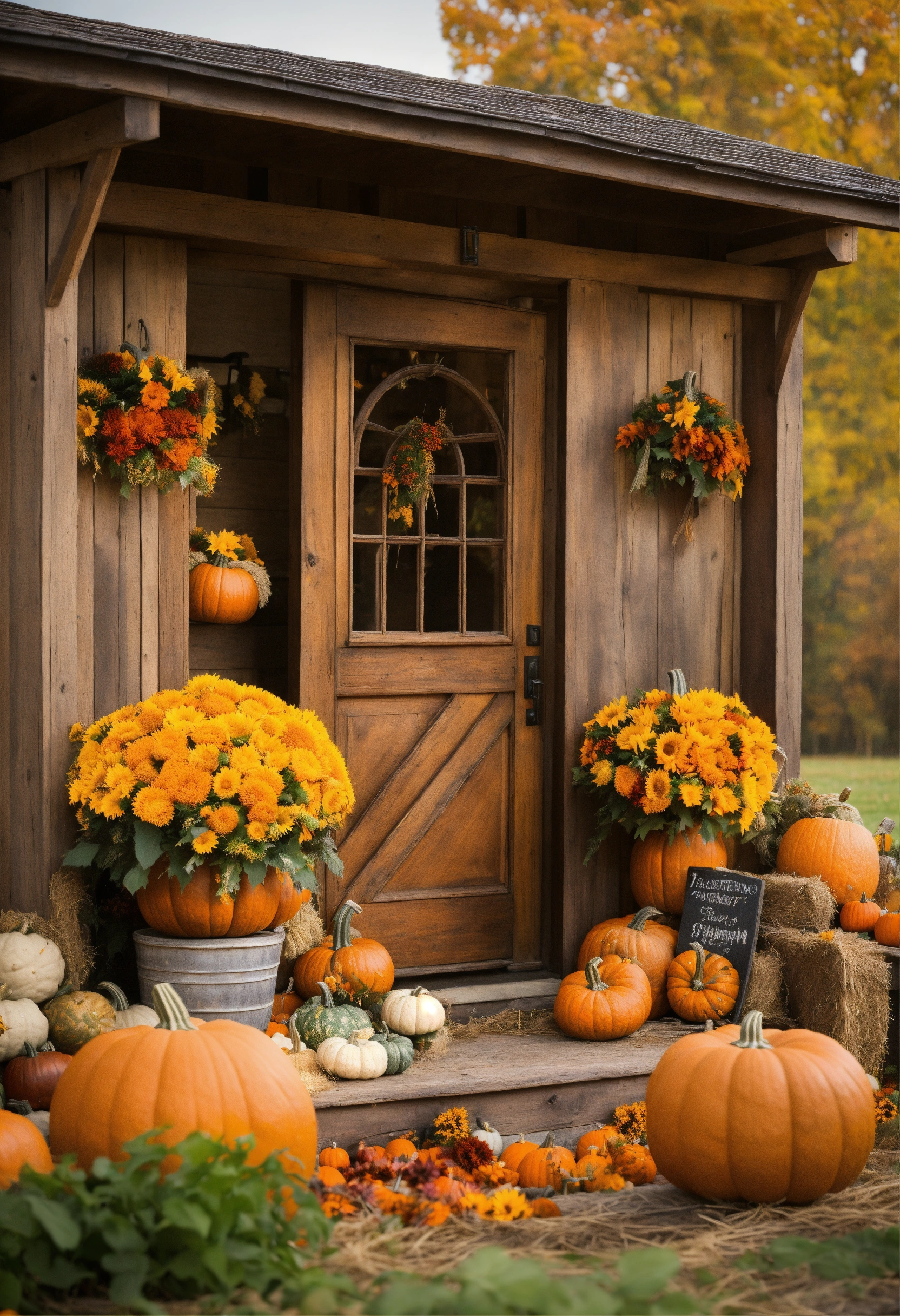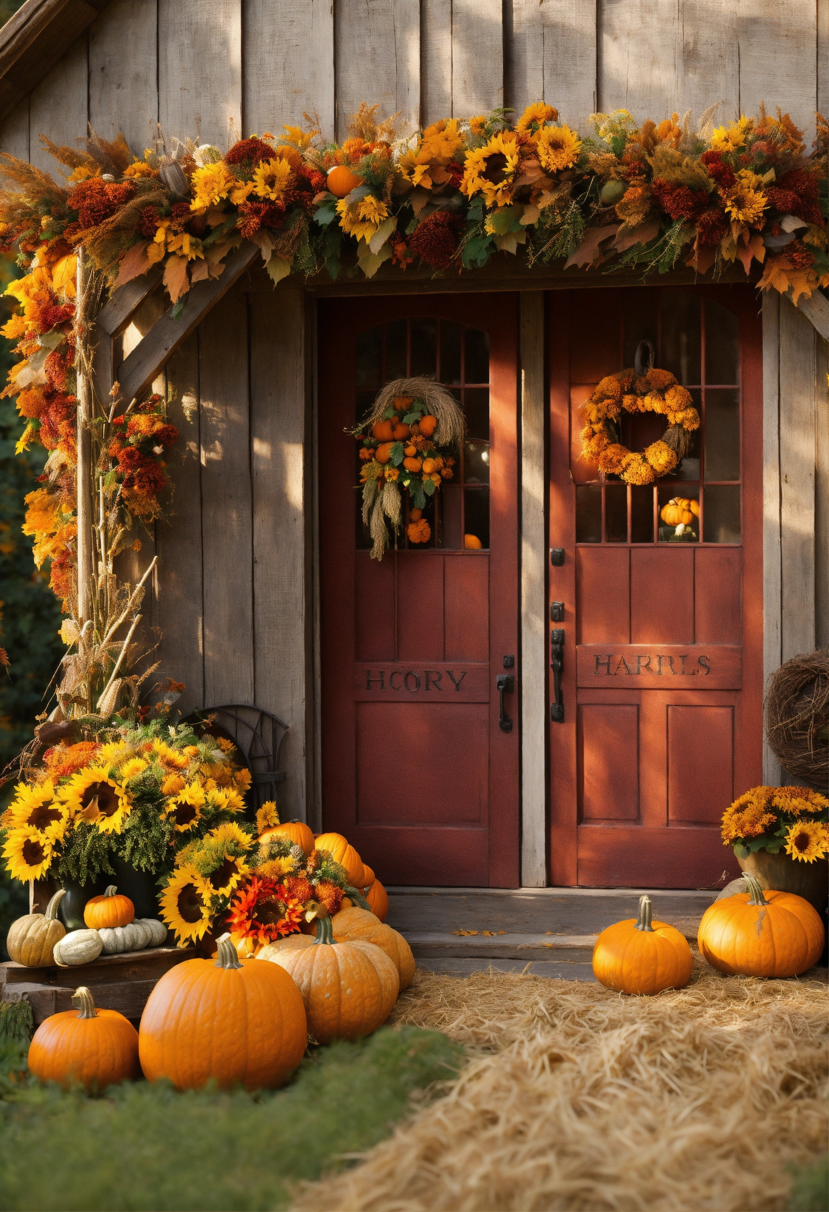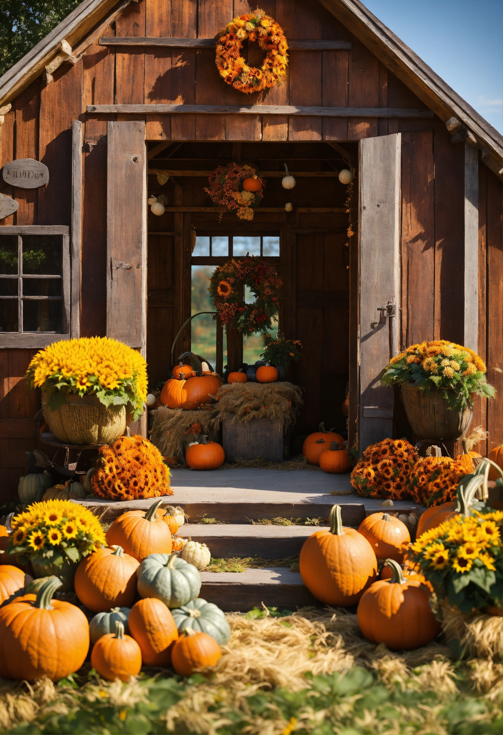 Create a festive autumn scene with a wooden doorway, featuring a pumpkin patch, hay bales, and a variety of pumpkins and gourds. the doorway should be adorned with autumn flowers and plants, such as sunflowers, mums, and autumn foliage. the scene should be set in a rustic barn or farmhouse setting, with a cozy and warm atmosphere.