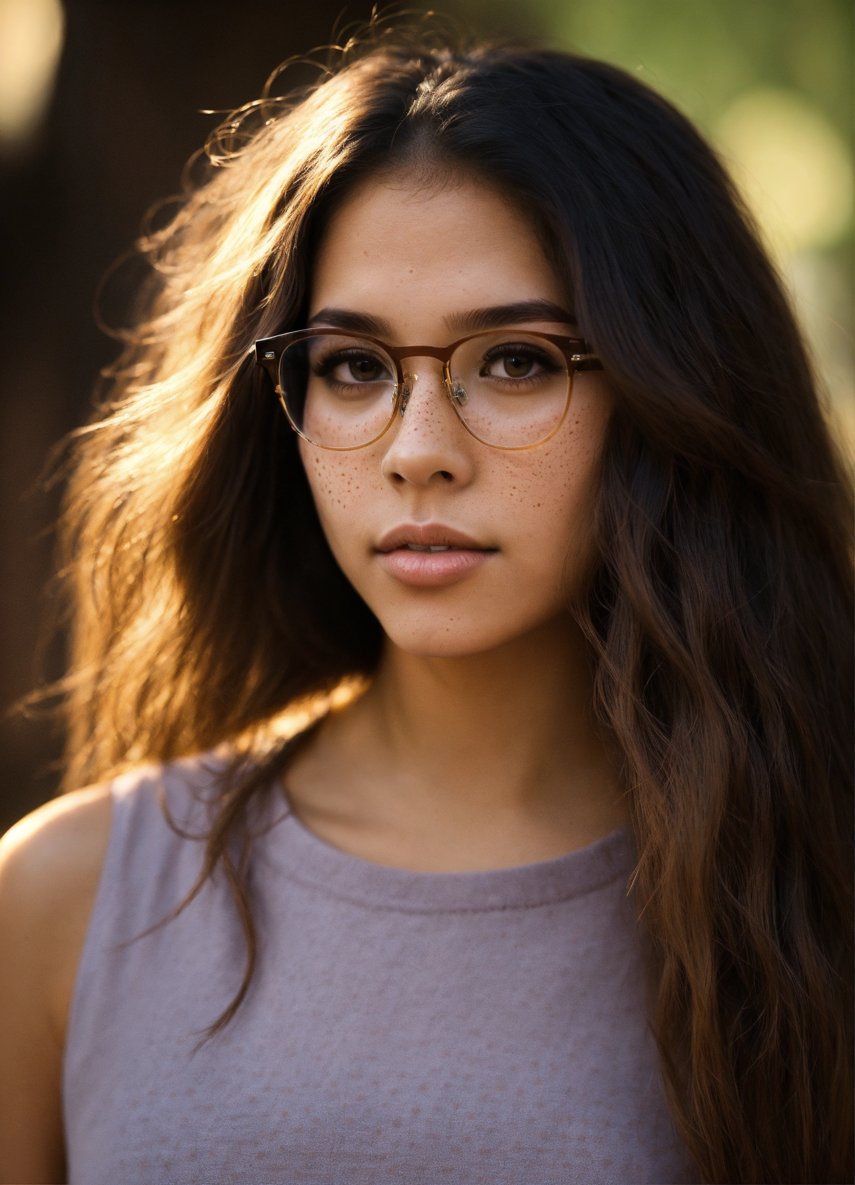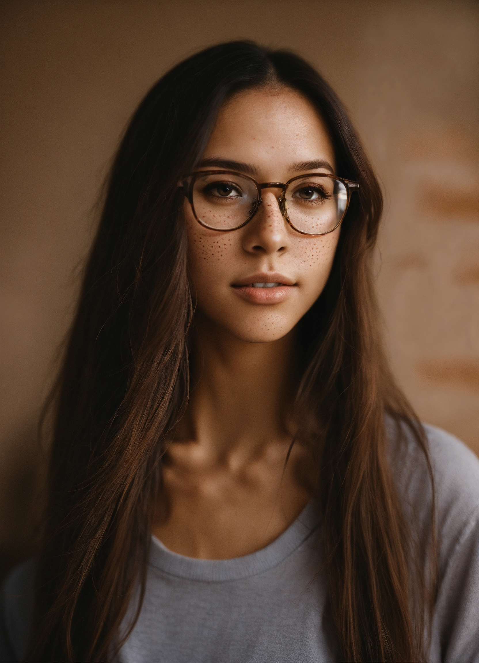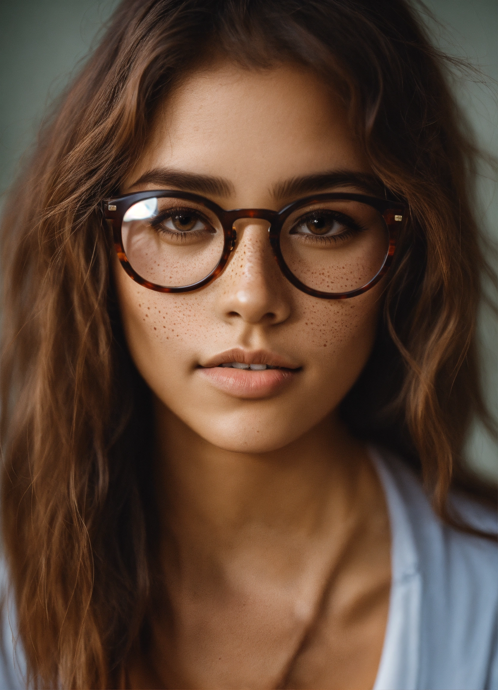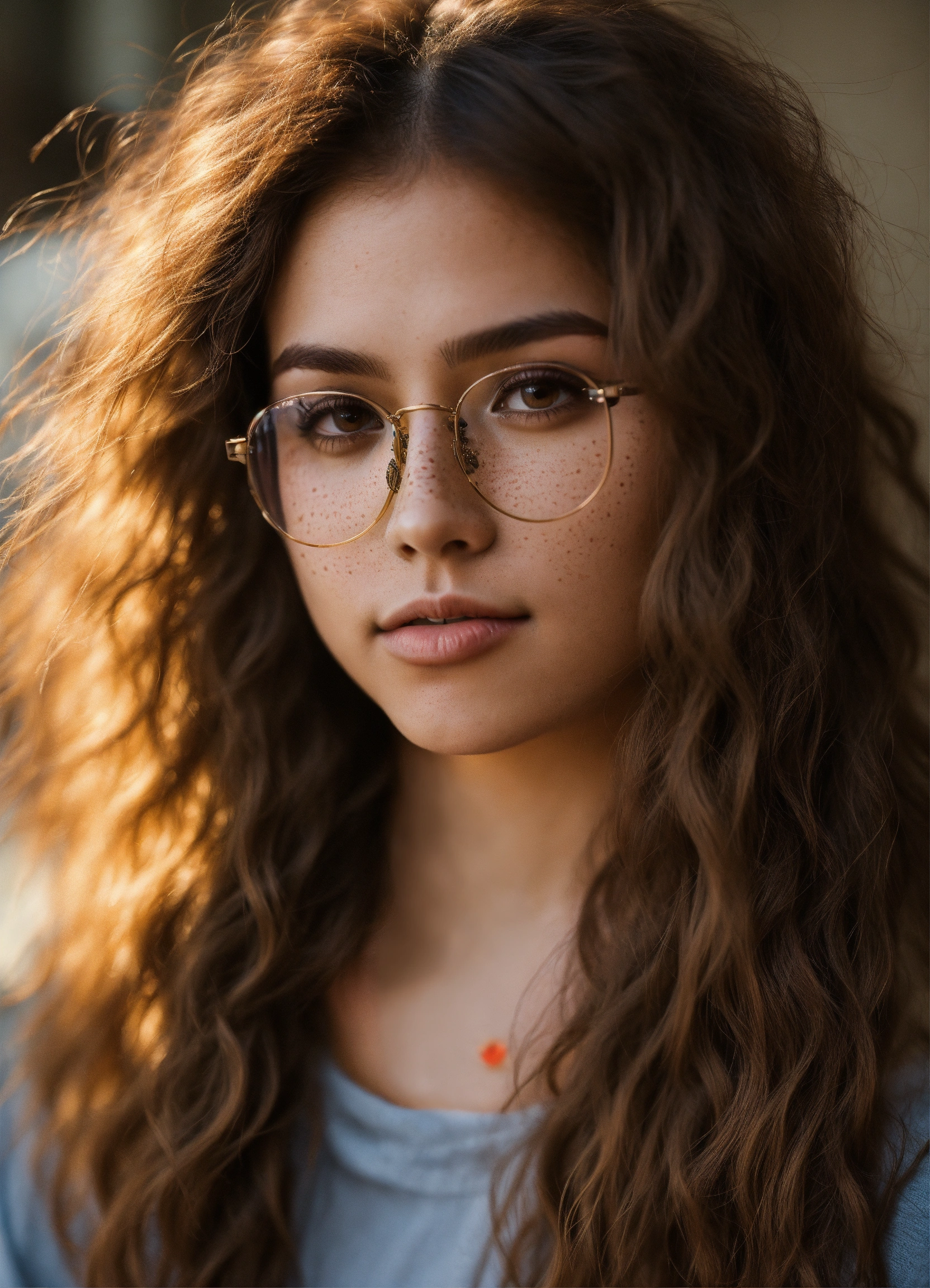 Short light skinned female, long straight puffy hair, glasses, freckles, brown eyes, no imperfections