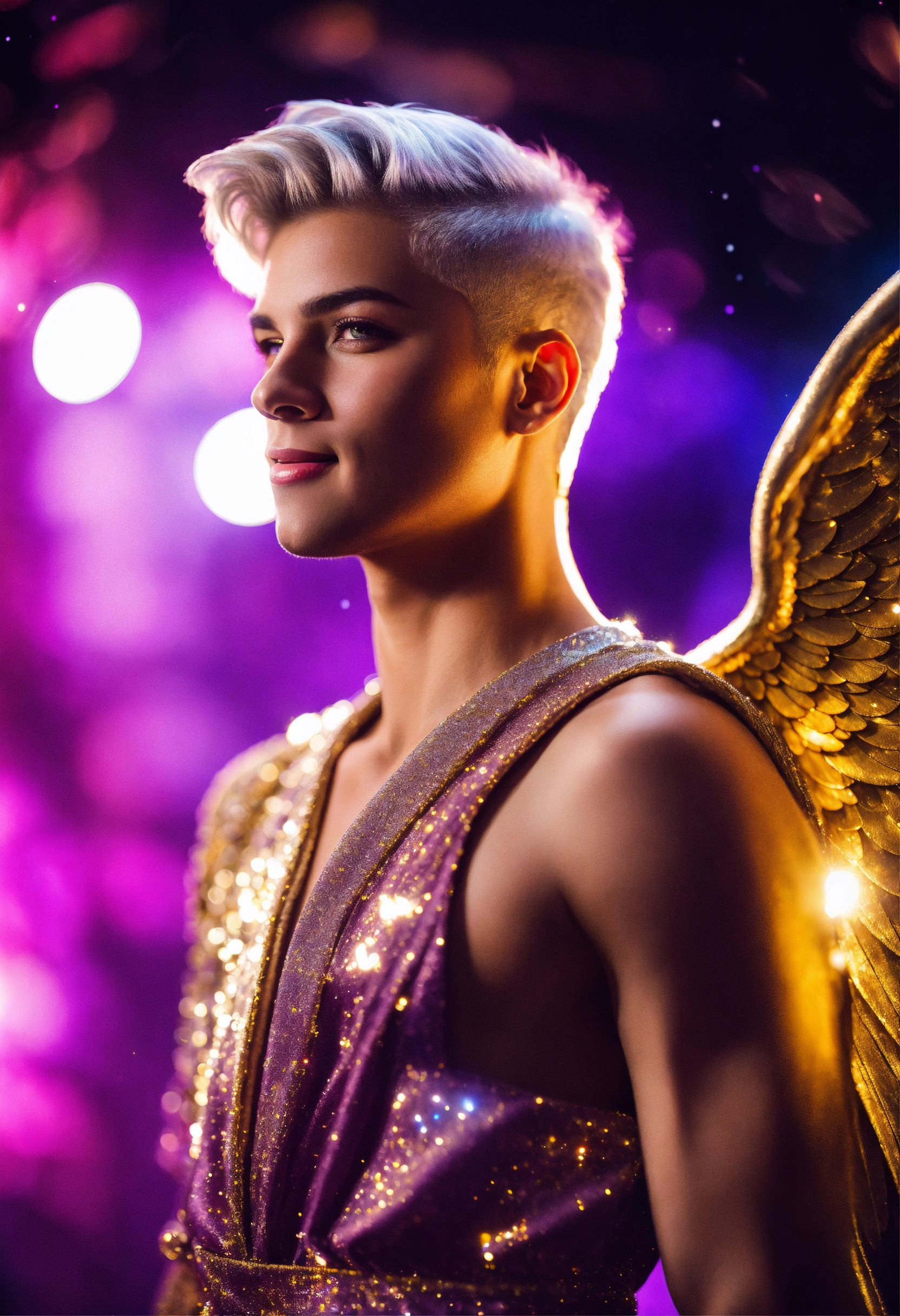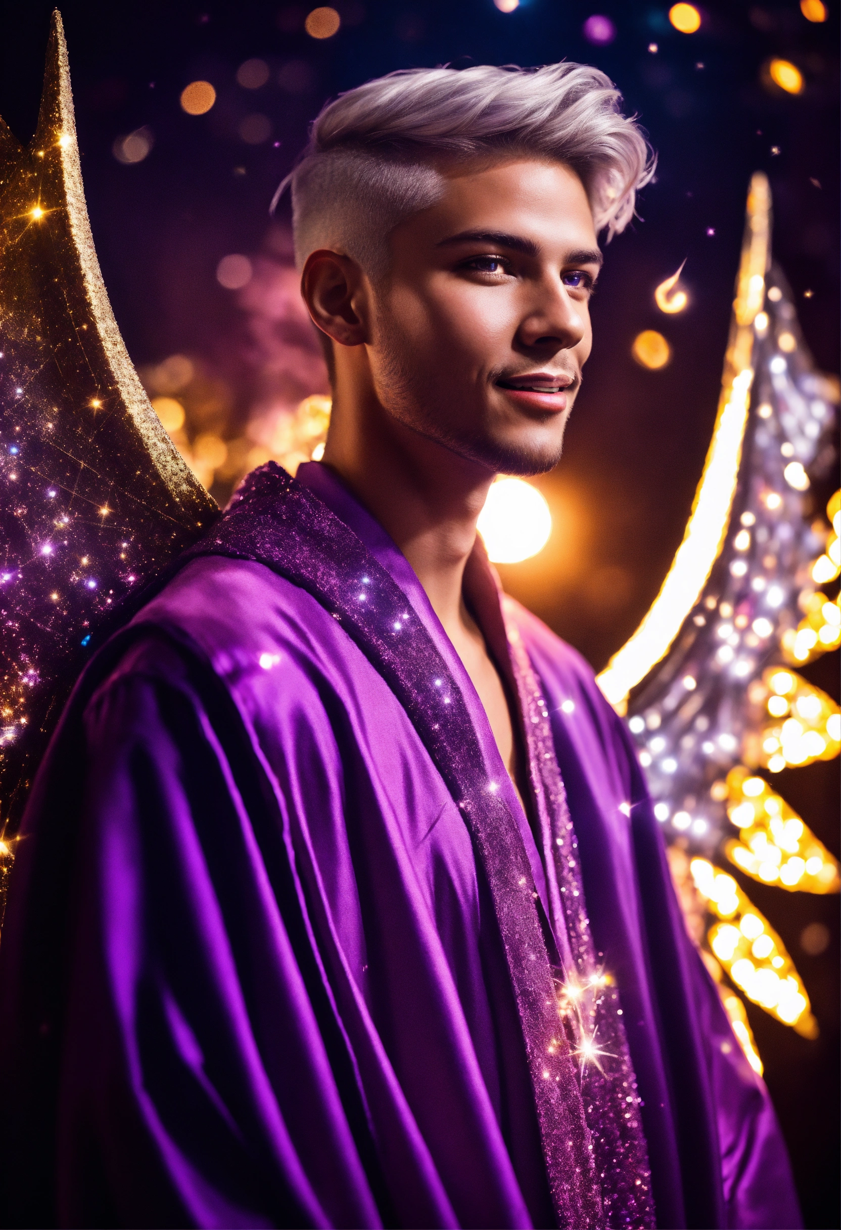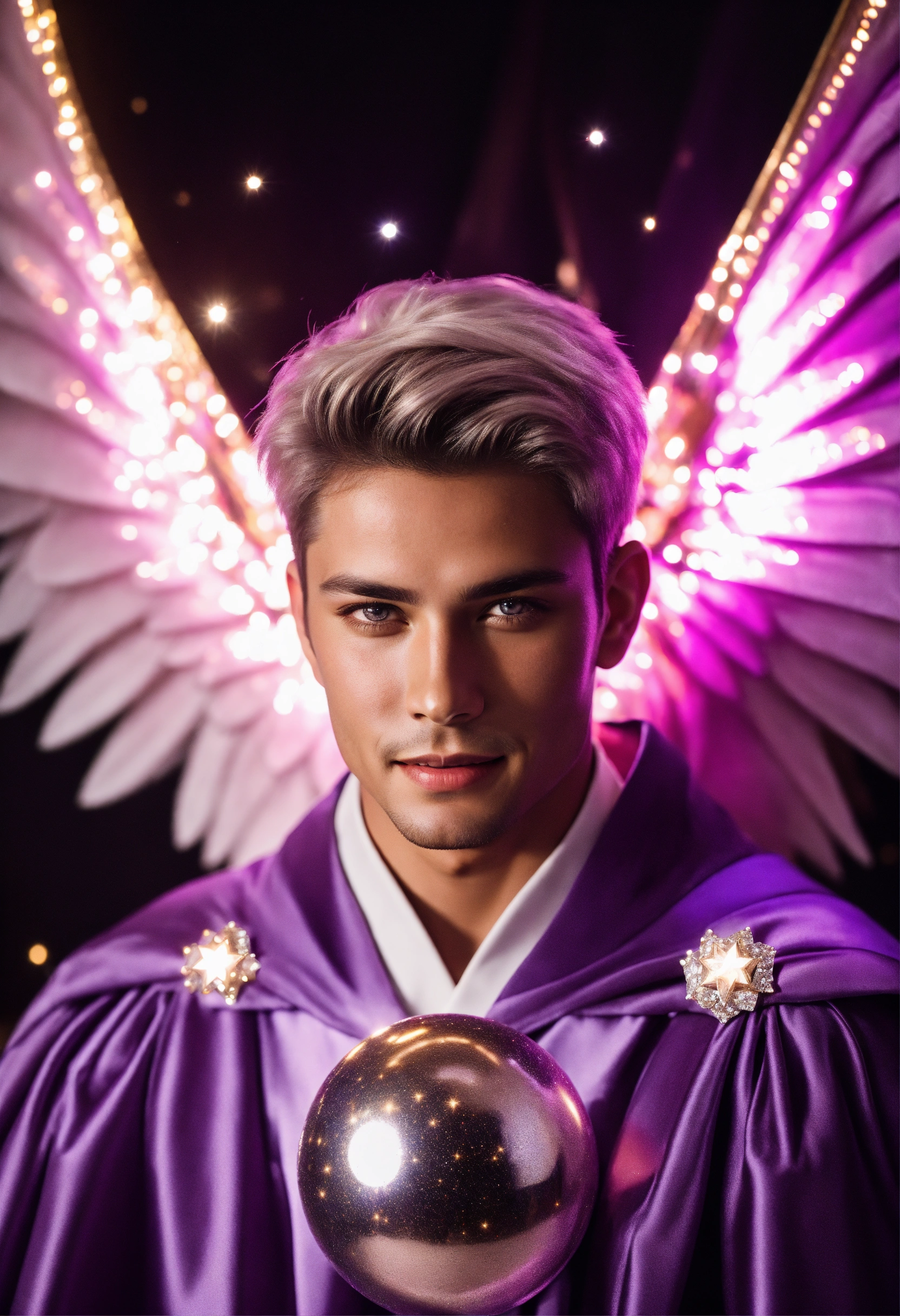 Close-up photographic portrait, handsome gorgeous masculine archangel of inspiration with huge angel wings, young latino supermodel male, background is explosion of a billion magical stars, holding a bright sphere of dazzling light, huge friendly smile, staring intensely straight ahead directly into camera at me, short platinum hair, loving violet eyes centred, making eye contact with me, wearing futuristic diamond-purple choir robes with sparkling star details, fashion photoshoot, film grain.