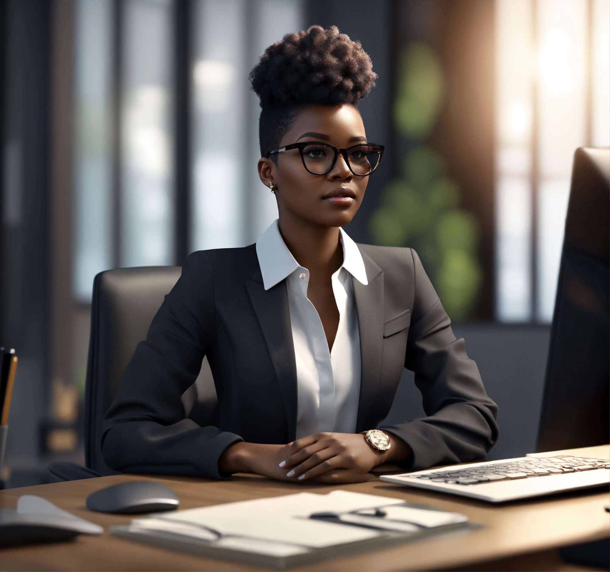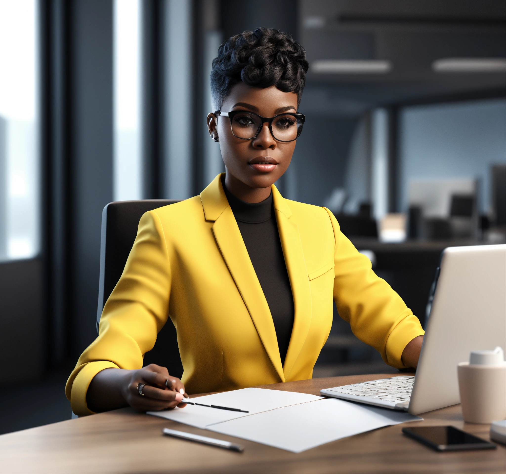 3d render of a black woman, short pixie hair style with oversized designer glasses, at the work office, designer jacket pants suit for the office, sitting at a desk