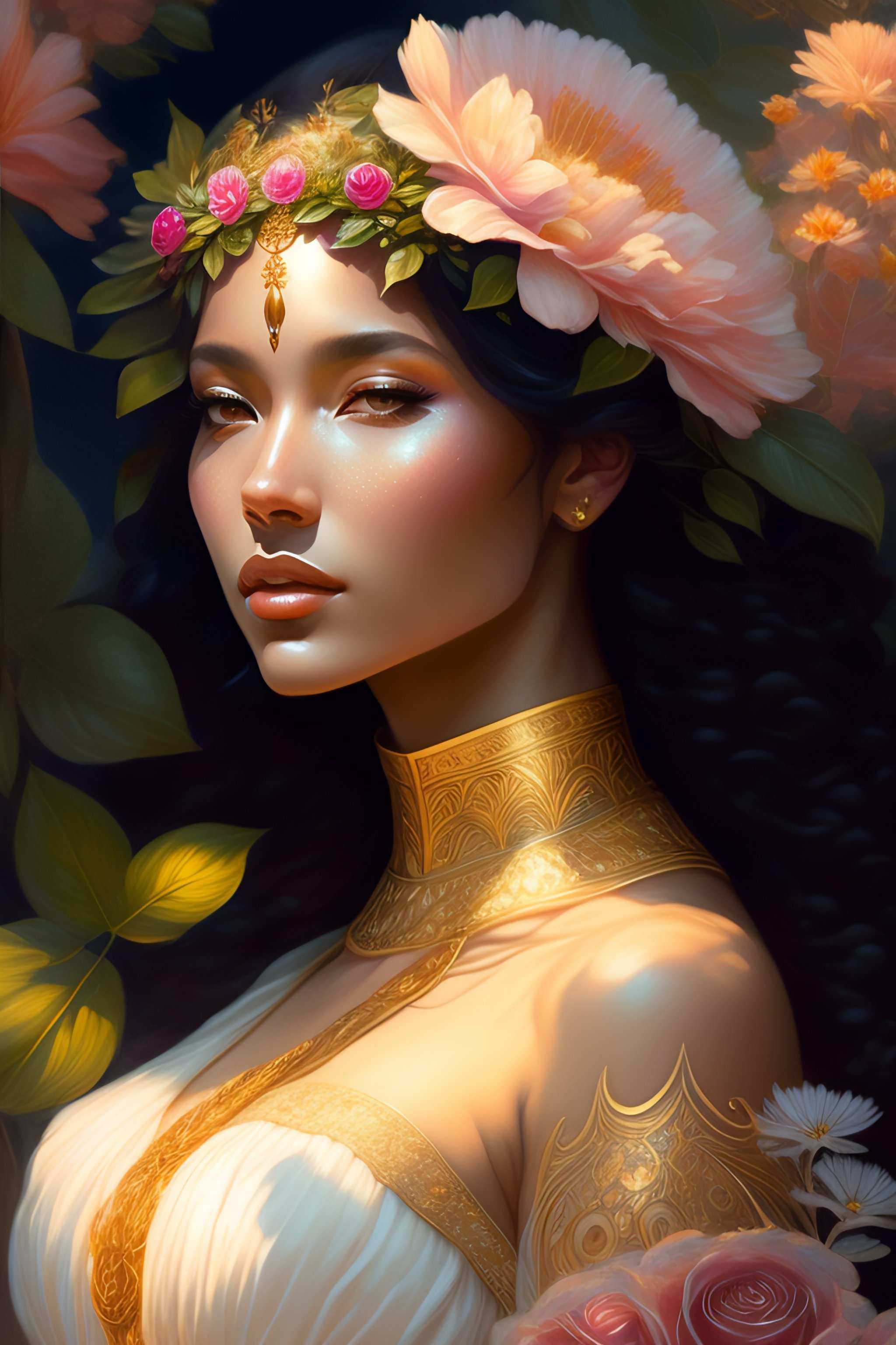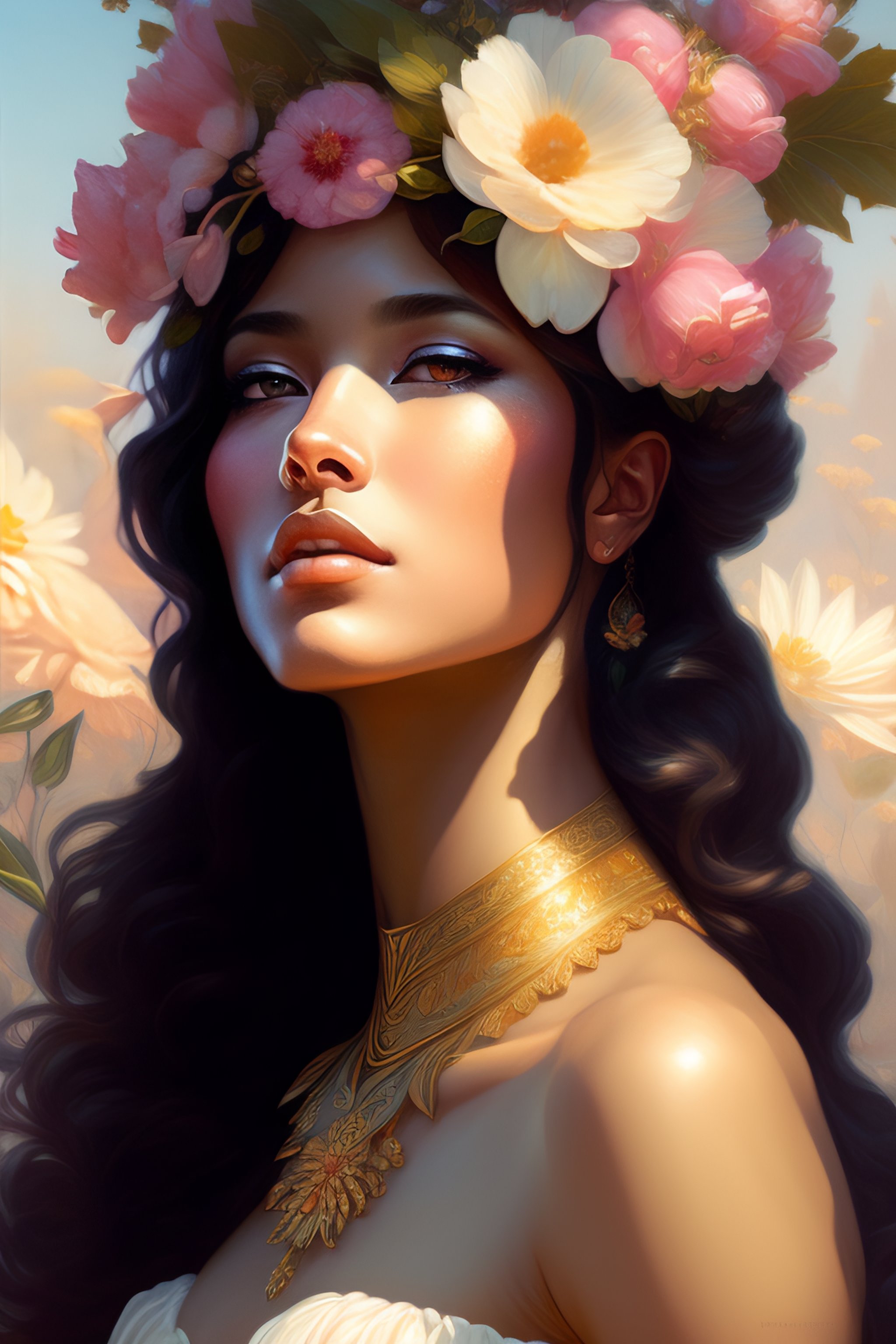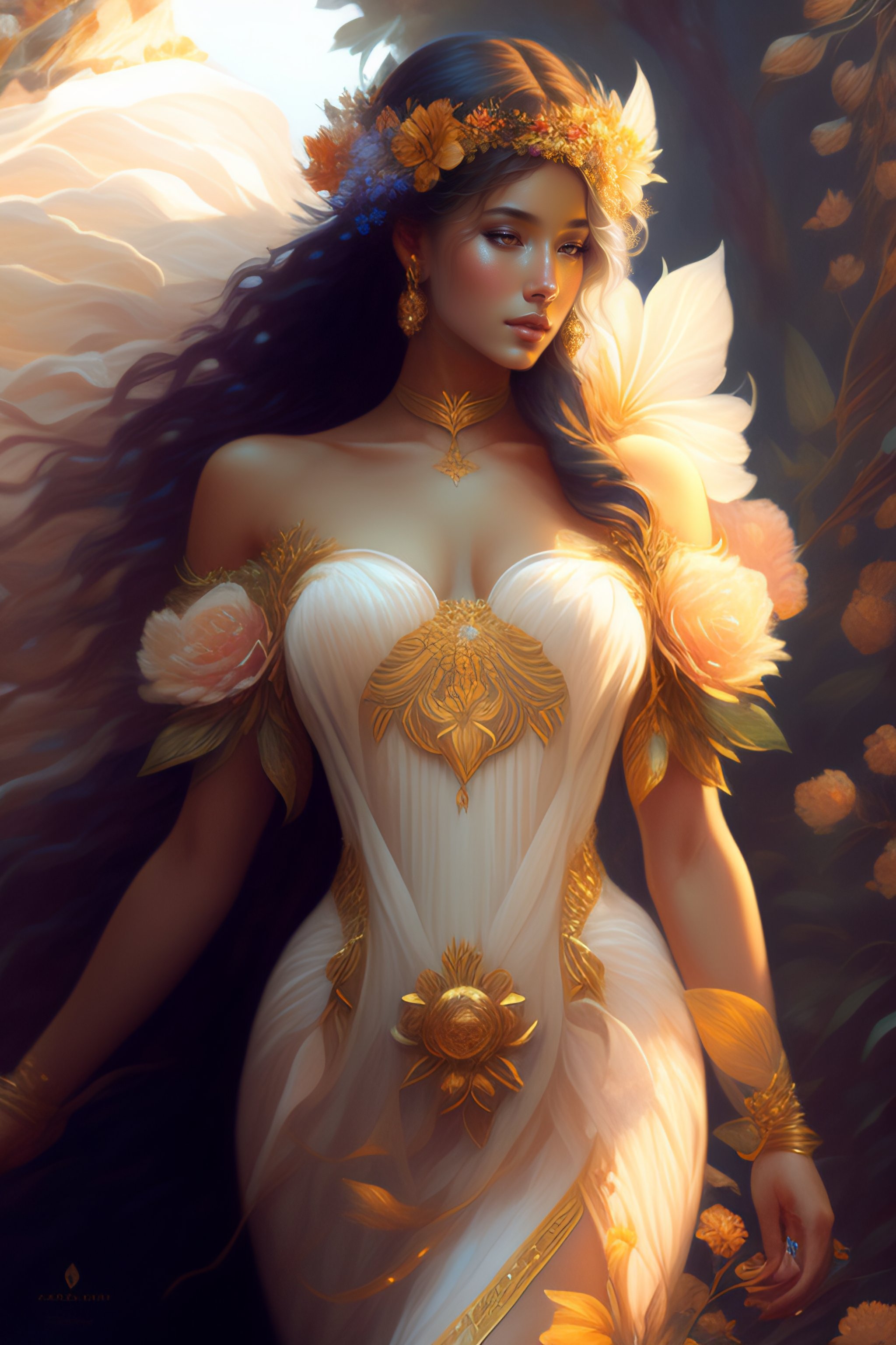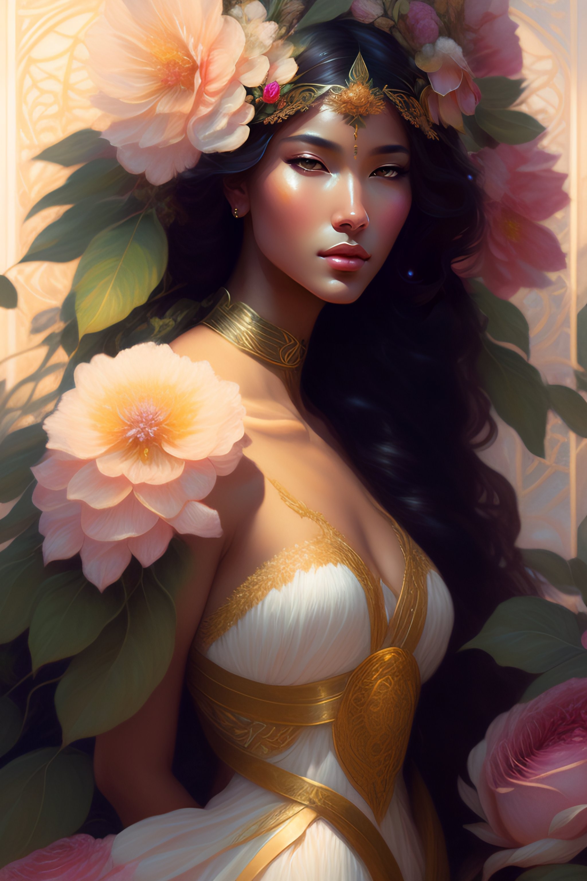 Flower goddess, full body, intricate, elegant, highly detailed, digital painting, artstation, concept art, smooth, sharp focus, illustration, art by artgerm and greg rutkowski and alphonse mucha and william - adolphe bouguereau and stephanie law