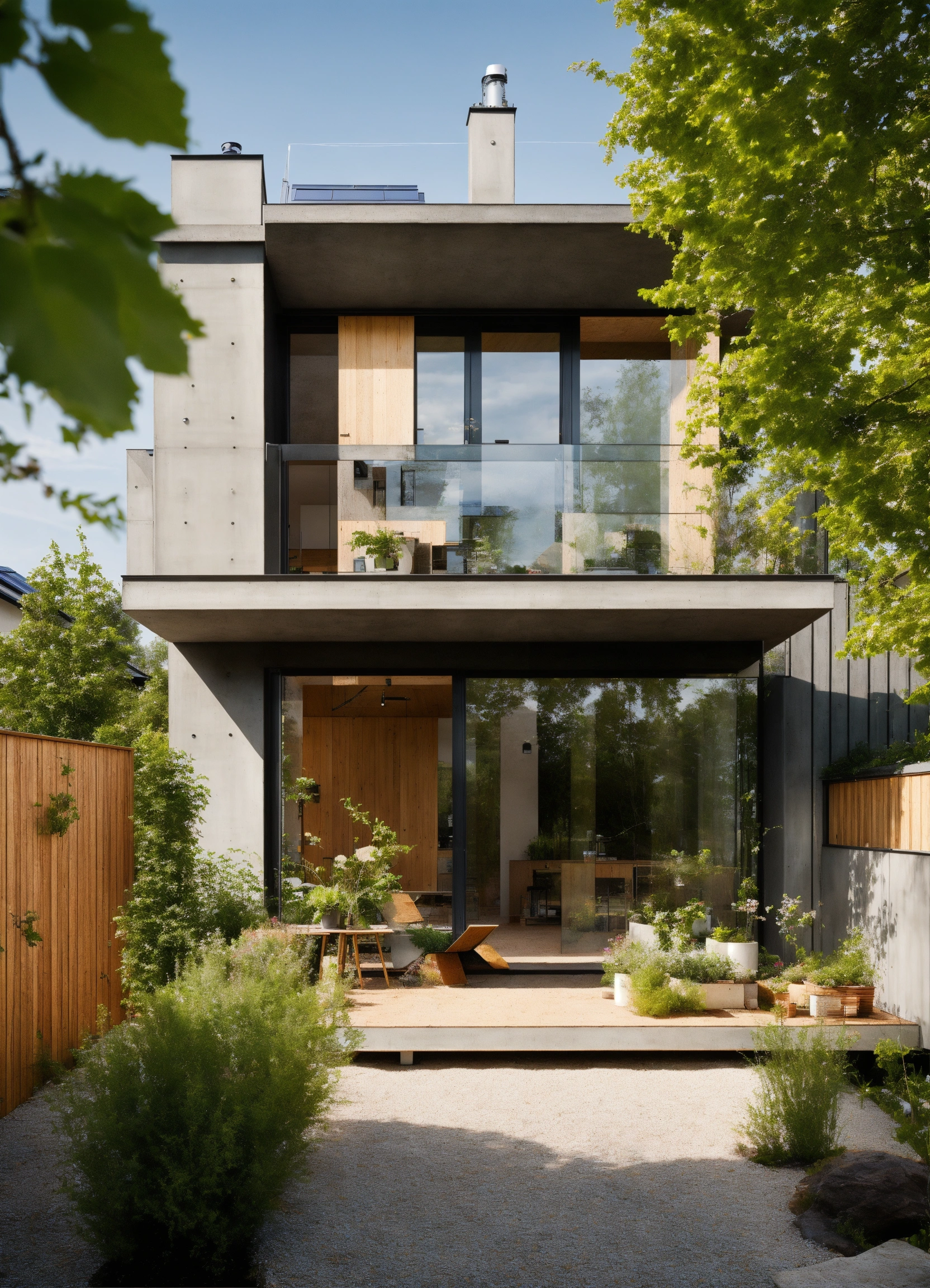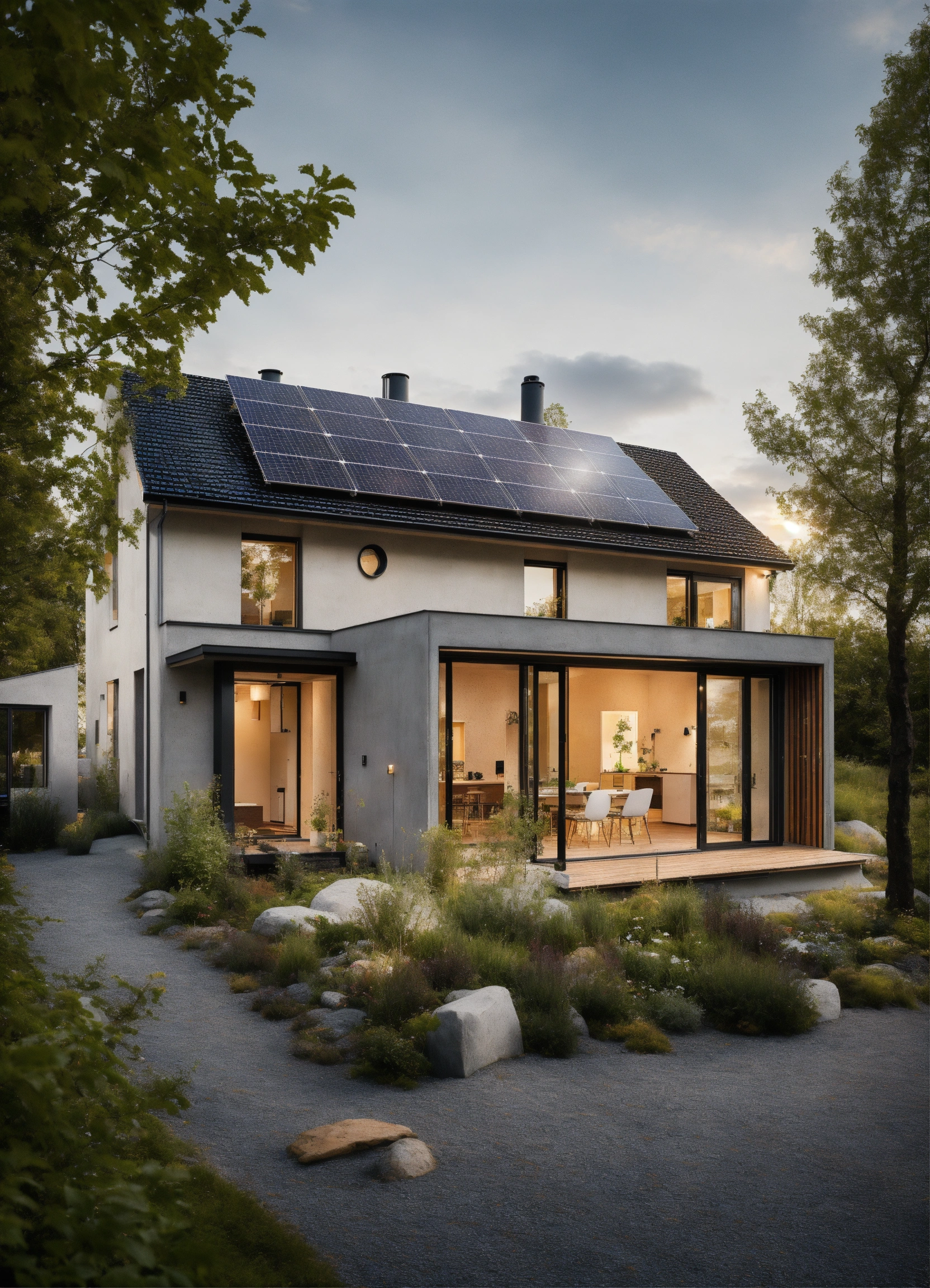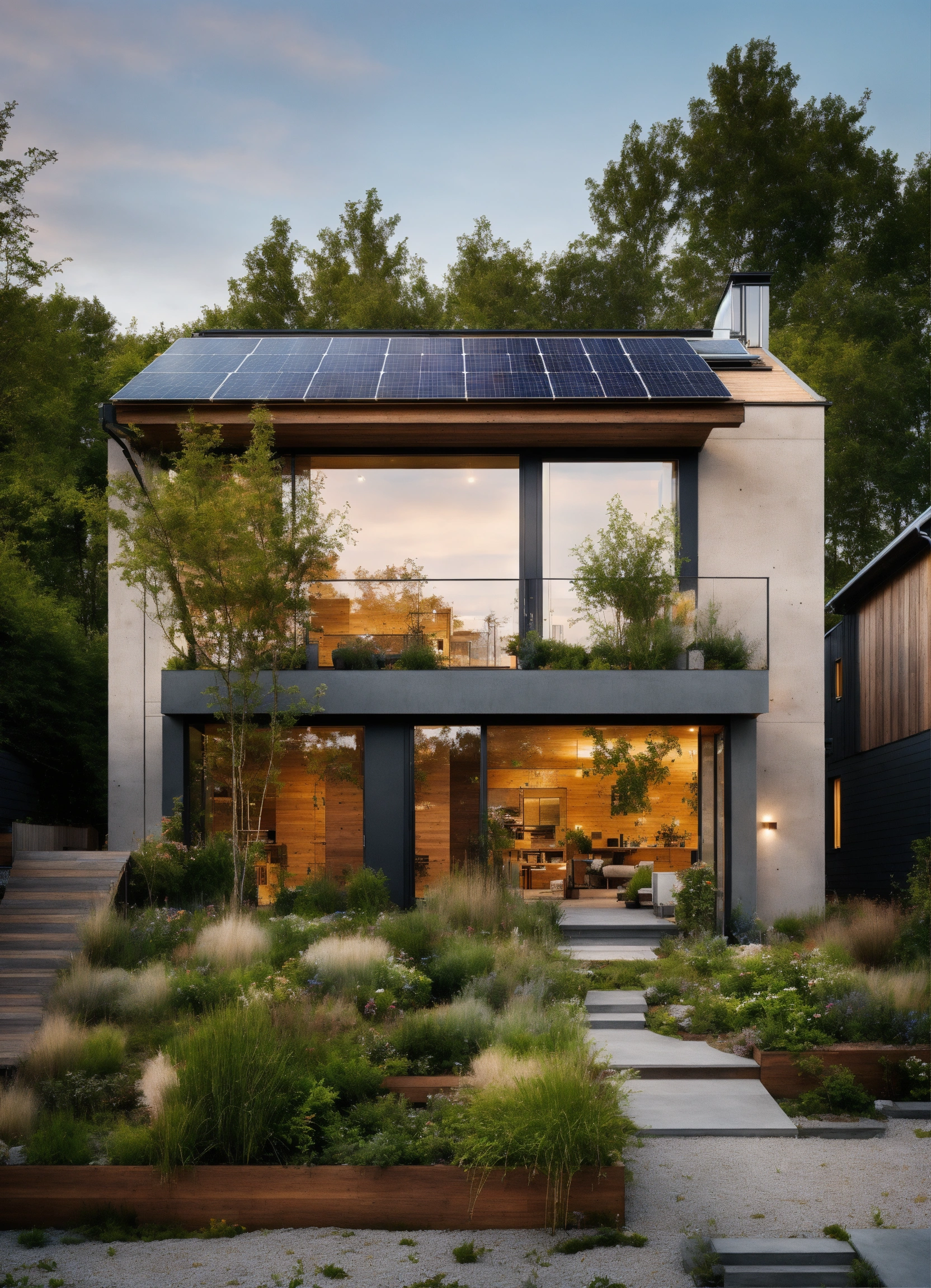 A modern house with solar panels on the roof, highlighting the importance of renewable energy. biophilic design, concrete, natural materials, light colours scandinavian lots of vegetation