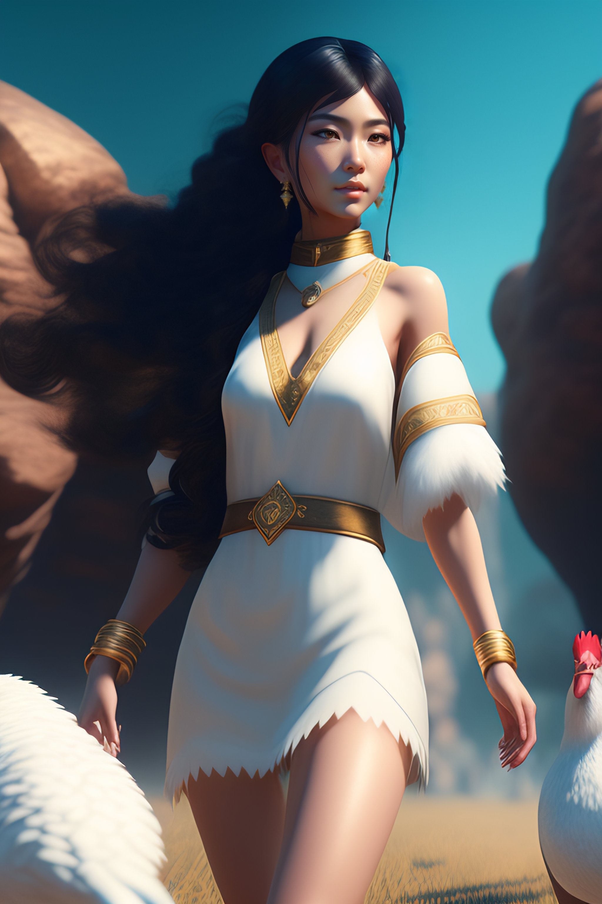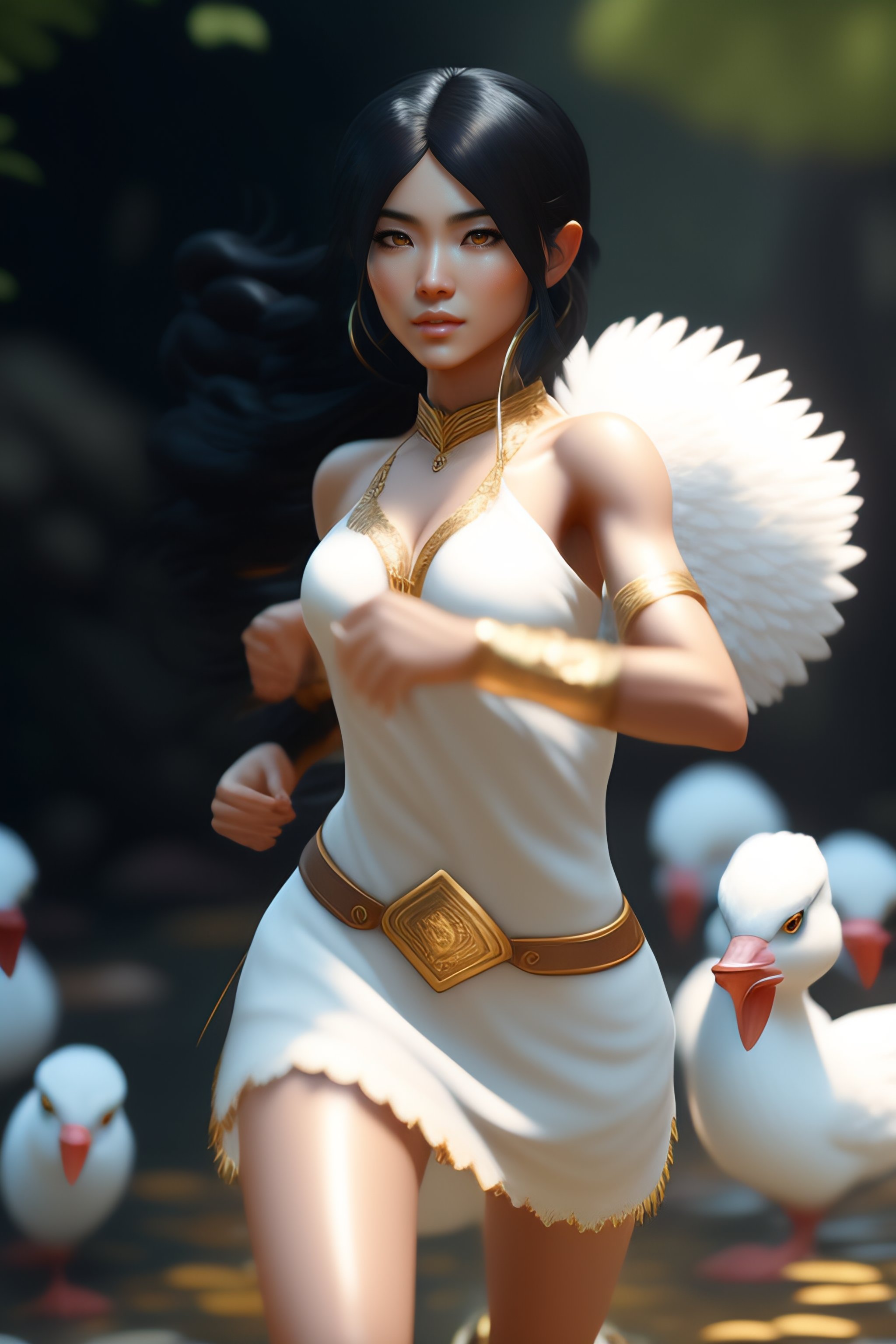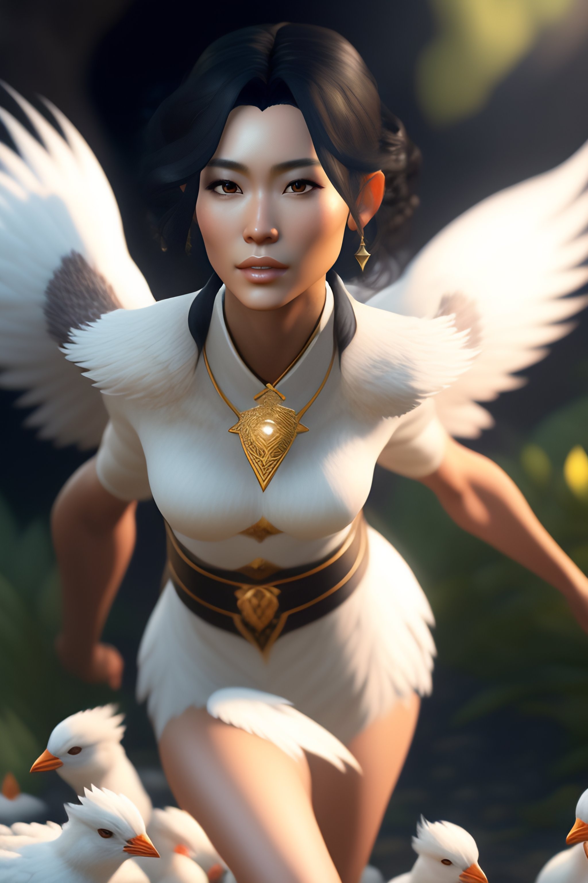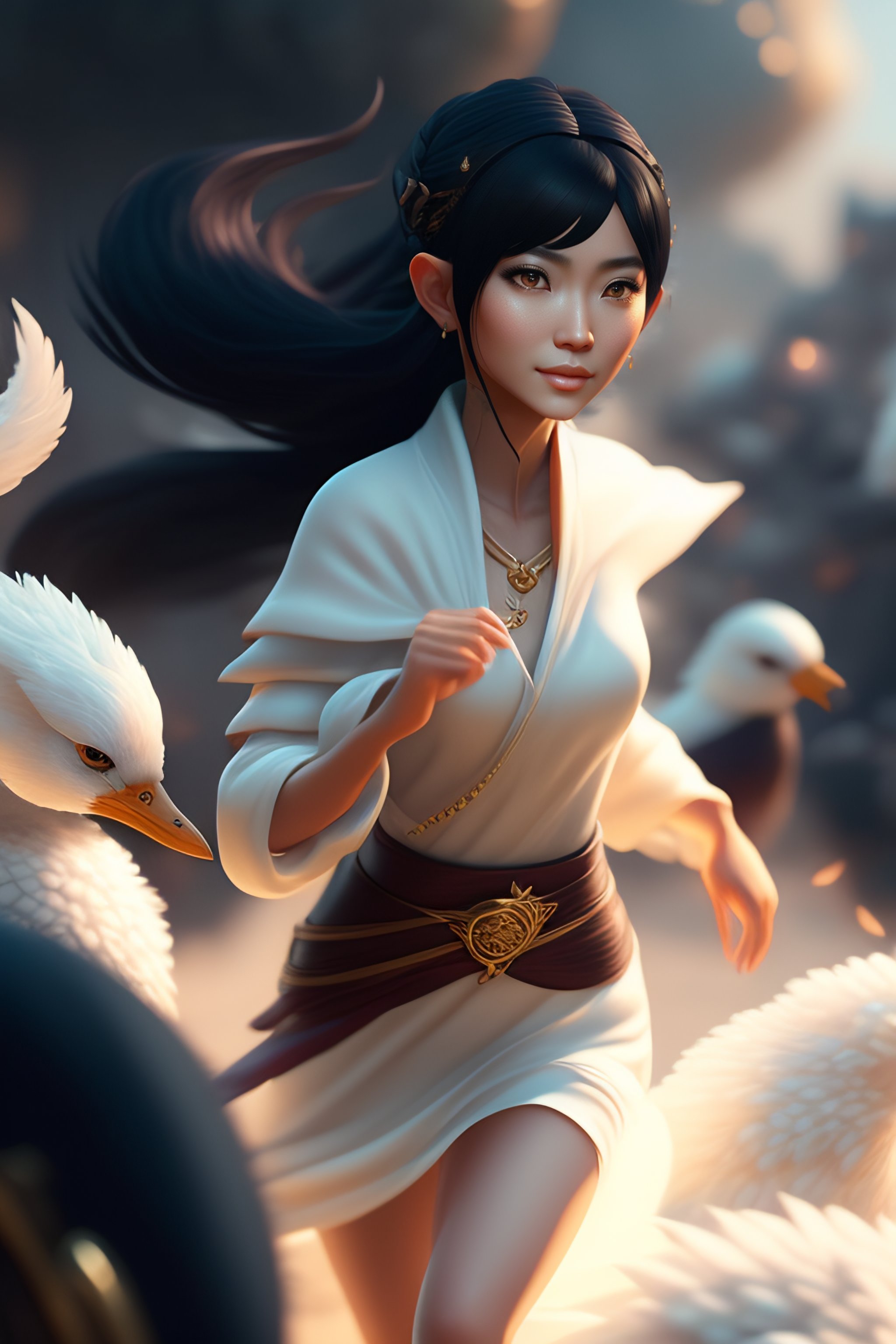 Mary shiota is a black hair elf wearing a white tunic running away from a flock of white chickens, made by stanley artgerm lau, wlop, rossdraws, artstation, cgsociety, concept art, cgsociety, octane render, trending on artstation, artstationhd, artstationhq, unreal engine, 4k, 8k