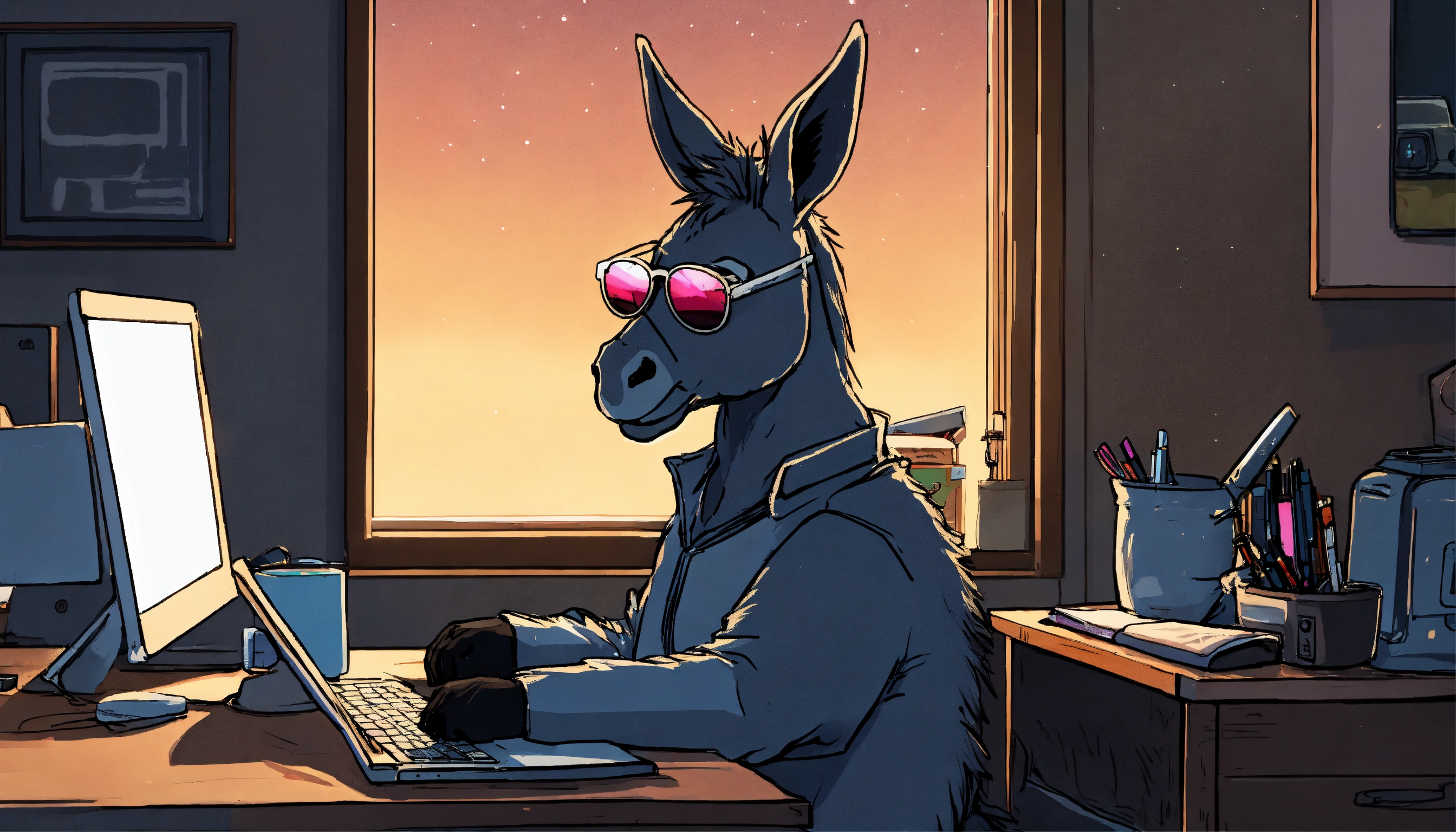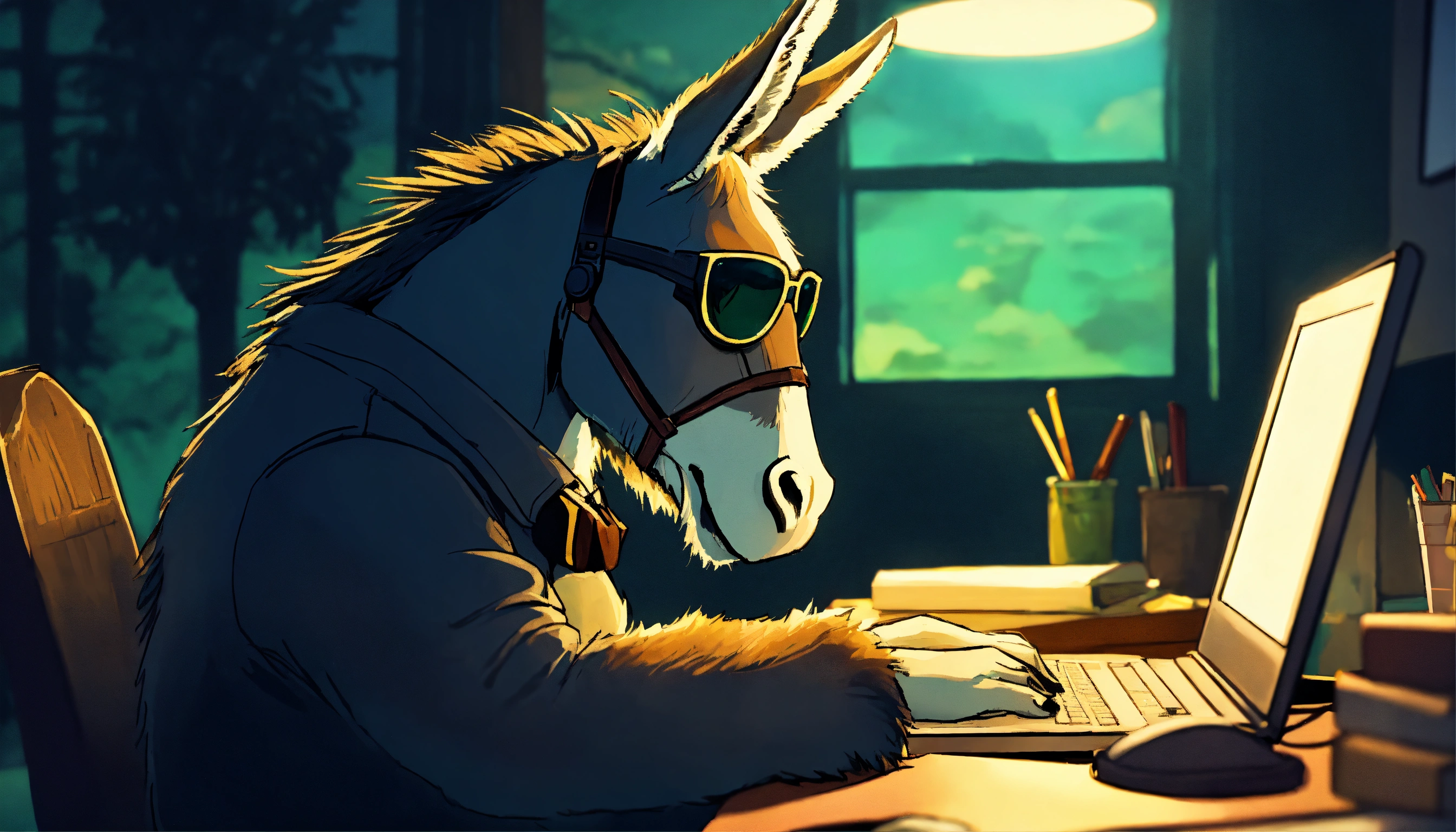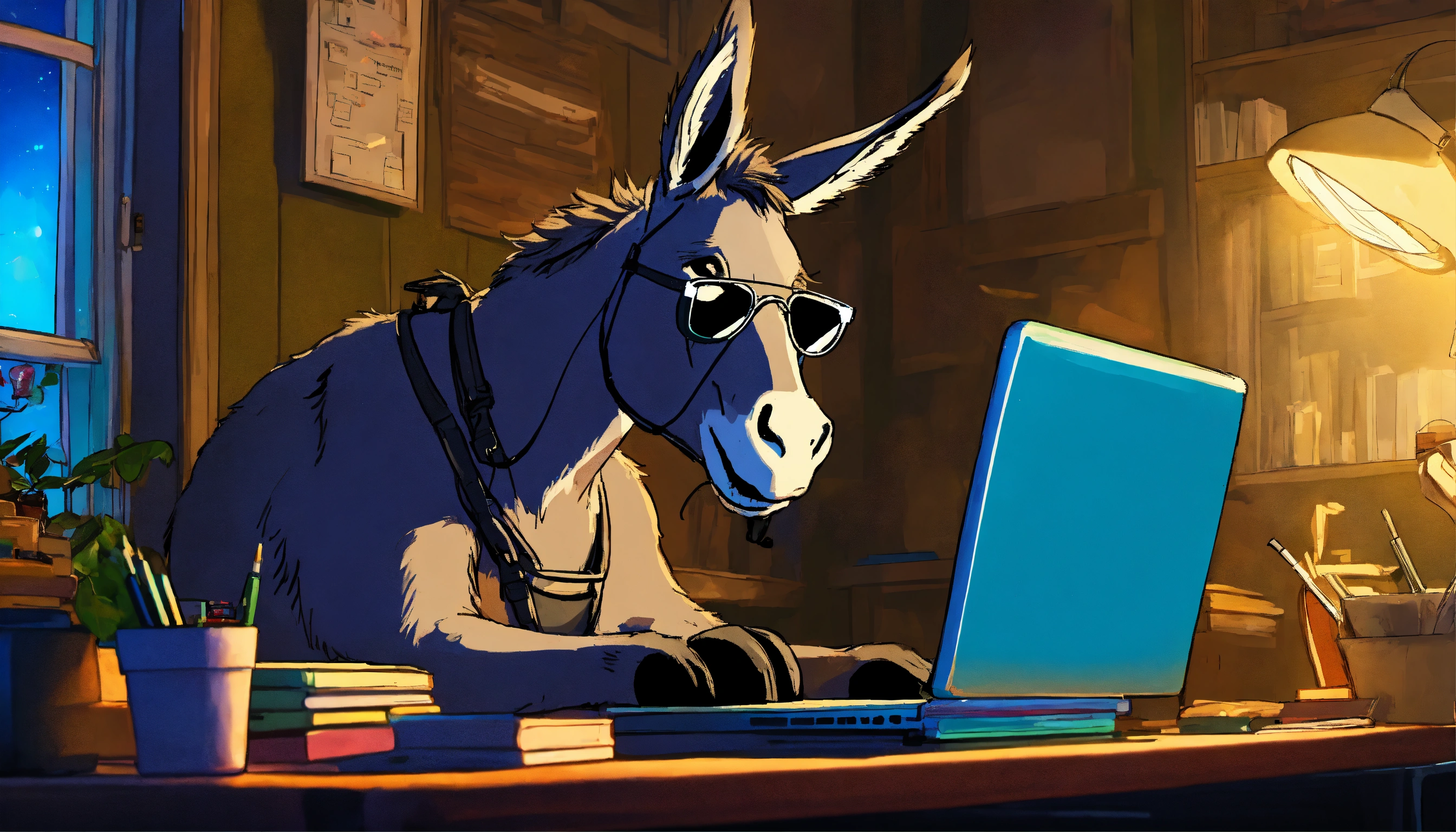 A donkey with sunglasses black, at night, sitting at a desk, frost the laptop computer, studying, seen from the side studio ghibli artstyle cartoon
