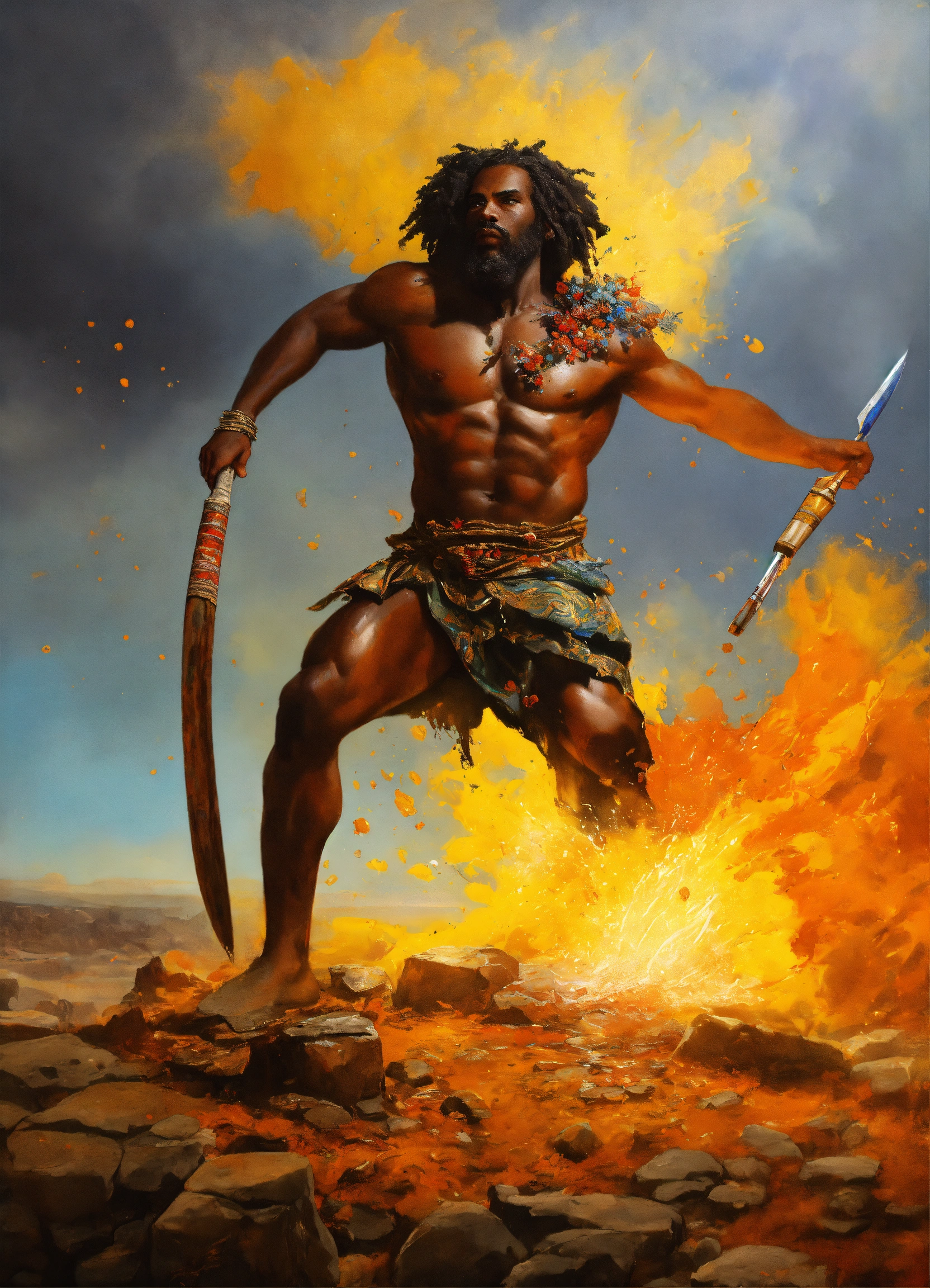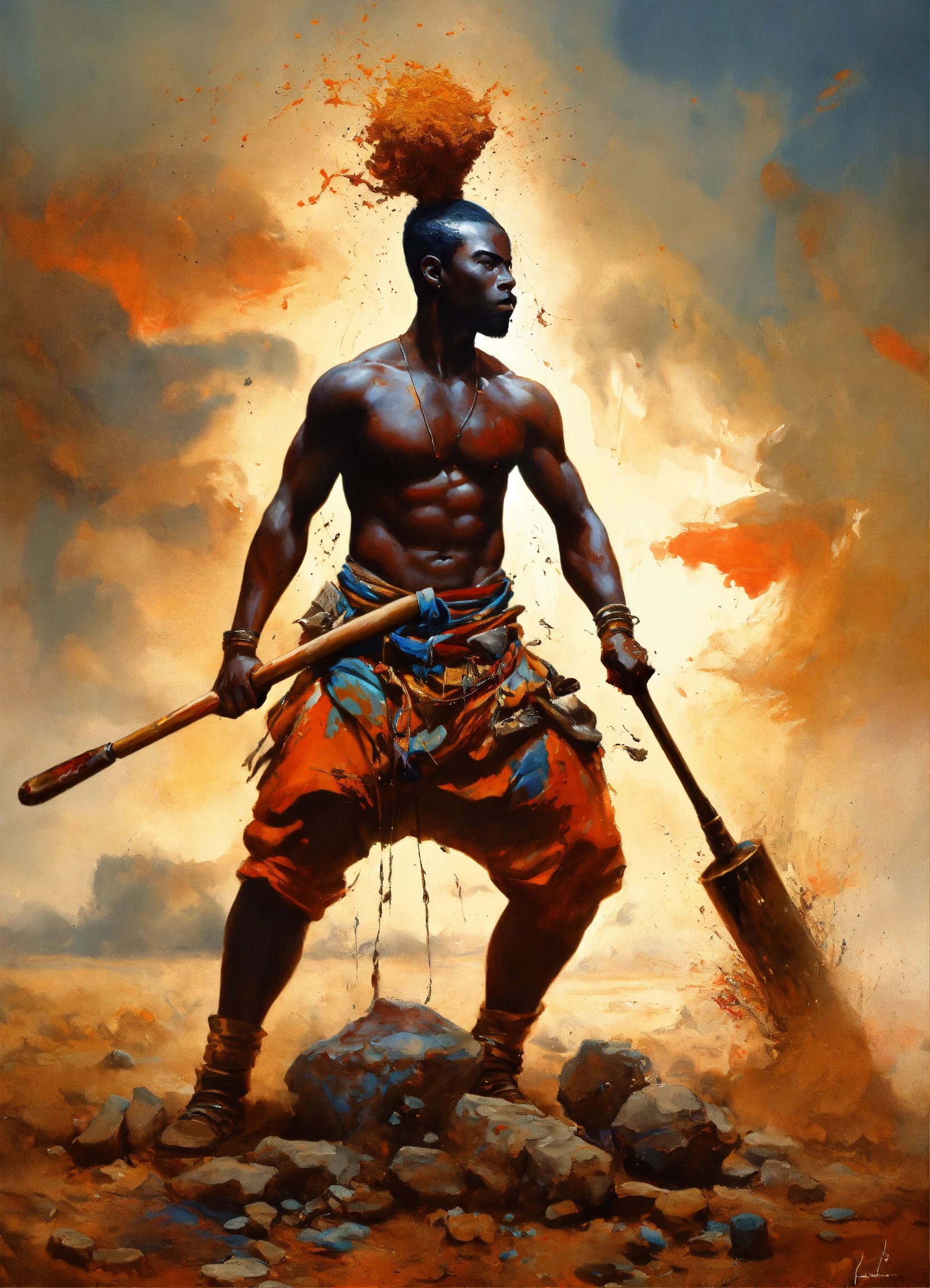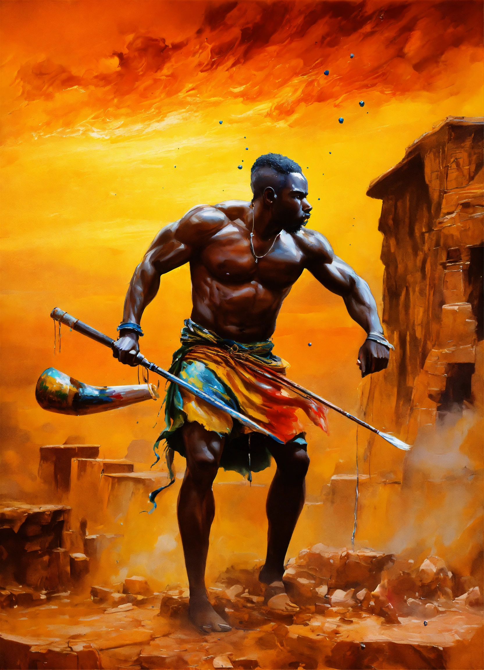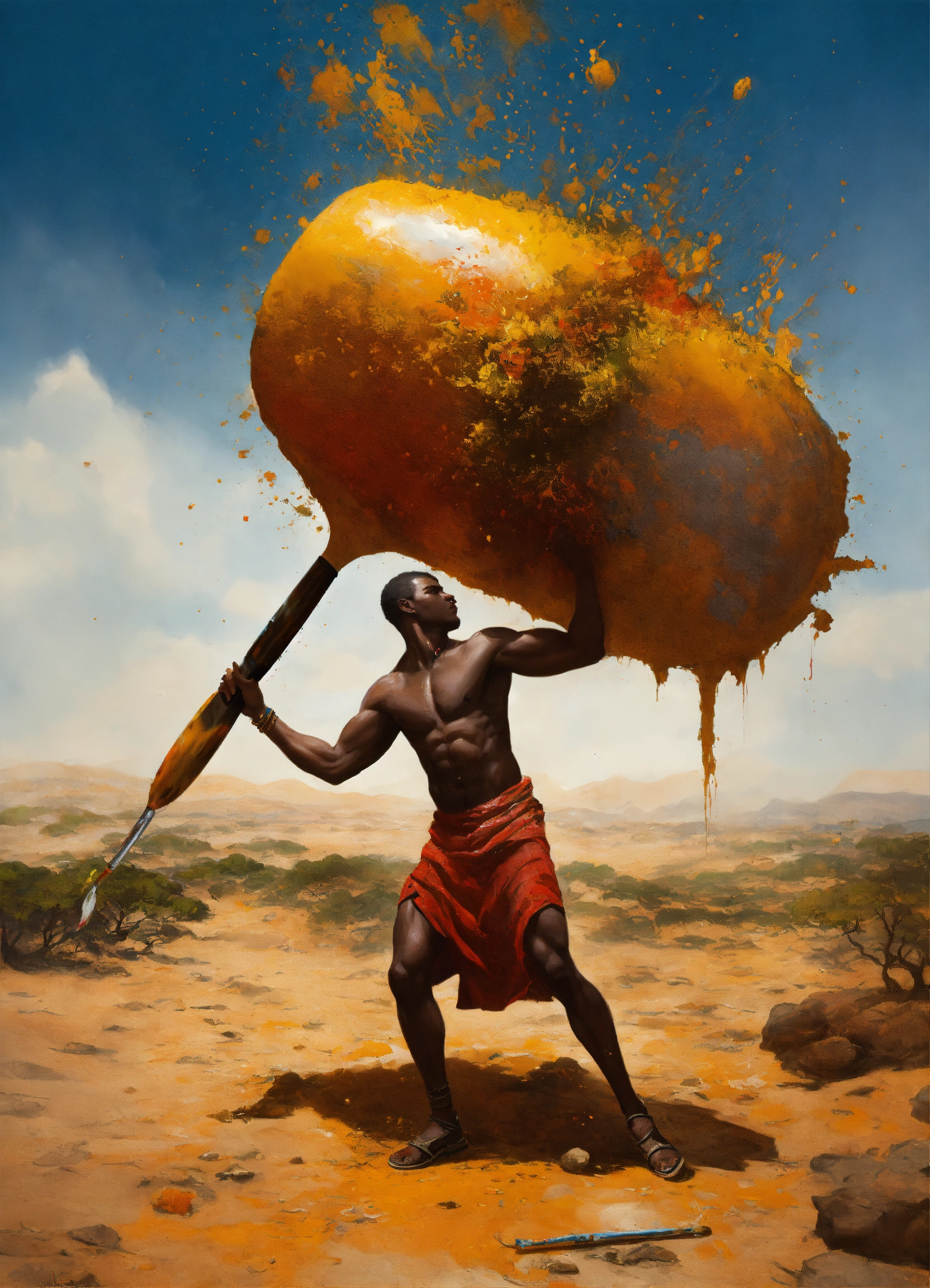 Gladi-art-tor african, a male artist fights against a large paint pot, african modern warrior artist, he carries a large paintbrush as a weapon, beautiful matte realistic painting of a of a fantasy landscape, african sculptor, african sculptor, a man carving wood, surreal enigma, creative, surrealism, imaginative, paint splatter, ripped canvas