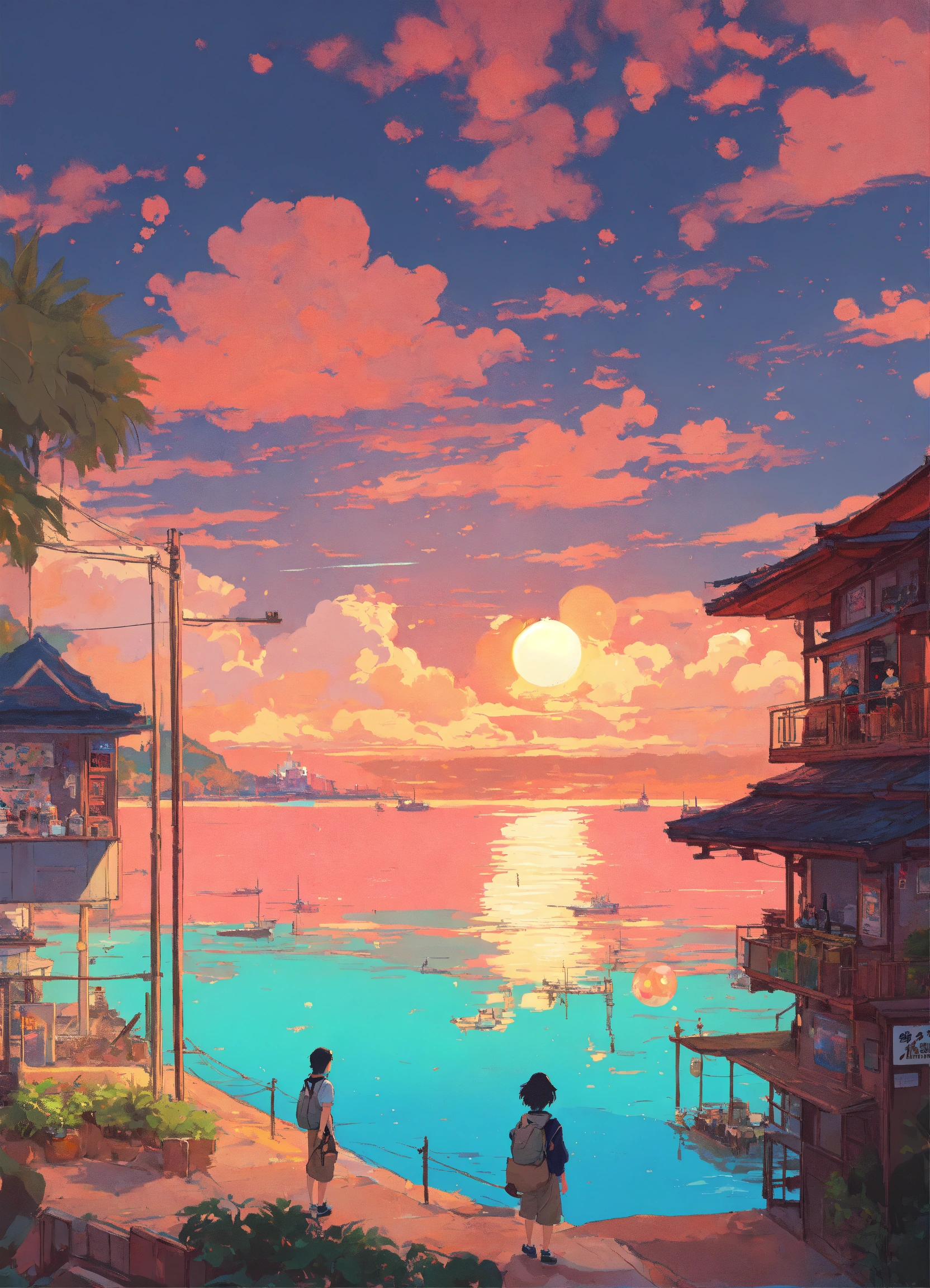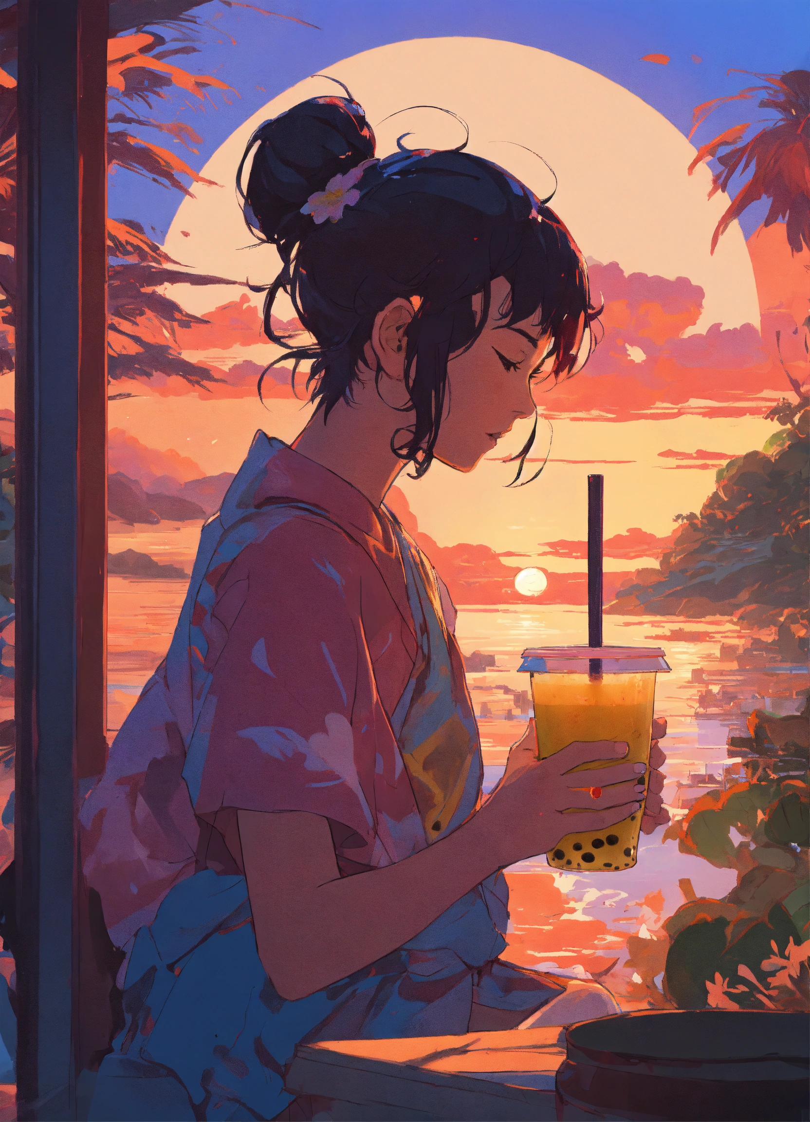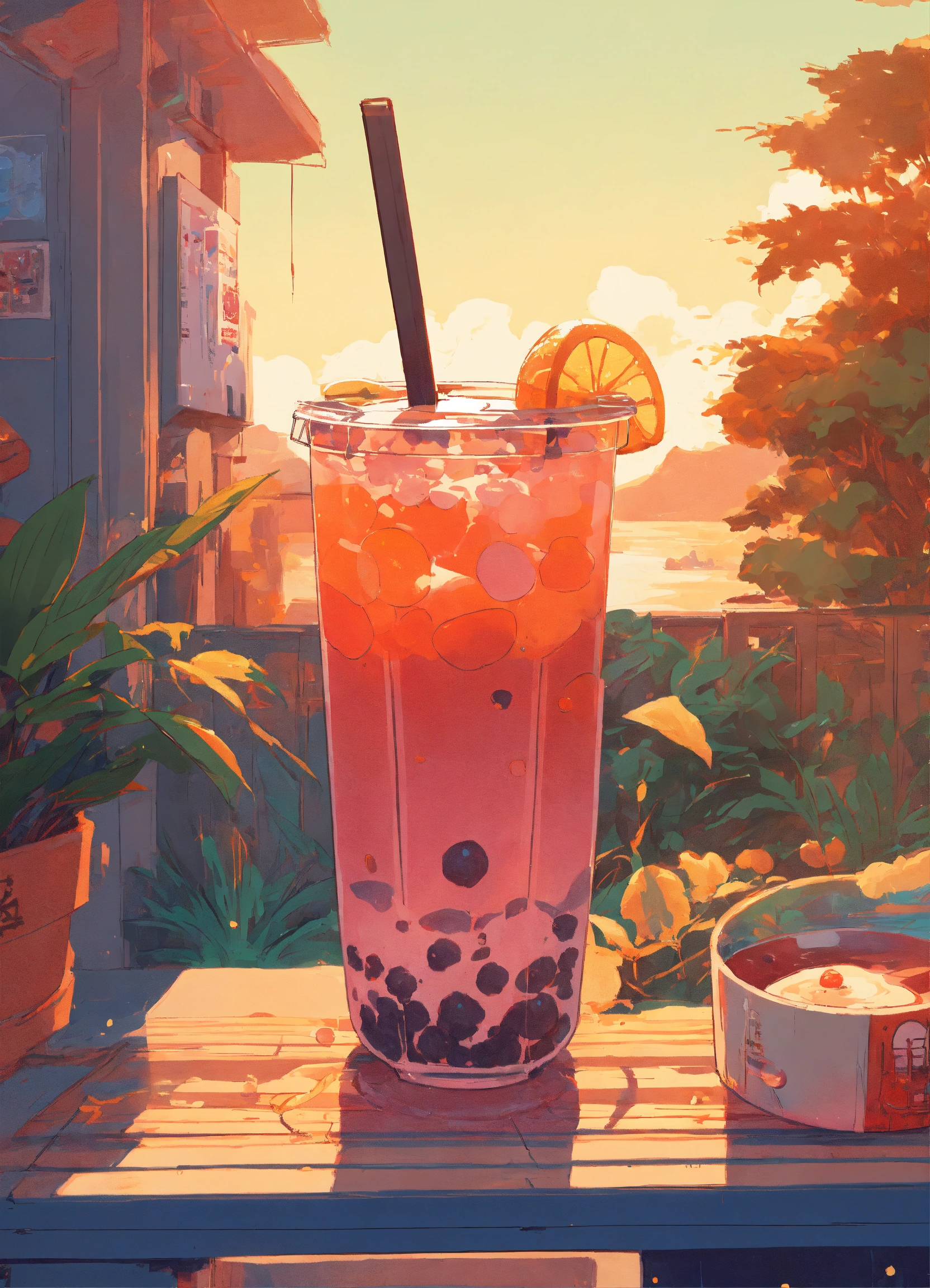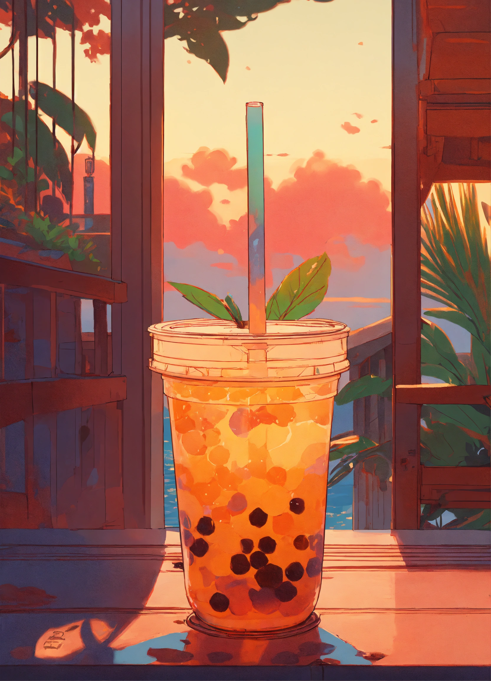 Bubble tea, milk tea, boba, style of laurie greasley, studio ghibli, akira toriyama, james gilleard, sunset, tropics, genshin impact, captivating, trending pixiv fanbox, acrylic palette knife, 4k, vibrant colors, devinart, trending on artstation, low details.