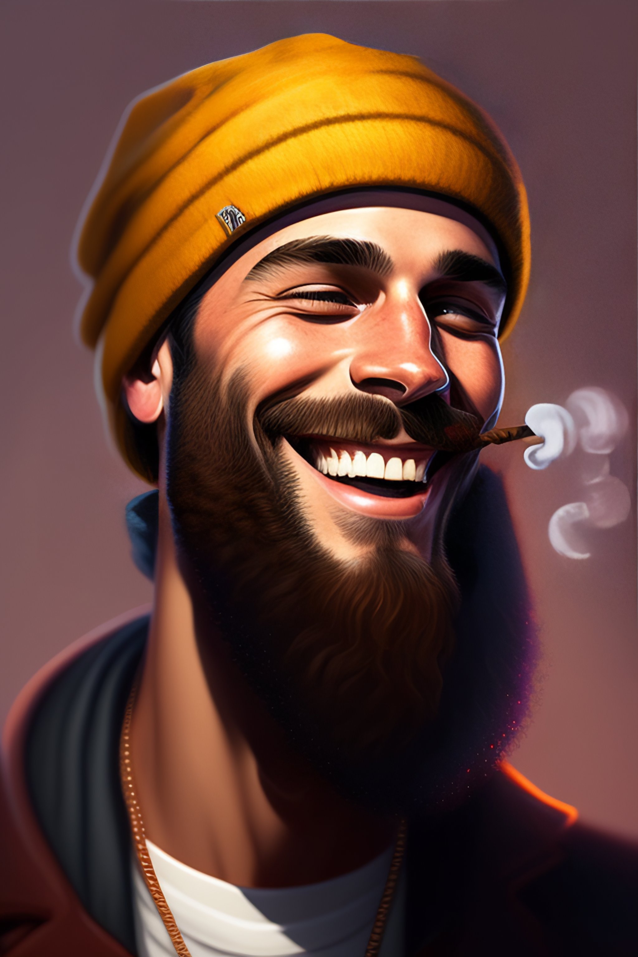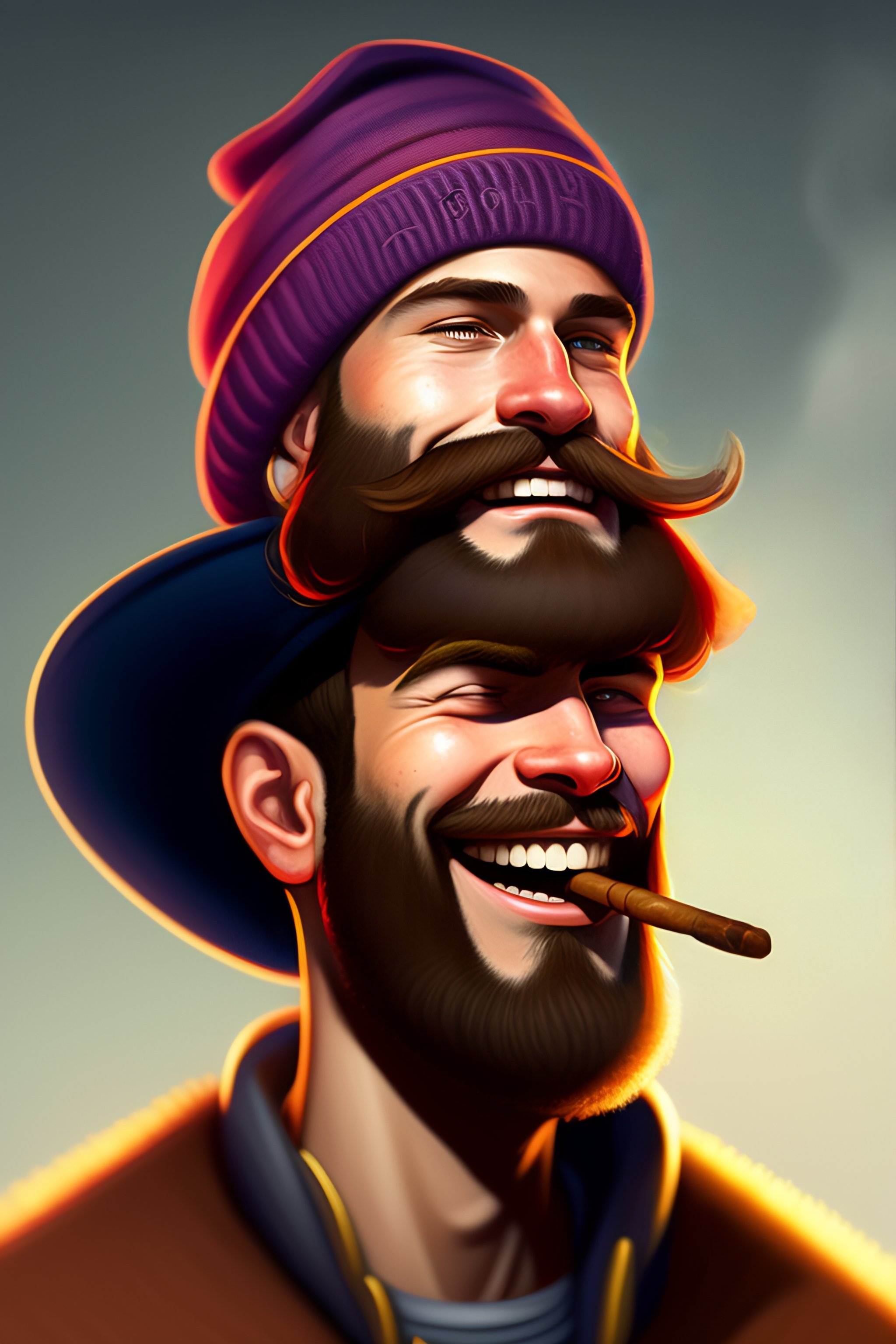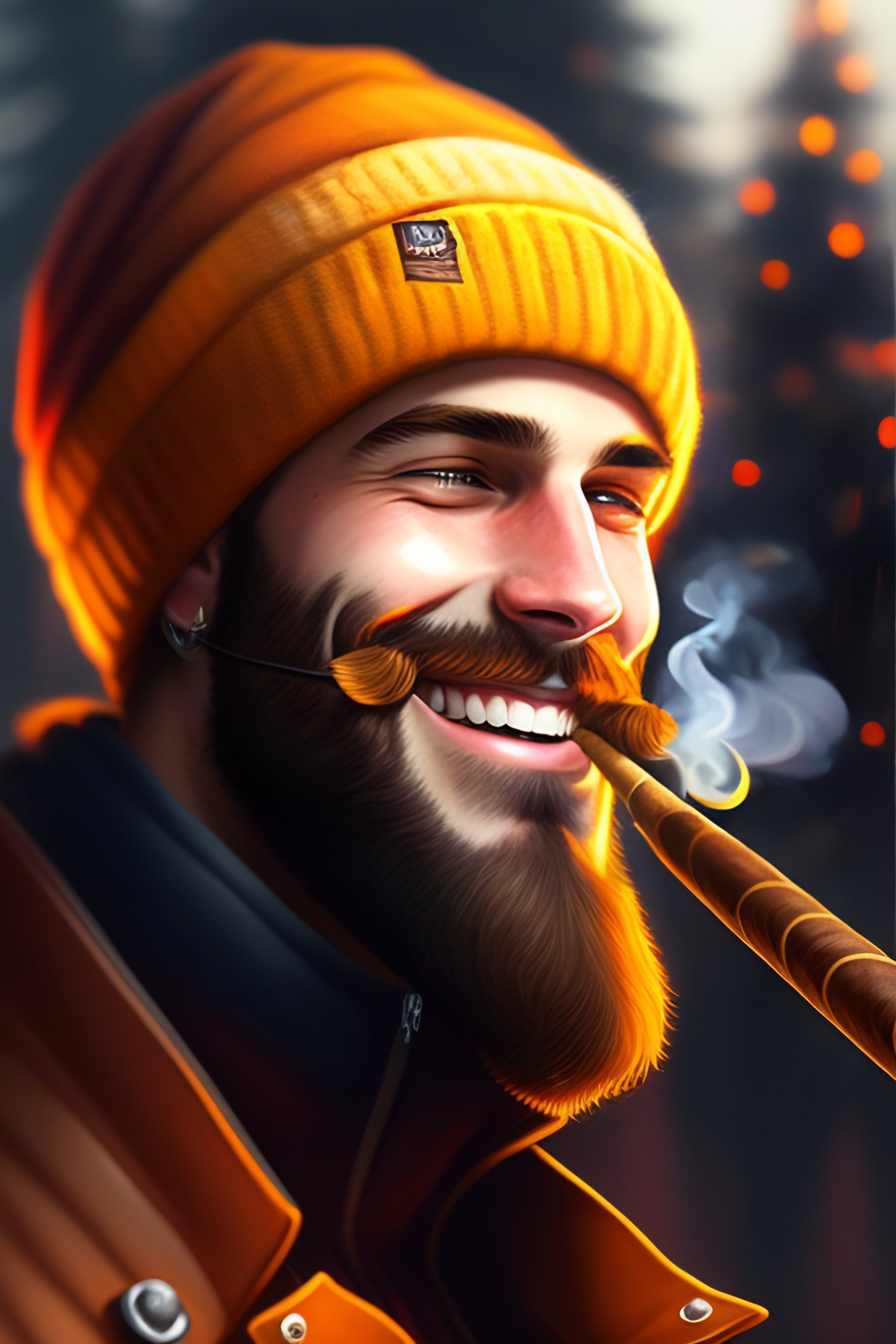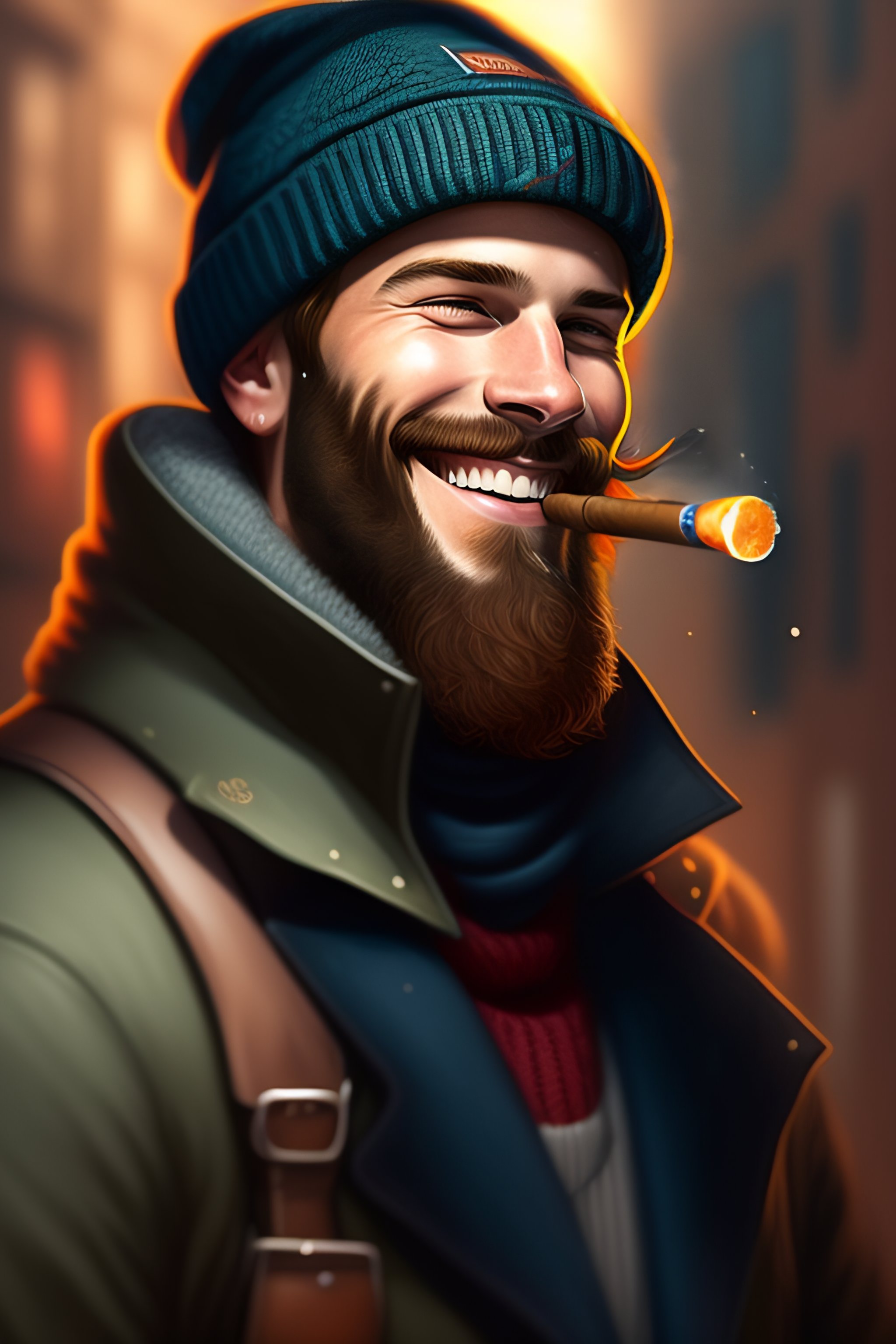Petter stormarem smoking a cigar, beard, with beanie on, smiling, teeth biting cigar, character concept design, painting, detailed, vivid
