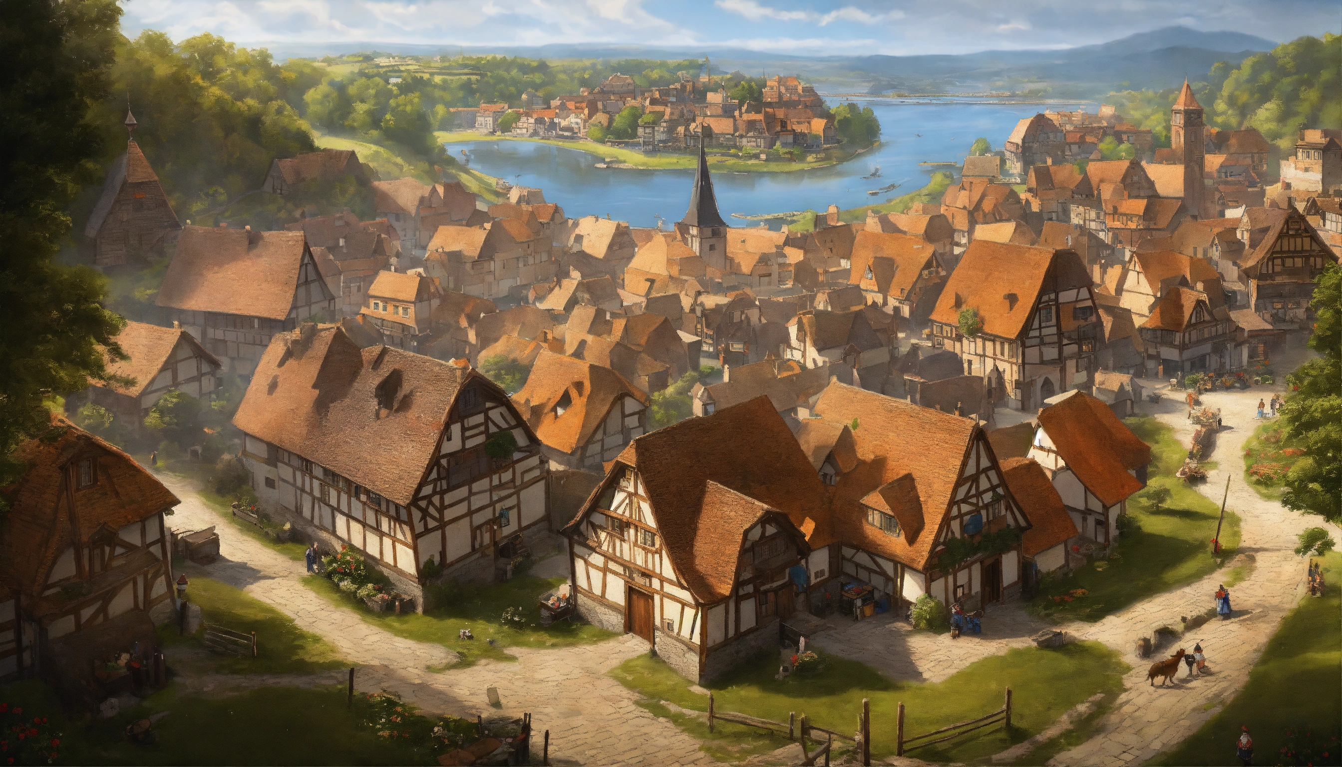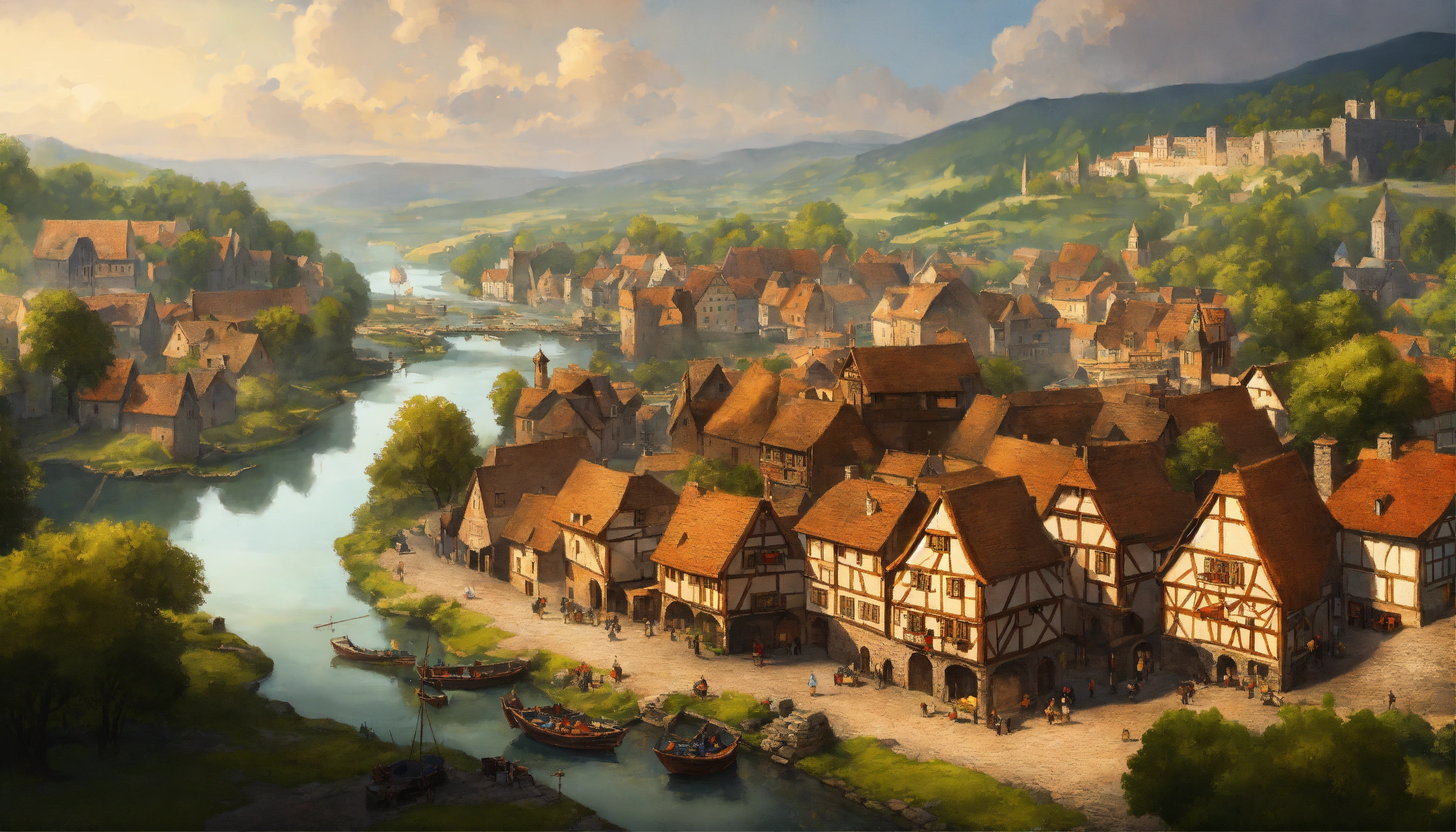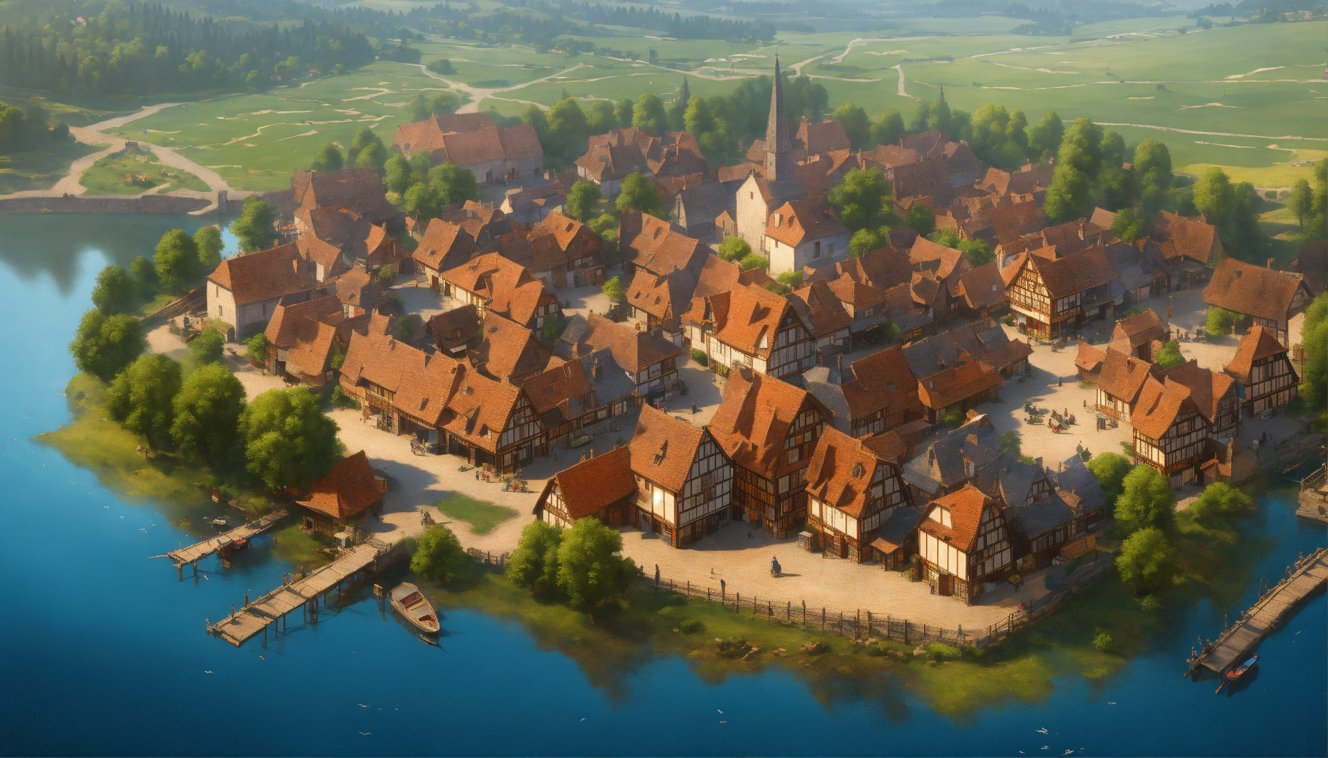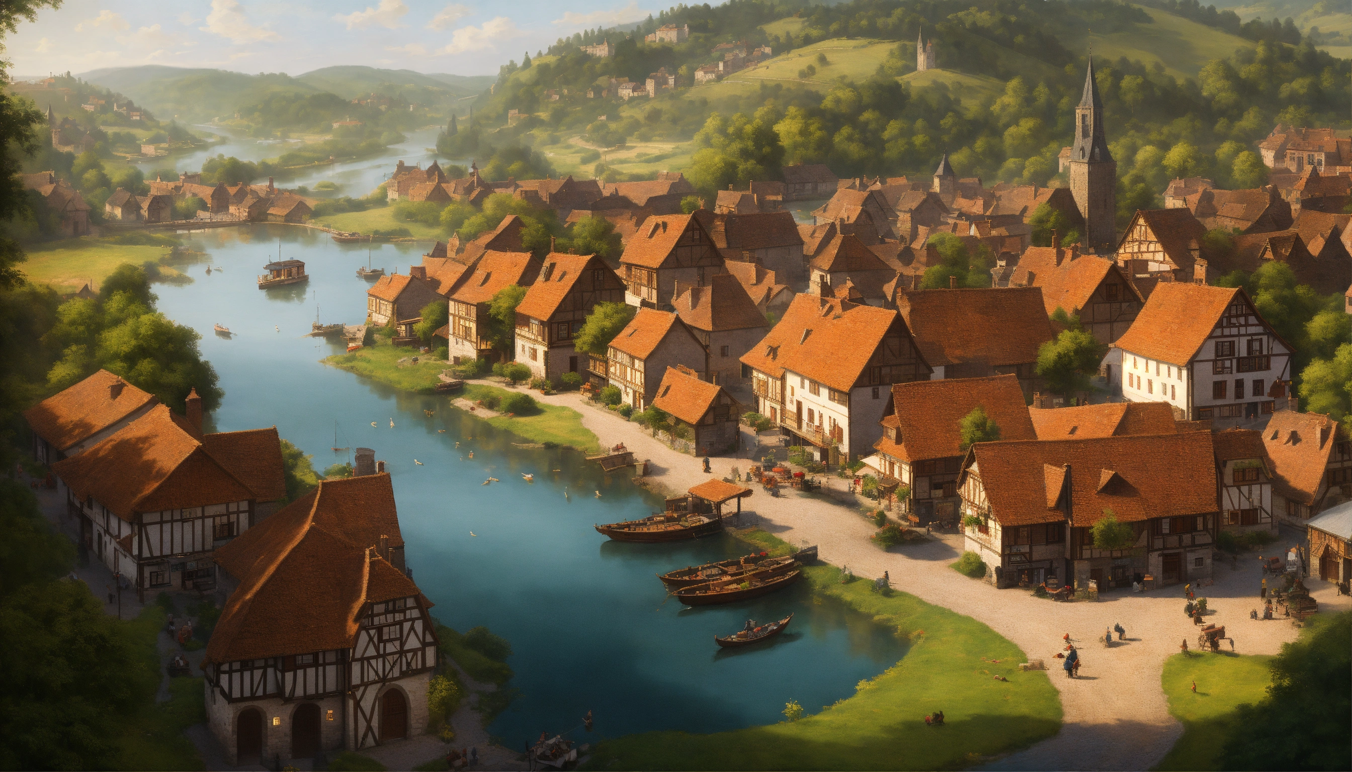 Highly realistic, photography, bird's eye view of a medieval town with 500 inhabitants, one-storey and two-storey wooden houses, half-timbered houses and a few stone houses, no dense building, large open market square in the town center, fortified small jetty with drift, a river in front of the town, a trade route runs through the town, individual farms and homesteads lie around the town, densely wooded rolling hills behind the town, highly detailed, oil painting, ornamented, in the style of nicolas poussin, sharp contours, detailed, morning light, 8k, fantasy