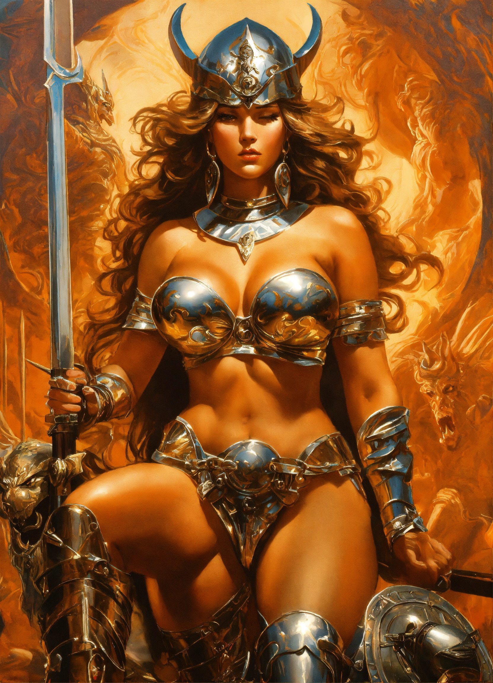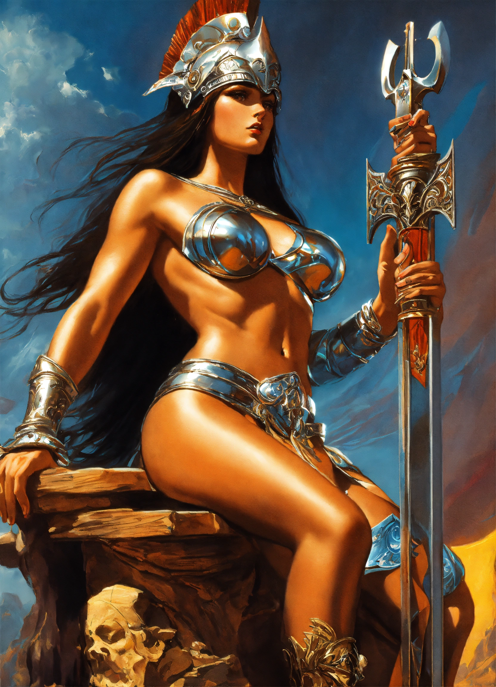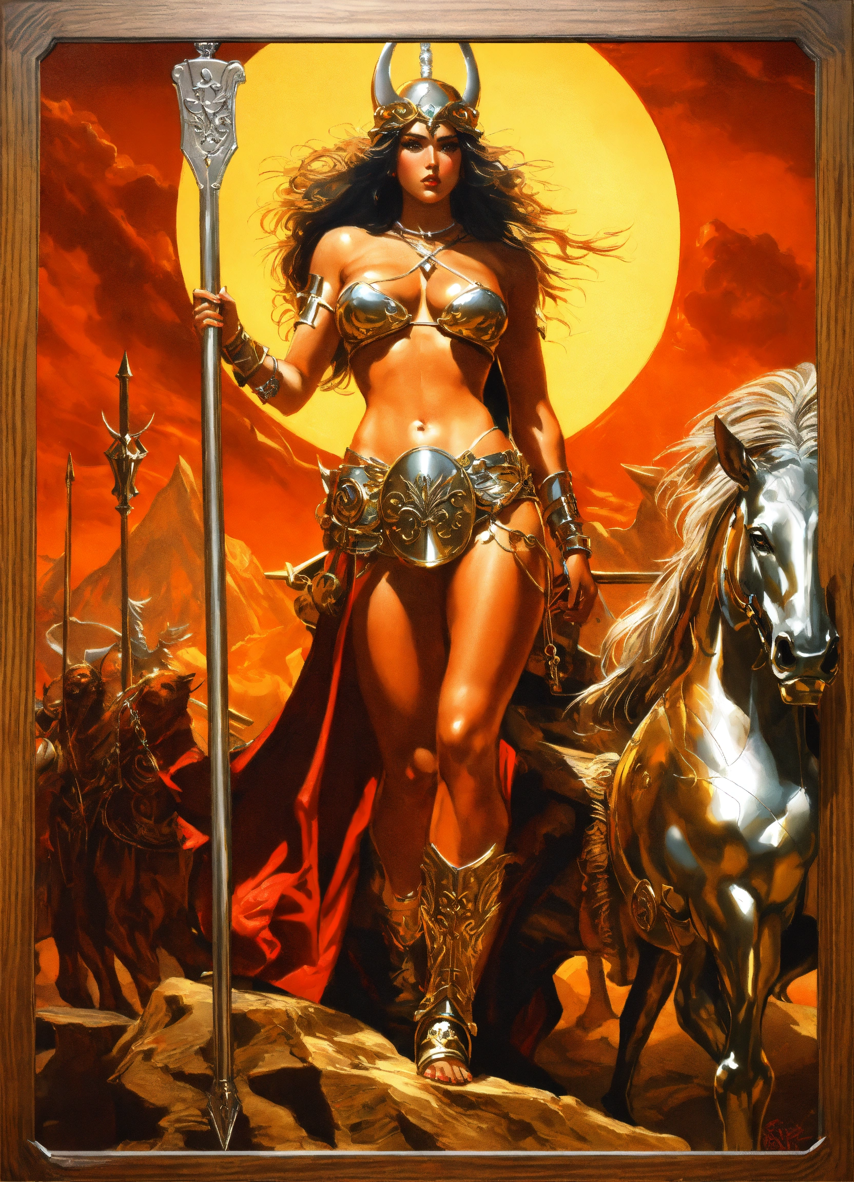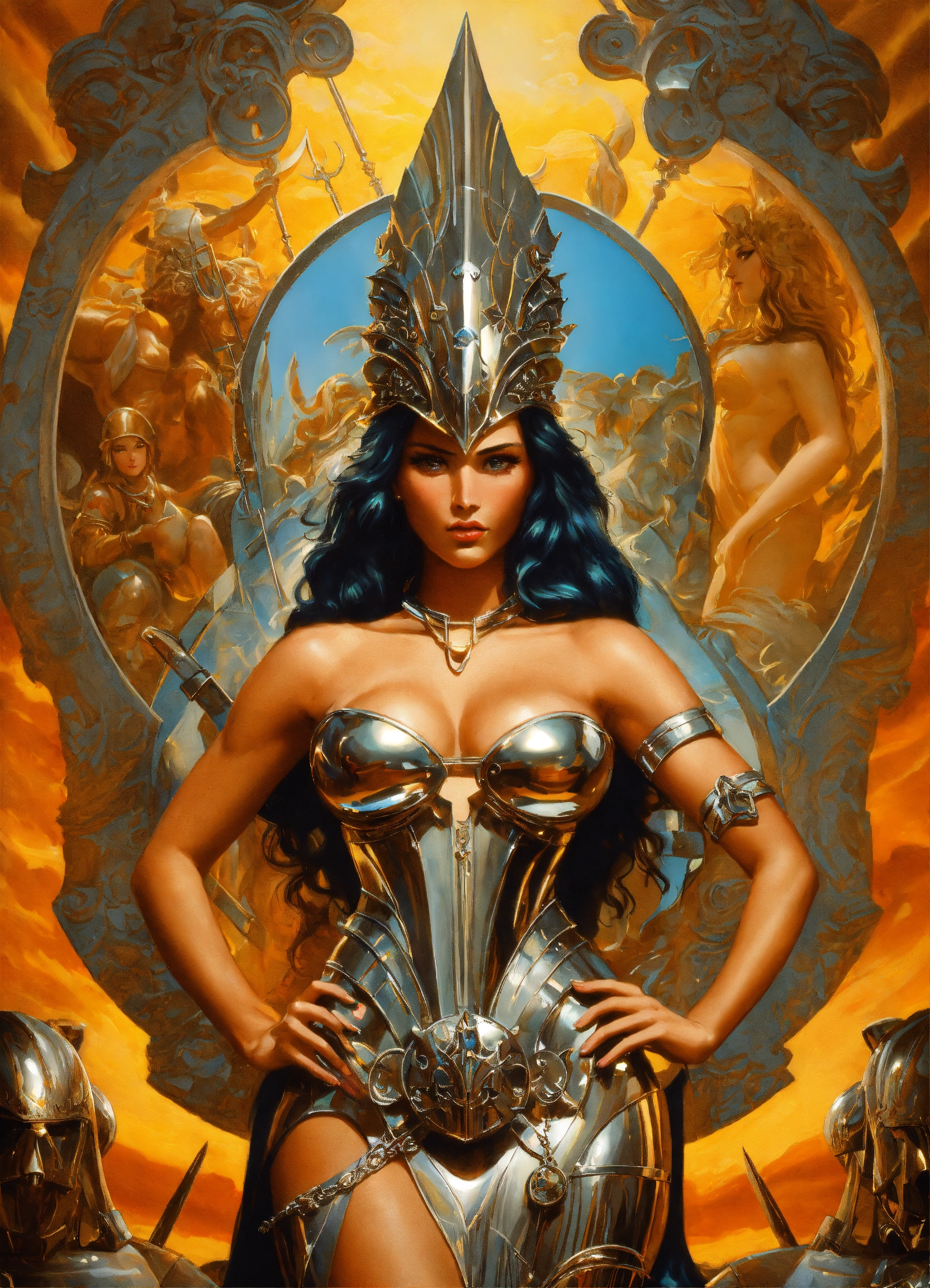 Chrome texture, amazing tarot card featuring a barbarian goddess of war, futurism, by "boris vallejo", with a carved wooden sculpture creating a vivid image of a beautiful woman. an authentic conceptual and careful depiction, inferring a perfect visual representation of an old-school rpg fine art representation of an alluring female divinity.