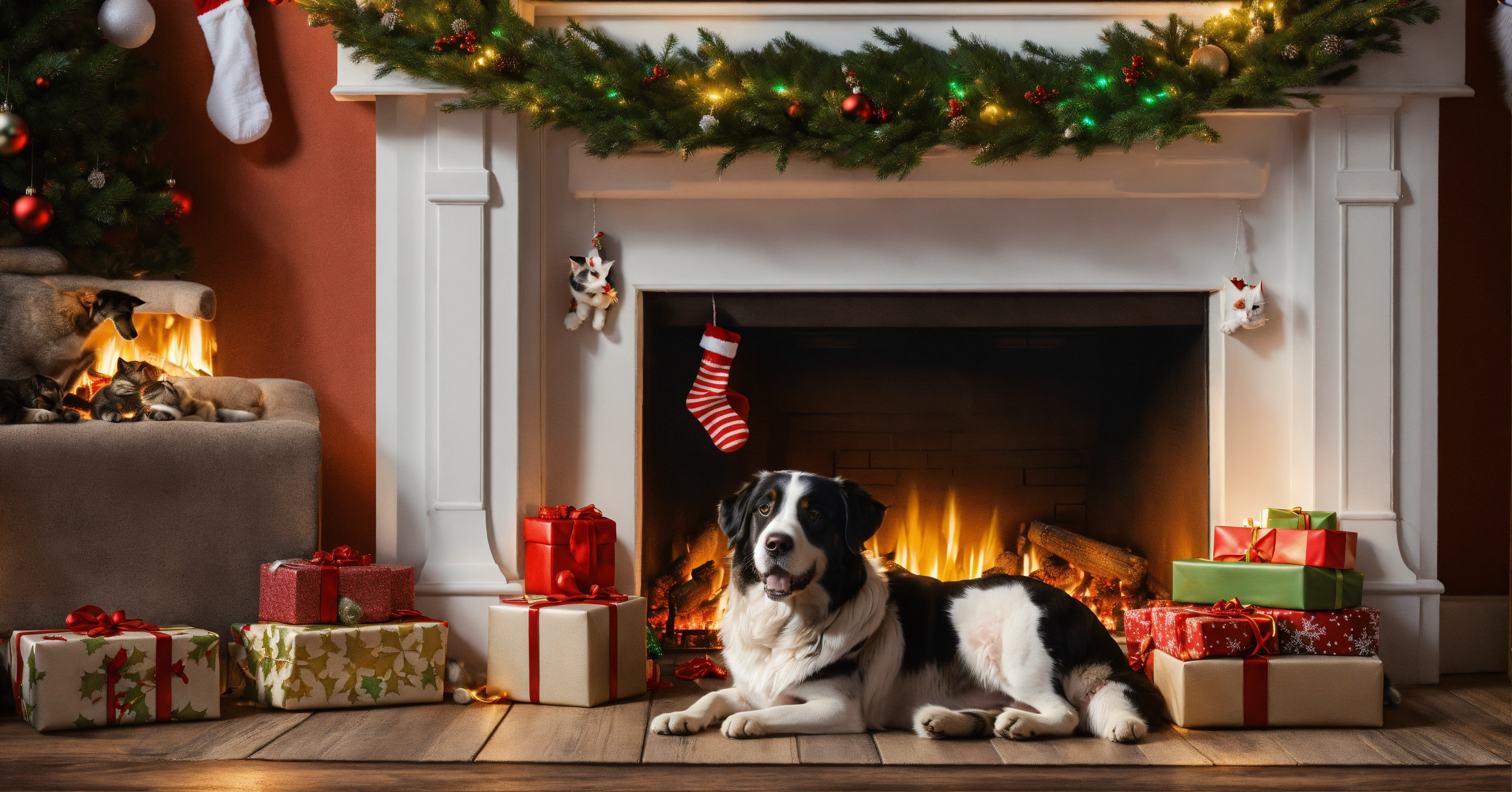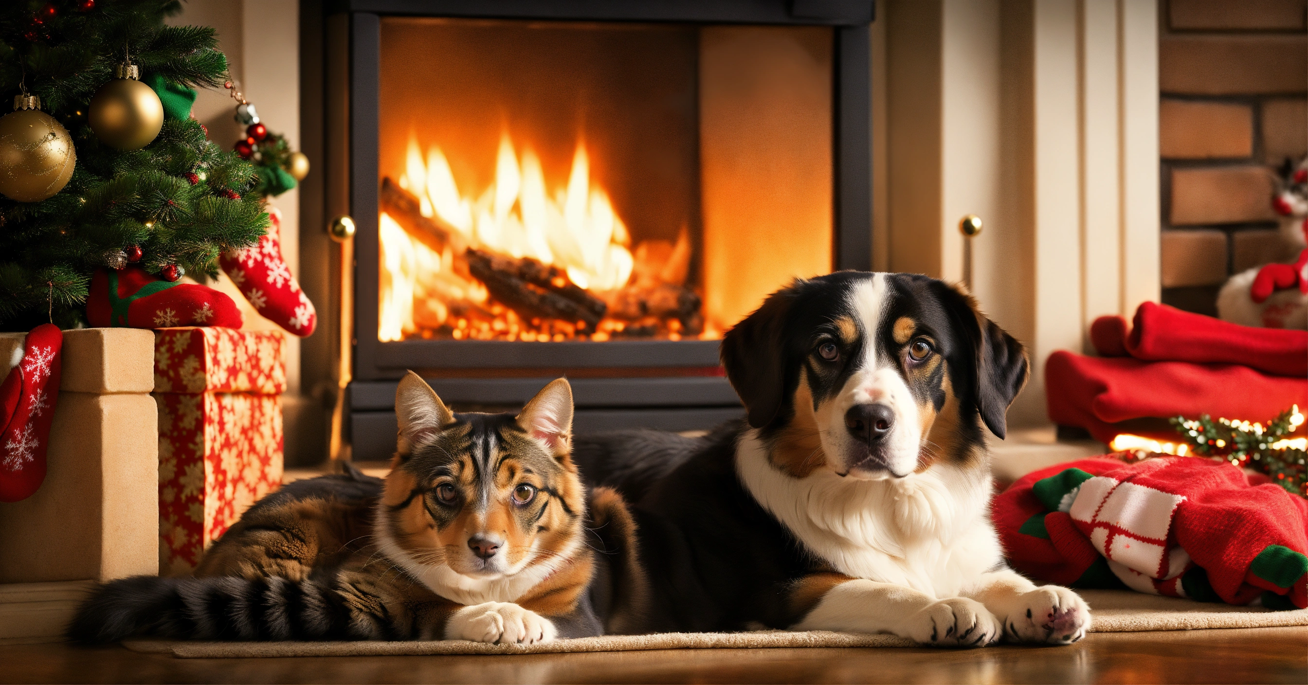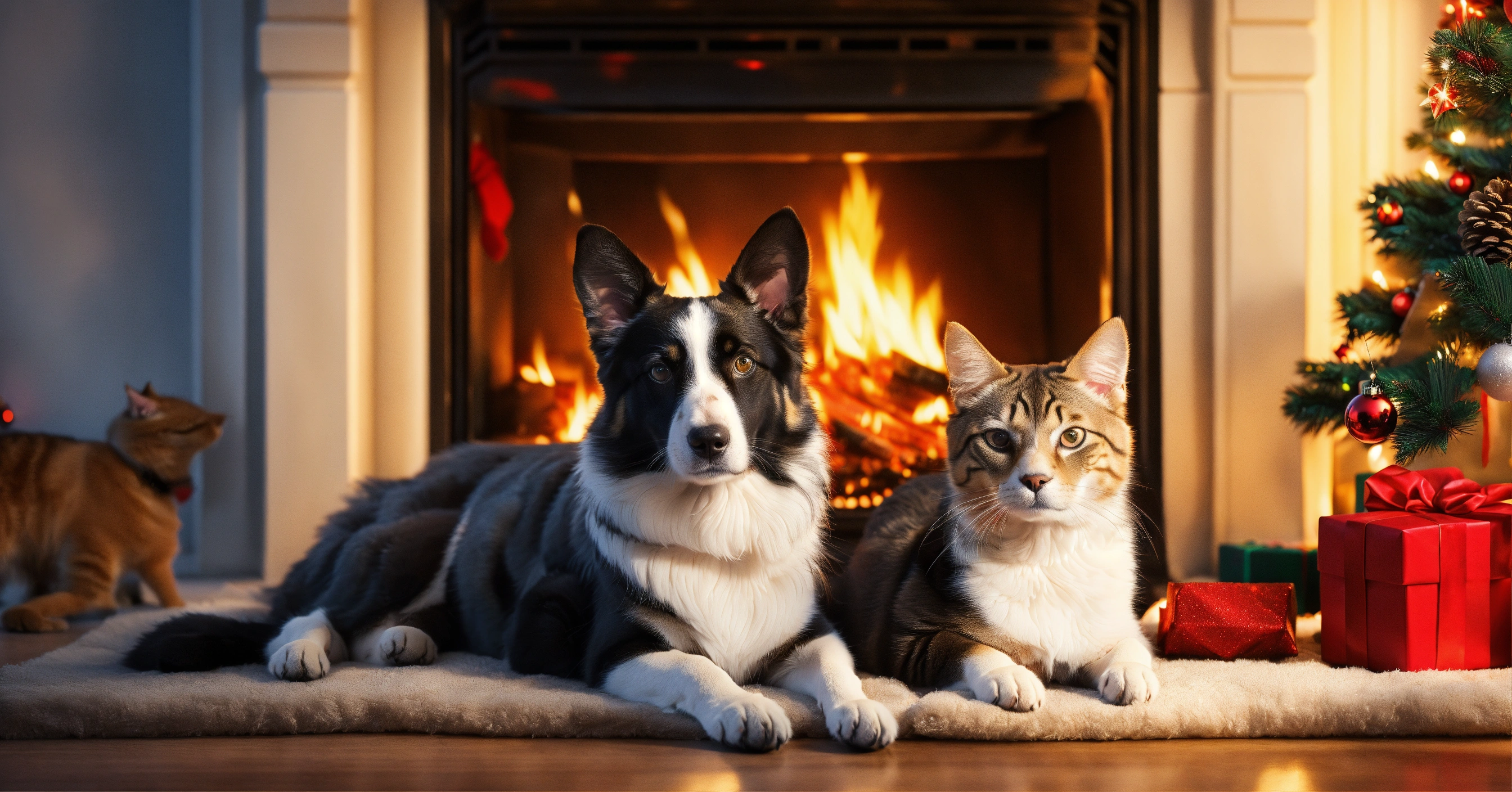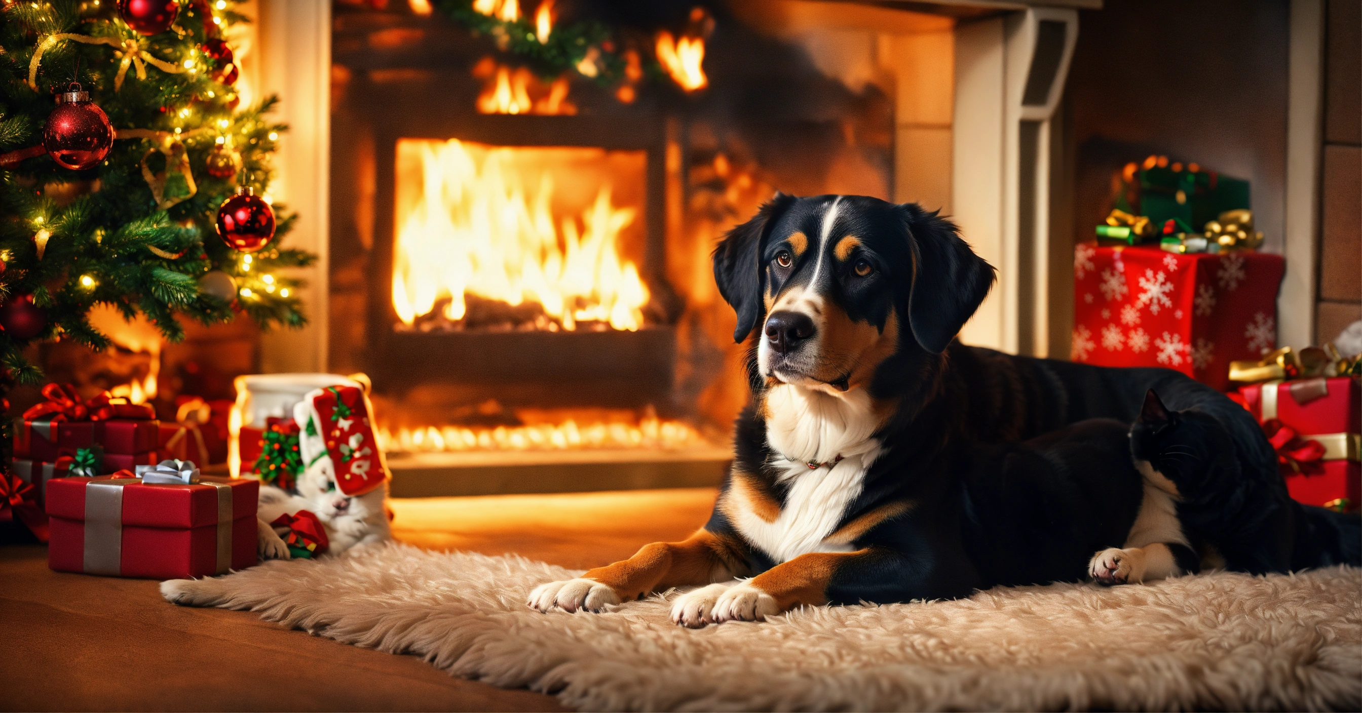Create an a photo realistic image of a dog and a cat lying together next to a fireplace with christmas socks, on the side you can see a christmas tree, the ambience is warm and cosy, resolution 300dpi
