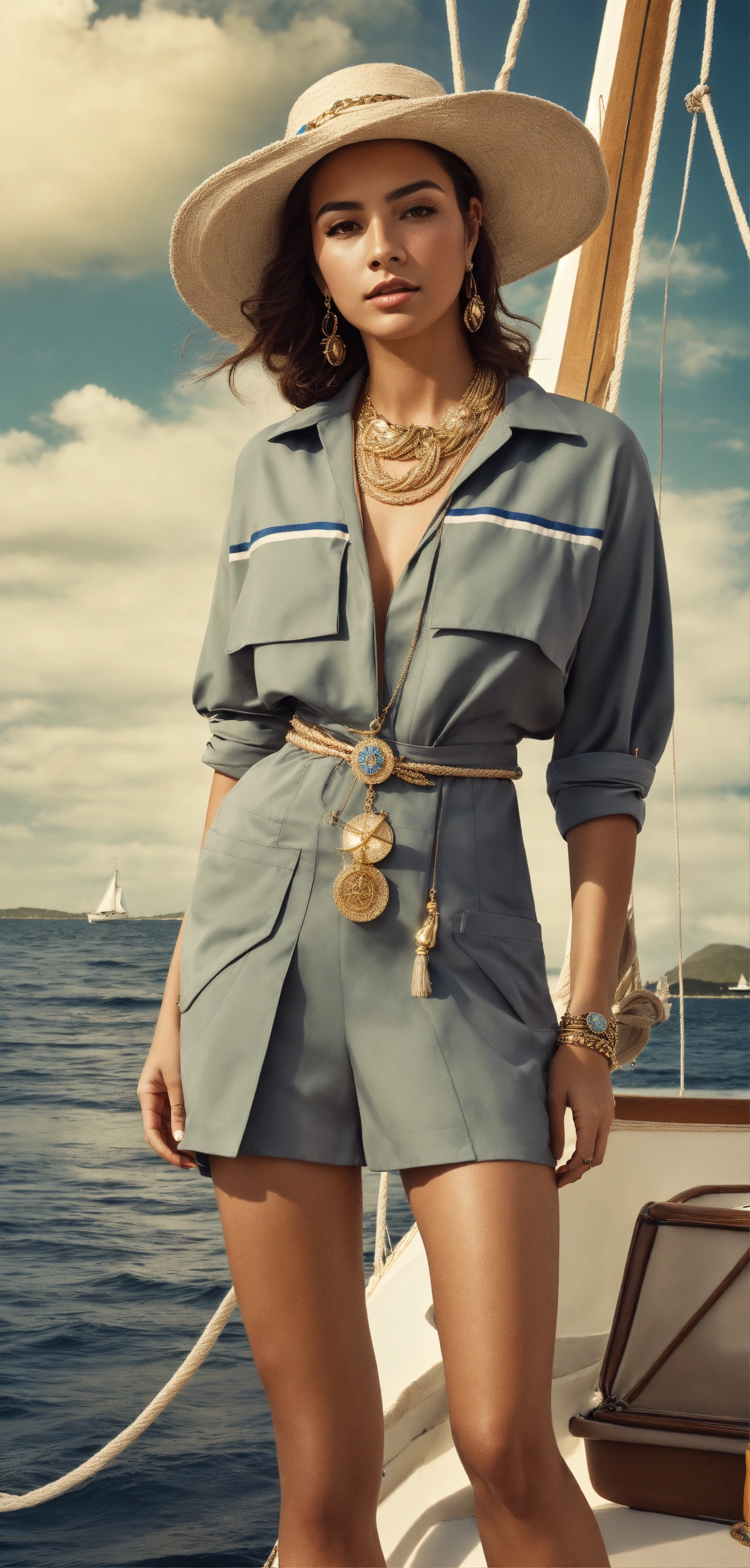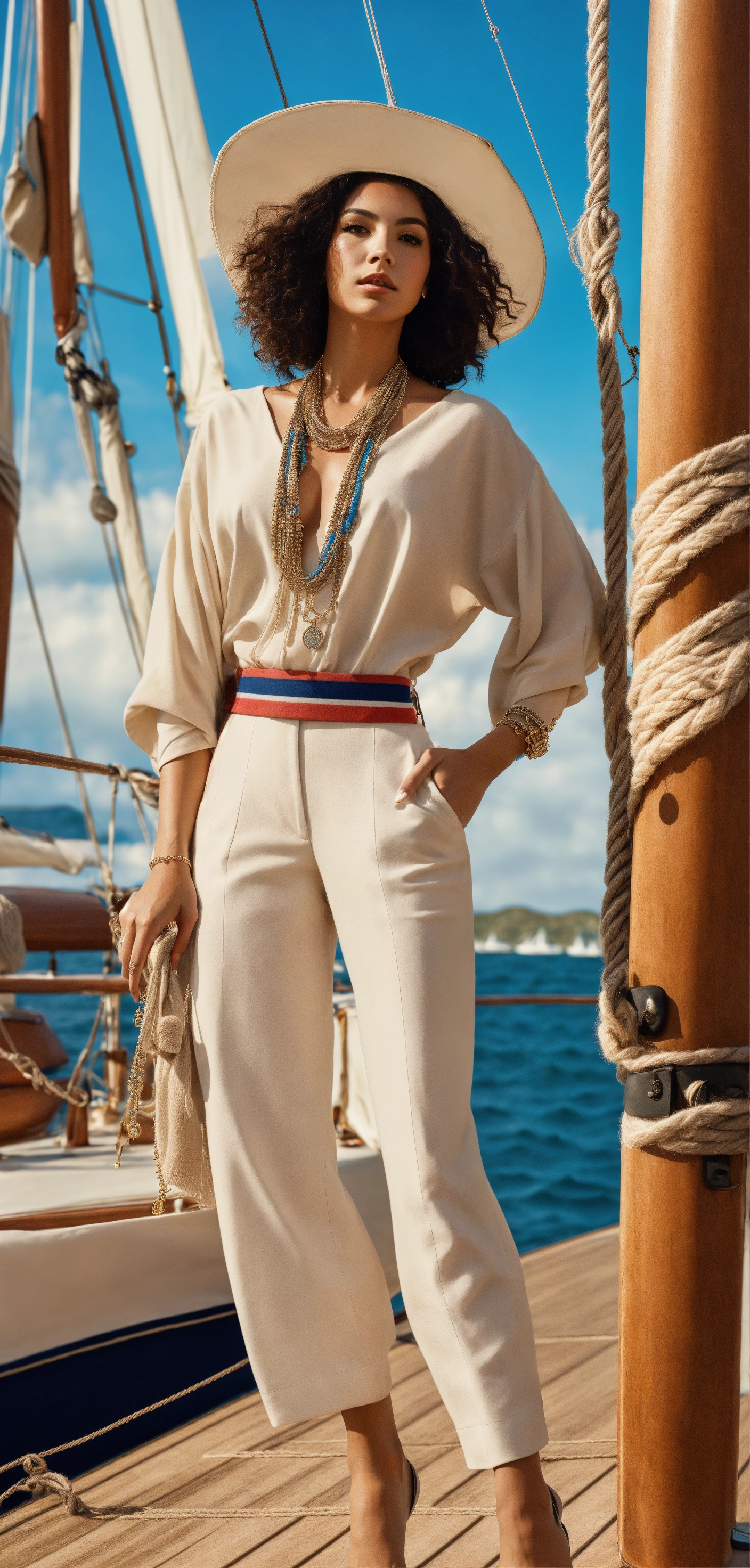 Ultra realistic full body photo of a latin female model wearing modern dolman sleeve nautical inspired outfit with jewelry abroad accessories artistically staged on a board of a sailboat in a sunny windy day, heavily muted saturation, added contrast, interesting angles and perspectives