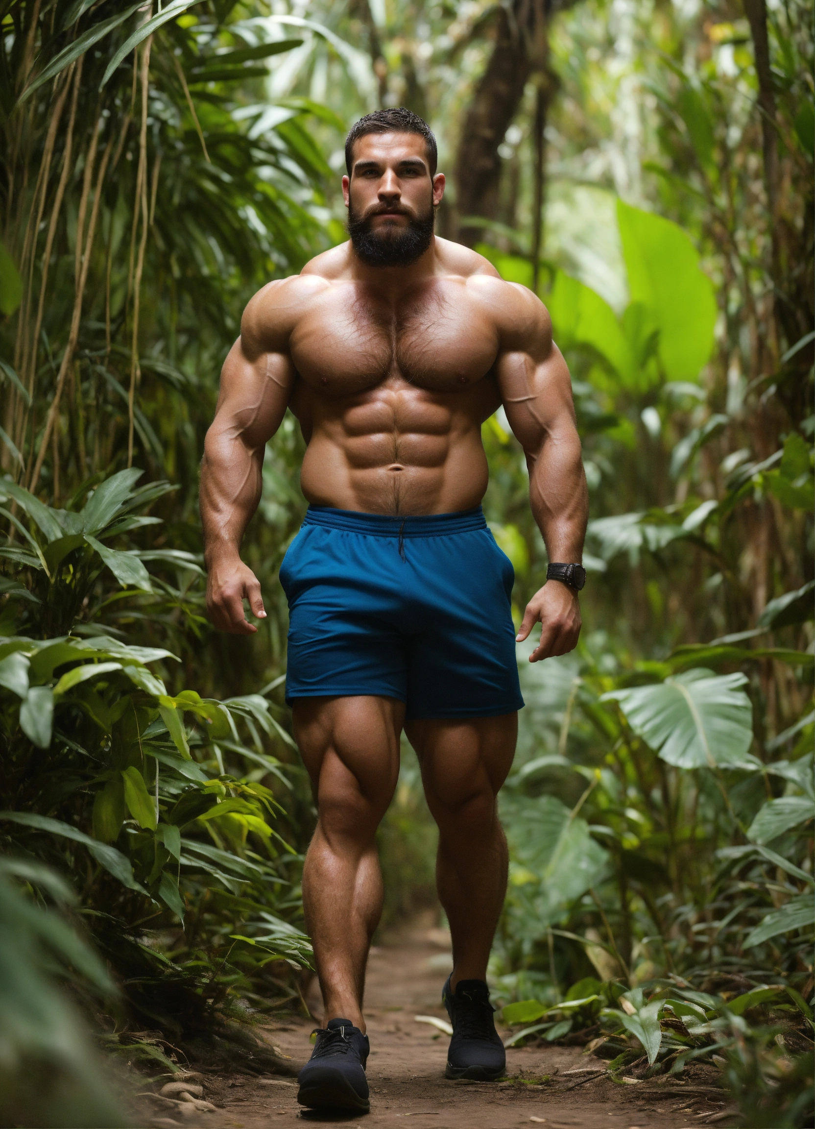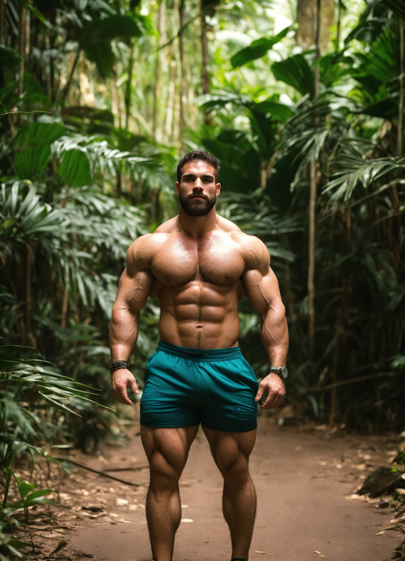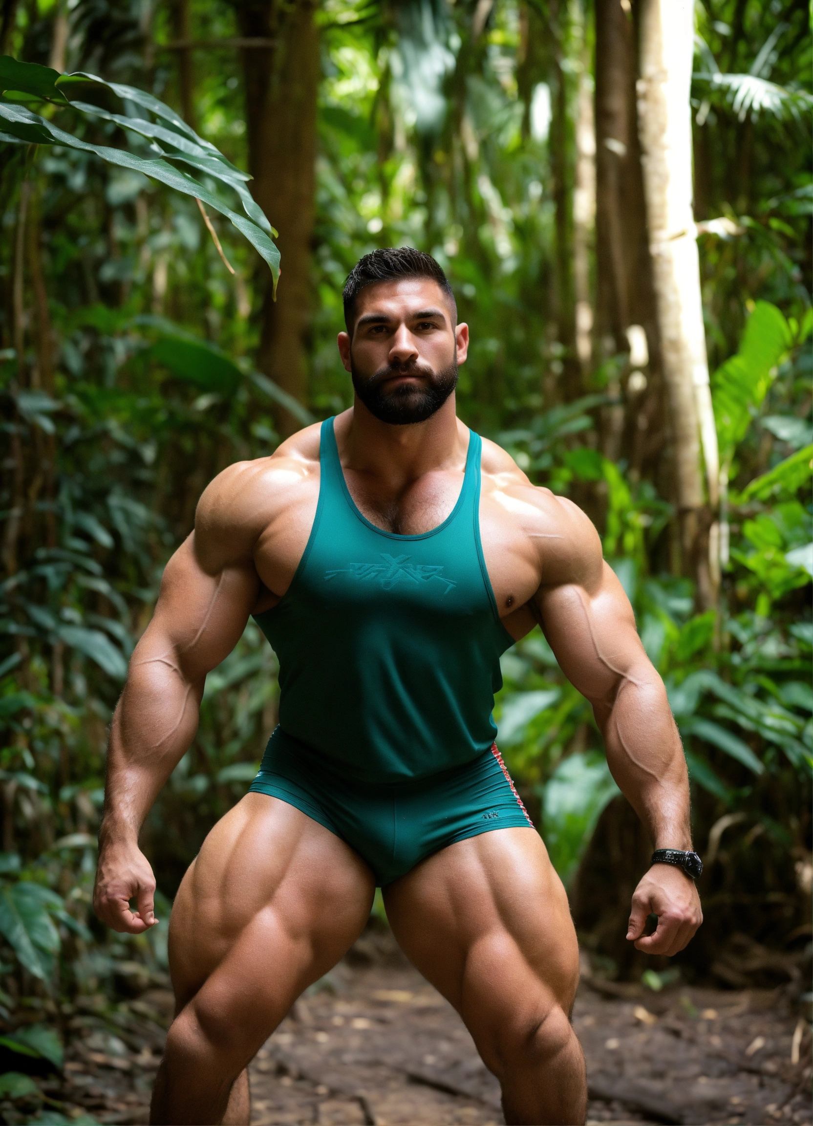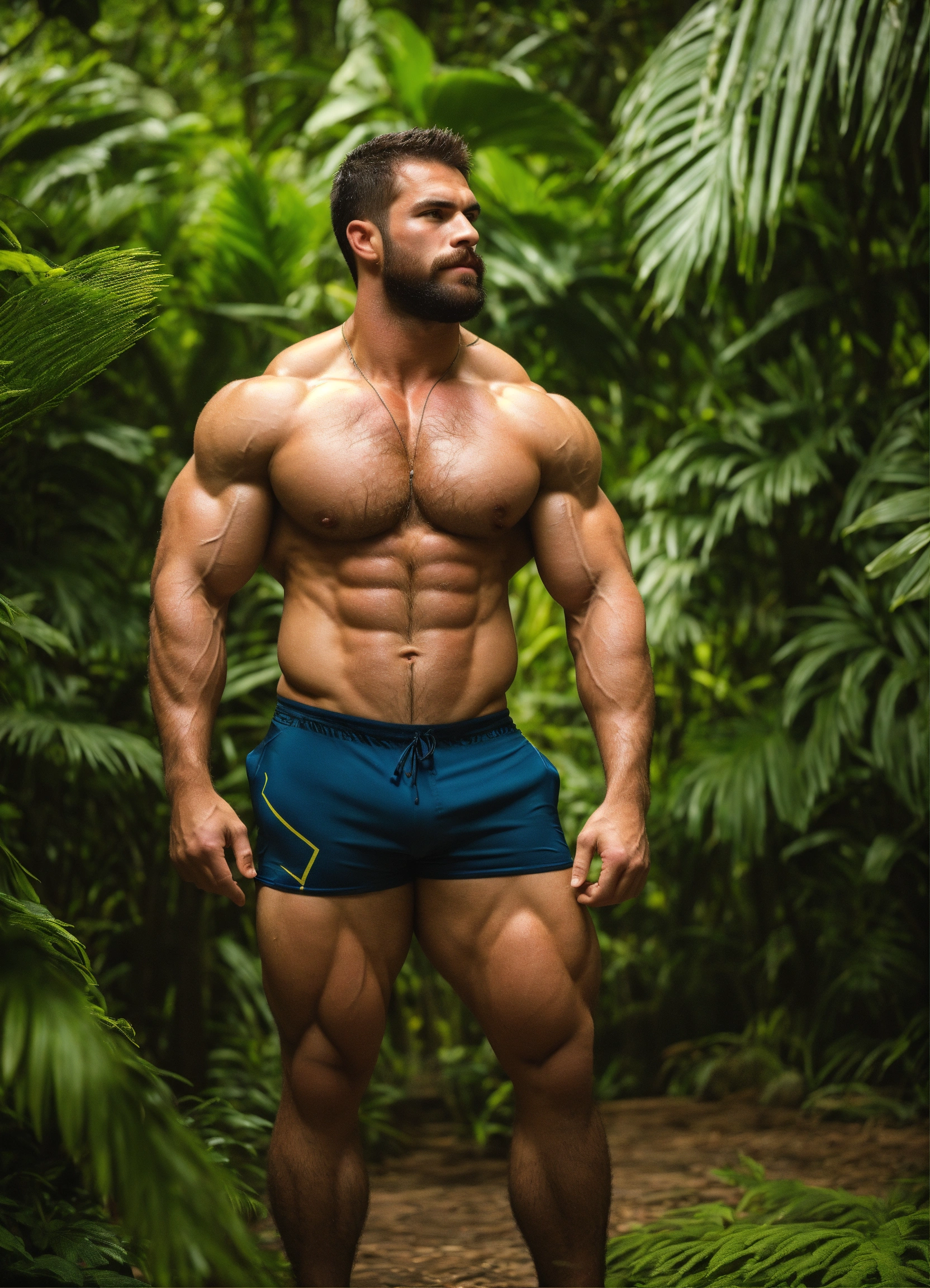 30-year-old man with big muscles, big bodybuilder, brazilian, hairy torso, hairy arms, hairy legs, body like a wrestler, in a jungle