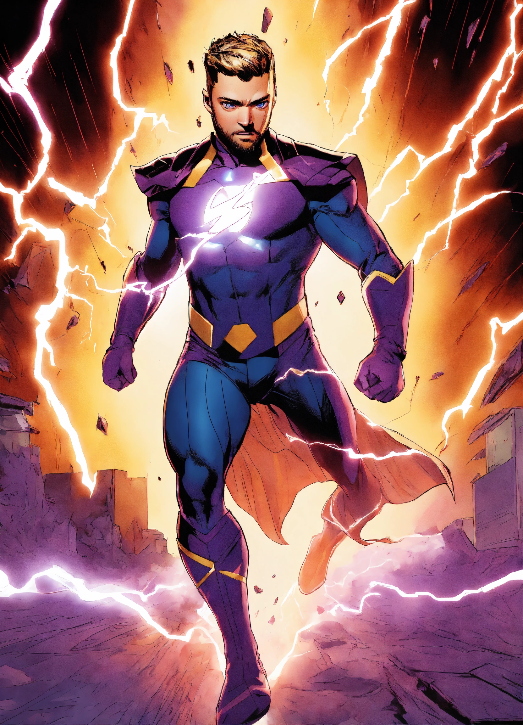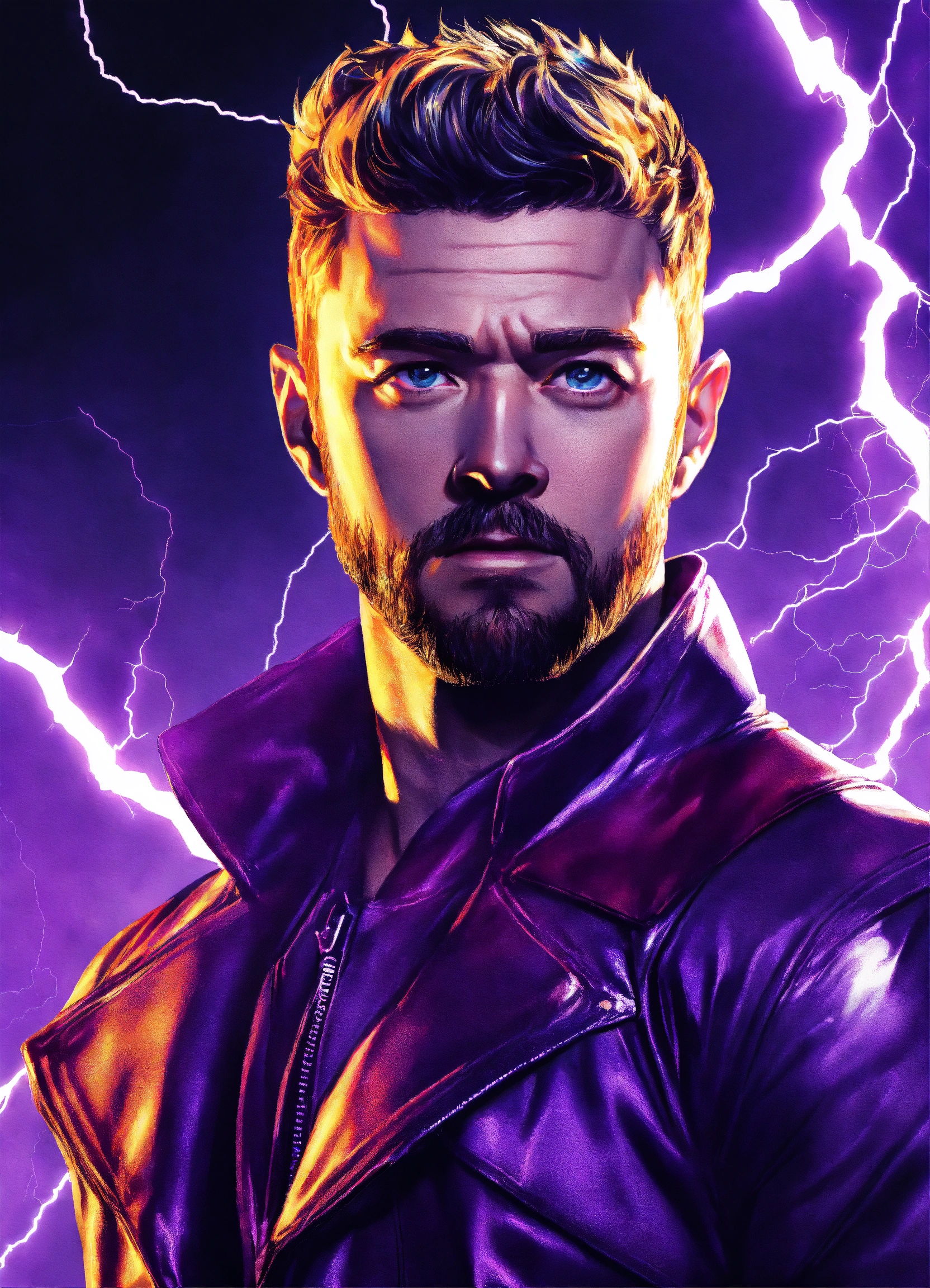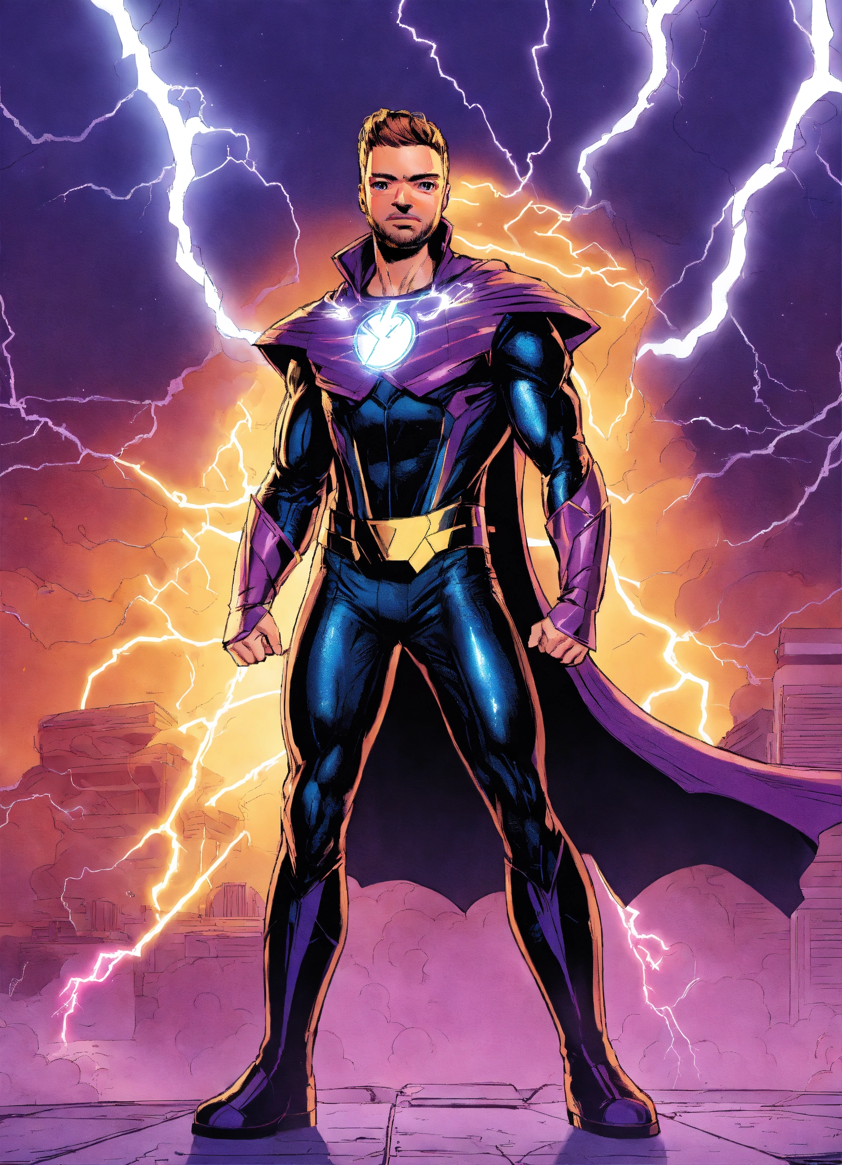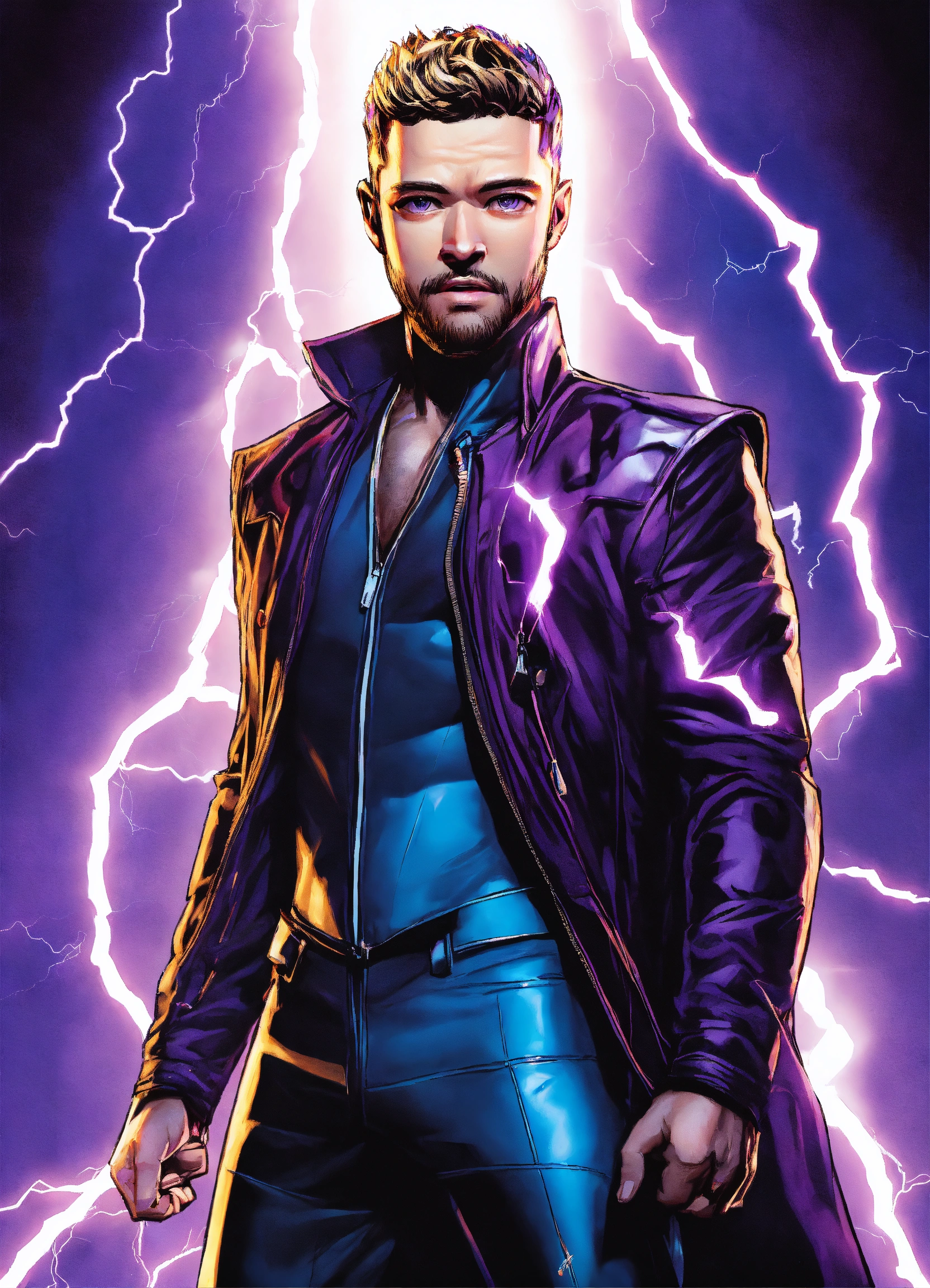 Justin timberlake with short hair and short beard in a comic-book style with volumetric lighting and superhero costume. purple electricity, purple lightning, zeus's thunderbolt, thunderstorm, lightning strike full body