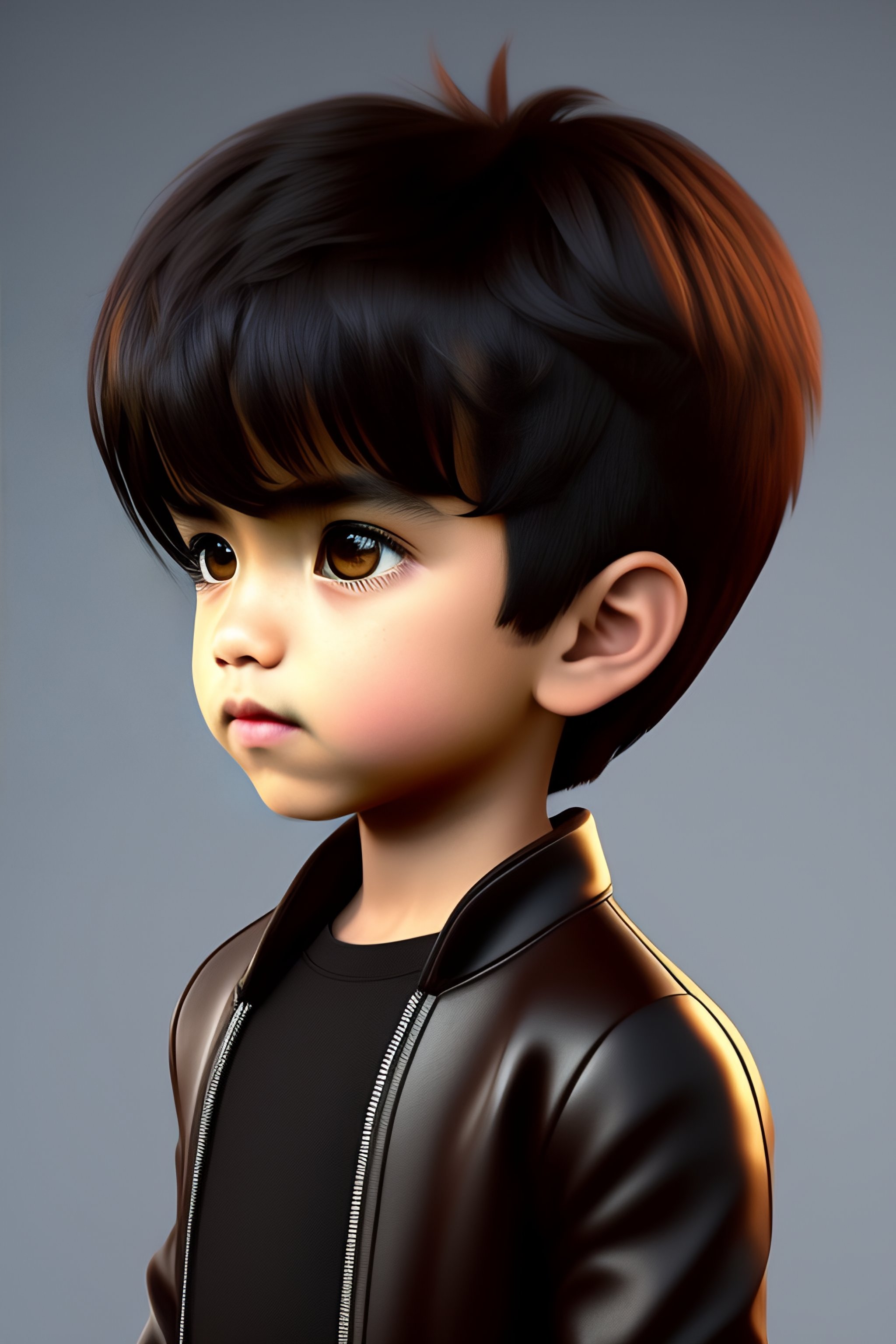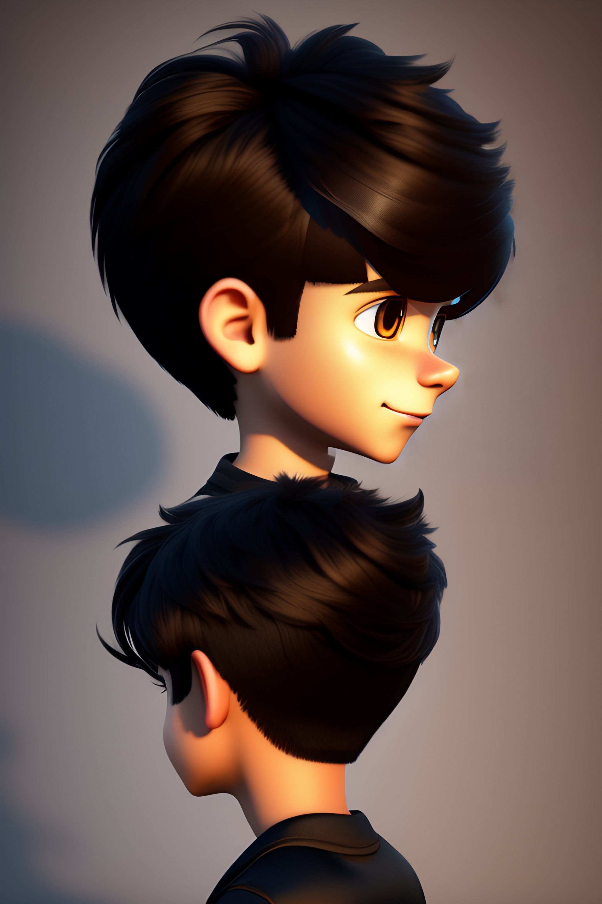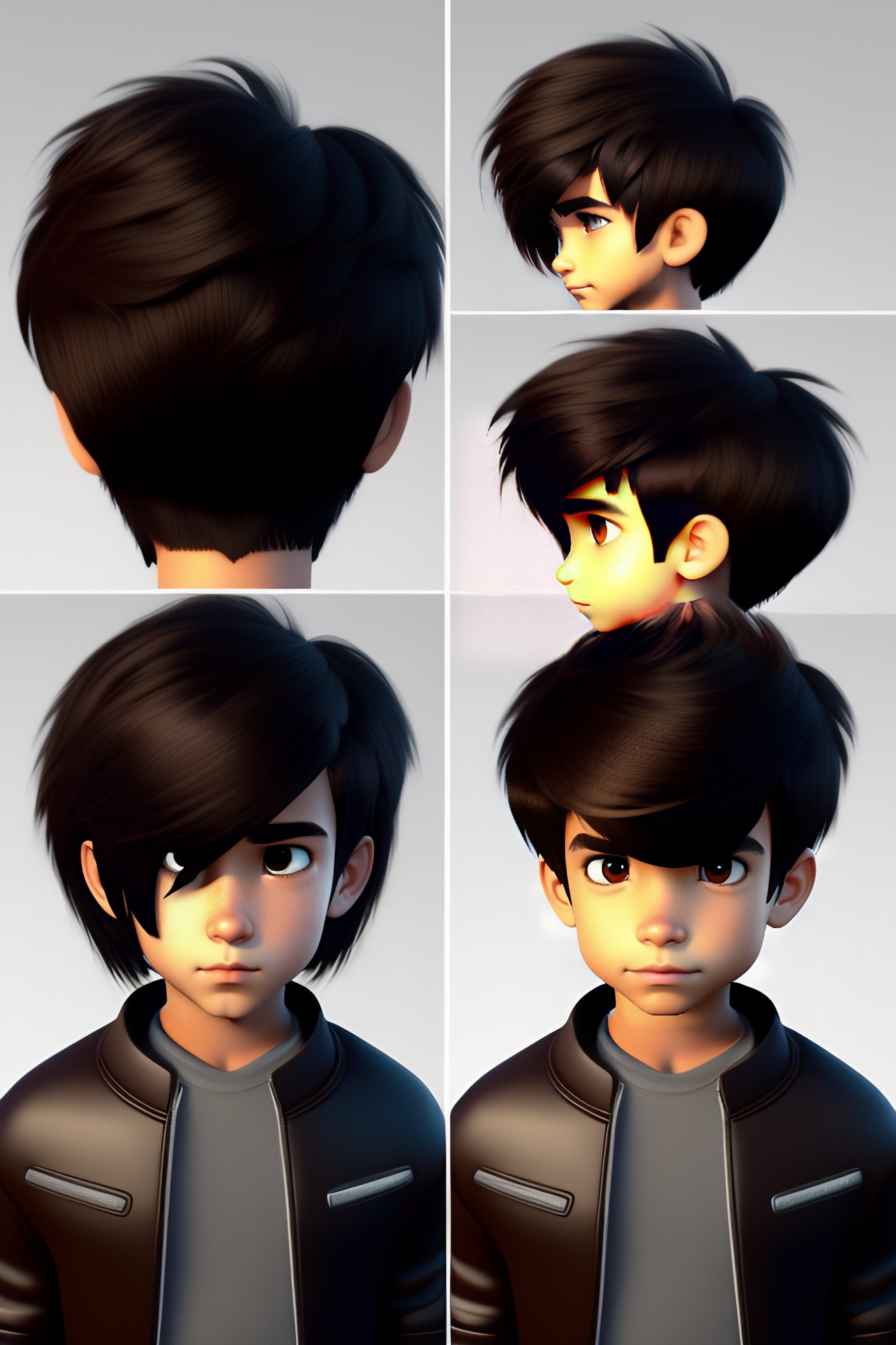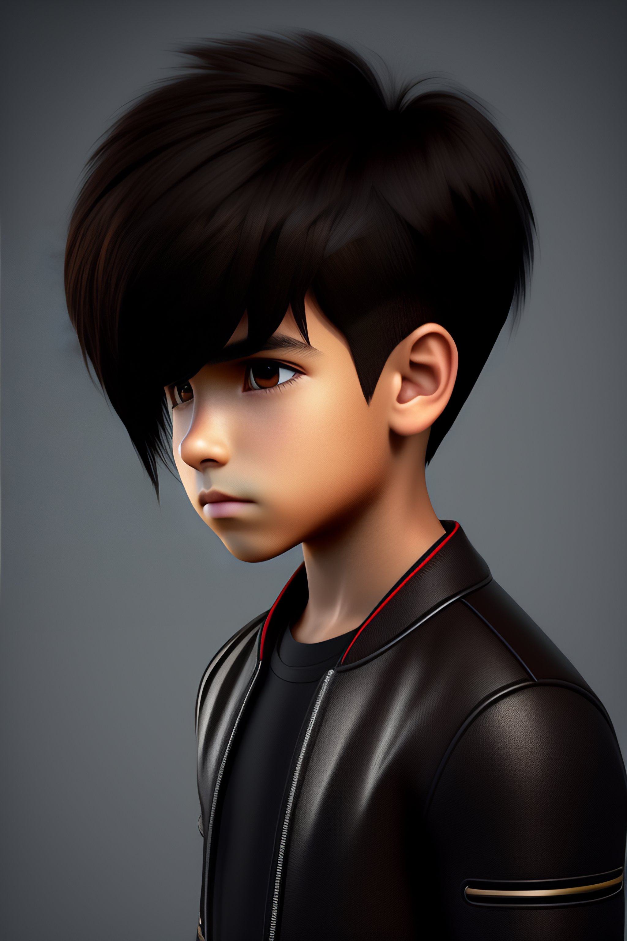 Dark brown boy in black zipper top, straight hair, men's messy bangs, (hair cut), pixar style, 3d style, disney style, 8k, beautiful