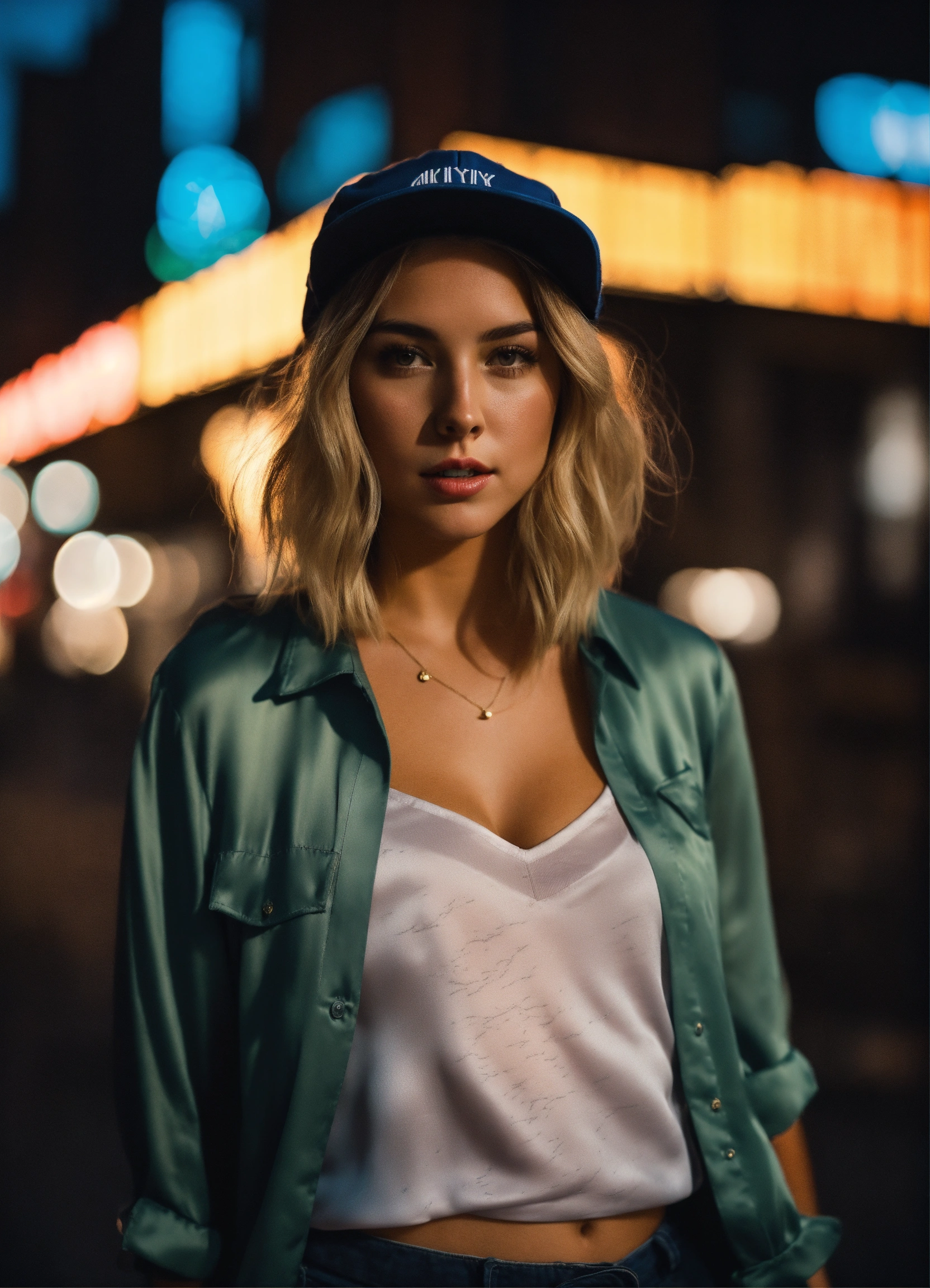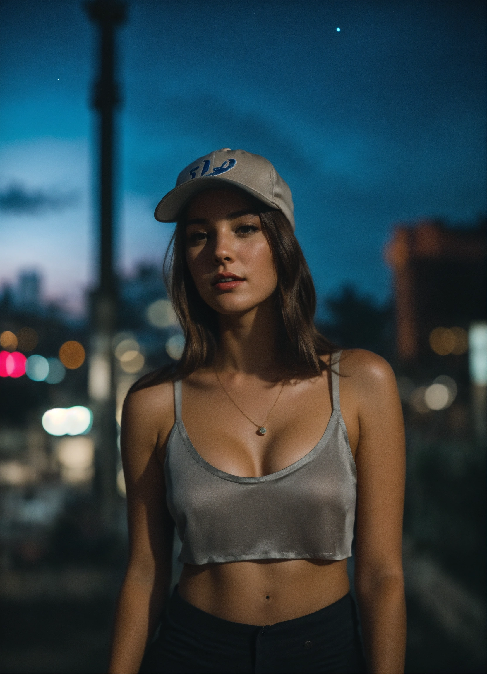 A real photo of a cute 28 year old hot next-door girl wearing a tight silk open blouse and a baseball-cap standing in a city, in the sky we see the milky-way