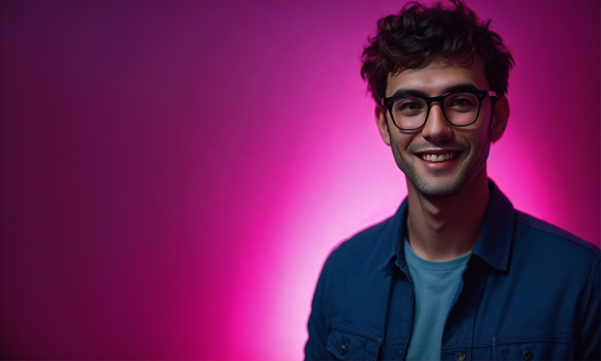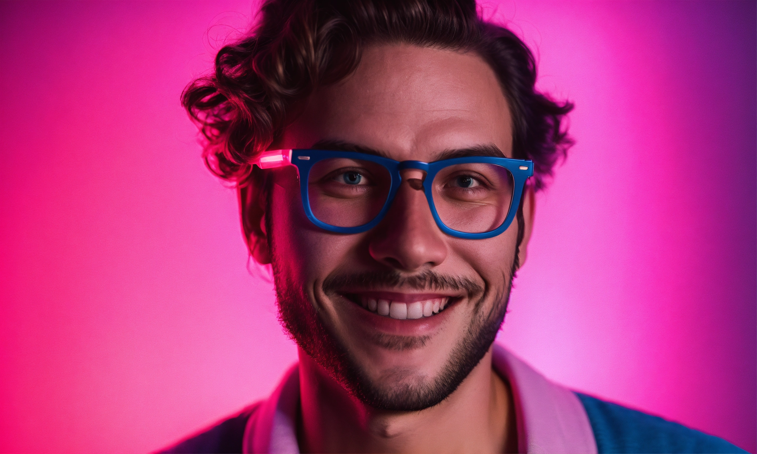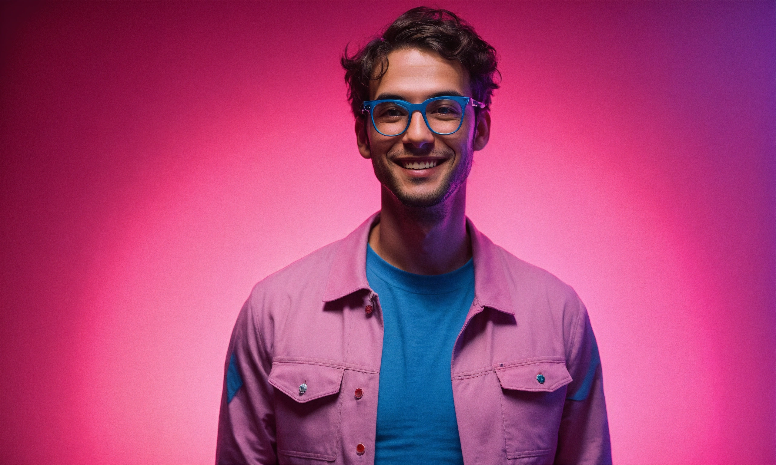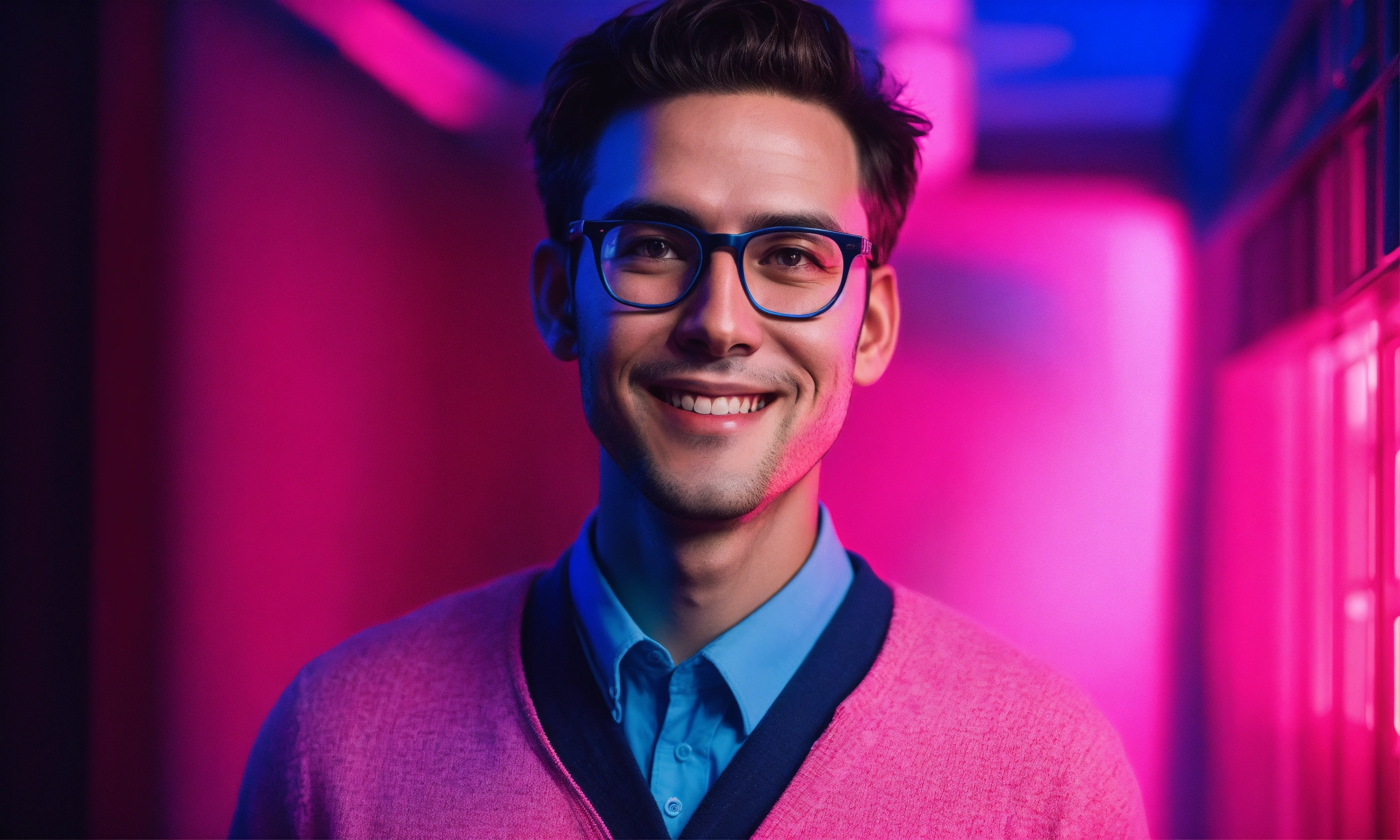 Portrait of a smiling nerdy man, front view, pink and blue lighting, skin texture, committed to web development, convey the idea of innovation, photo shoot, hyper realistic, hyper detailed, leica m10