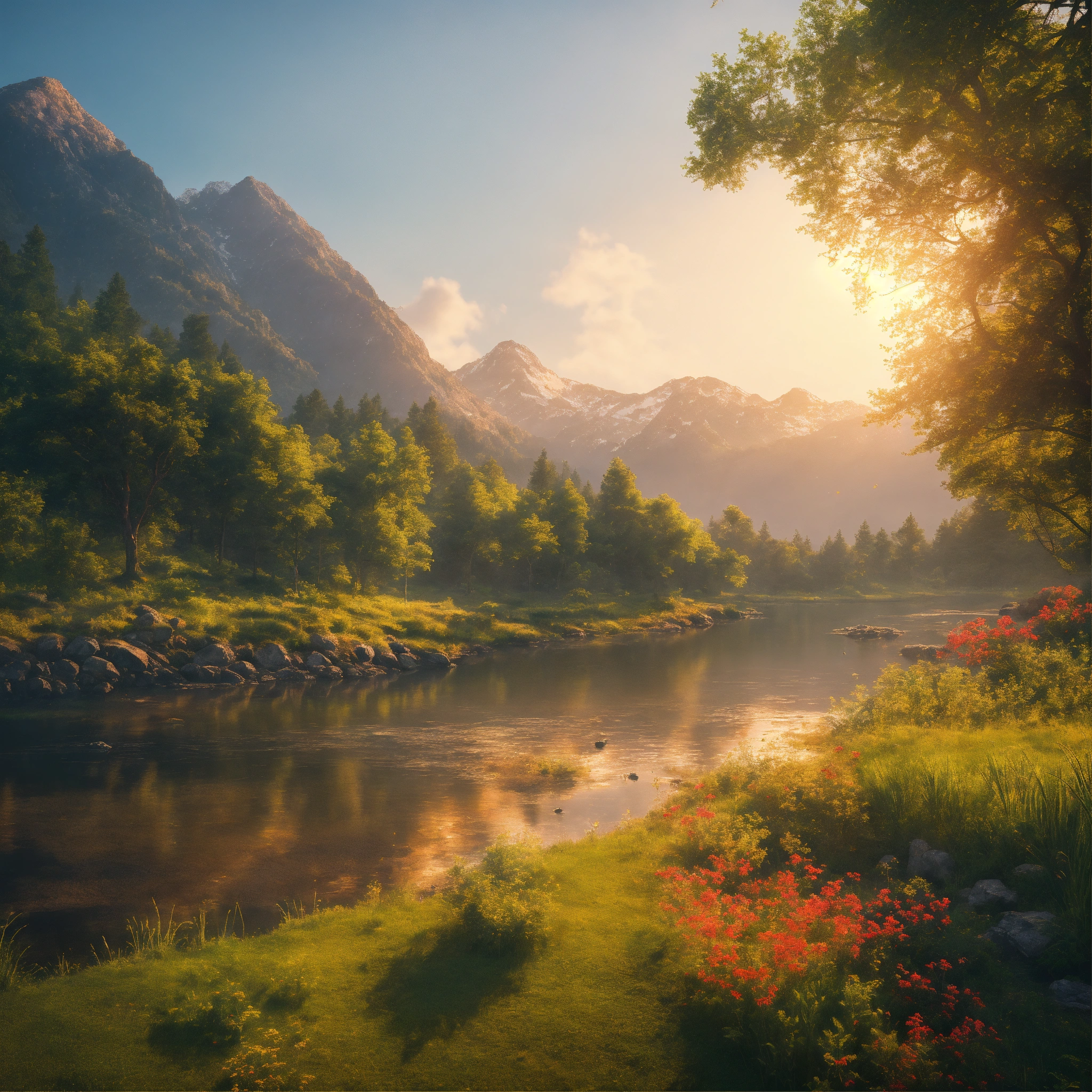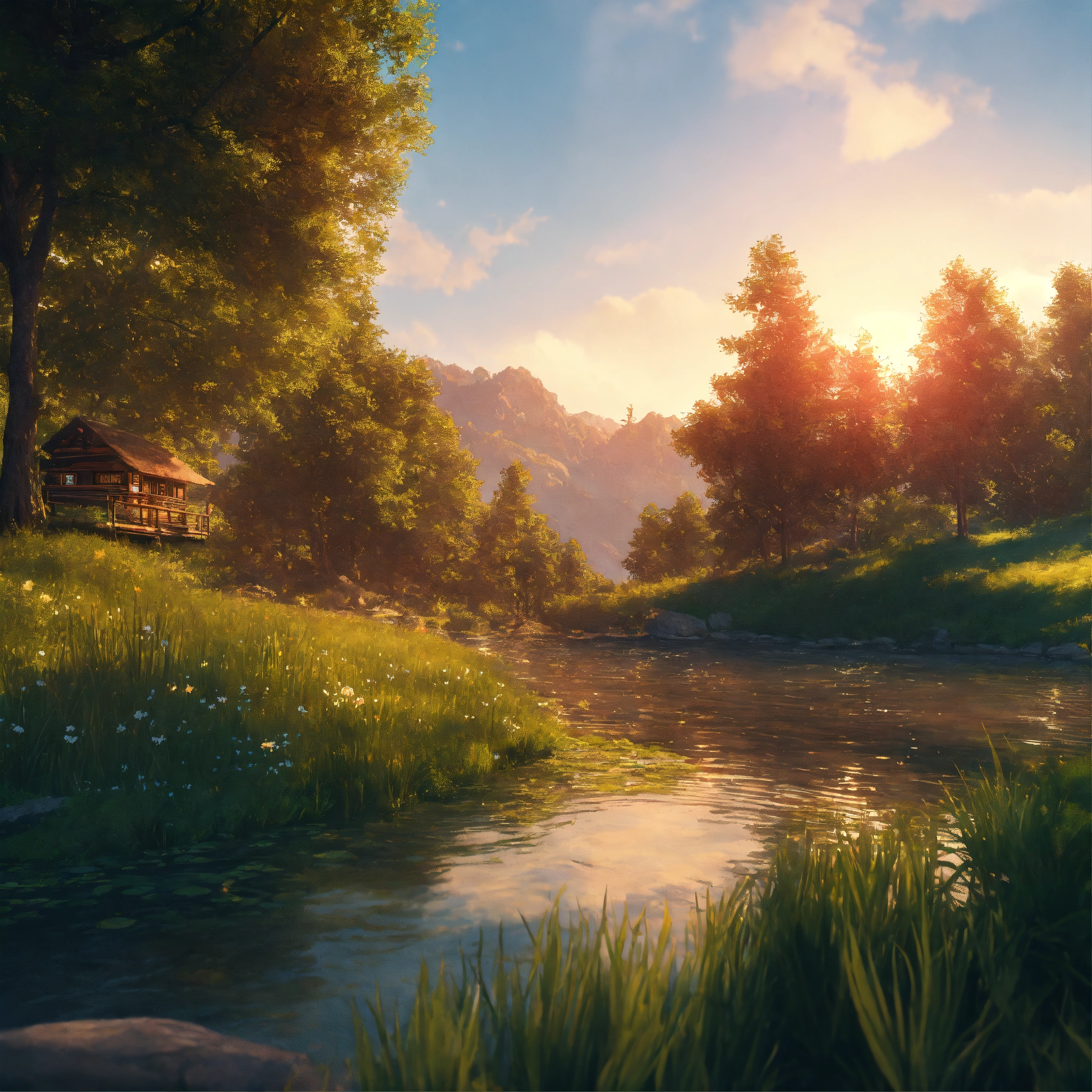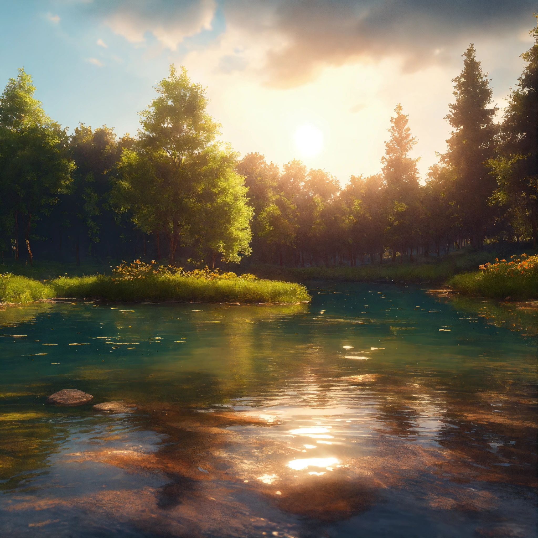 Illustrate a serene peaceful nature scene in summer