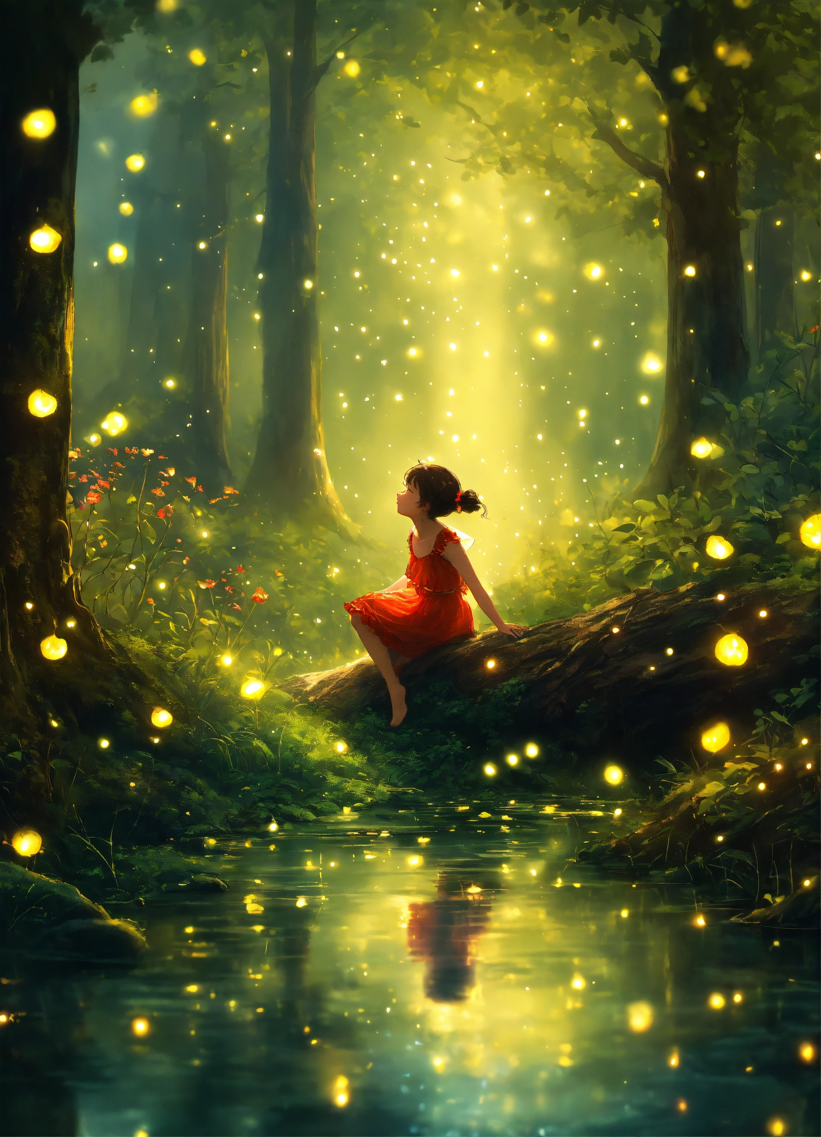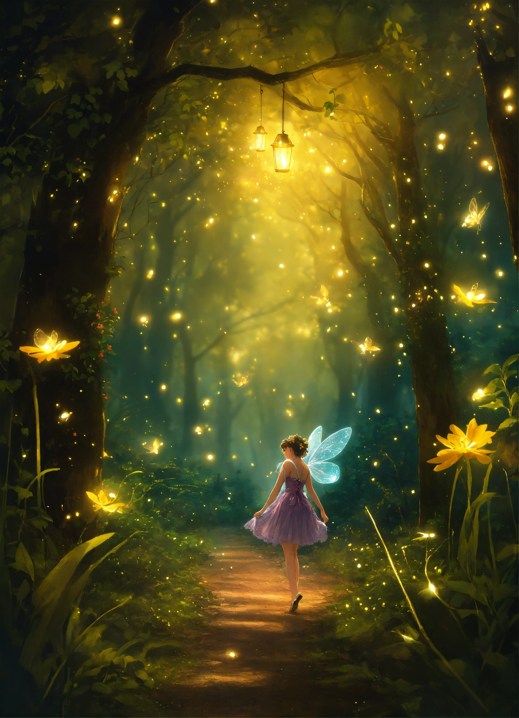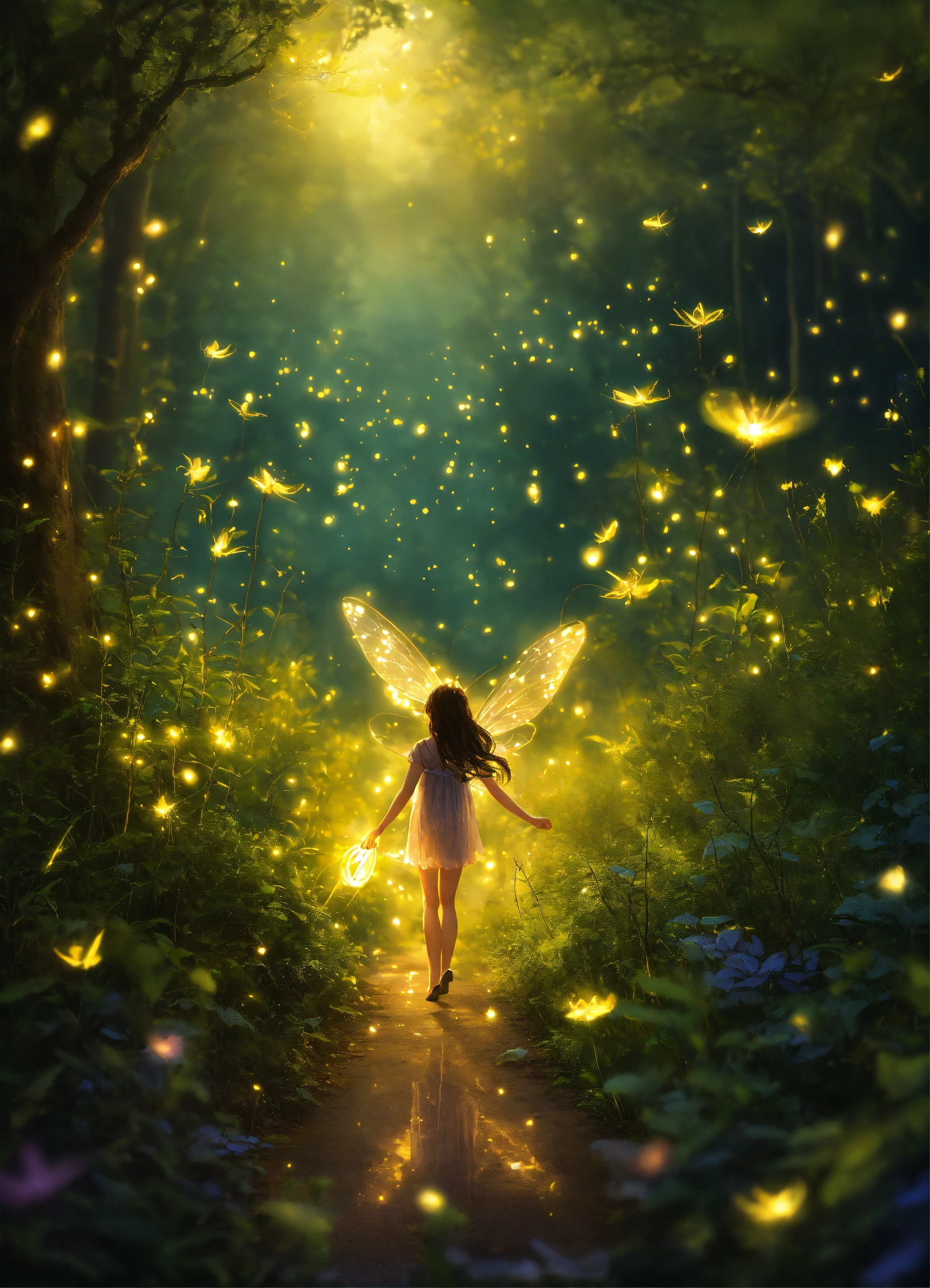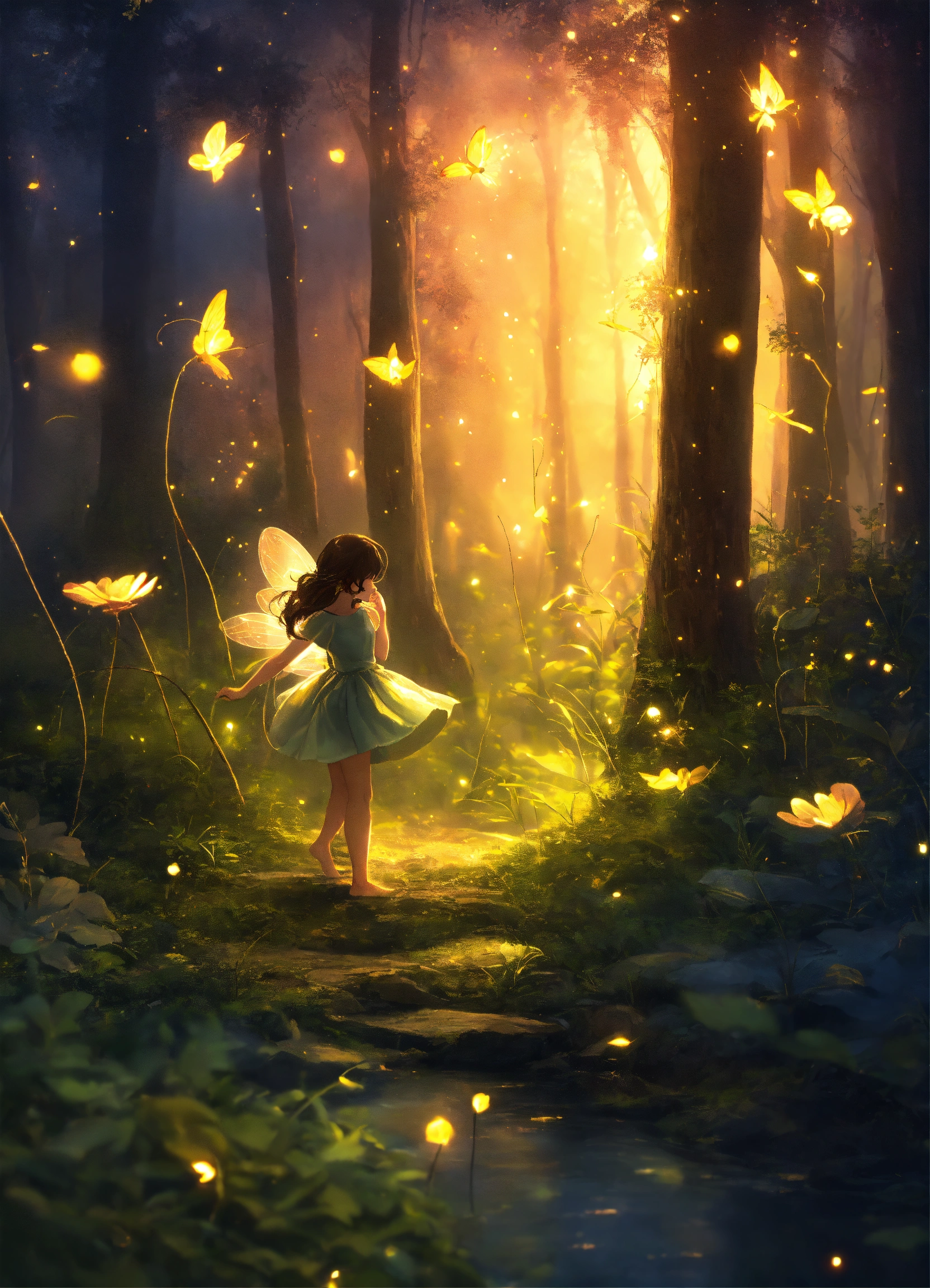 Amidst the enchanting forest, a whimsical fairy dances through the night, chasing after the gentle glow of fireflies, purely for the joy of it. there's no particular occasion, just the simple delight of playful moments in the wilderness. the fireflies' soft, shimmering light mirrors the magic of this spontaneous adventure, creating an ethereal and carefree atmosphere. it's a celebration of nature's wonders, where the fairy and fireflies embrace the beauty of the night, creating a serene and magical scene in the heart of the woods.
