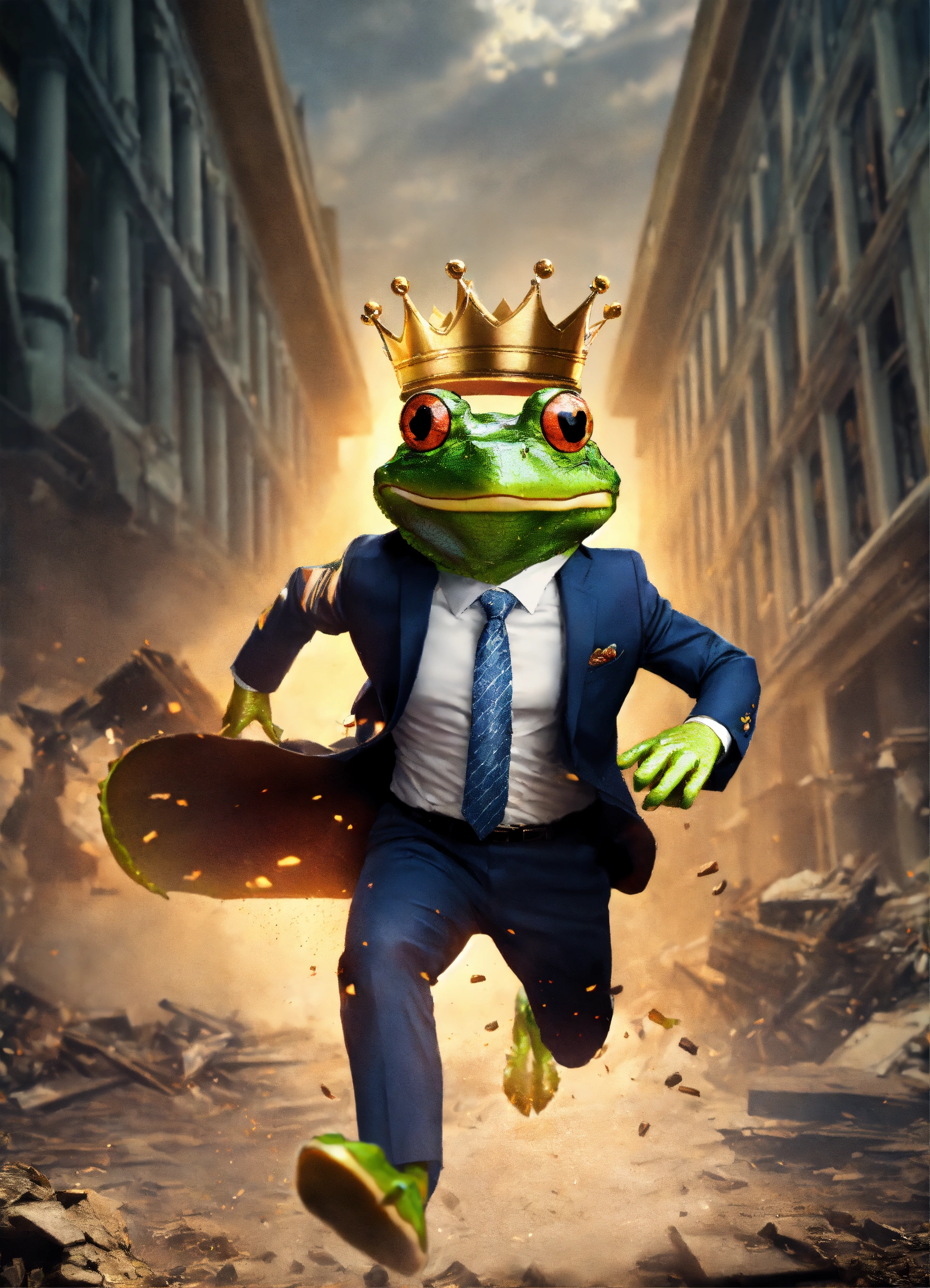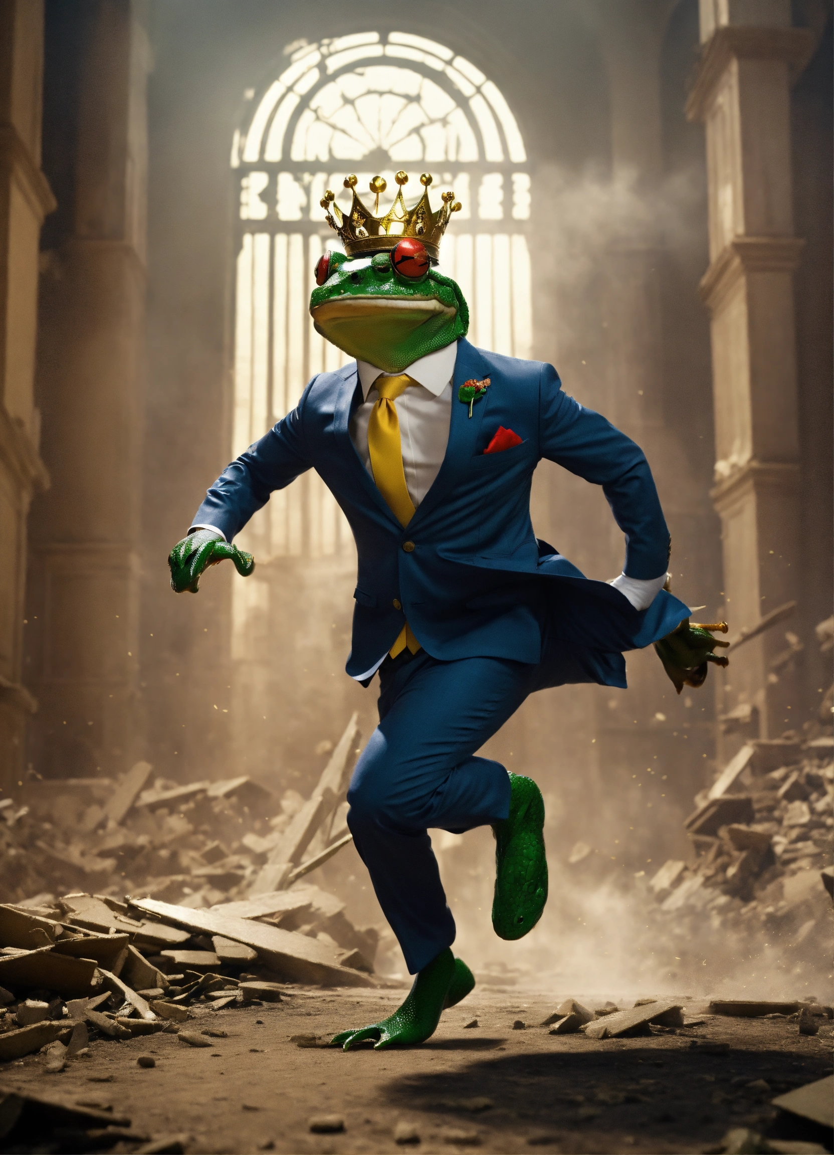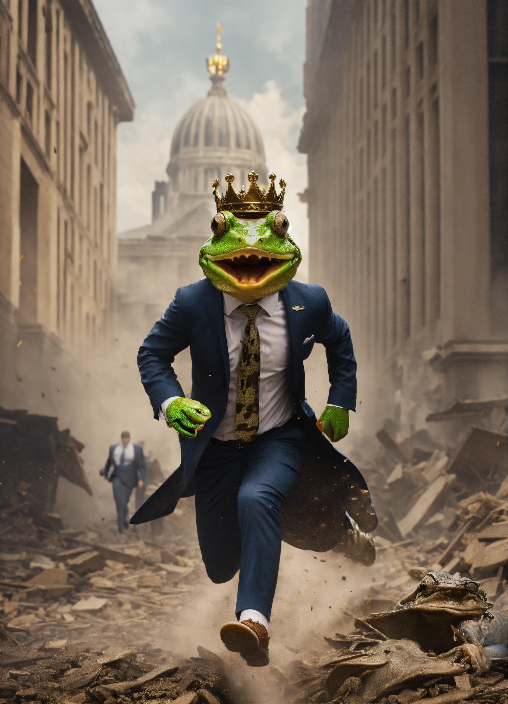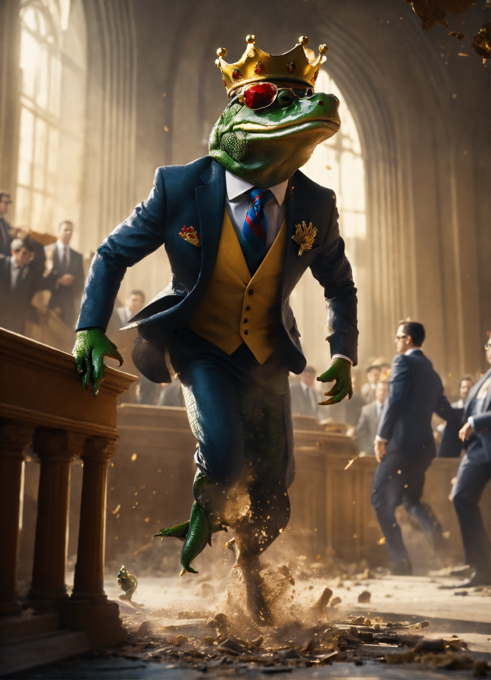 Crocodile frog in suit and glasses and crown running from judge in crown court cinematic environment while building is falling crushing down