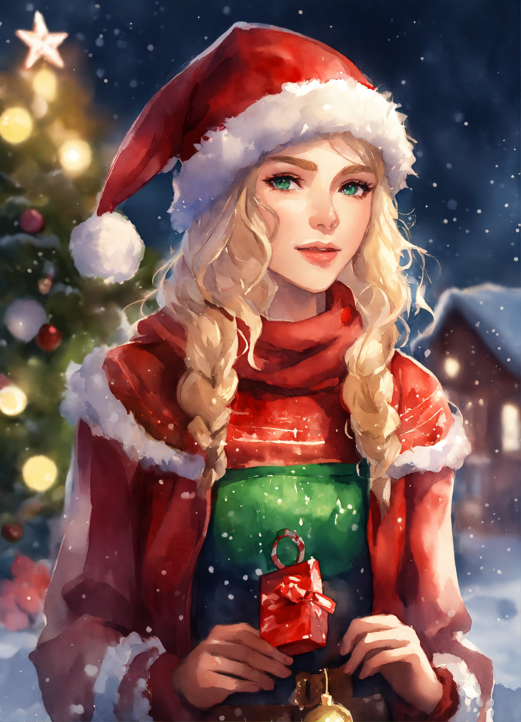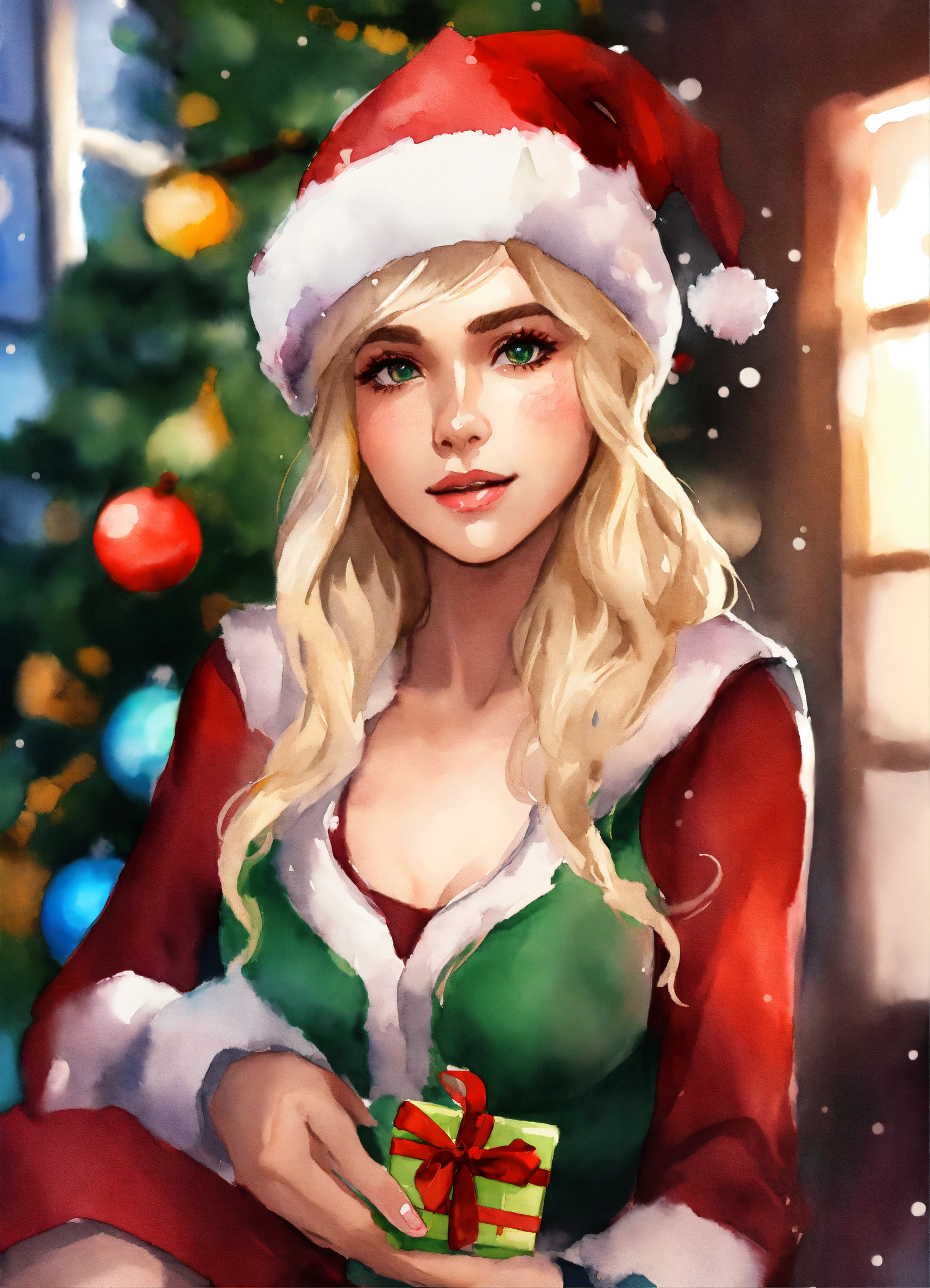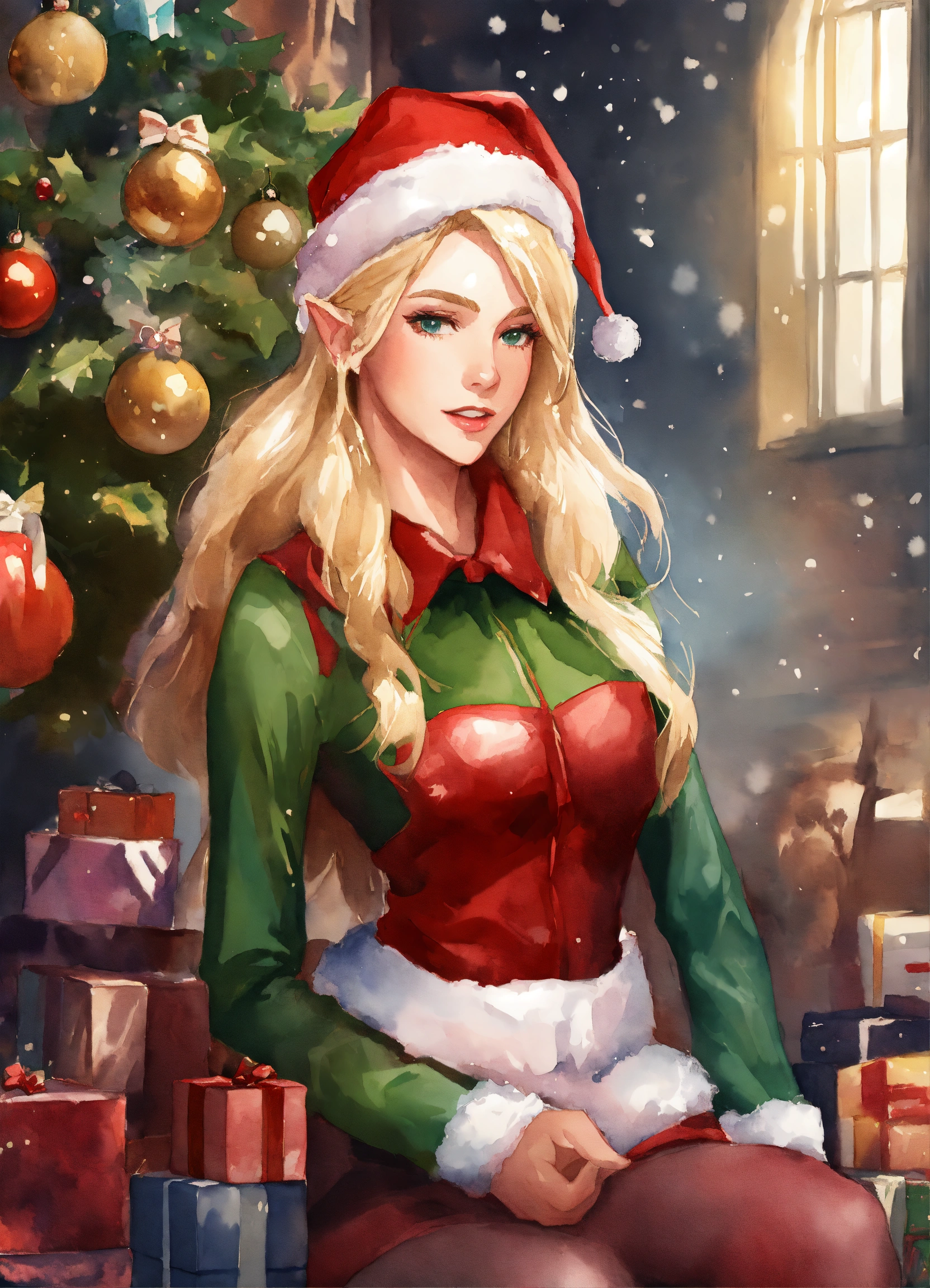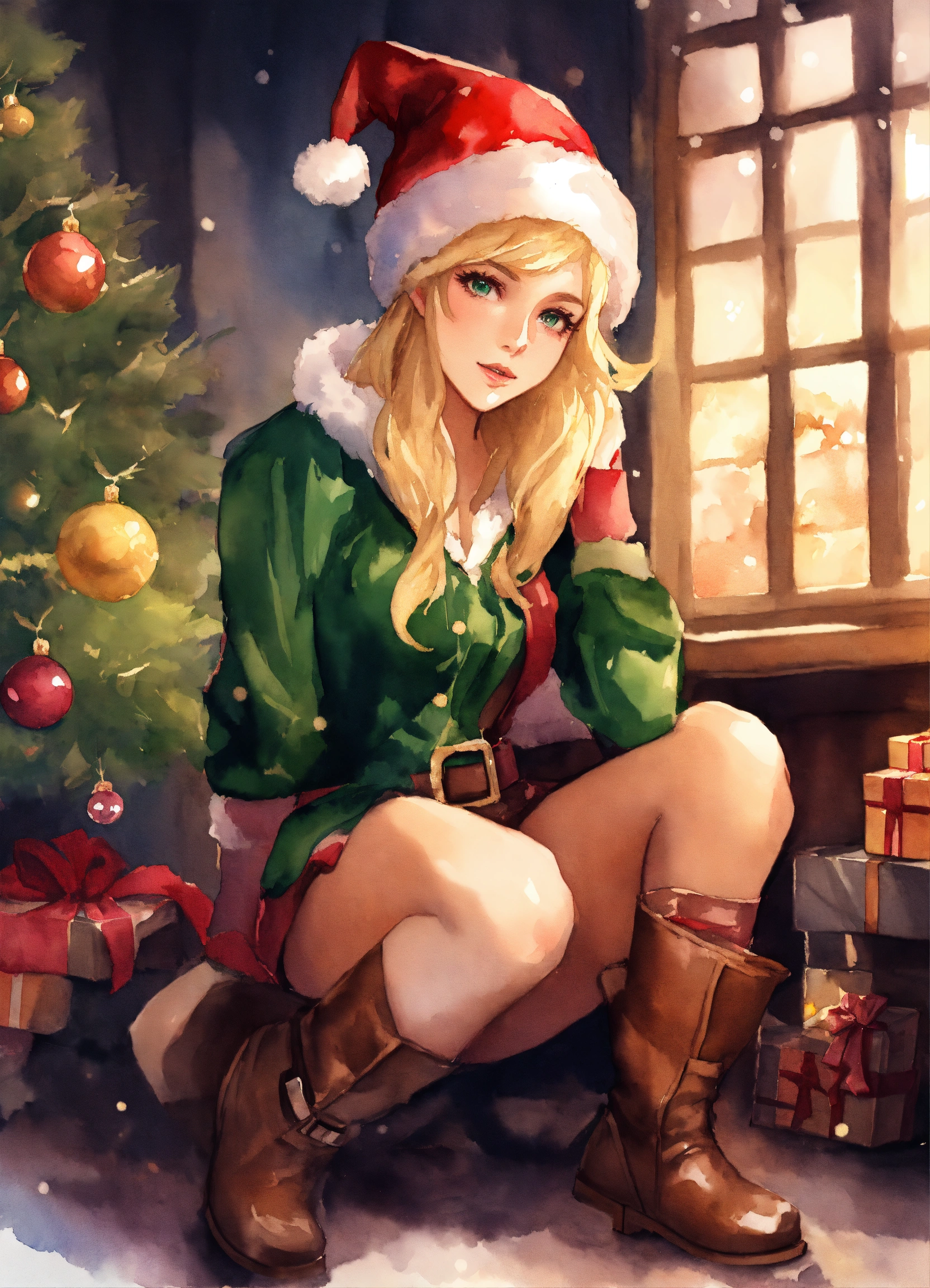 Most beautiful blonde haired christmas elf with christmas hat and outfit with boots, watercolour, rebecca sugar julia pott wlop 8k resolution