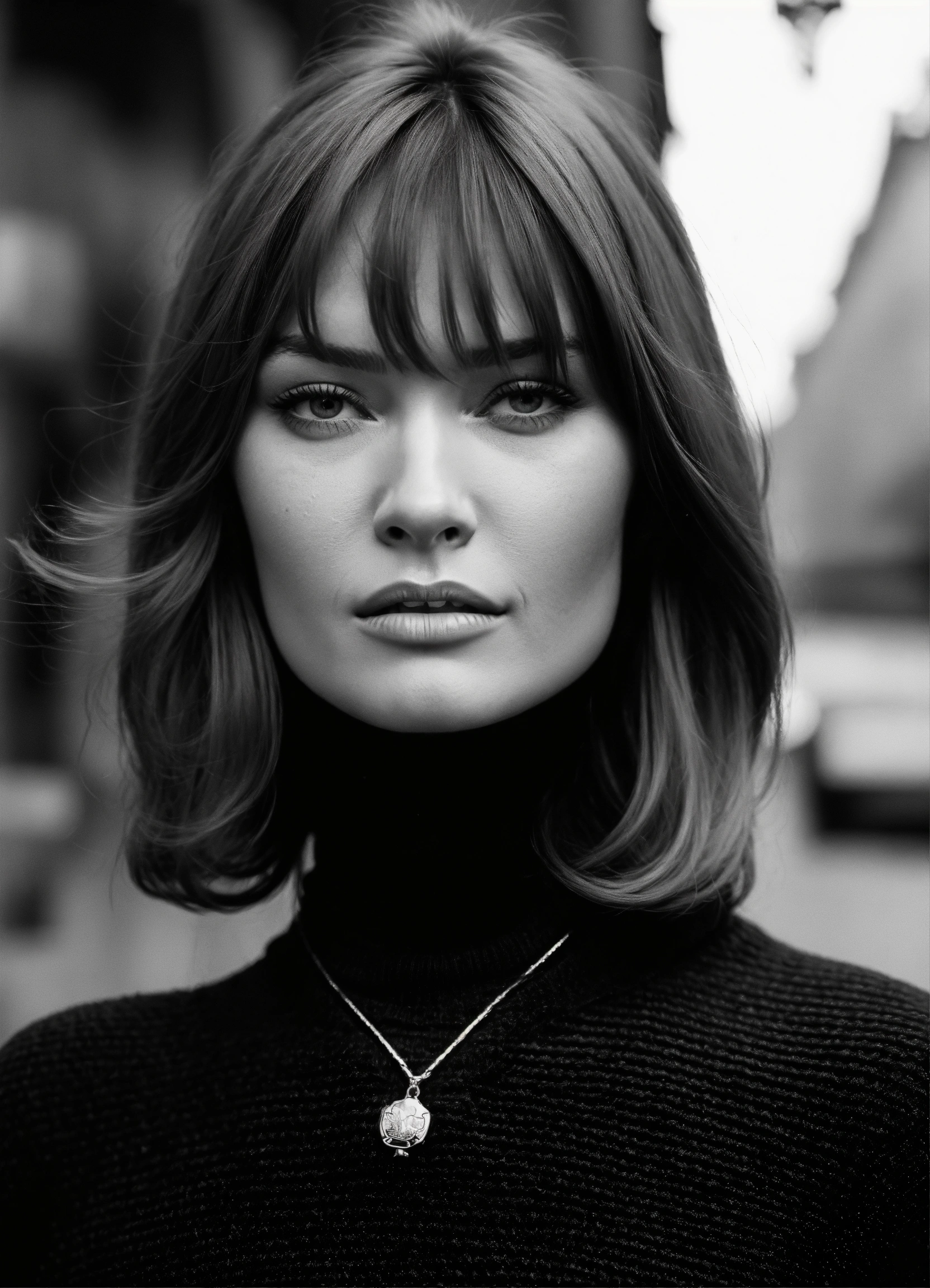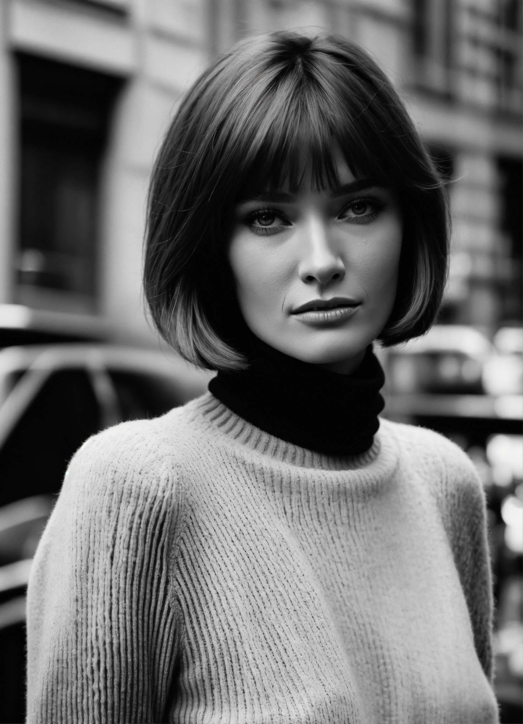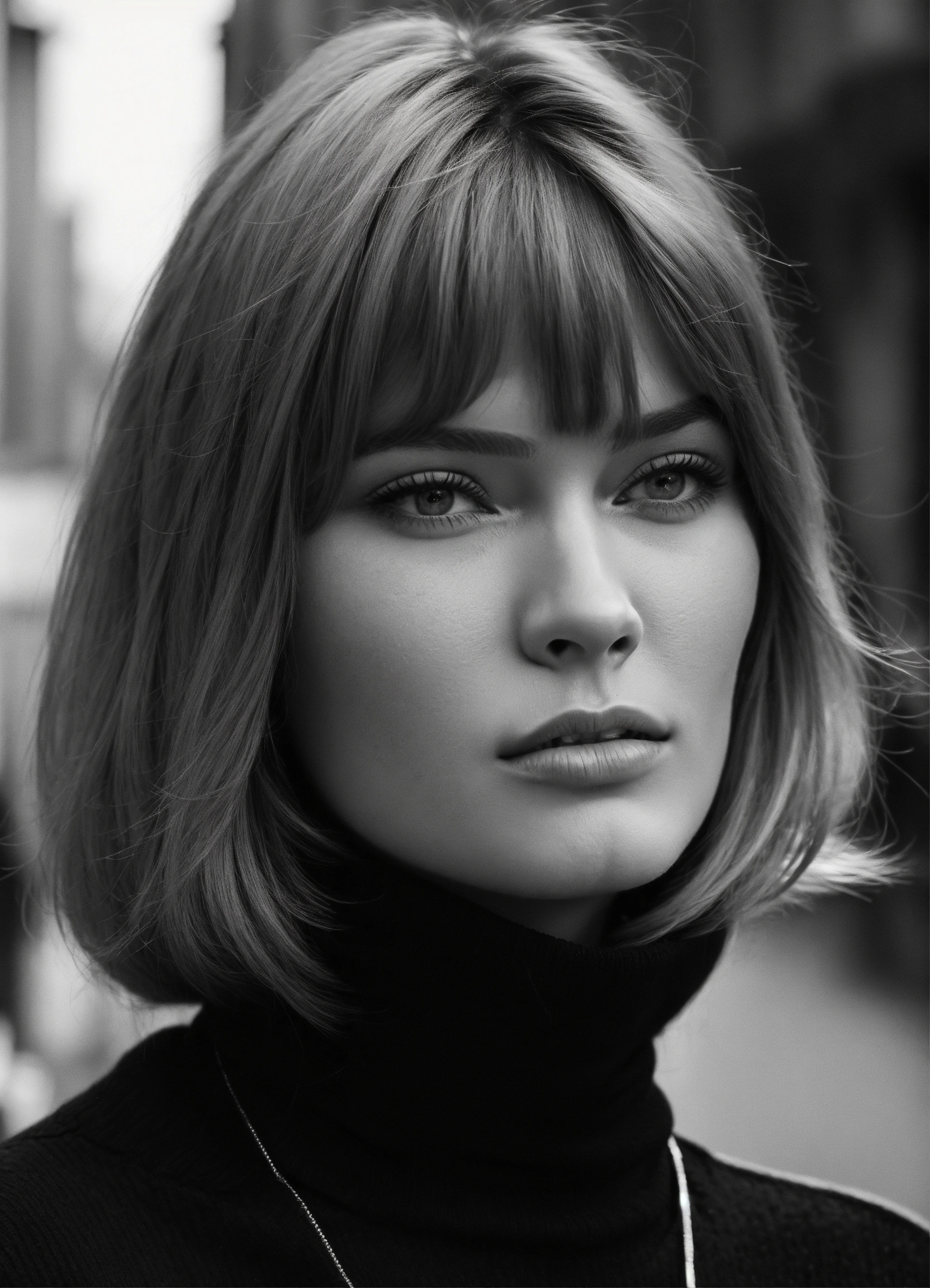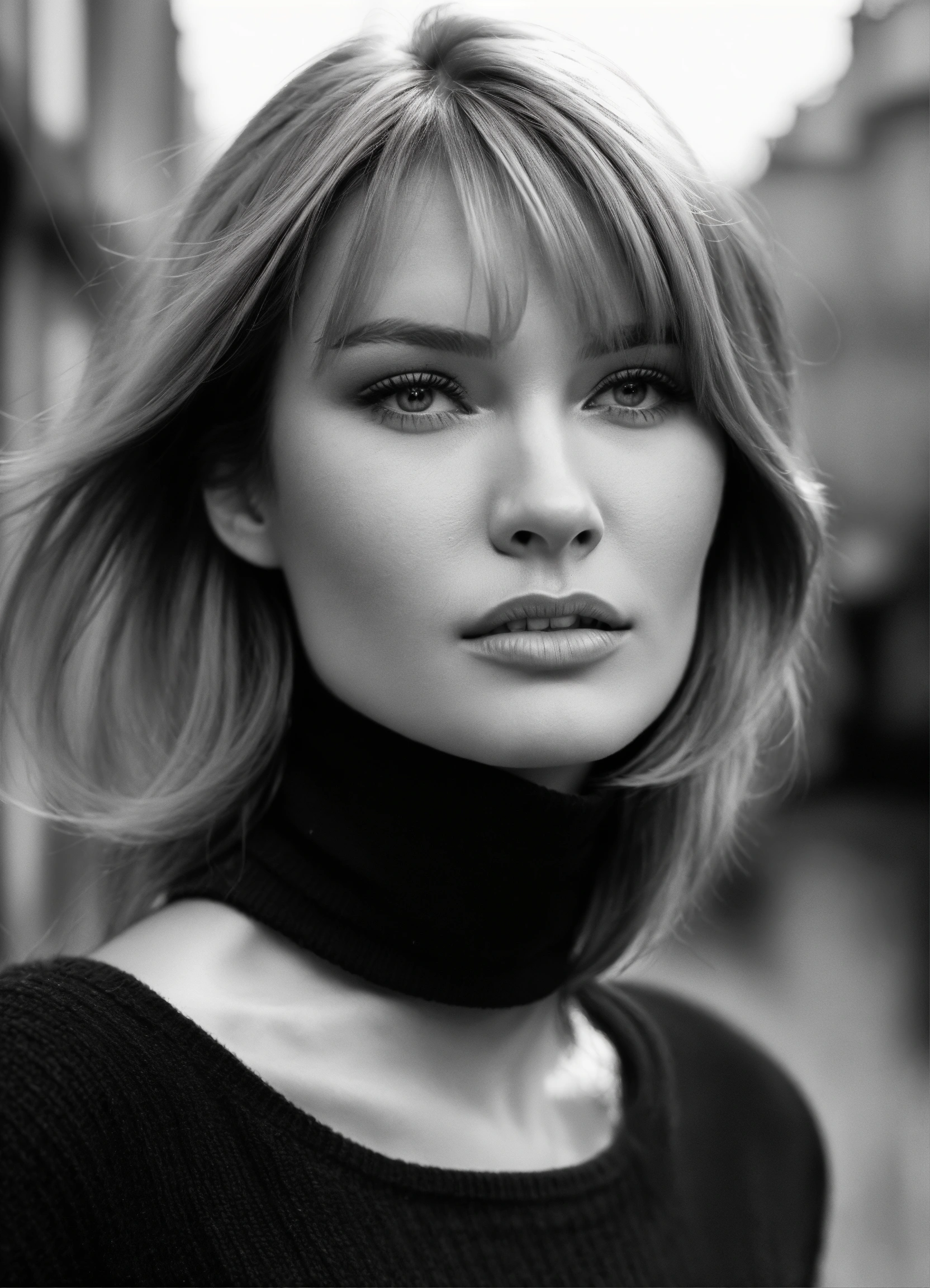 Beautiful fashion models, blonde, carla bruni mixed whit brigitte bardot style, clear eyes, closed mouth, black turtleneck sweater, face view, bob haircut, portrait close up, paris street background, black and white film, photography quality, high detail, high quality.